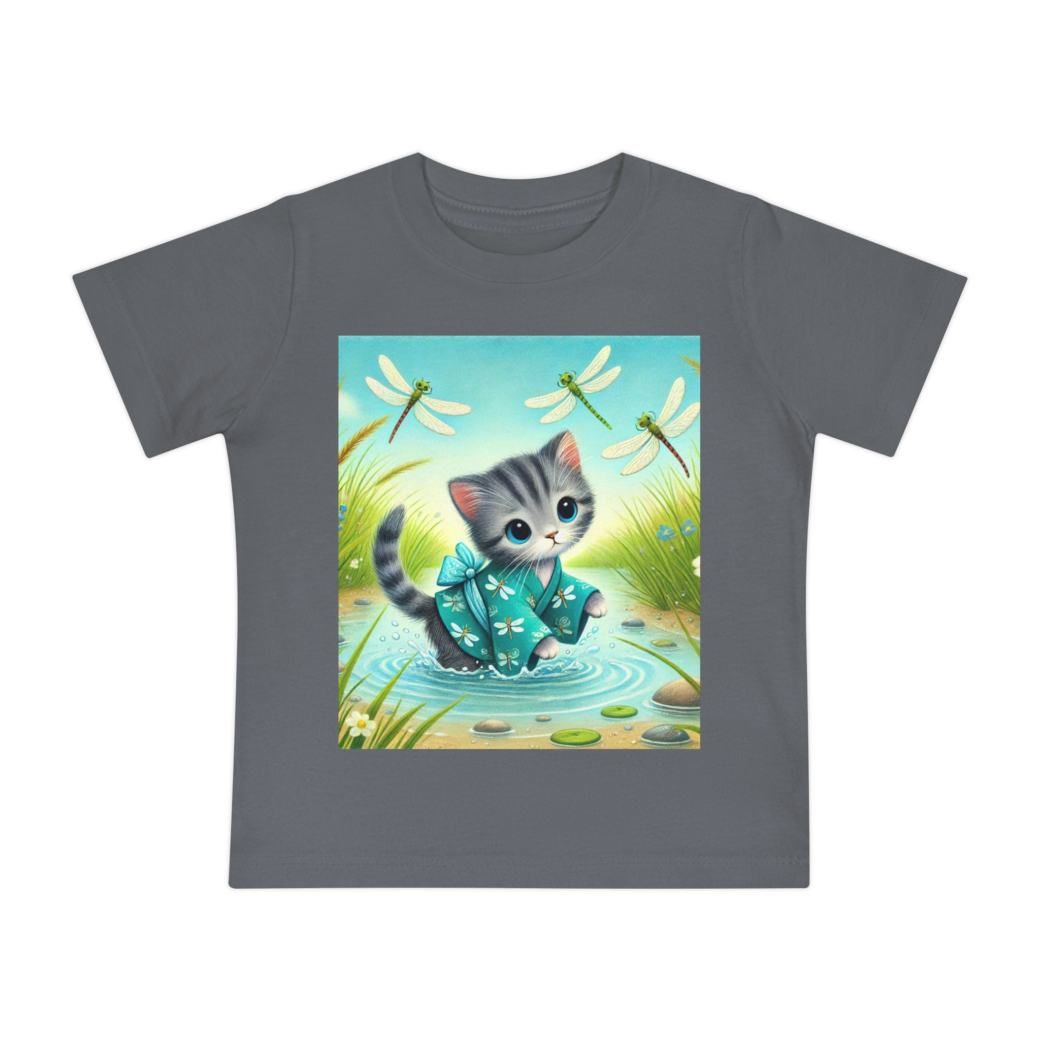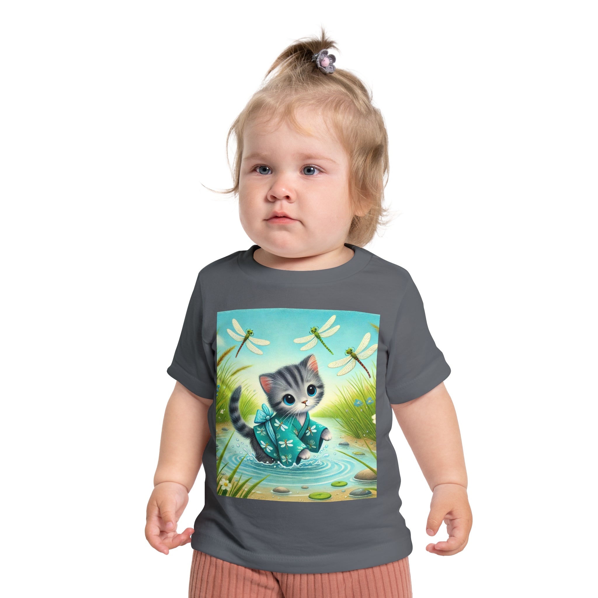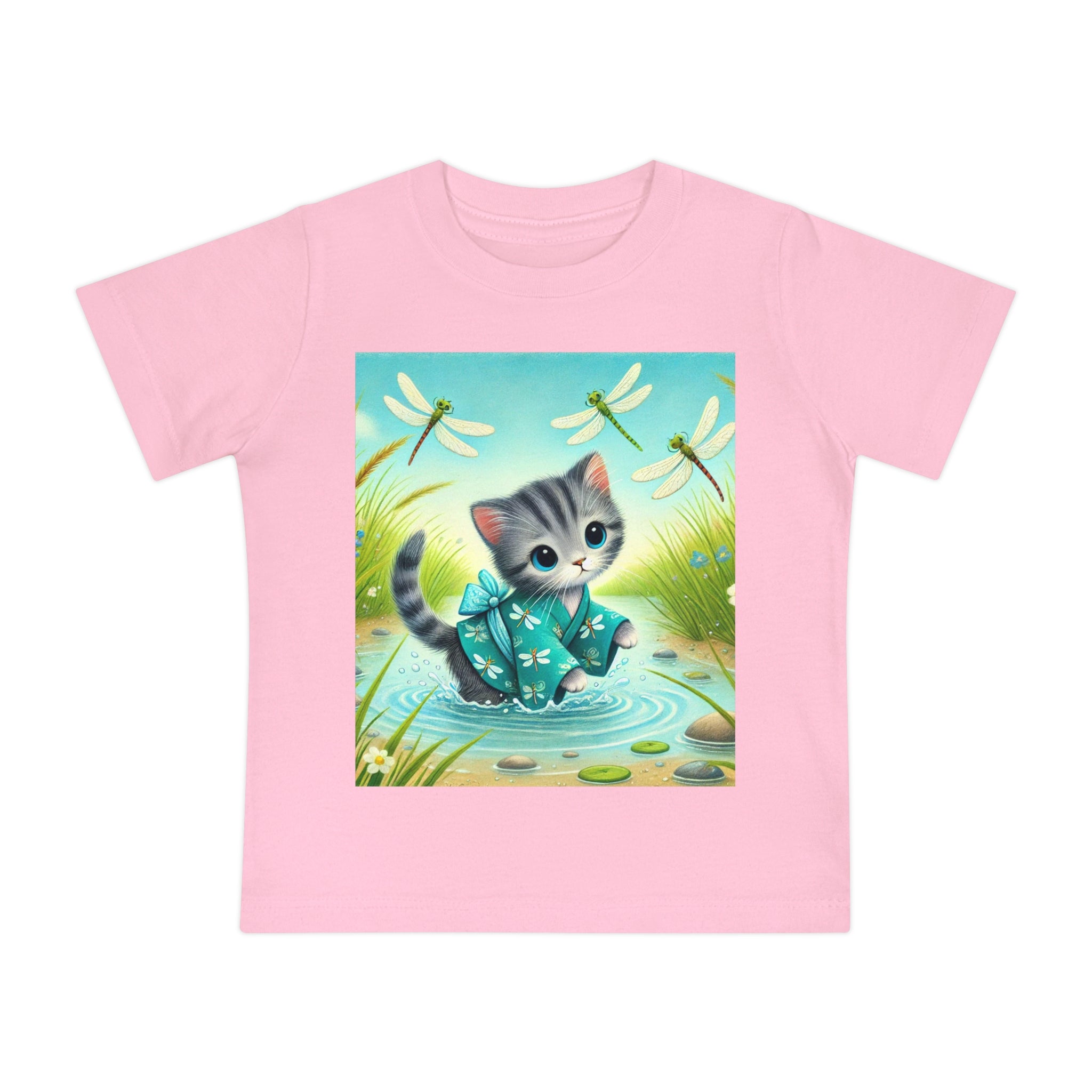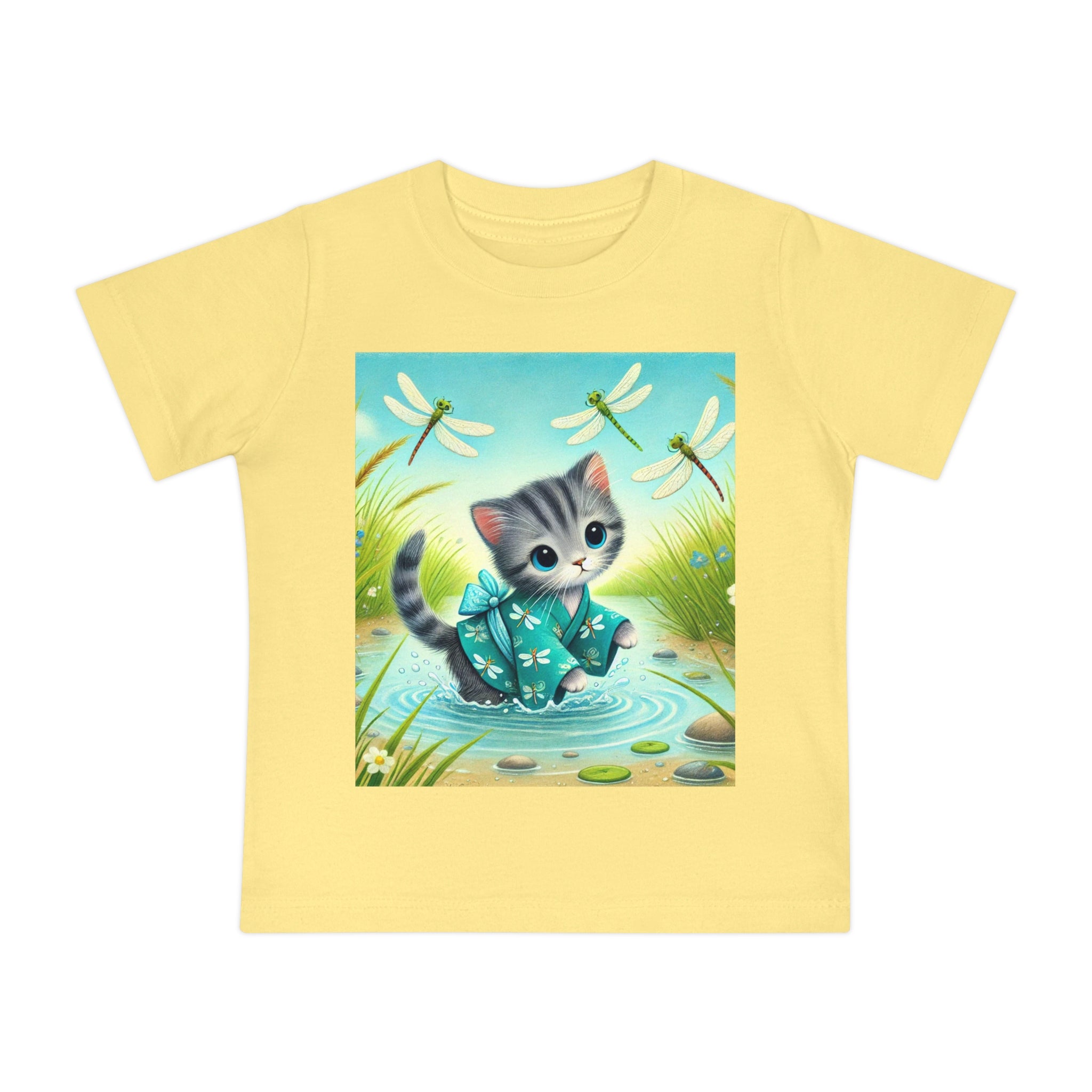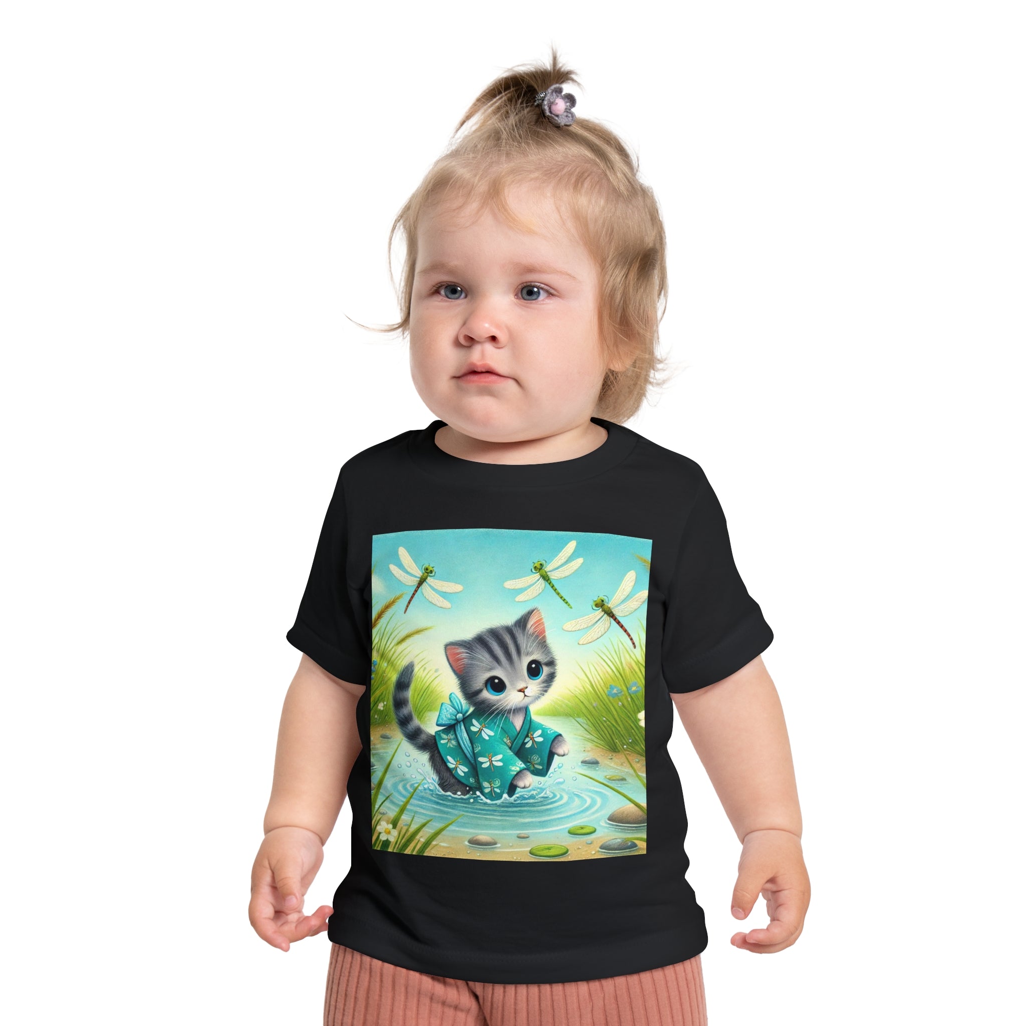 Kitten by the Still Waters captures a tender moment of curiosity and calm in a peaceful pond setting. A gentle gray tabby kitten wades carefully through still, rippling waters, dressed in a teal kimono patterned with delicate dragonflies. Around the kitten, real dragonflies hover gracefully, their iridescent wings catching the light as they dance in the warm daylight. Tall reeds, pebbles, and tiny wildflowers frame the scene, their reflections shimmering softly on the water’s surface. Rendered in flat, storybook-style colors with exquisite detail, this serene artwork blends playfulness and tranquility—celebrating the quiet beauty of nature and the wonder of exploration.