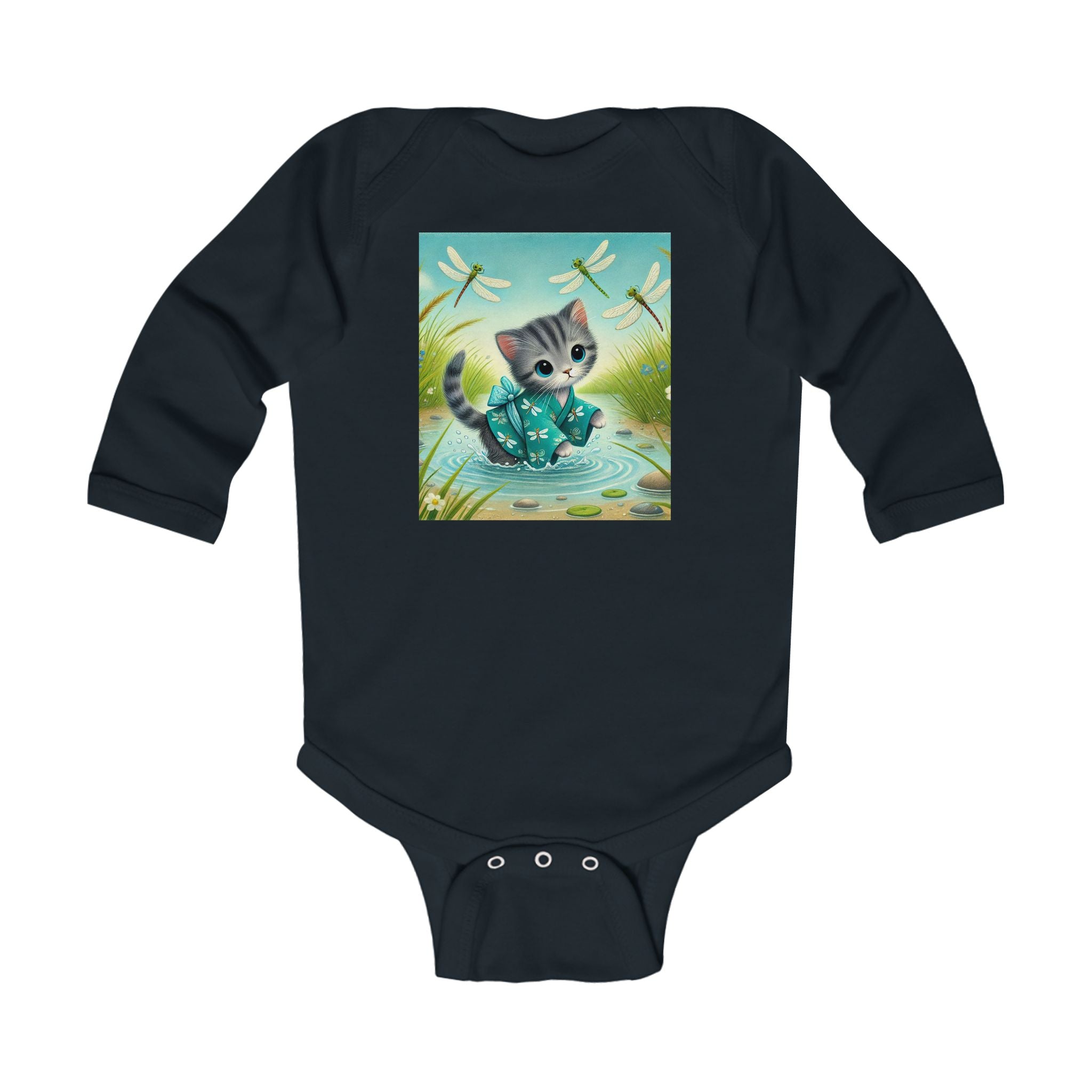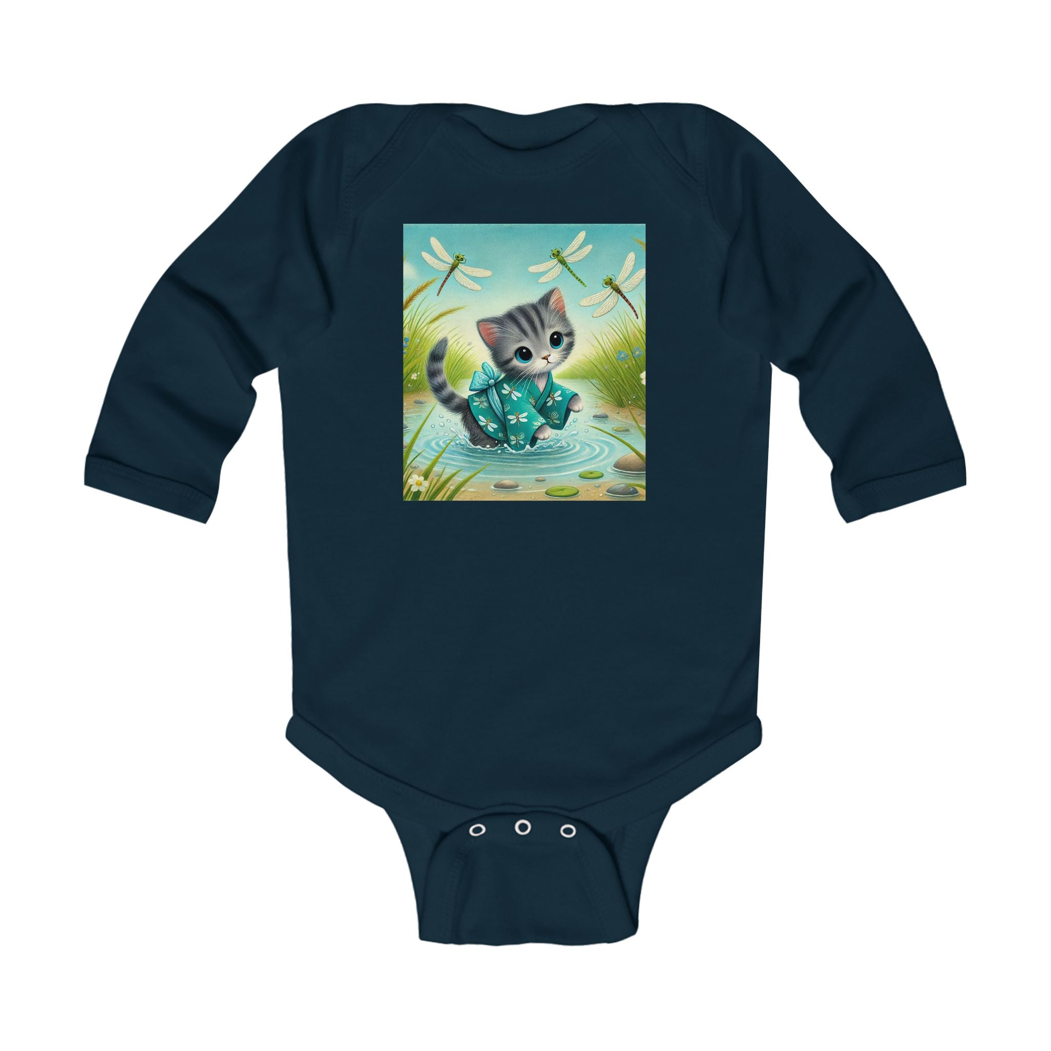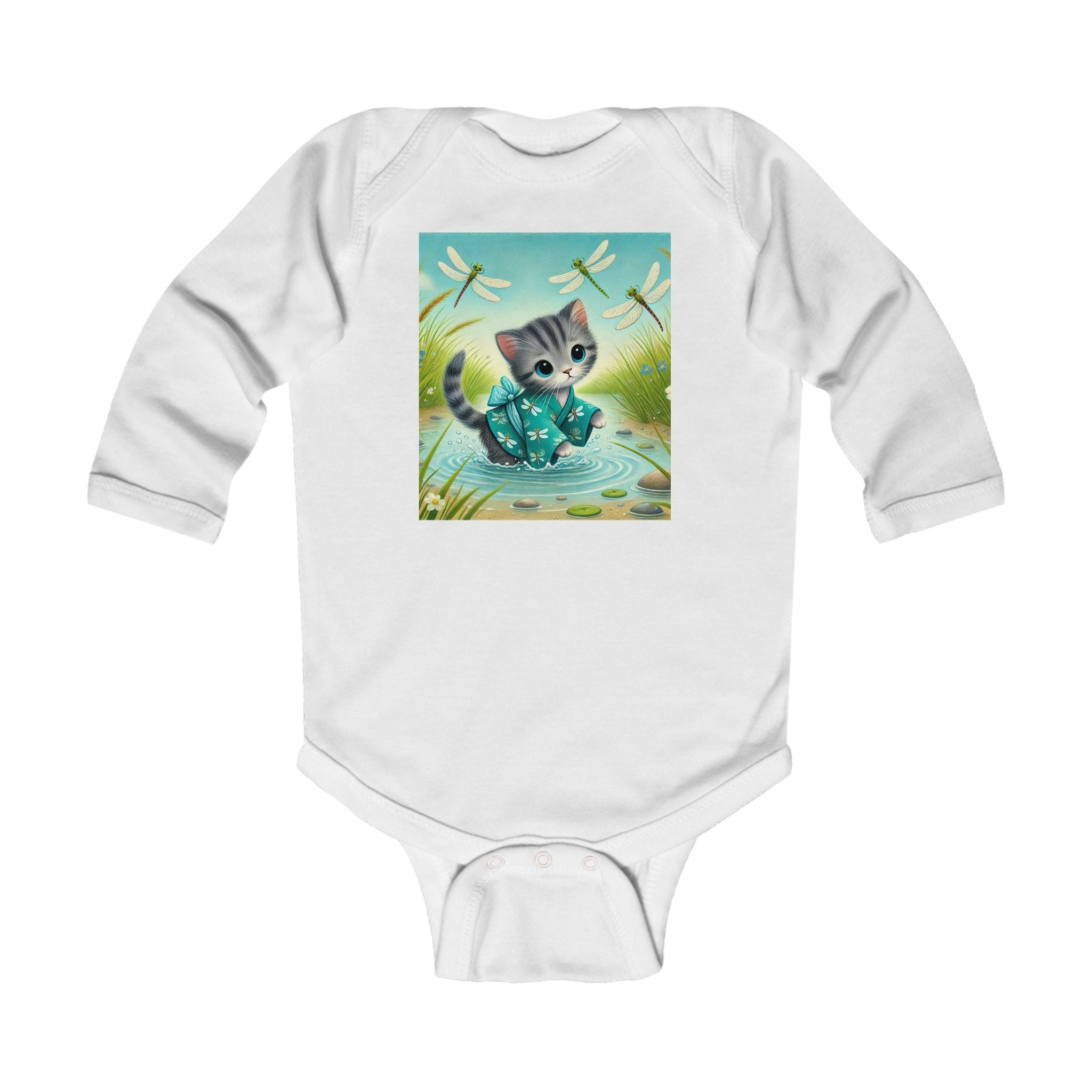 Kitten by the Still Waters tells a tender story of curiosity and calm. A gray tabby kitten wades through a tranquil pond, dressed in a teal kimono decorated with tiny dragonfly motifs. Real dragonflies hover above the rippling water, their wings catching the sunlight as they drift among reeds, pebbles, and soft meadow blooms. The air feels alive with gentle motion and quiet beauty. Rendered in flat, storybook-style colors with exquisite detail, this enchanting artwork captures the harmony between playfulness and peace, perfectly suited for little dreamers.