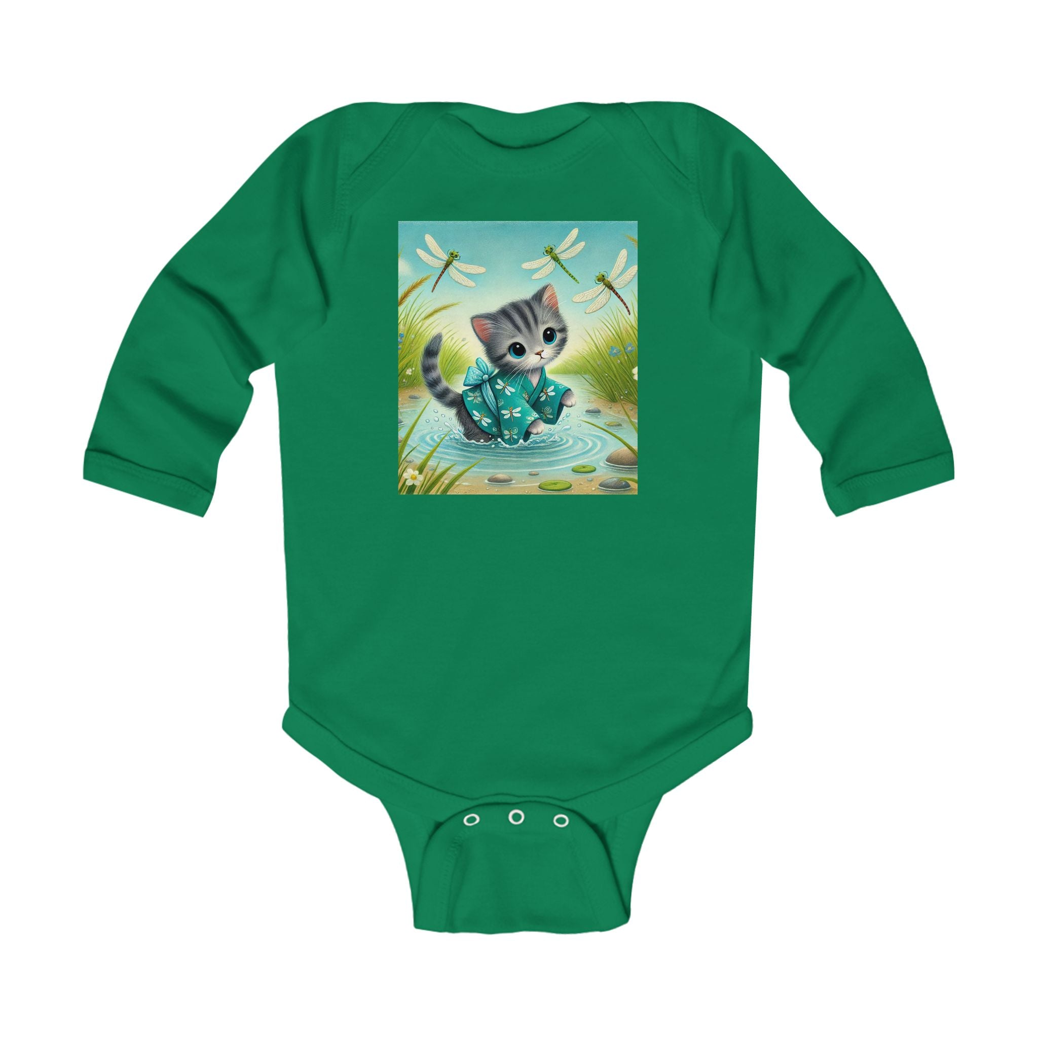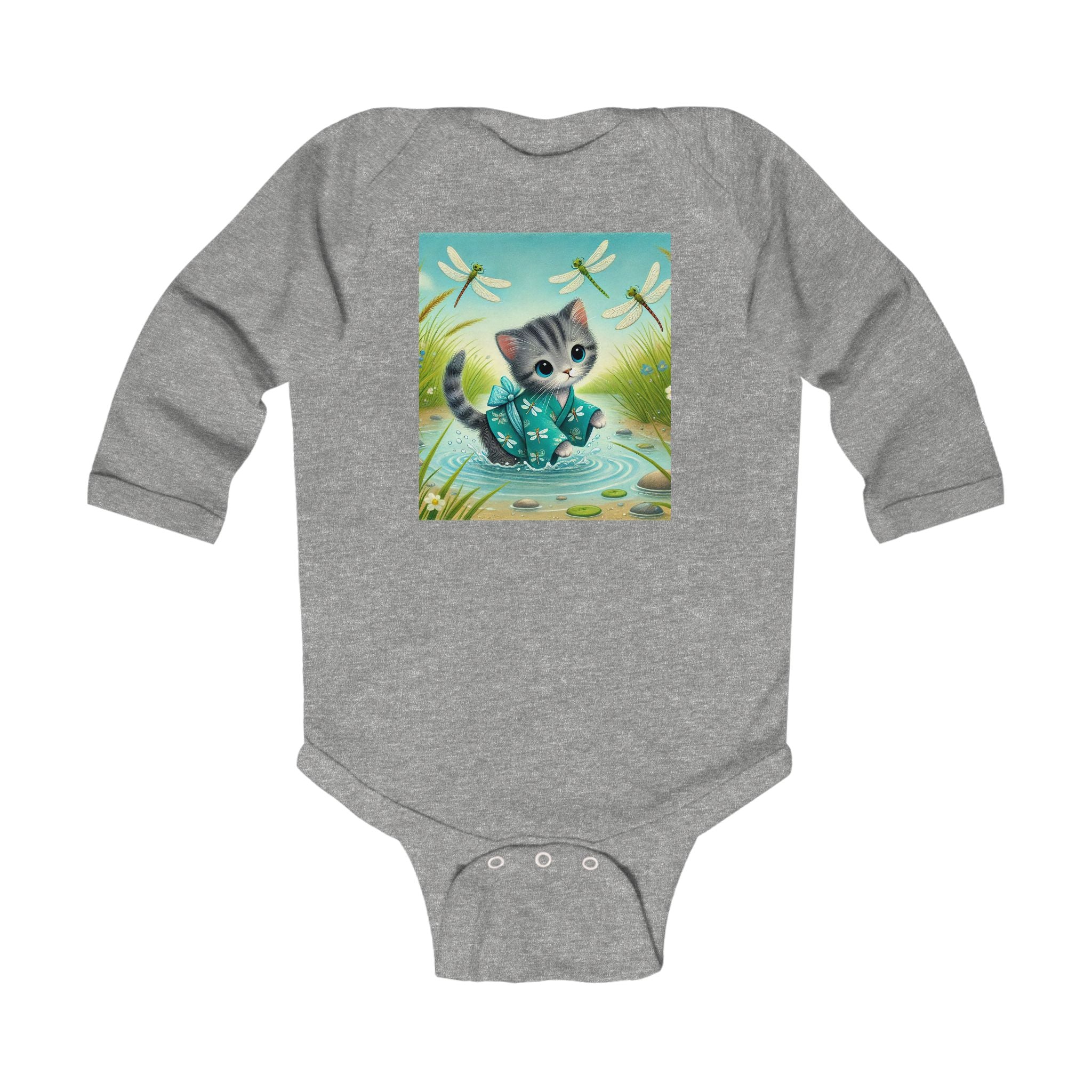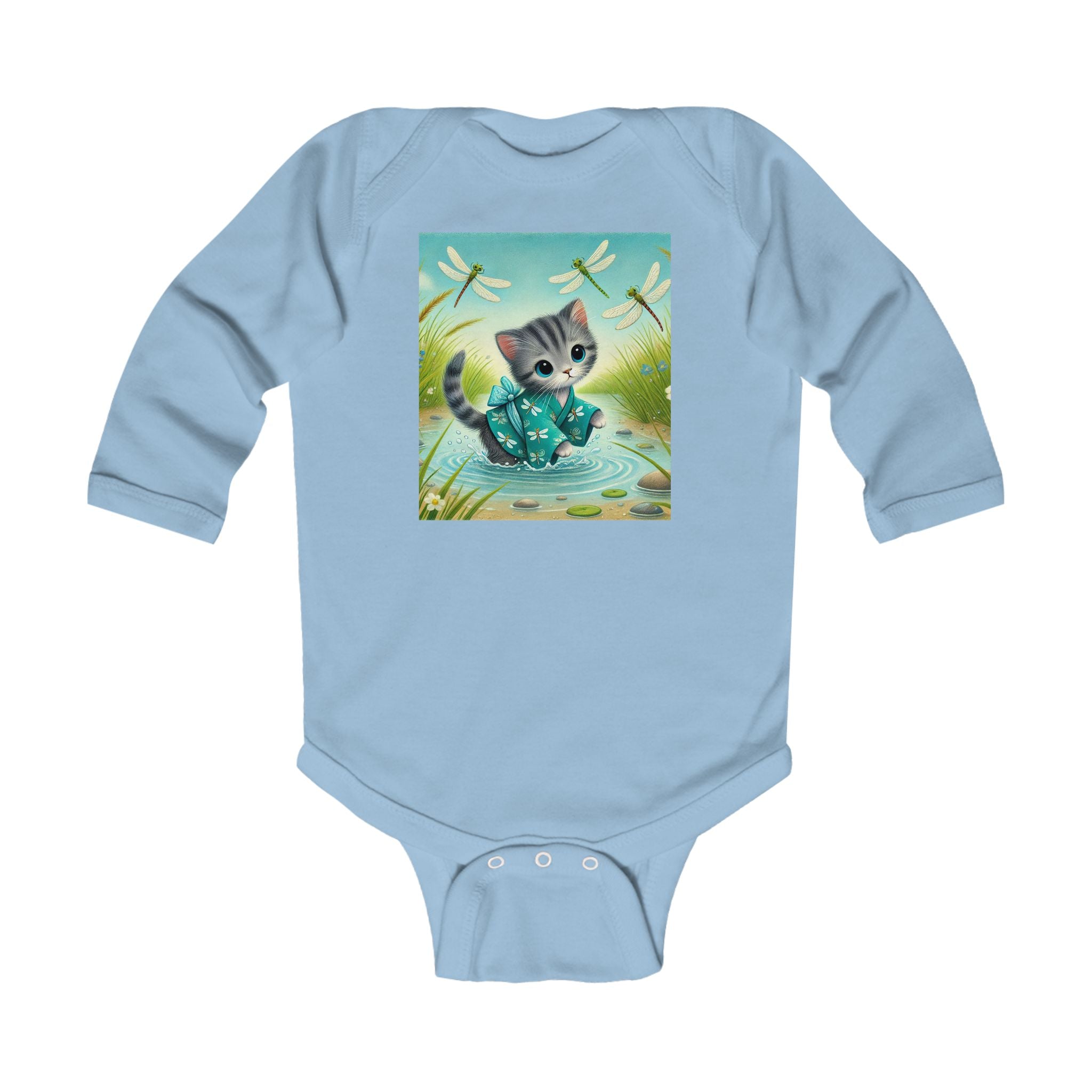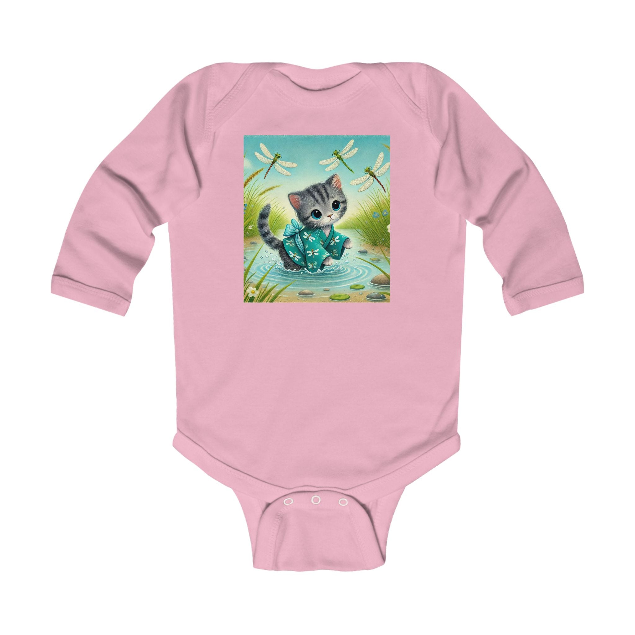 Kitten by the Still Waters tells a tender story of curiosity and calm. A gray tabby kitten wades through a tranquil pond, dressed in a teal kimono decorated with tiny dragonfly motifs. Real dragonflies hover above the rippling water, their wings catching the sunlight as they drift among reeds, pebbles, and soft meadow blooms. The air feels alive with gentle motion and quiet beauty. Rendered in flat, storybook-style colors with exquisite detail, this enchanting artwork captures the harmony between playfulness and peace, perfectly suited for little dreamers.