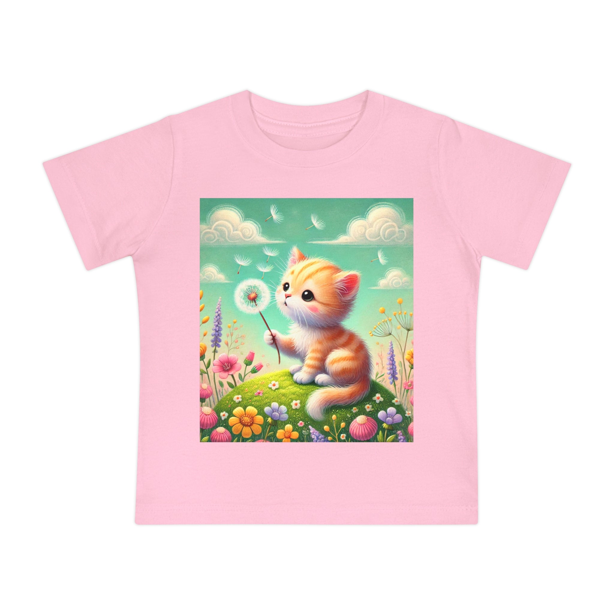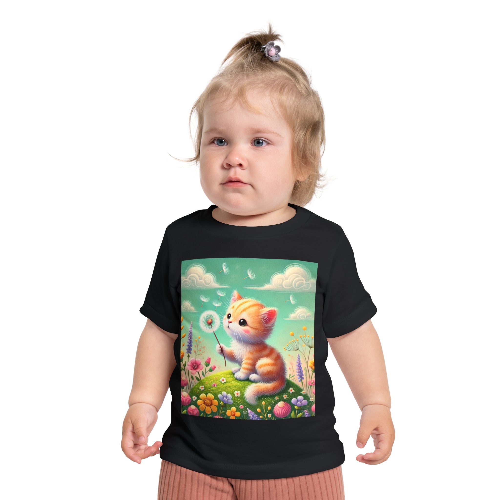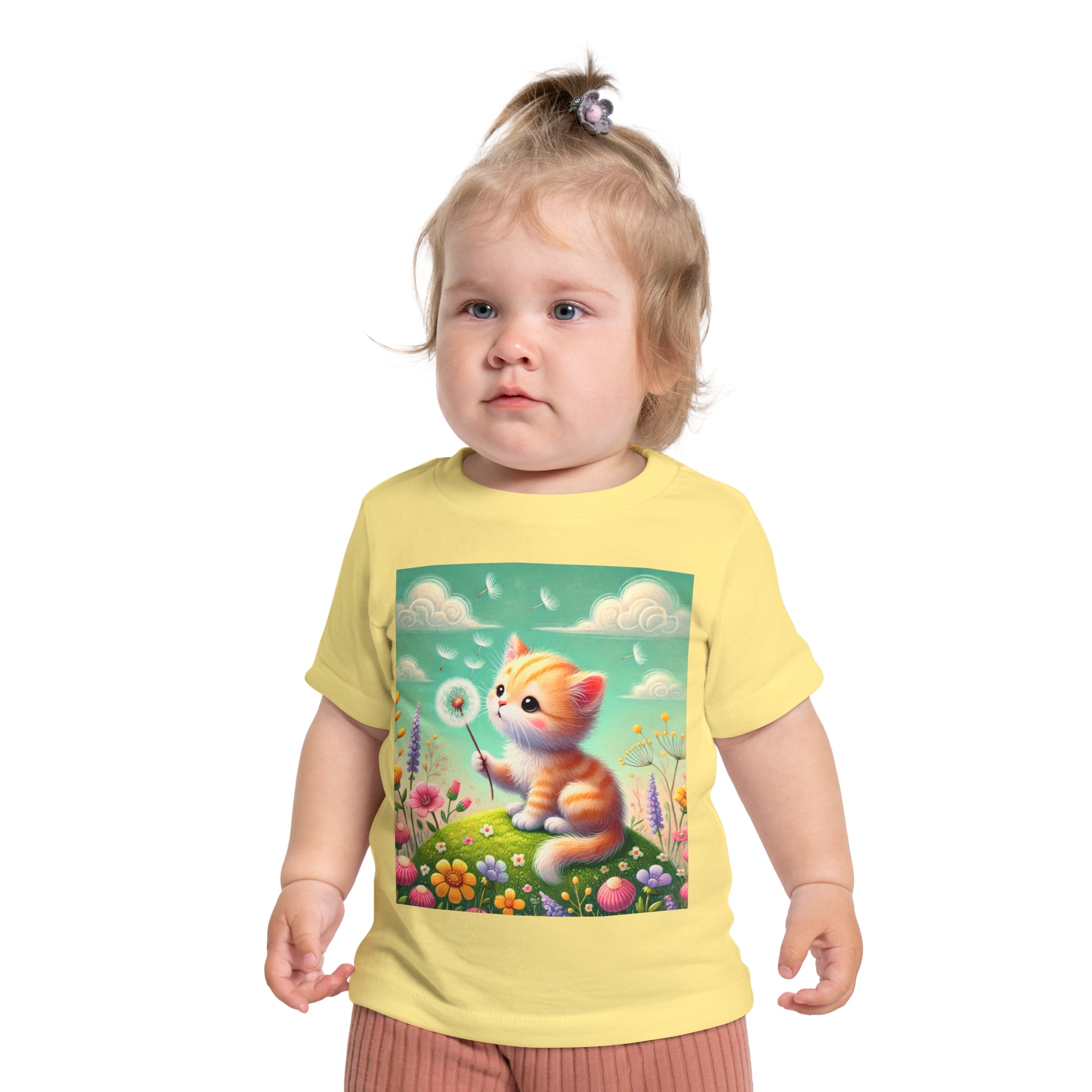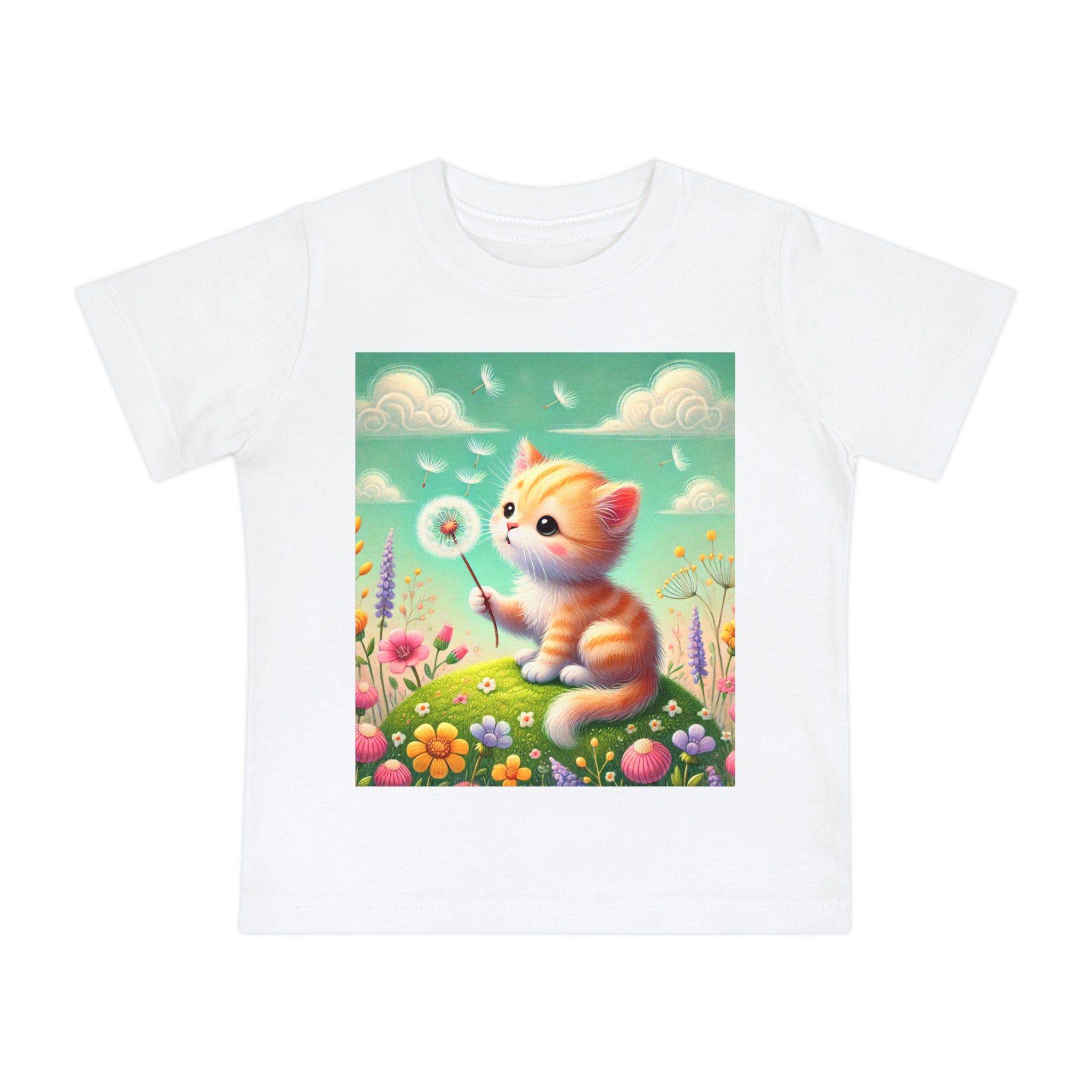 Kitten’s Whispers of Spring captures the pure joy and innocence of a gentle spring morning. A sweet orange kitten sits on a sunlit grassy hill, holding a soft dandelion puff as its tiny seeds drift into a turquoise sky. Around the curious kitten, cheerful spring flowers—lavender, daisies, and pink blossoms—bloom in radiant color beneath softly swirling clouds. The scene glows with warmth and tenderness, rendered in flat, storybook-style colors that bring the season’s playful spirit to life. This charming artwork evokes the quiet magic of nature and the curiosity of a young heart exploring the beauty of springtime.