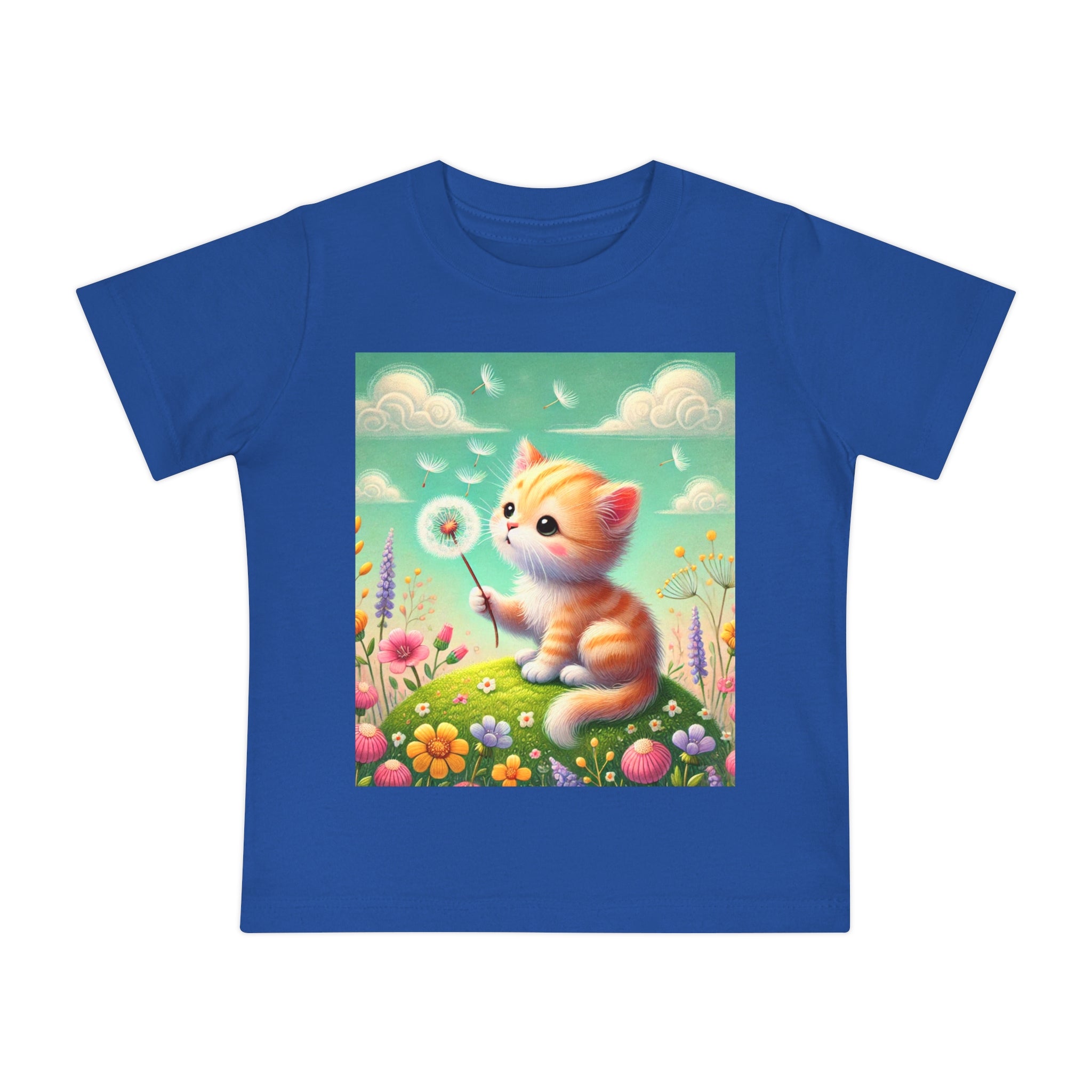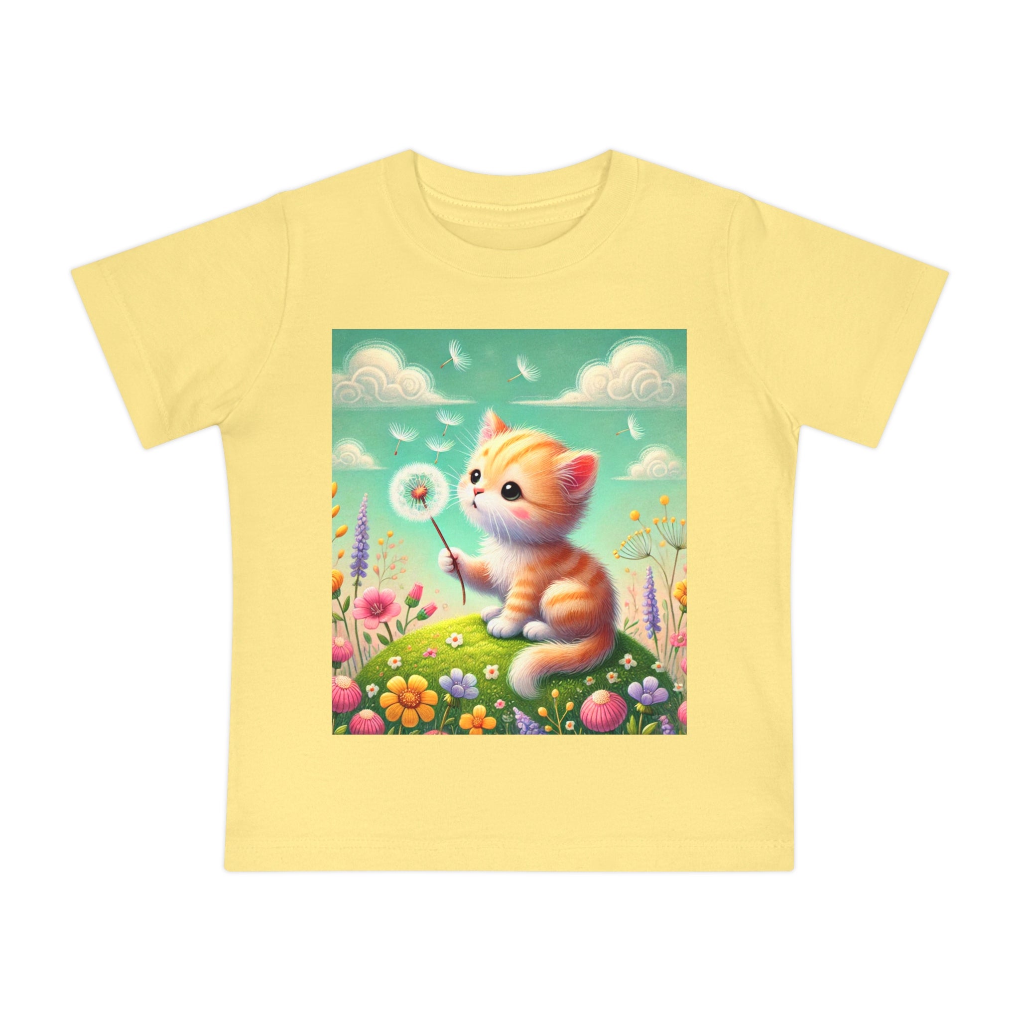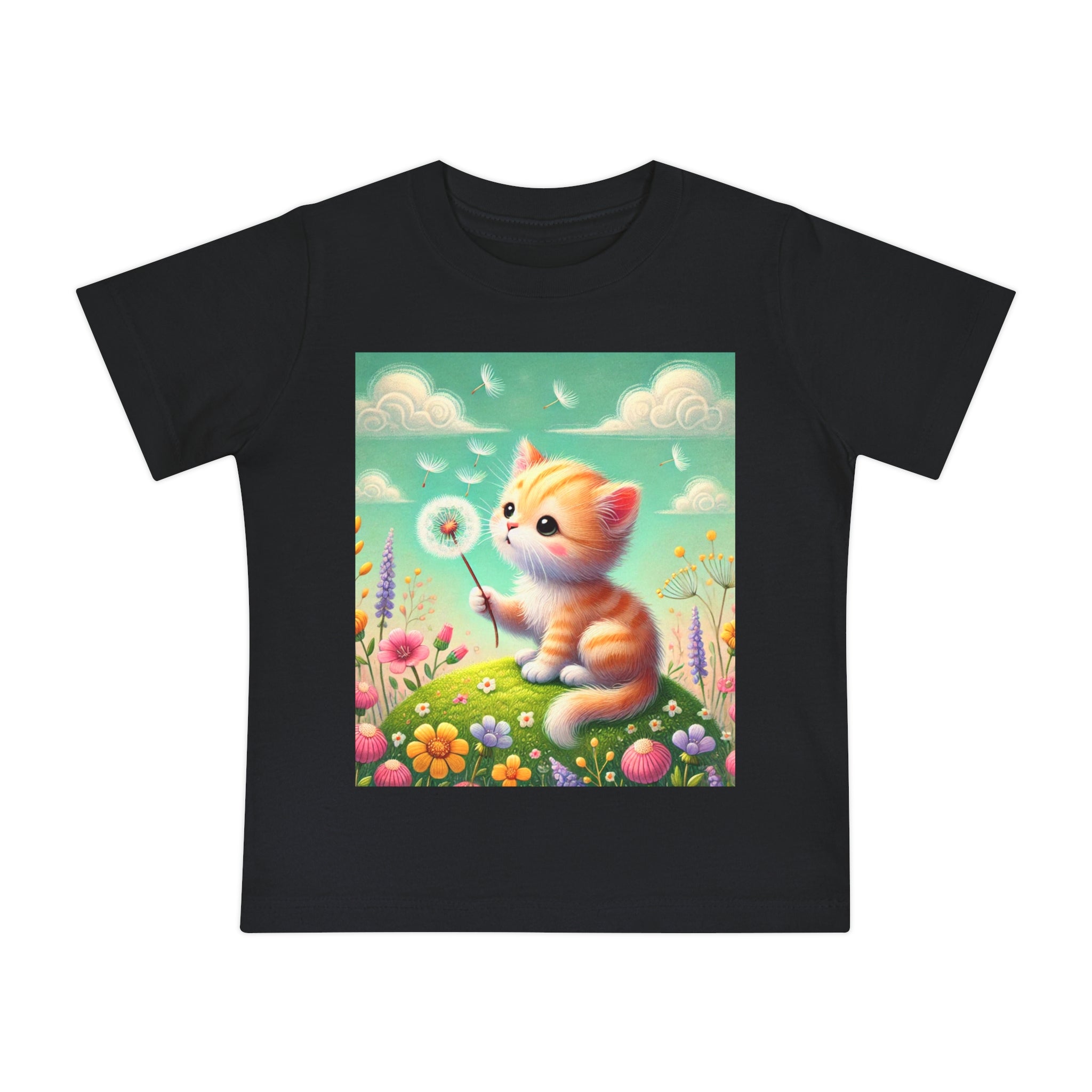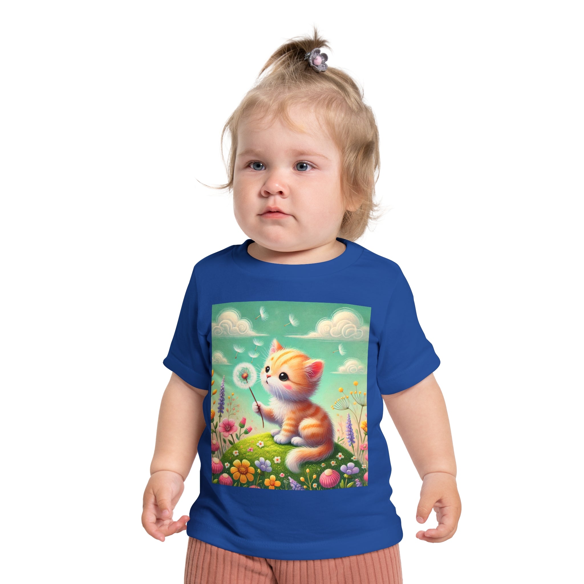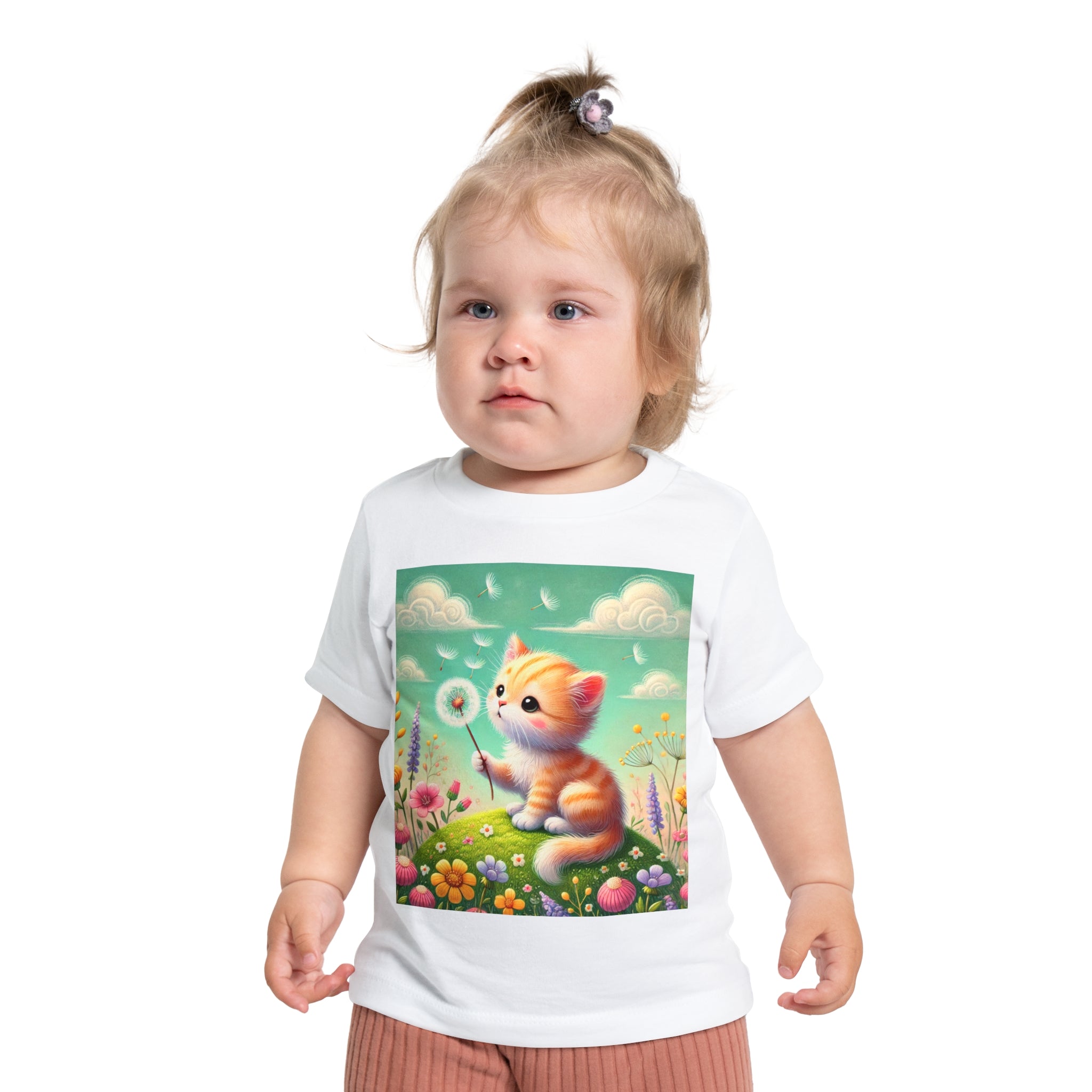 Kitten’s Whispers of Spring captures the pure joy and innocence of a gentle spring morning. A sweet orange kitten sits on a sunlit grassy hill, holding a soft dandelion puff as its tiny seeds drift into a turquoise sky. Around the curious kitten, cheerful spring flowers—lavender, daisies, and pink blossoms—bloom in radiant color beneath softly swirling clouds. The scene glows with warmth and tenderness, rendered in flat, storybook-style colors that bring the season’s playful spirit to life. This charming artwork evokes the quiet magic of nature and the curiosity of a young heart exploring the beauty of springtime.