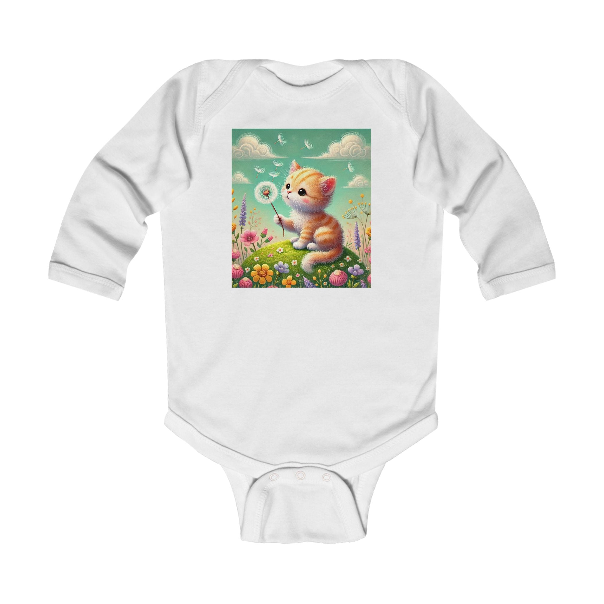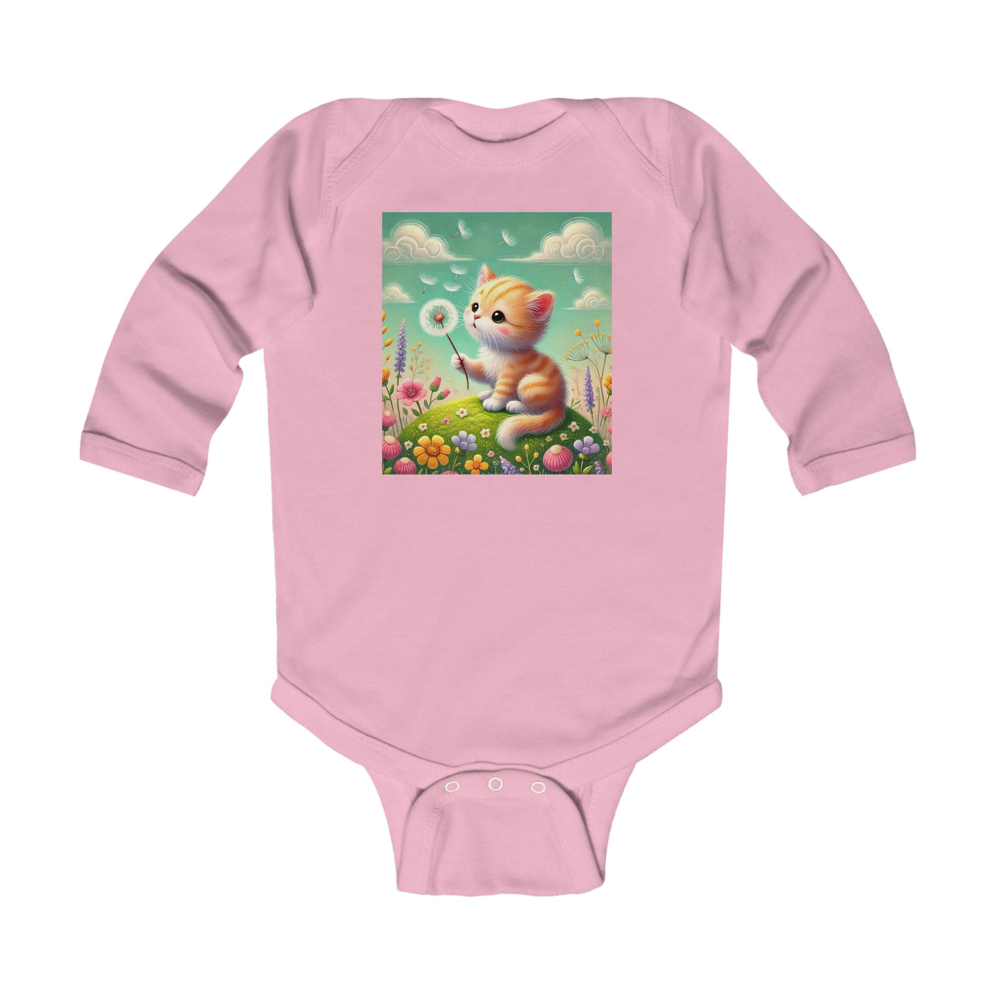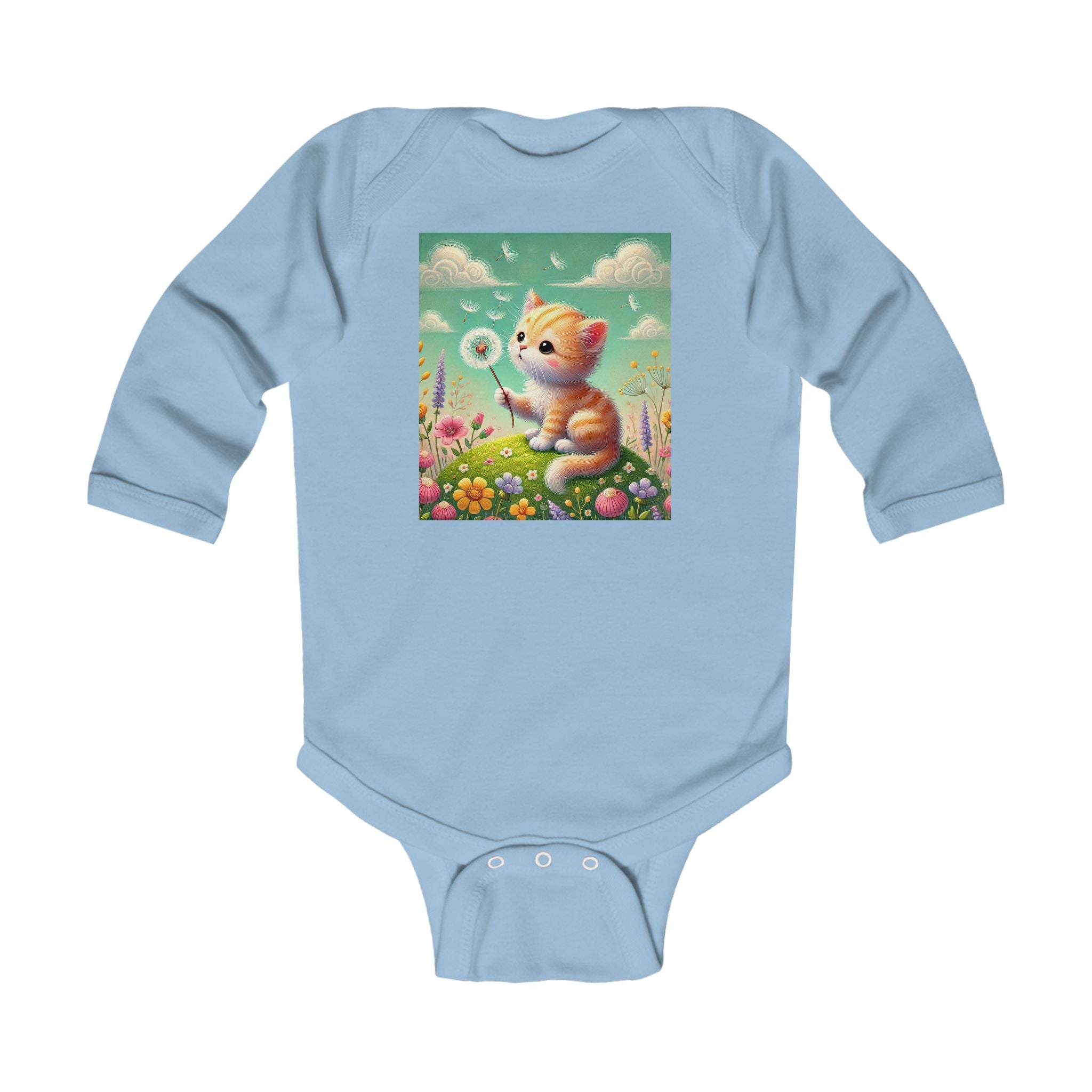 Kitten’s Whispers of Spring captures a heartwarming moment of pure innocence — a sweet orange kitten sitting on a sunlit grassy hill, clutching a dandelion puff as its seeds drift into a turquoise sky. Around the kitten, cheerful spring flowers—lavender, daisies, and pink blossoms—bloom in full color beneath whimsical, softly swirling clouds. The scene radiates warmth and tenderness, rendered in flat, storybook-style colors with delicate details that bring the magic of early spring to life.