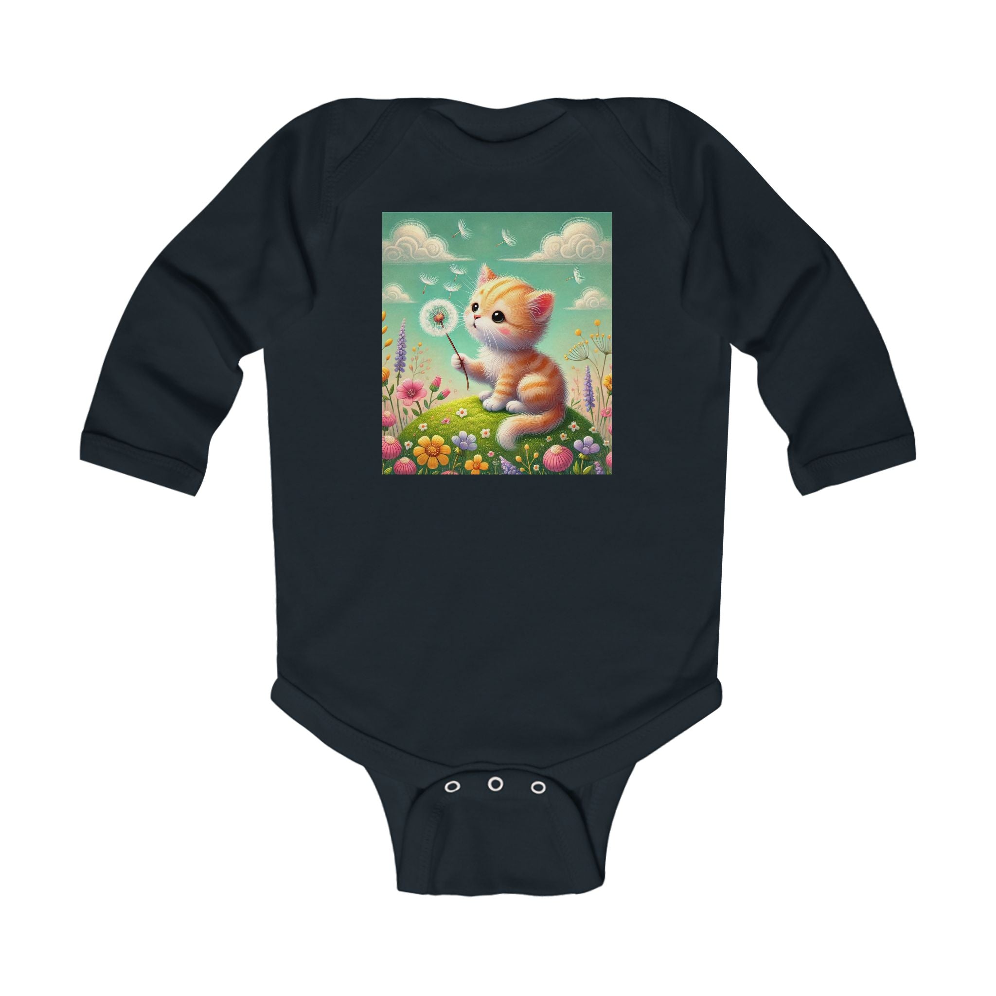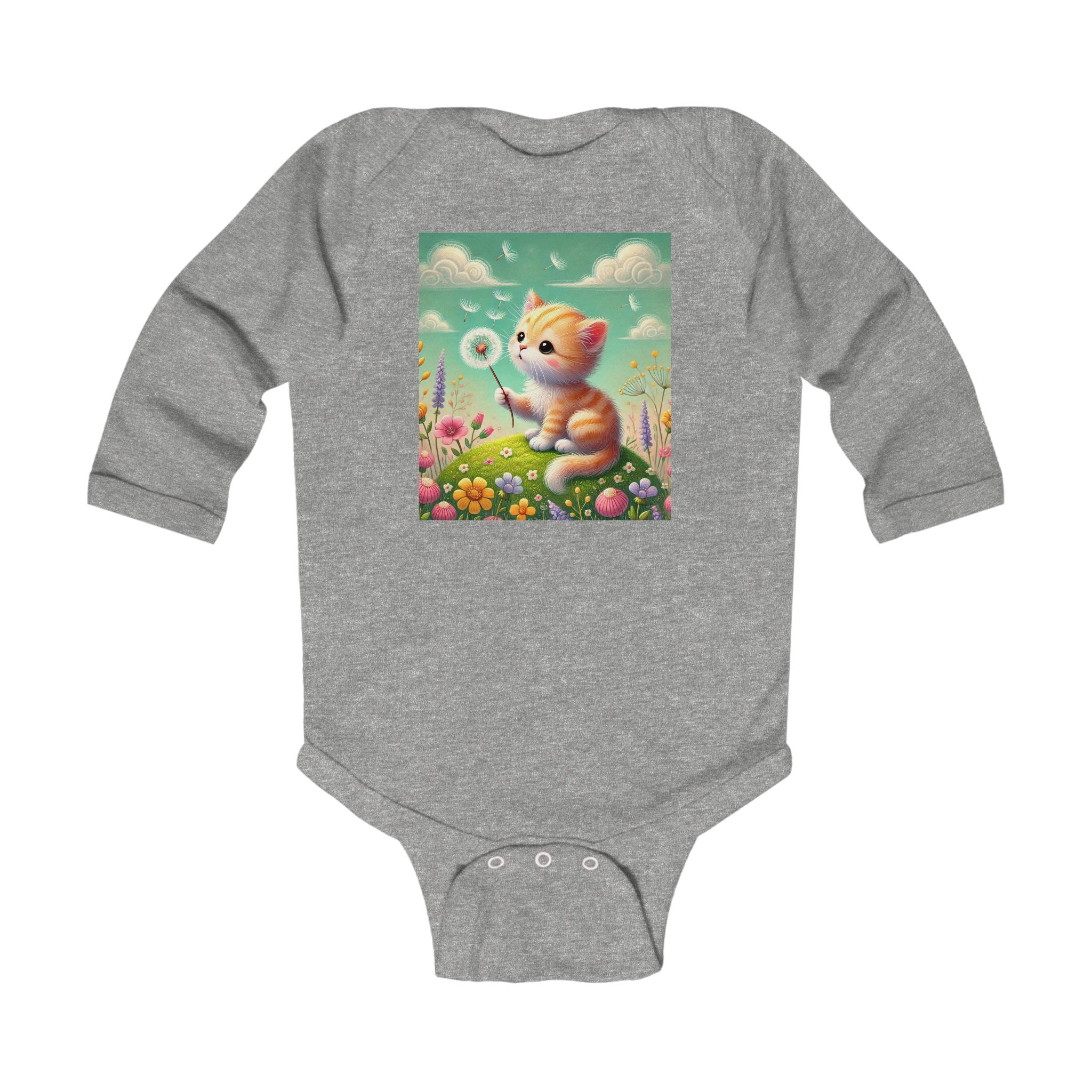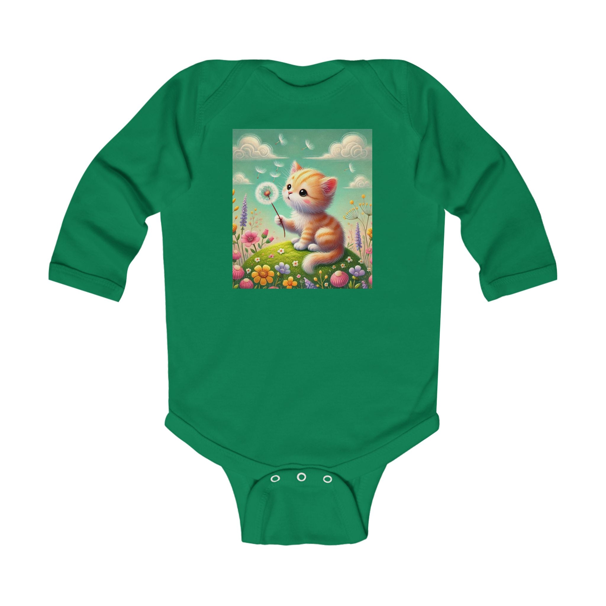 Kitten’s Whispers of Spring captures a heartwarming moment of pure innocence — a sweet orange kitten sitting on a sunlit grassy hill, clutching a dandelion puff as its seeds drift into a turquoise sky. Around the kitten, cheerful spring flowers—lavender, daisies, and pink blossoms—bloom in full color beneath whimsical, softly swirling clouds. The scene radiates warmth and tenderness, rendered in flat, storybook-style colors with delicate details that bring the magic of early spring to life.
