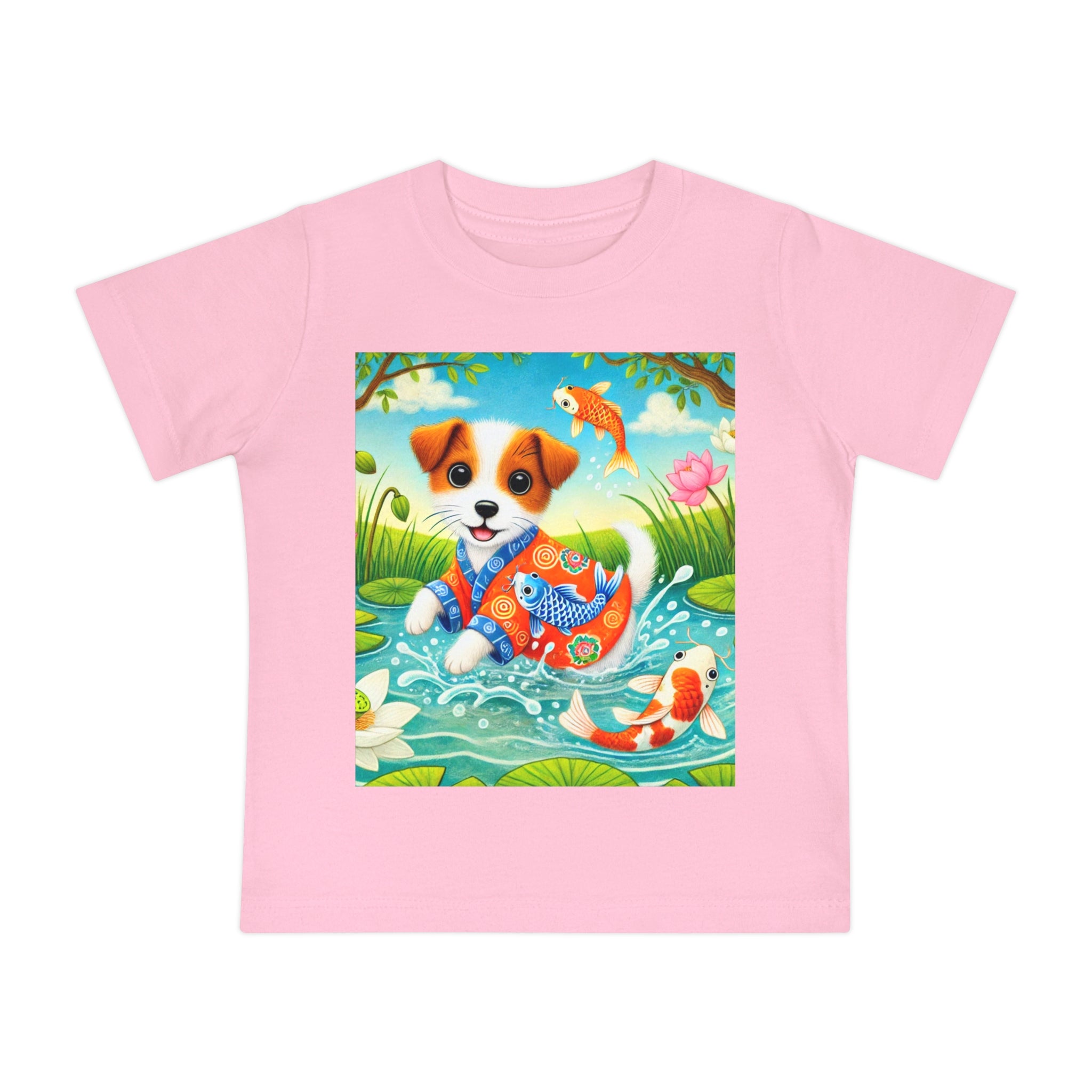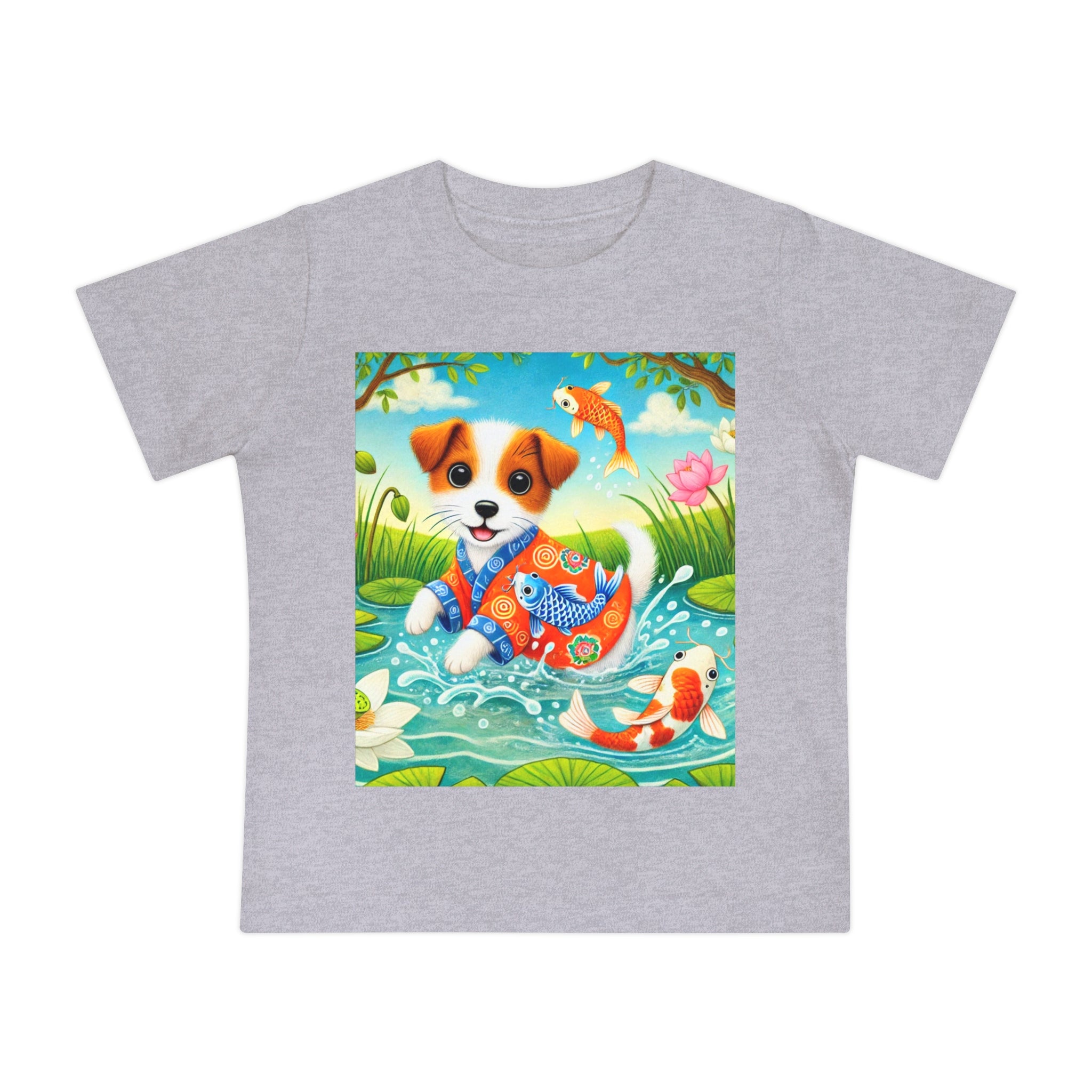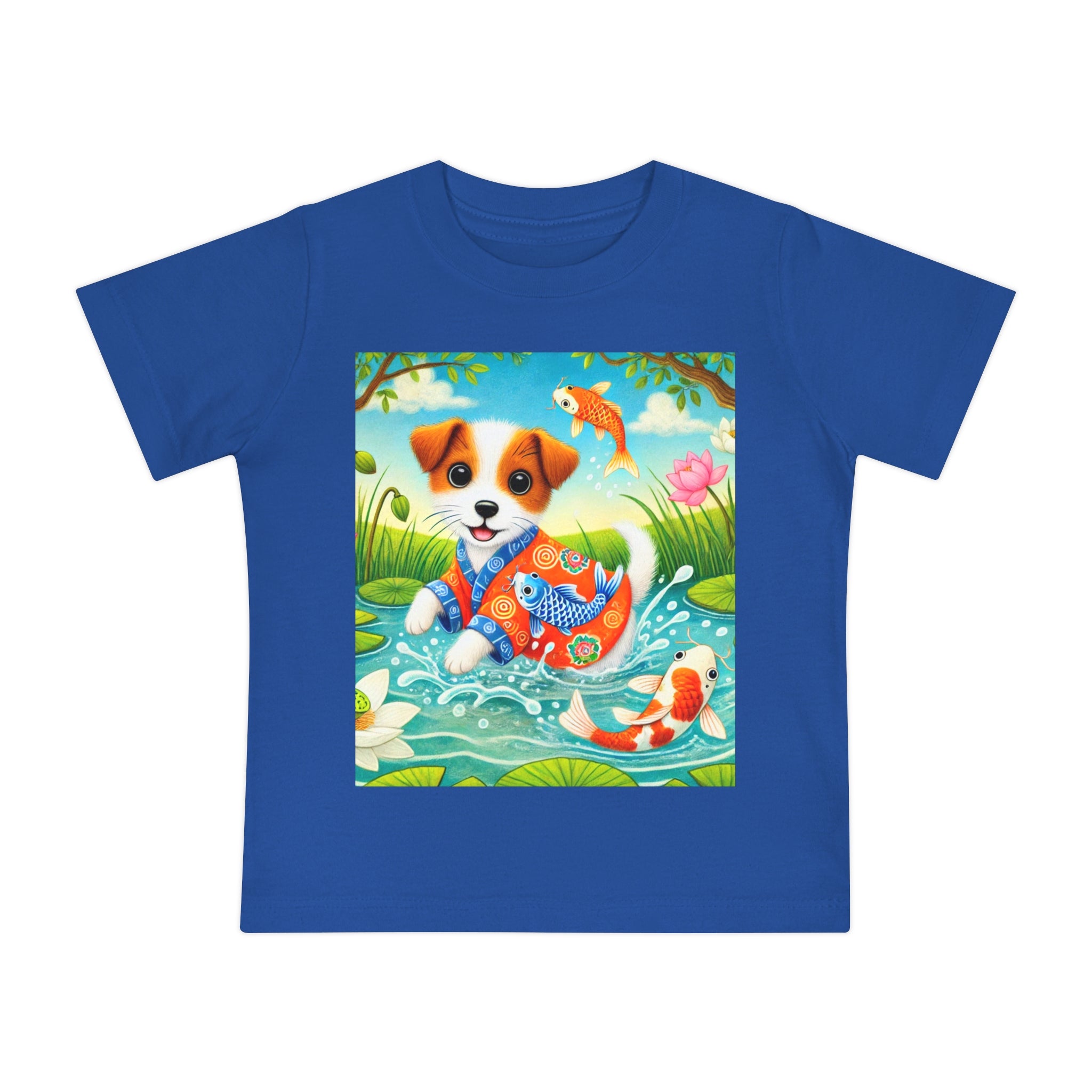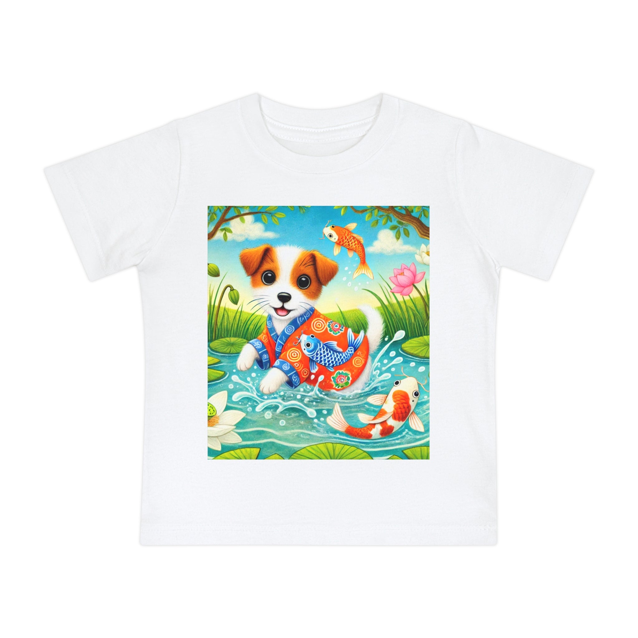 Koi Pond Puppy captures a heartwarming blend of joy, innocence, and cultural charm. In this serene scene, a cheerful puppy splashes playfully in a tranquil koi pond, dressed in a bright orange and blue kimono adorned with traditional Japanese motifs. Around the happy pup, colorful koi fish glide gracefully through rippling water, their shimmering scales catching the sunlight. Pink lotus blossoms bloom beside soft green lily pads, while delicate branches stretch above beneath a calm turquoise sky. Rendered in flat, storybook-style colors with fine, playful details, this delightful artwork evokes peace, curiosity, and the gentle beauty of nature — a perfect reflection of childhood wonder.