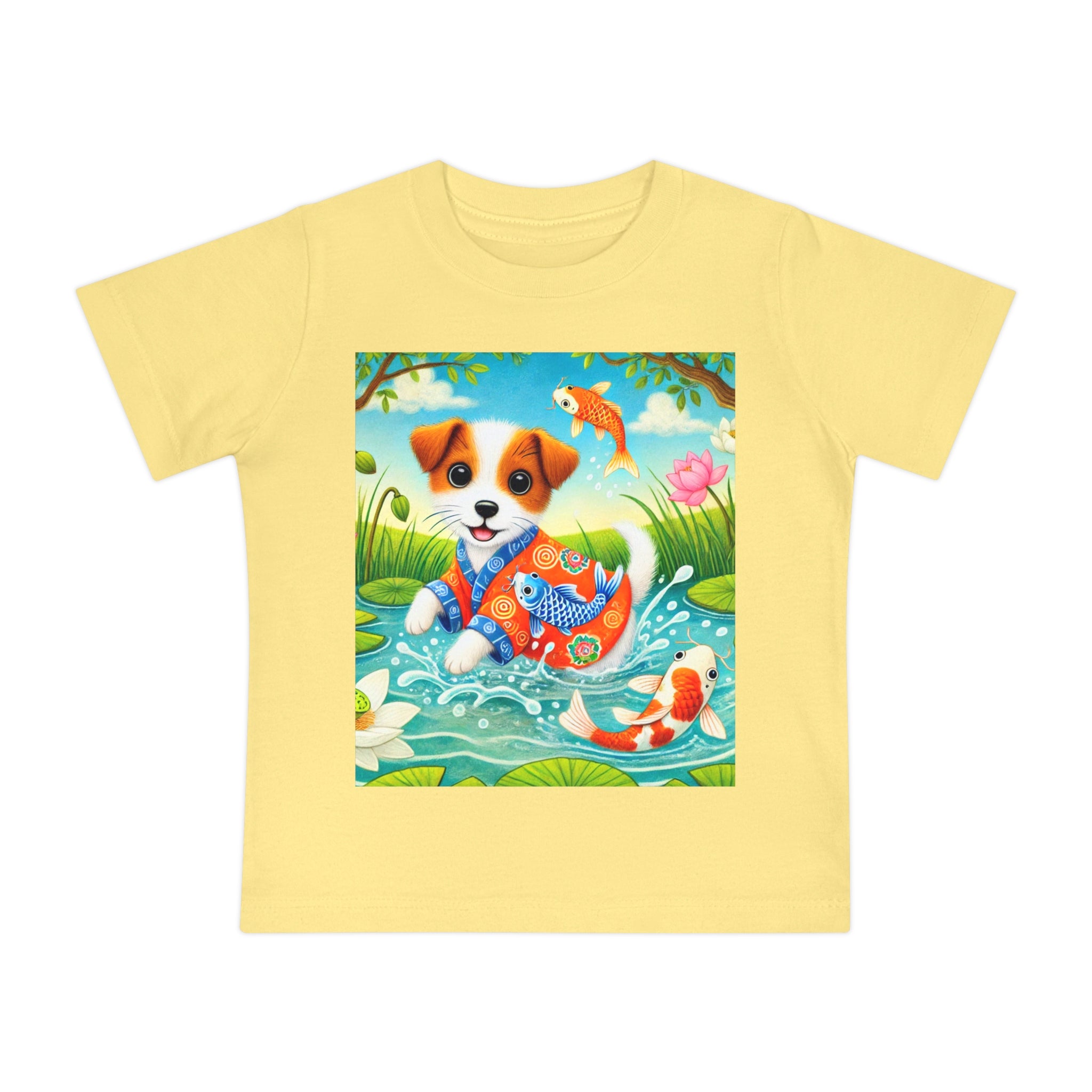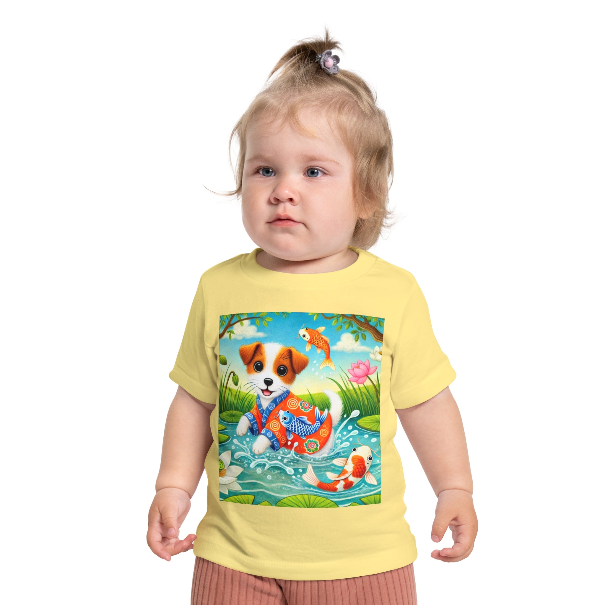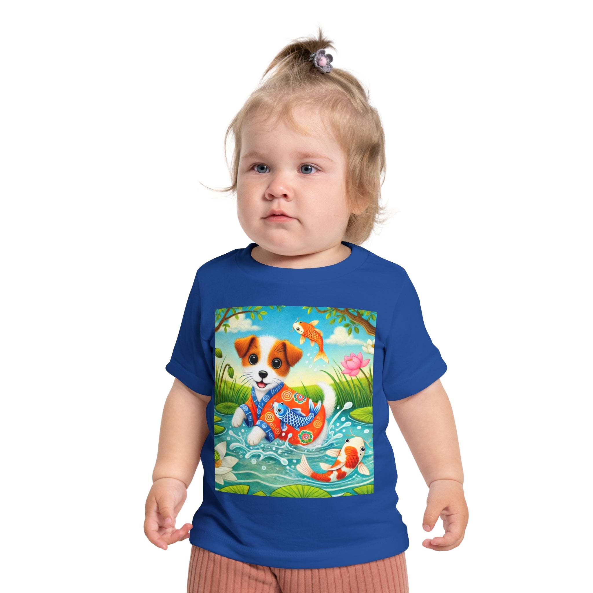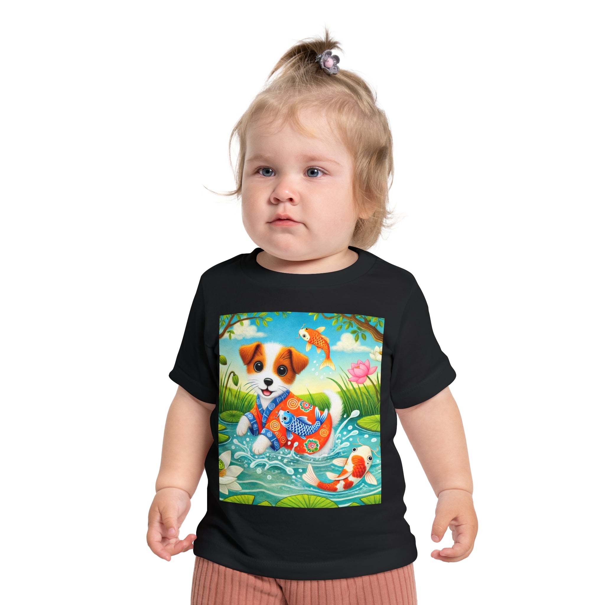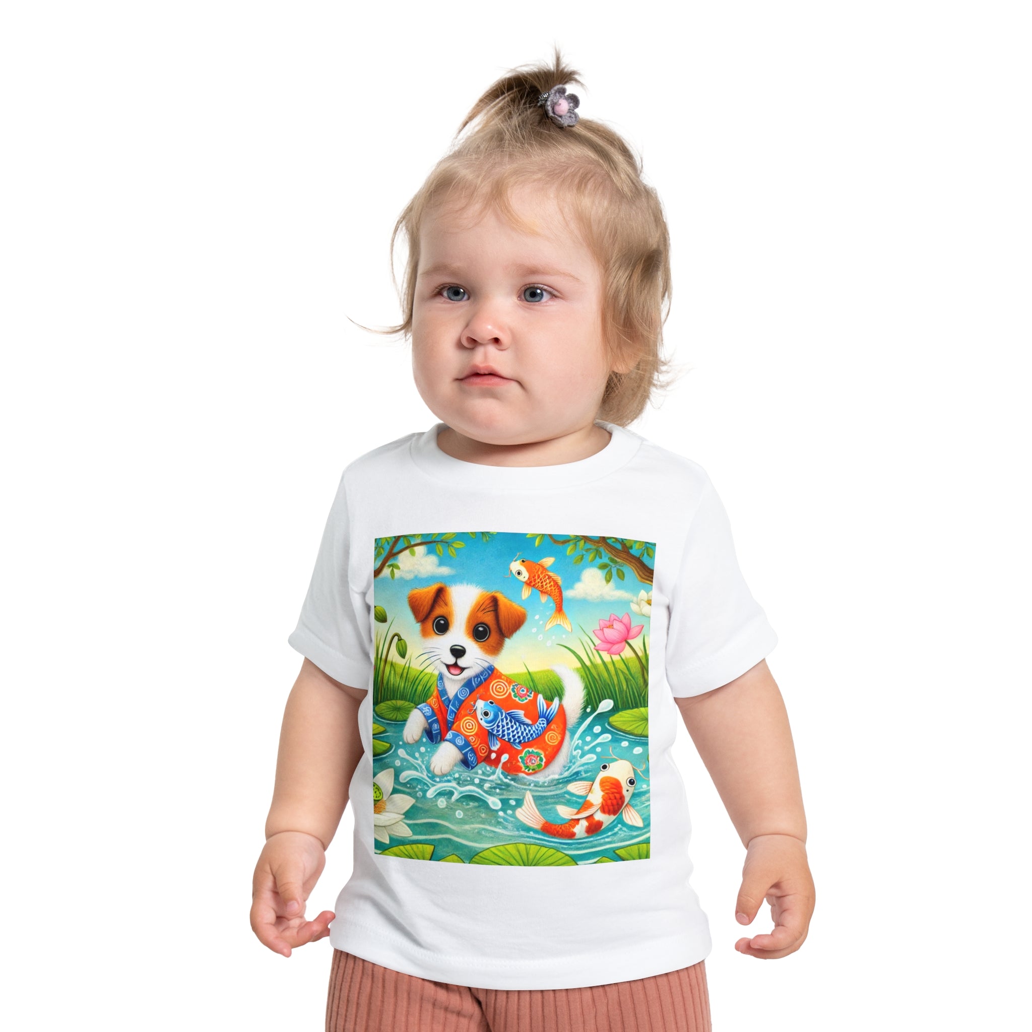 Koi Pond Puppy captures a heartwarming blend of joy, innocence, and cultural charm. In this serene scene, a cheerful puppy splashes playfully in a tranquil koi pond, dressed in a bright orange and blue kimono adorned with traditional Japanese motifs. Around the happy pup, colorful koi fish glide gracefully through rippling water, their shimmering scales catching the sunlight. Pink lotus blossoms bloom beside soft green lily pads, while delicate branches stretch above beneath a calm turquoise sky. Rendered in flat, storybook-style colors with fine, playful details, this delightful artwork evokes peace, curiosity, and the gentle beauty of nature — a perfect reflection of childhood wonder.