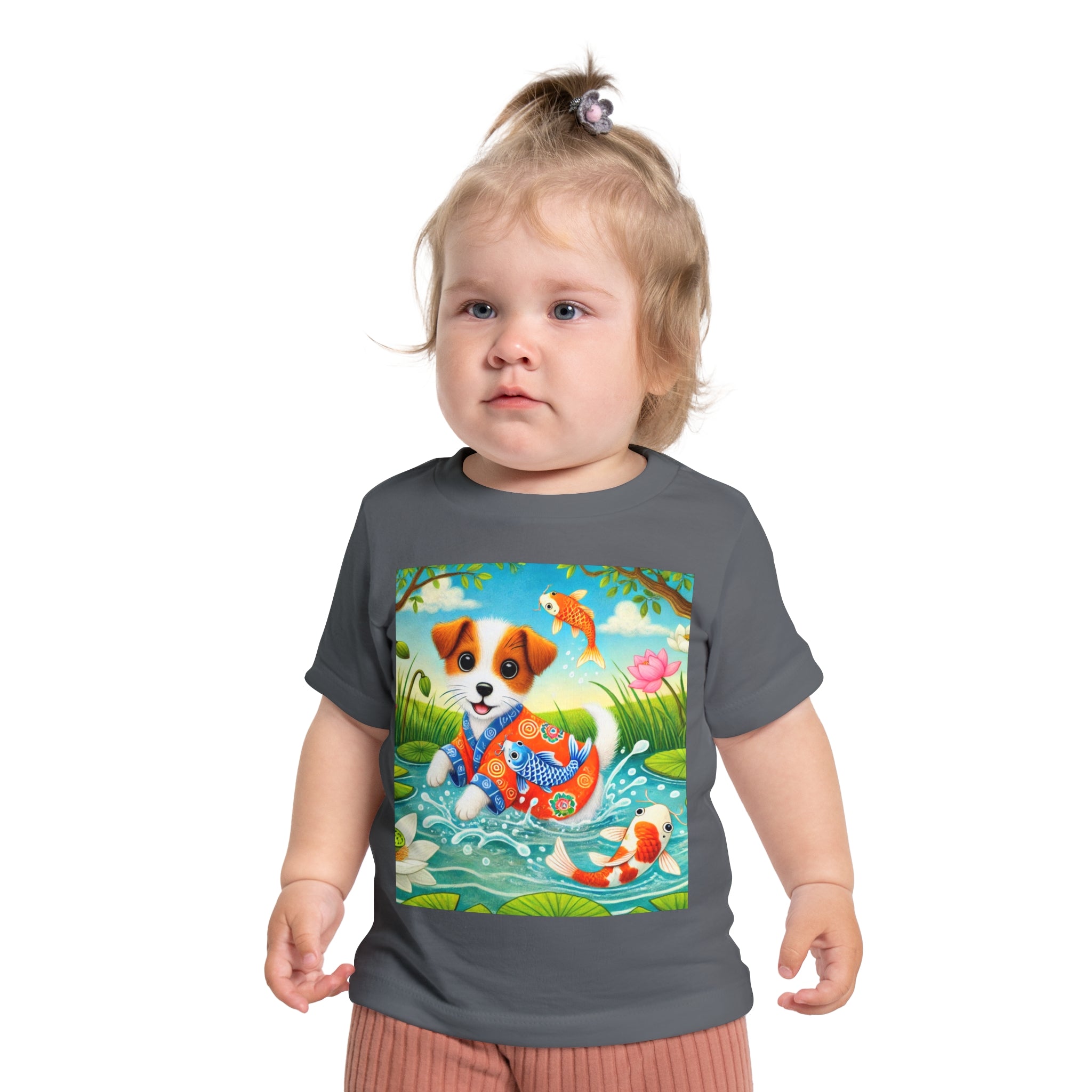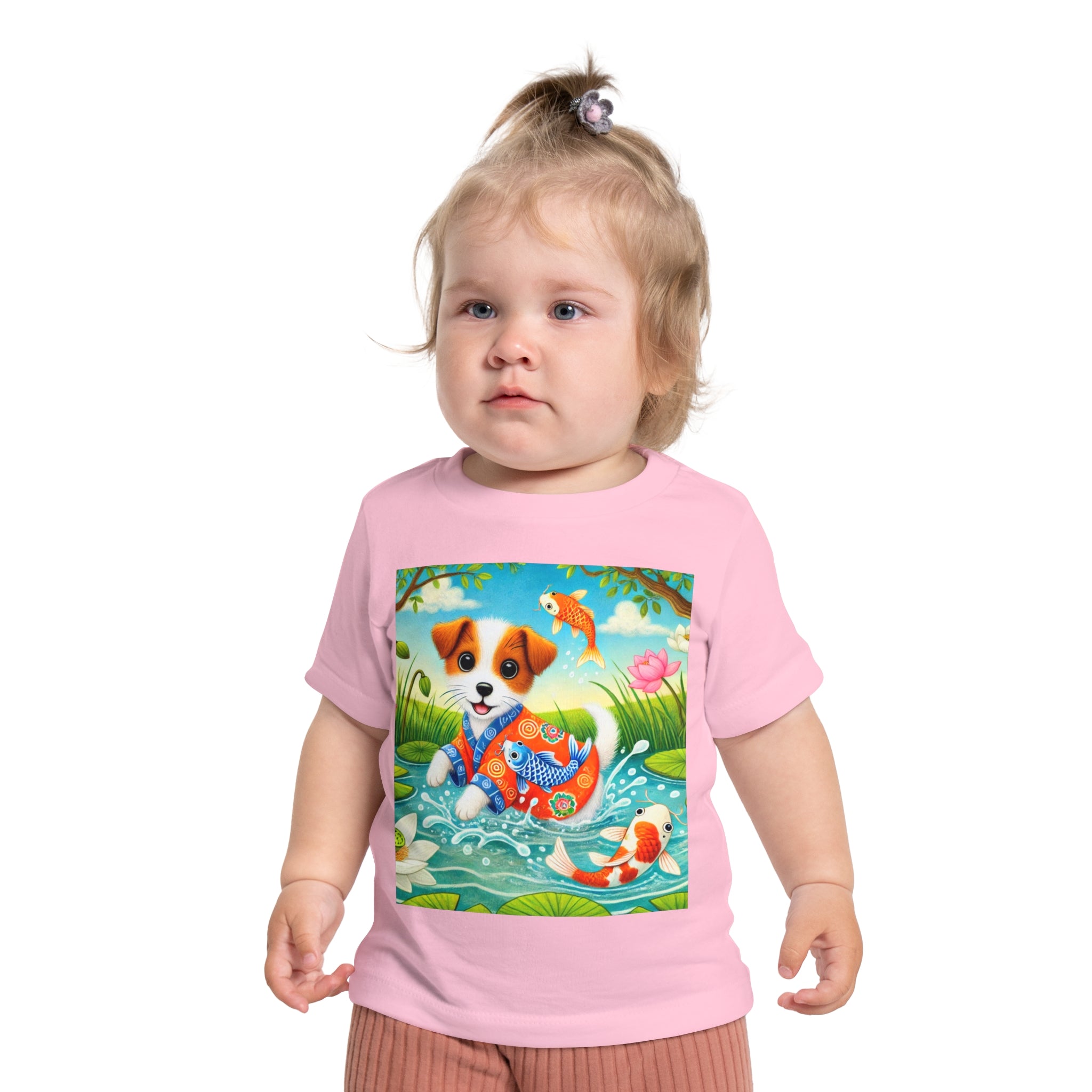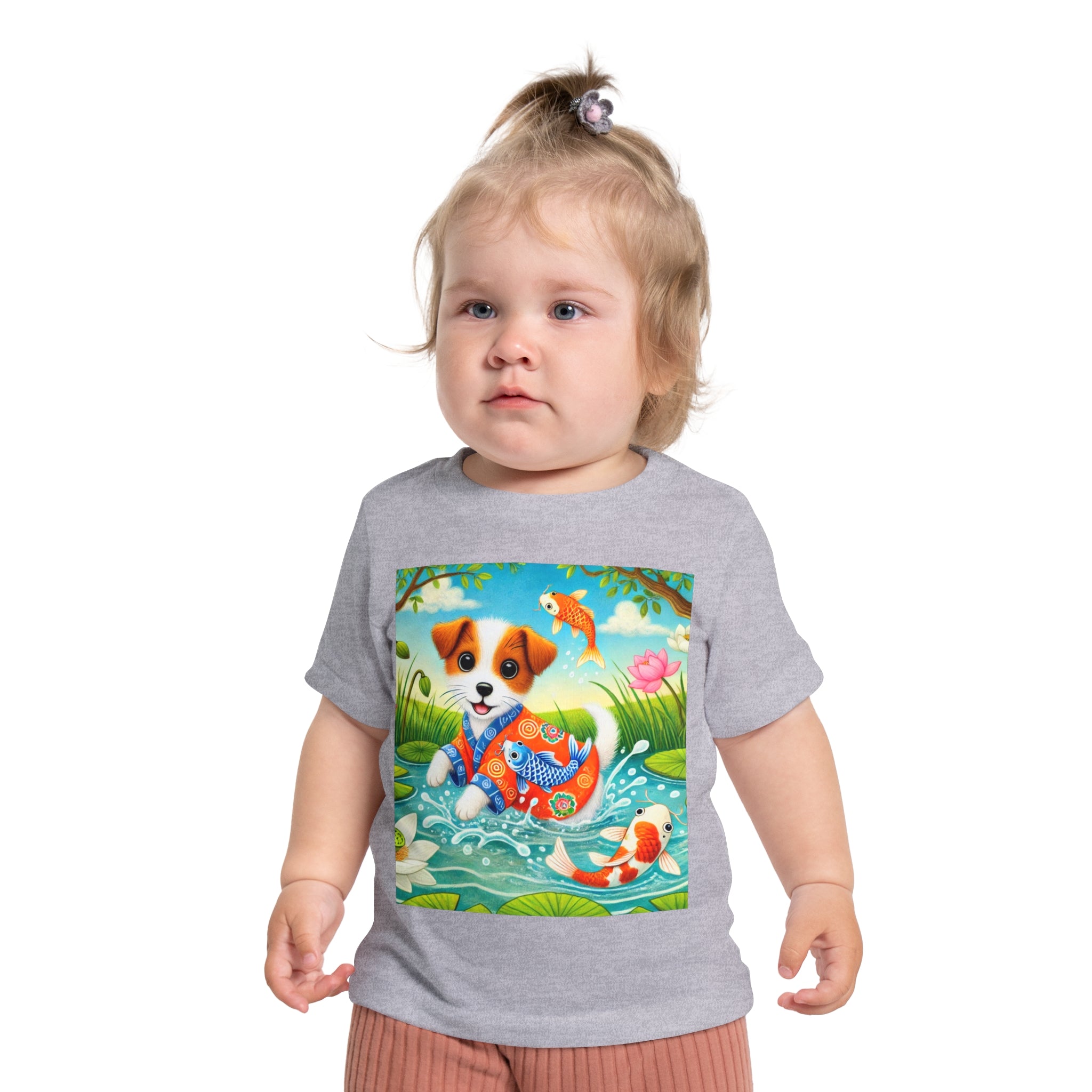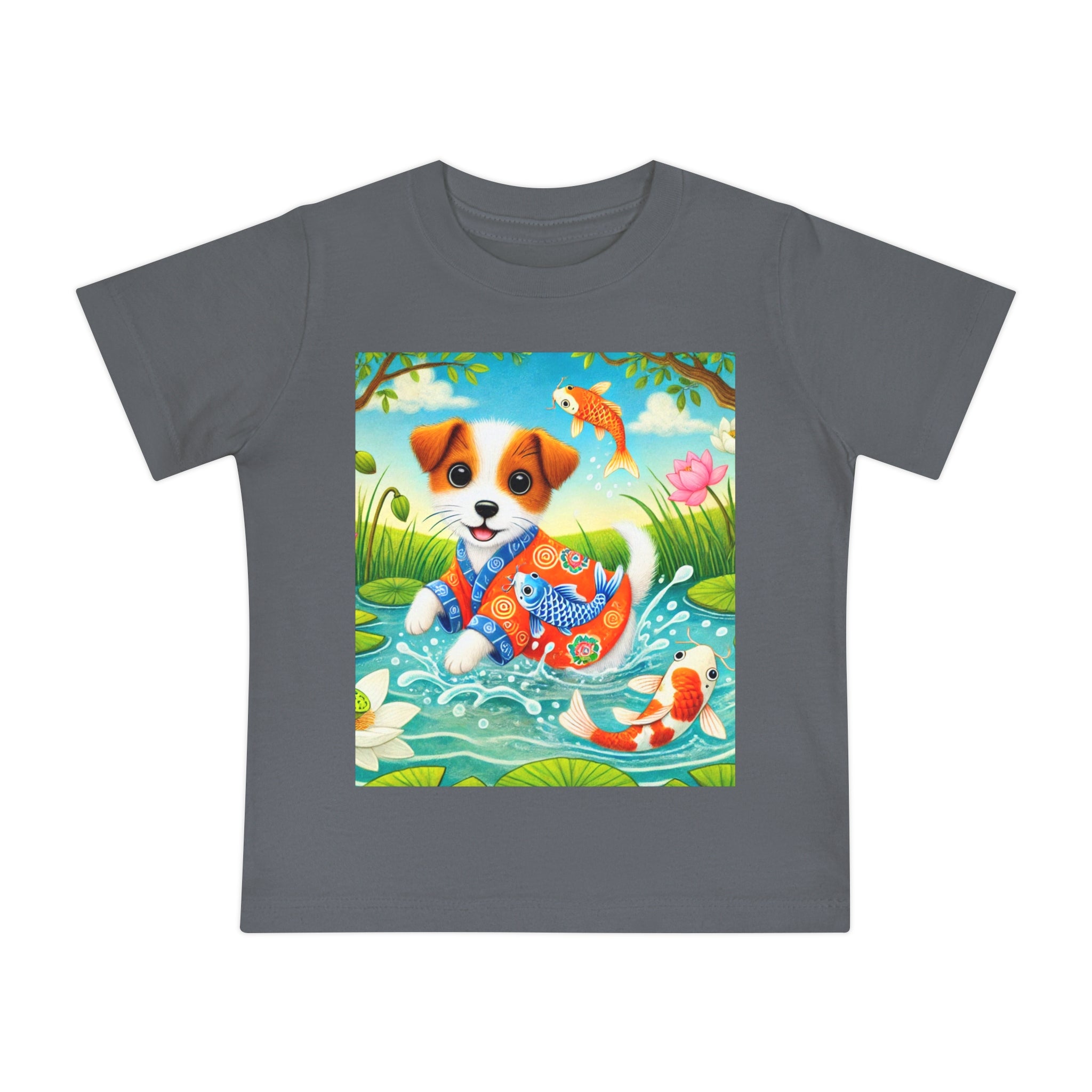 Koi Pond Puppy captures a heartwarming blend of joy, innocence, and cultural charm. In this serene scene, a cheerful puppy splashes playfully in a tranquil koi pond, dressed in a bright orange and blue kimono adorned with traditional Japanese motifs. Around the happy pup, colorful koi fish glide gracefully through rippling water, their shimmering scales catching the sunlight. Pink lotus blossoms bloom beside soft green lily pads, while delicate branches stretch above beneath a calm turquoise sky. Rendered in flat, storybook-style colors with fine, playful details, this delightful artwork evokes peace, curiosity, and the gentle beauty of nature — a perfect reflection of childhood wonder.