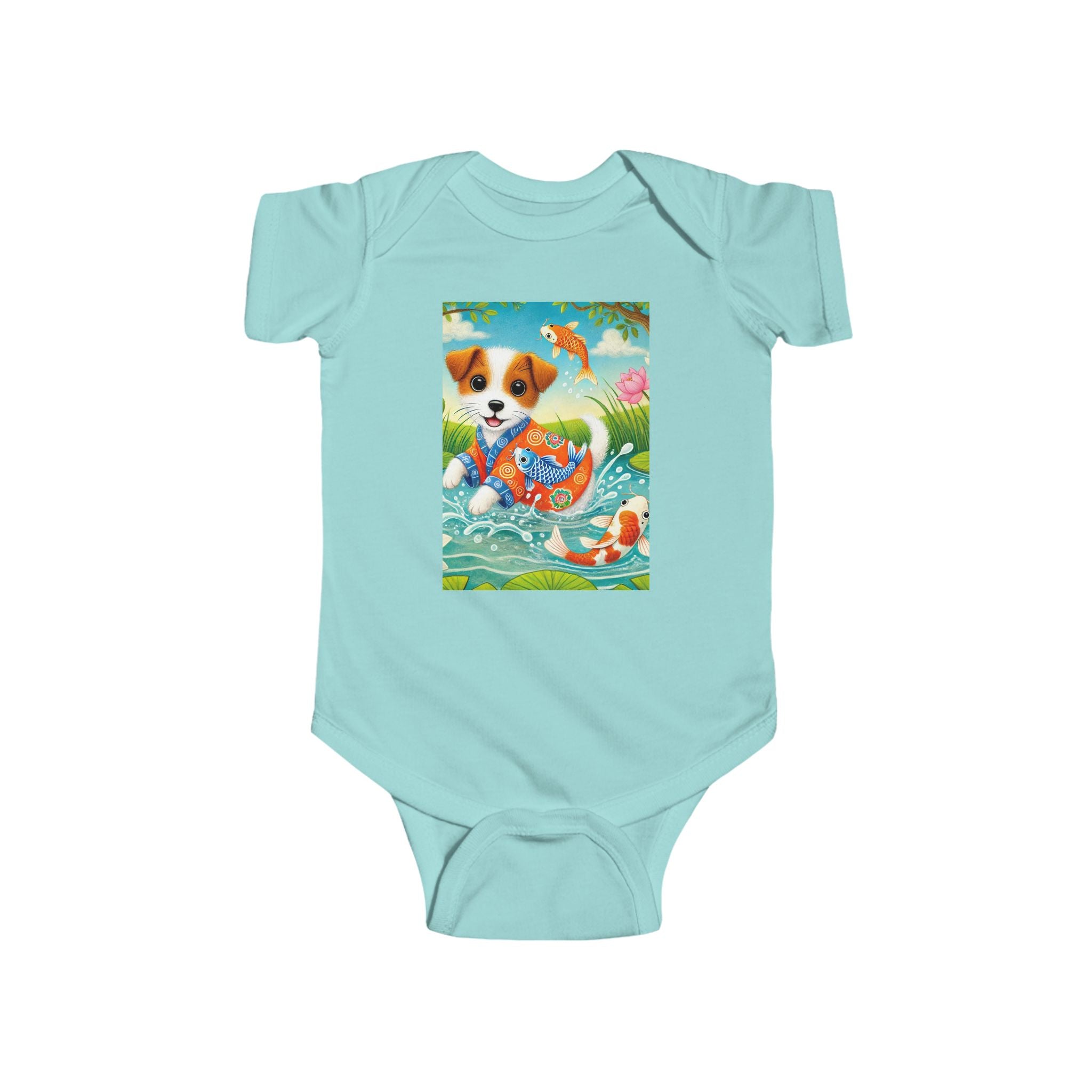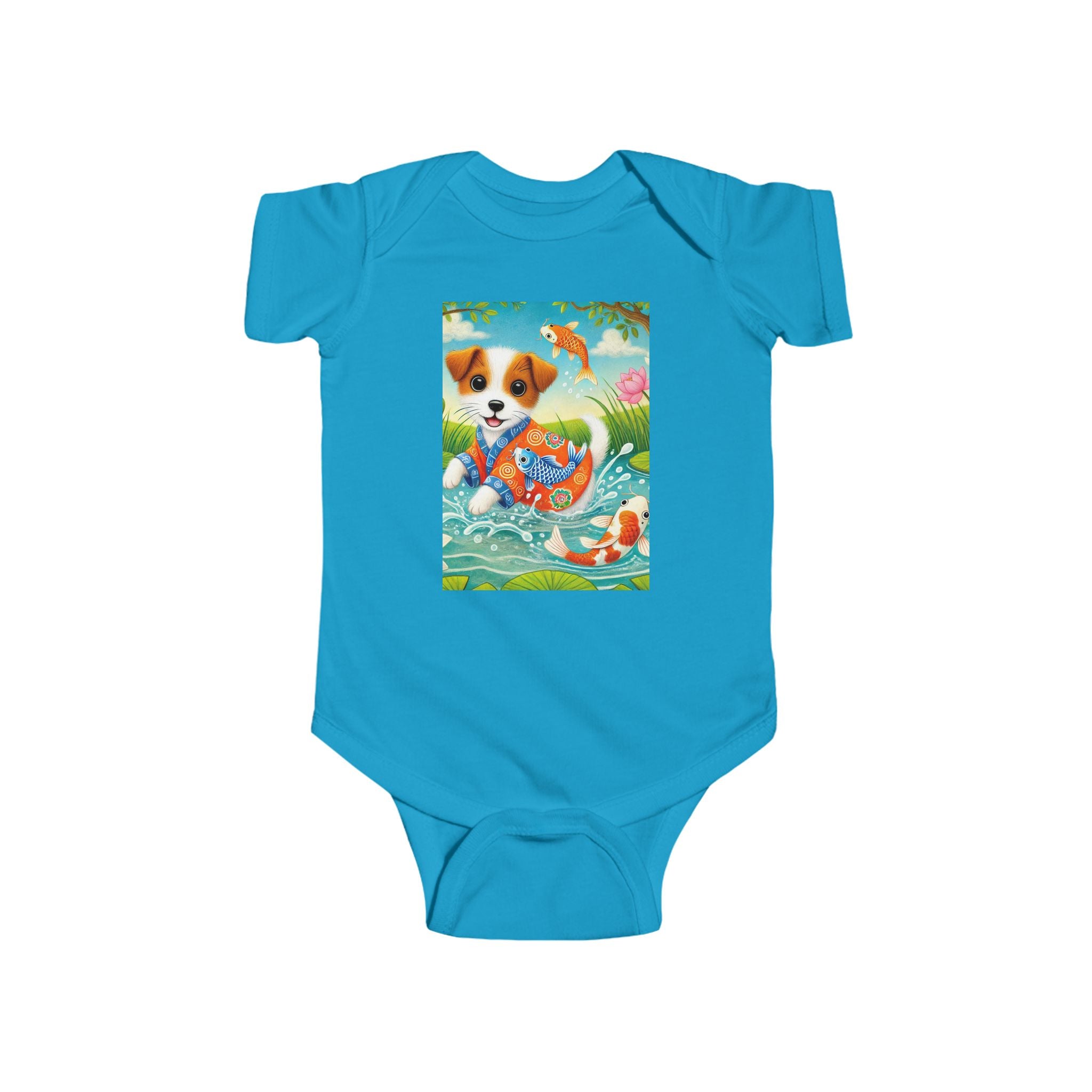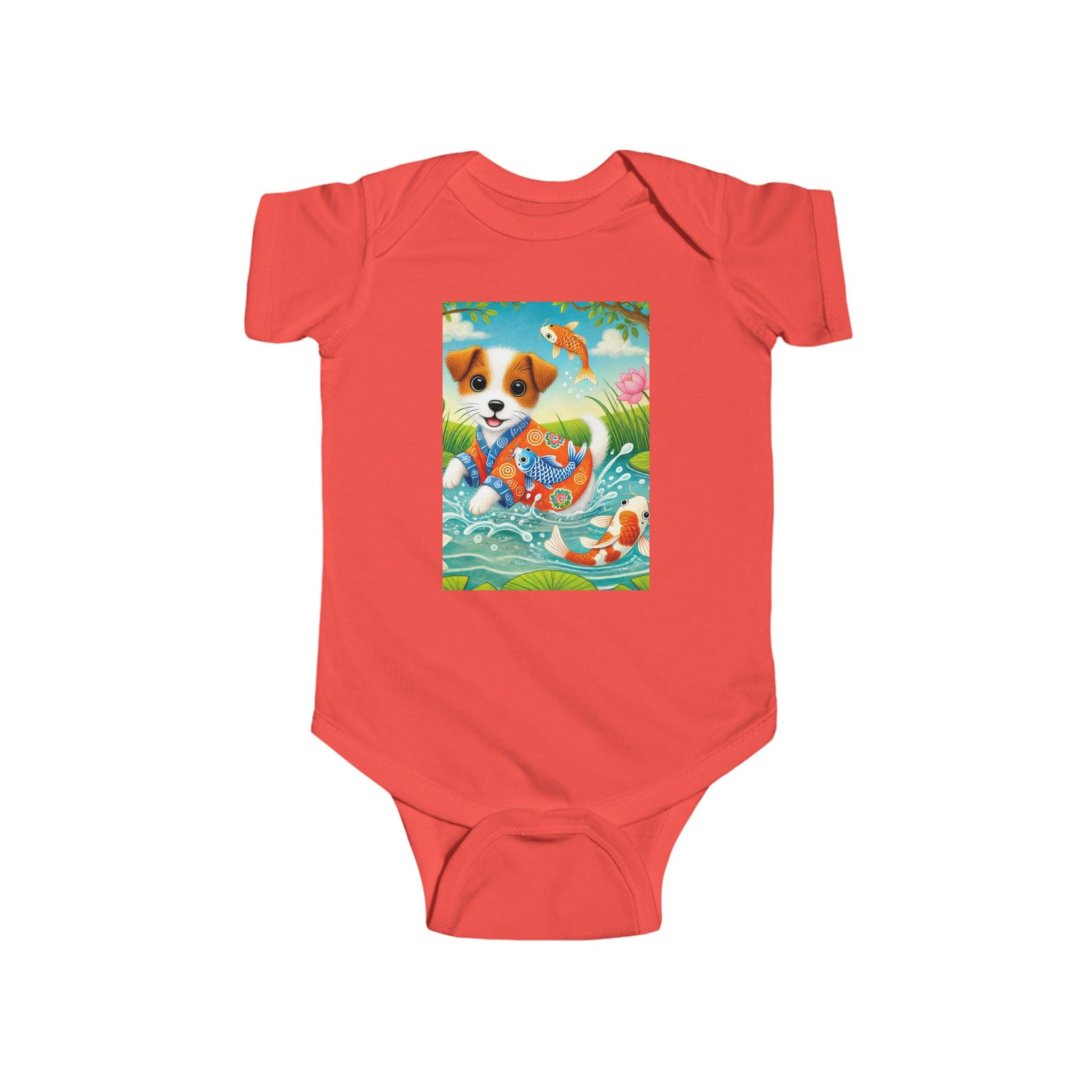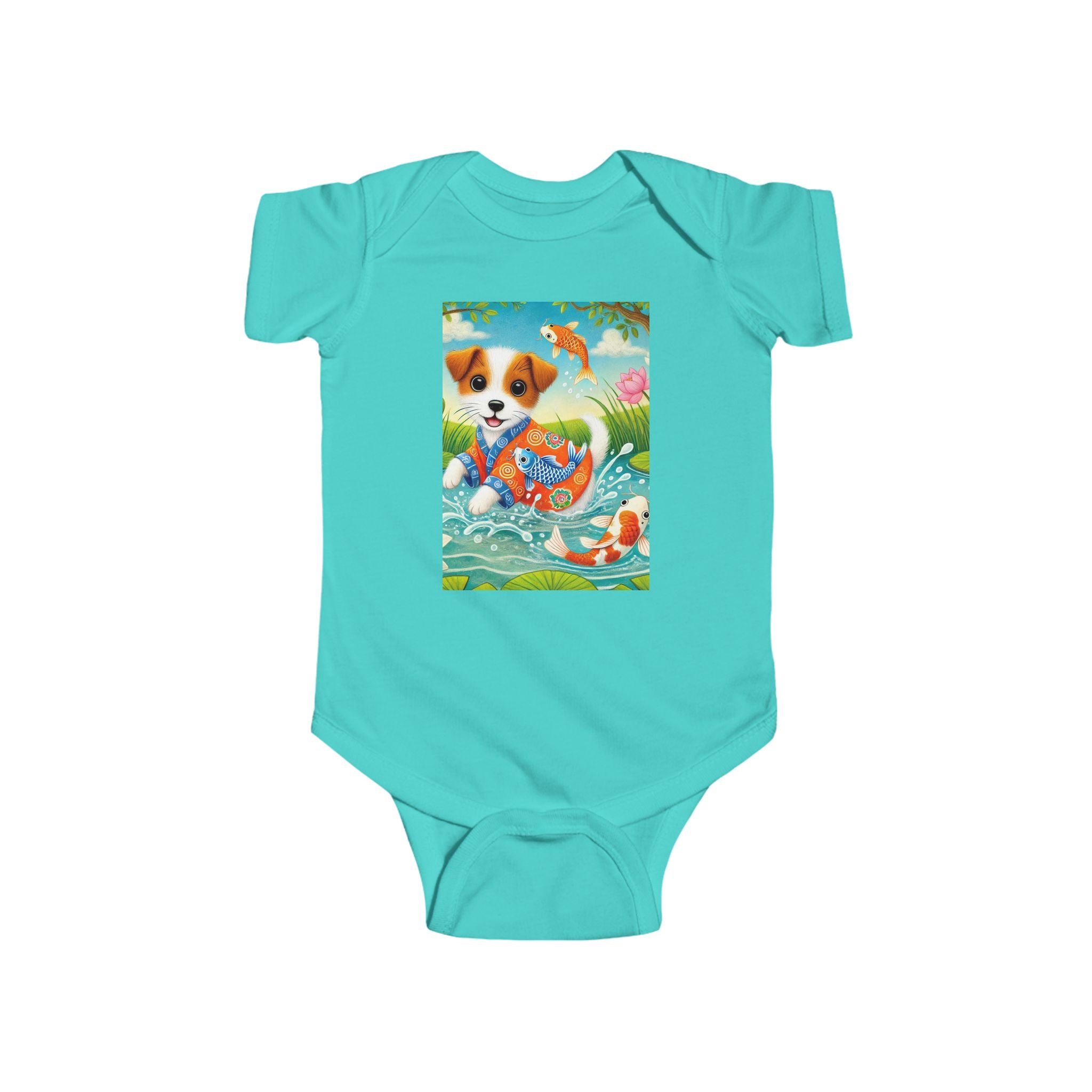 Koi Pond Puppy captures a heartwarming blend of innocence and culture in a scene full of joy and serenity. A cheerful puppy splashes happily in a tranquil koi pond, wearing a bright orange and blue kimono adorned with traditional Japanese motifs. Around the playful pup, colorful koi fish glide gracefully through rippling water, their scales glimmering in the soft sunlight. Pink lotus blossoms bloom beside green lily pads, while delicate branches stretch above against a calm turquoise sky. Rendered in flat, storybook-style colors with fine, whimsical details, this charming artwork celebrates curiosity, play, and the tranquil beauty of nature.