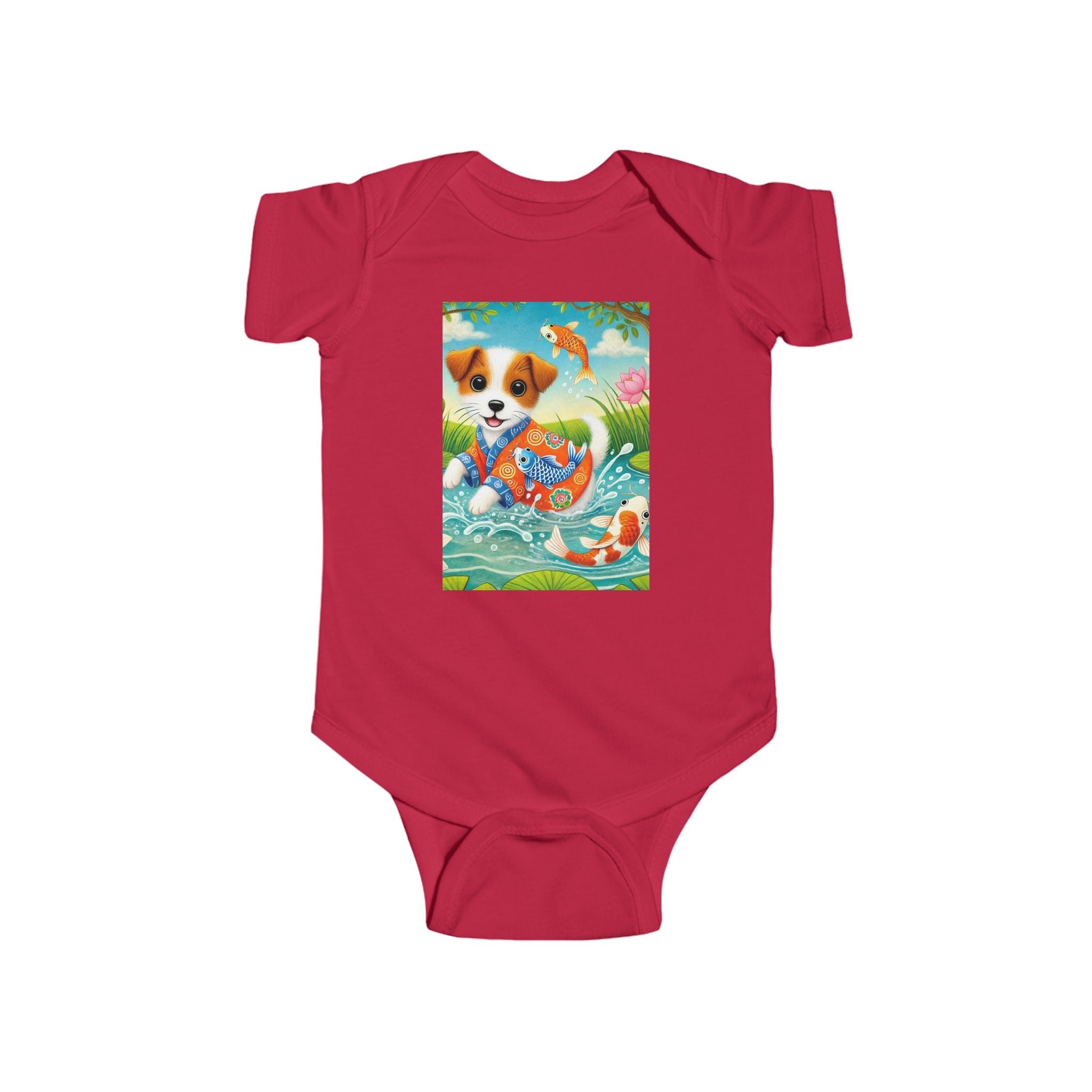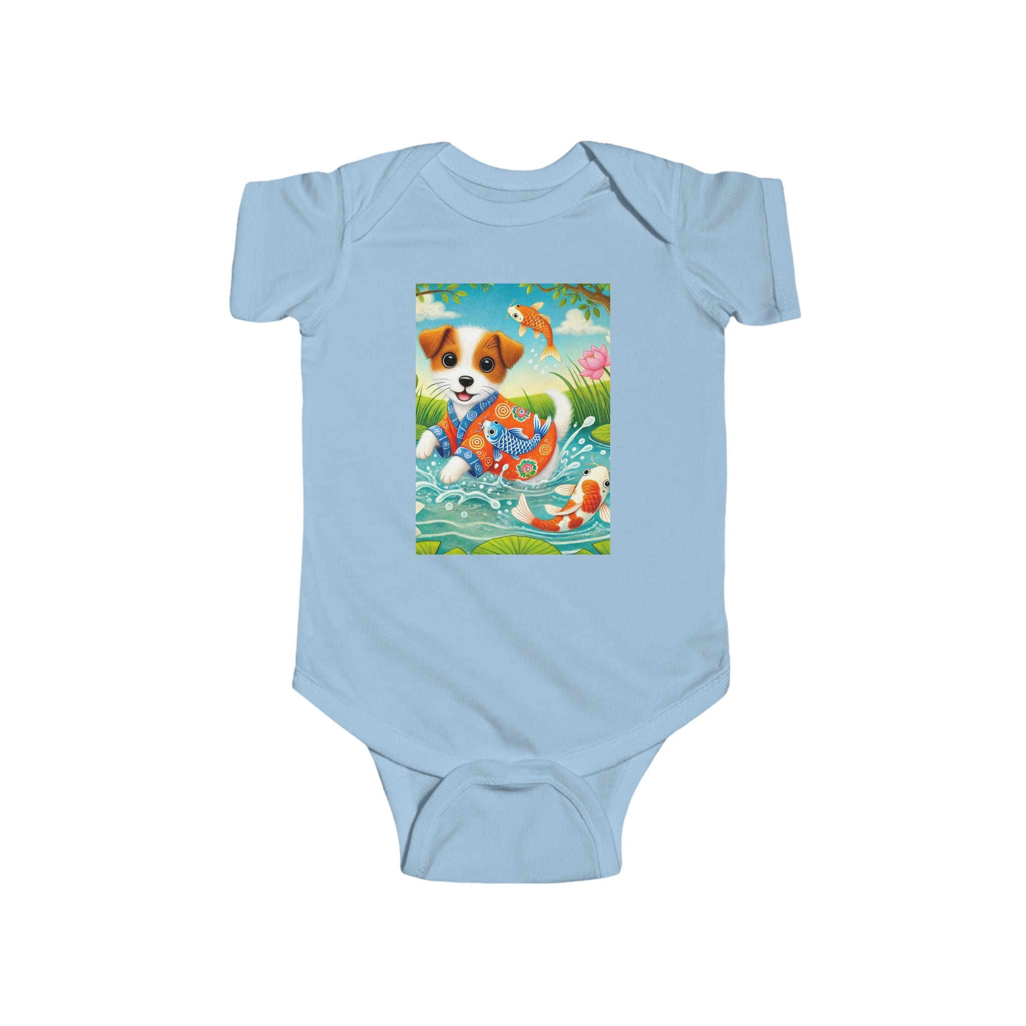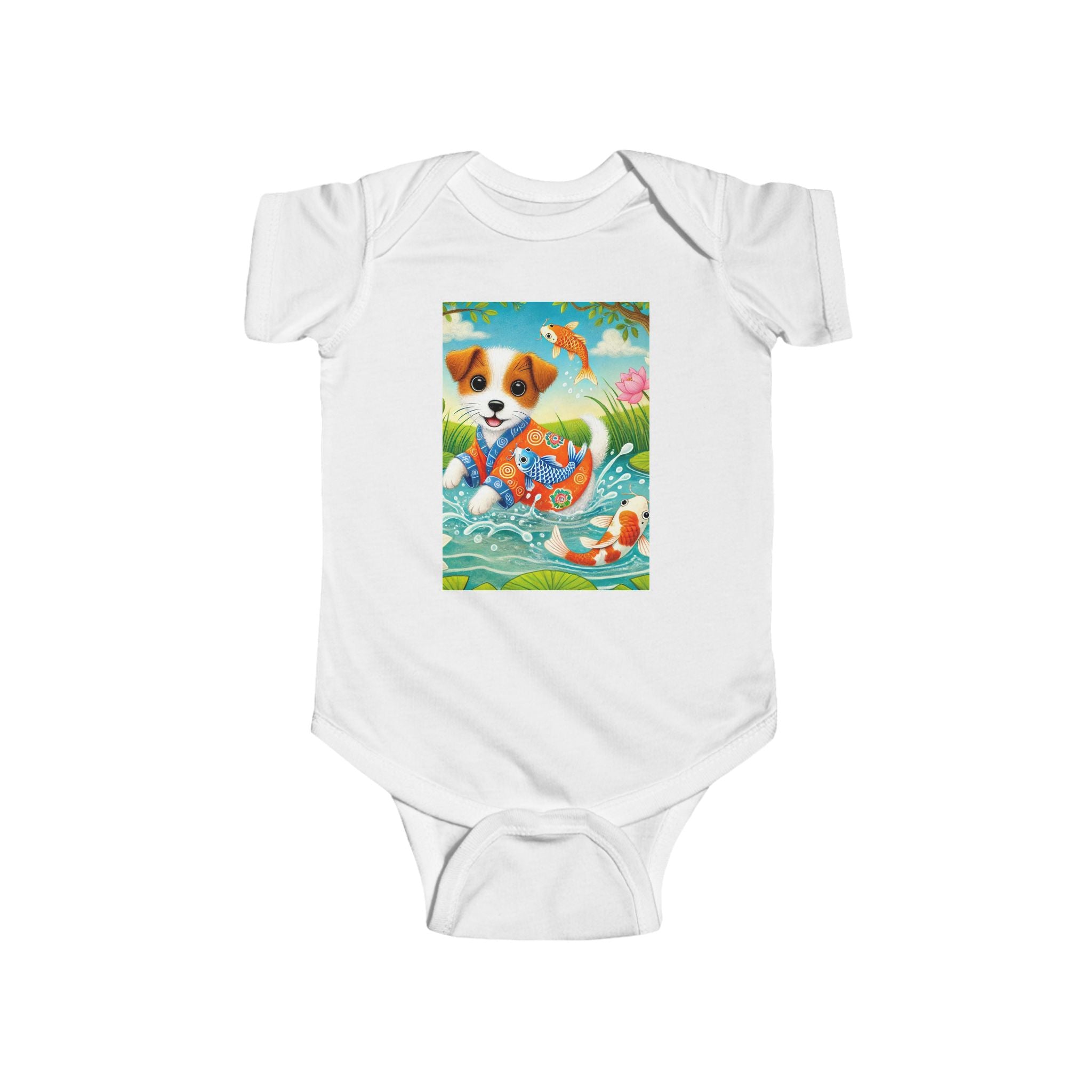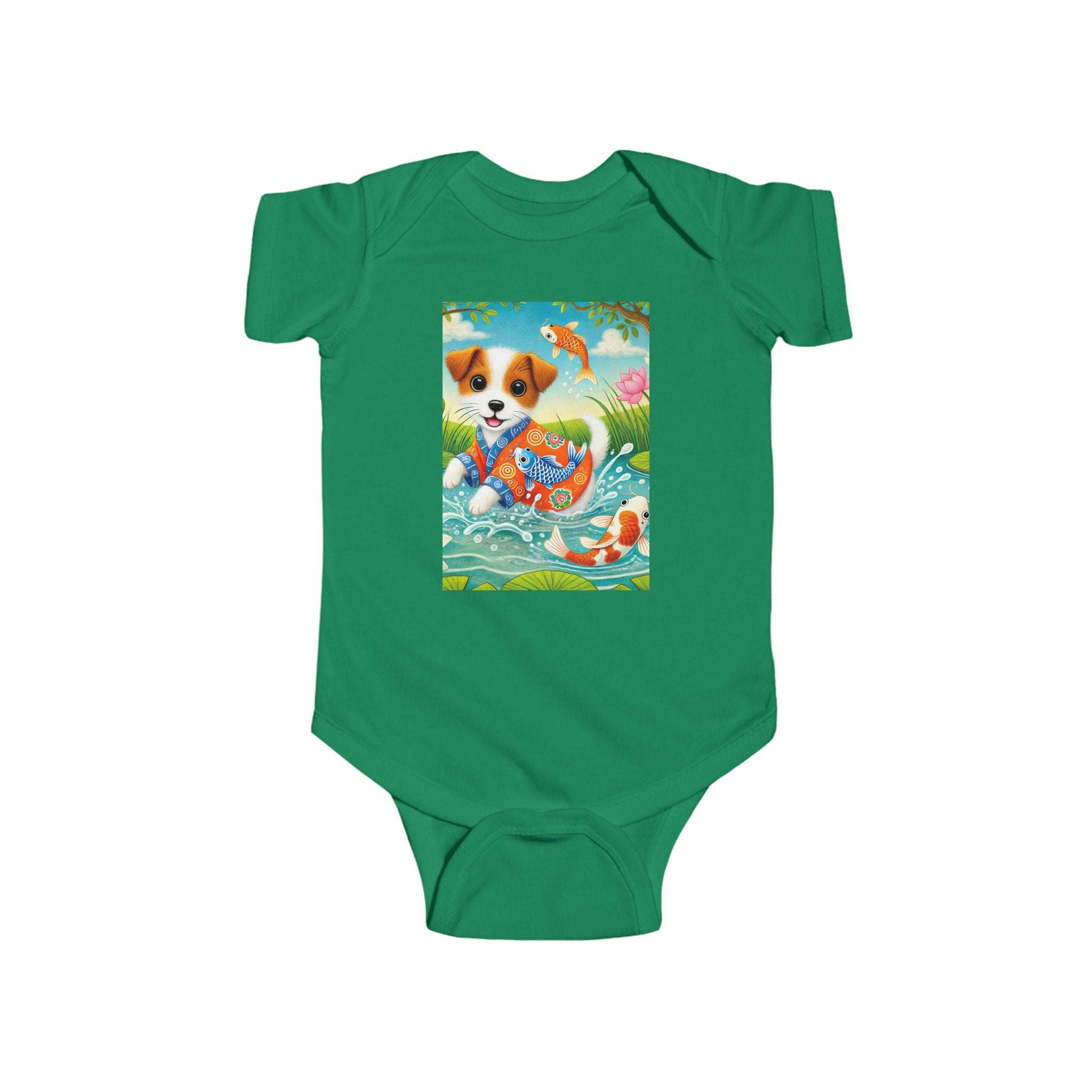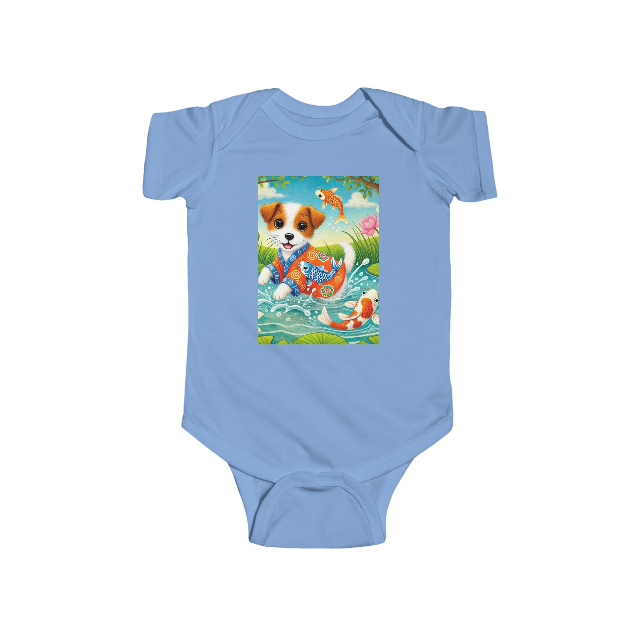 Koi Pond Puppy captures a heartwarming blend of innocence and culture in a scene full of joy and serenity. A cheerful puppy splashes happily in a tranquil koi pond, wearing a bright orange and blue kimono adorned with traditional Japanese motifs. Around the playful pup, colorful koi fish glide gracefully through rippling water, their scales glimmering in the soft sunlight. Pink lotus blossoms bloom beside green lily pads, while delicate branches stretch above against a calm turquoise sky. Rendered in flat, storybook-style colors with fine, whimsical details, this charming artwork celebrates curiosity, play, and the tranquil beauty of nature.