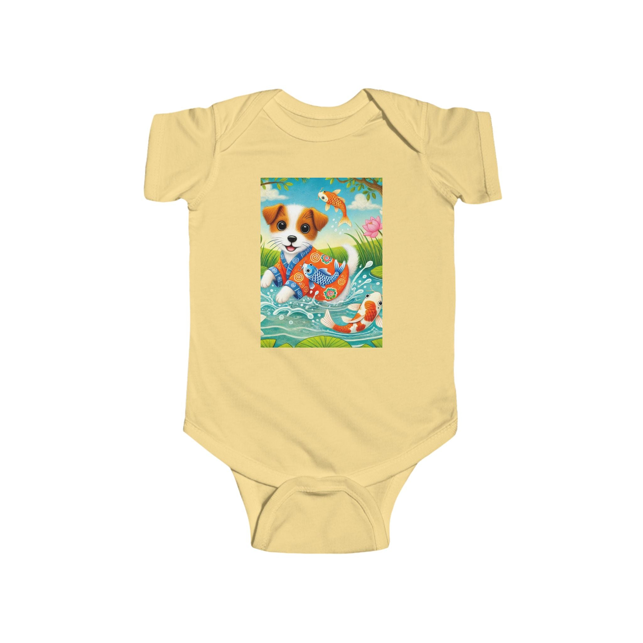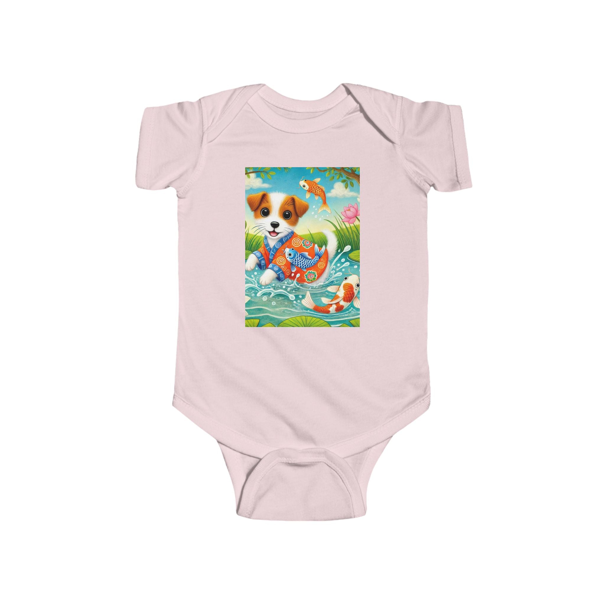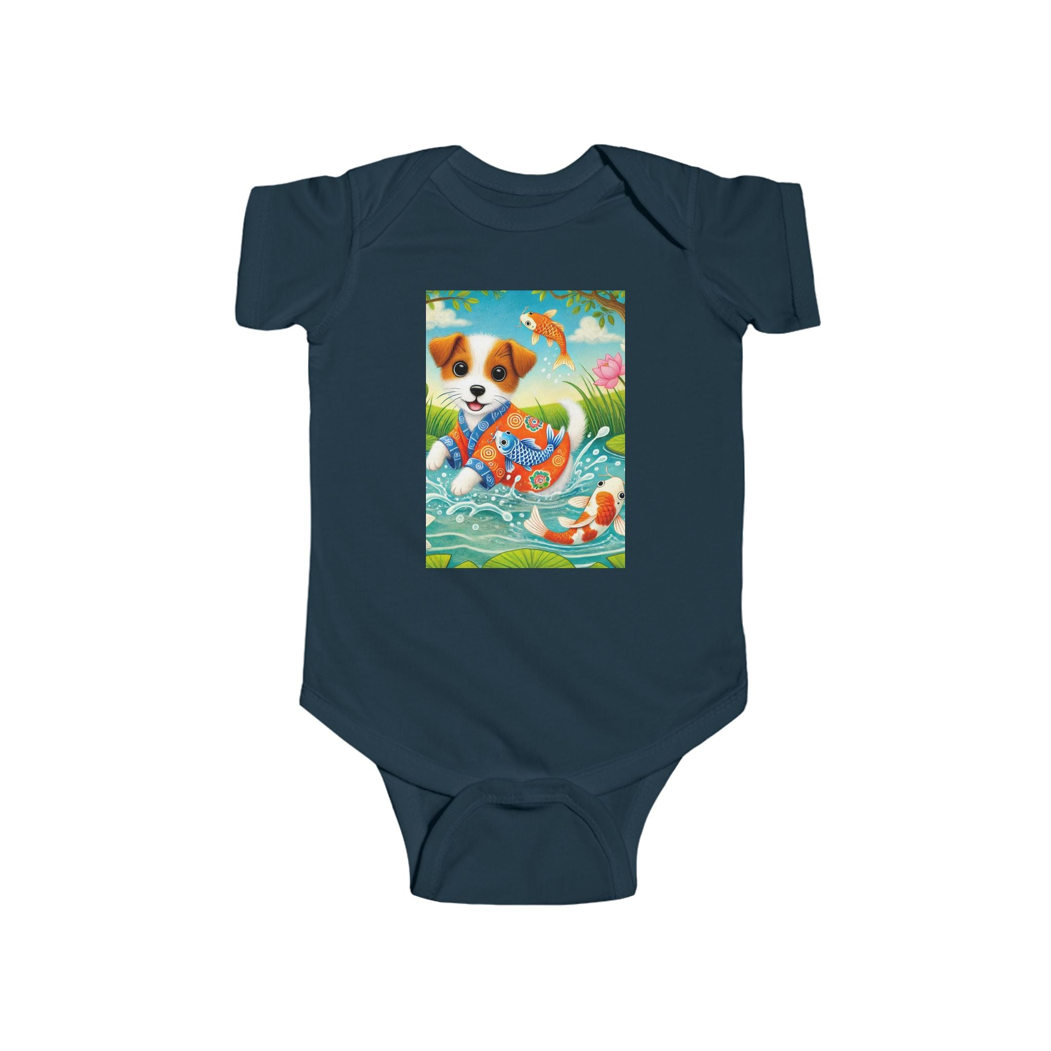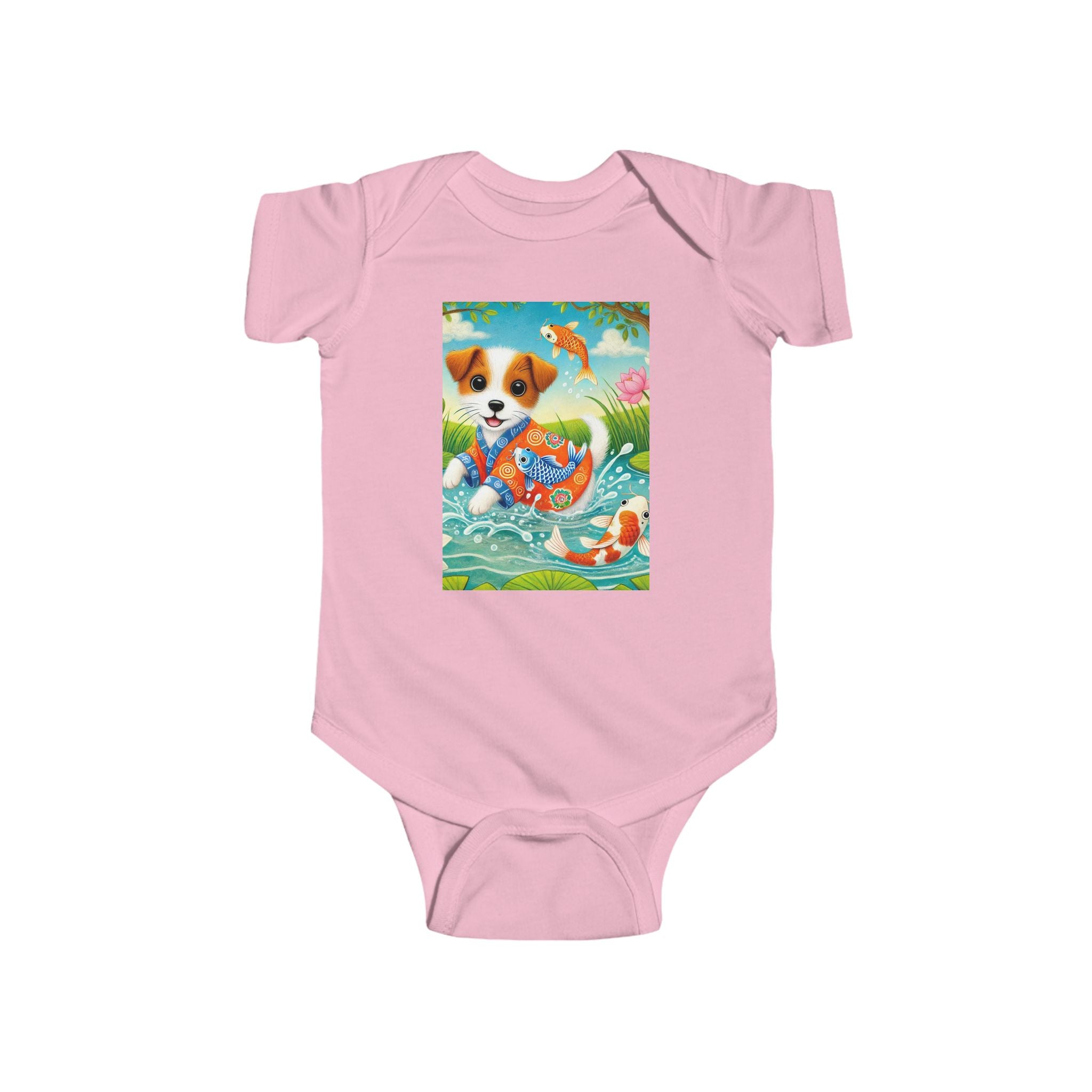 Koi Pond Puppy captures a heartwarming blend of innocence and culture in a scene full of joy and serenity. A cheerful puppy splashes happily in a tranquil koi pond, wearing a bright orange and blue kimono adorned with traditional Japanese motifs. Around the playful pup, colorful koi fish glide gracefully through rippling water, their scales glimmering in the soft sunlight. Pink lotus blossoms bloom beside green lily pads, while delicate branches stretch above against a calm turquoise sky. Rendered in flat, storybook-style colors with fine, whimsical details, this charming artwork celebrates curiosity, play, and the tranquil beauty of nature.