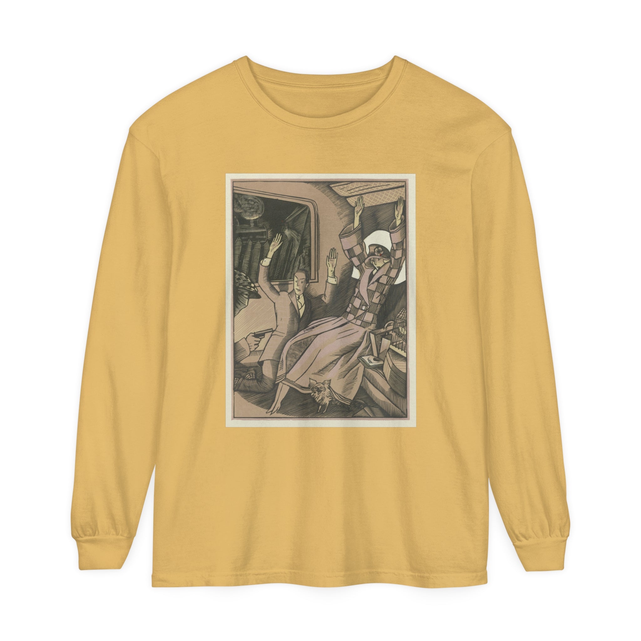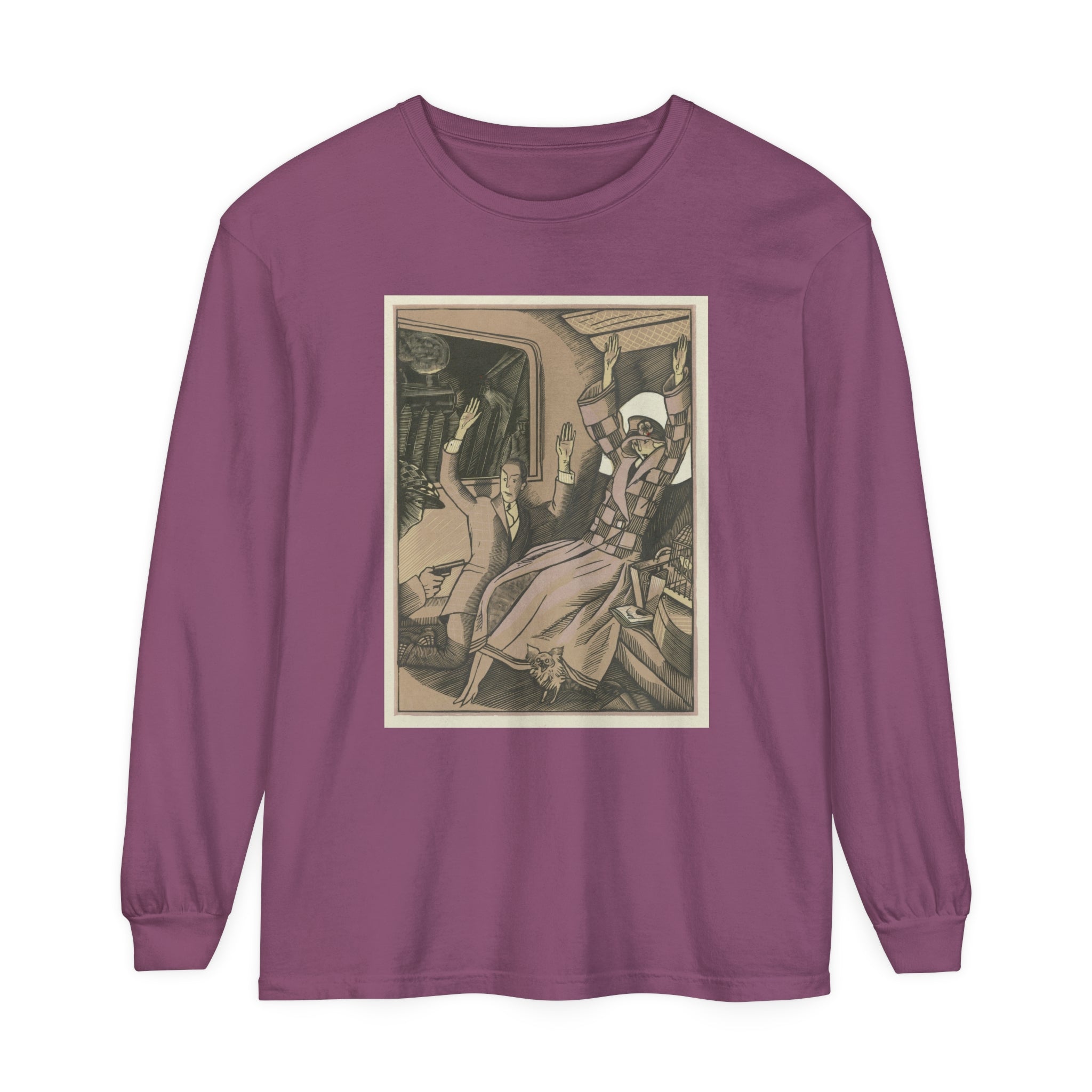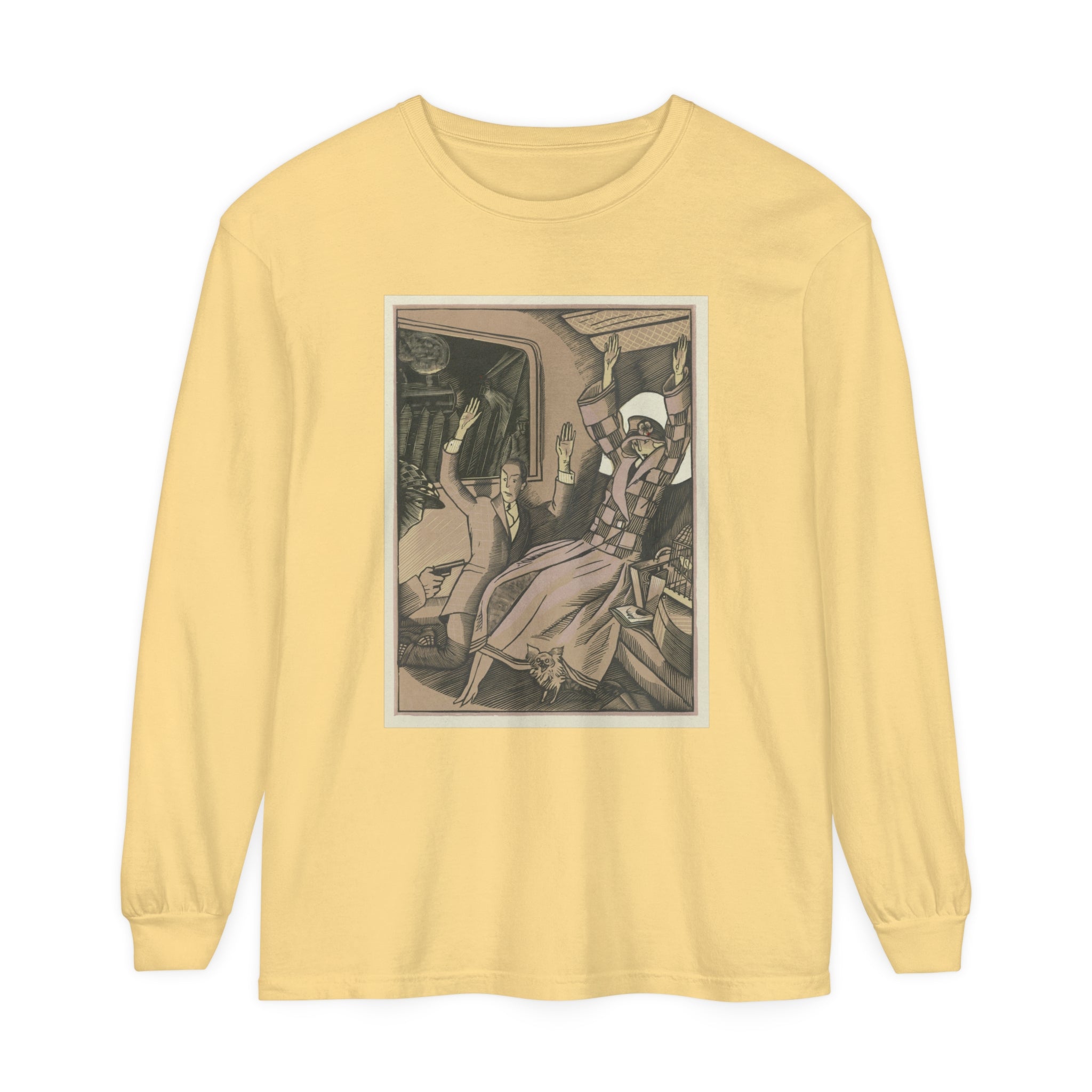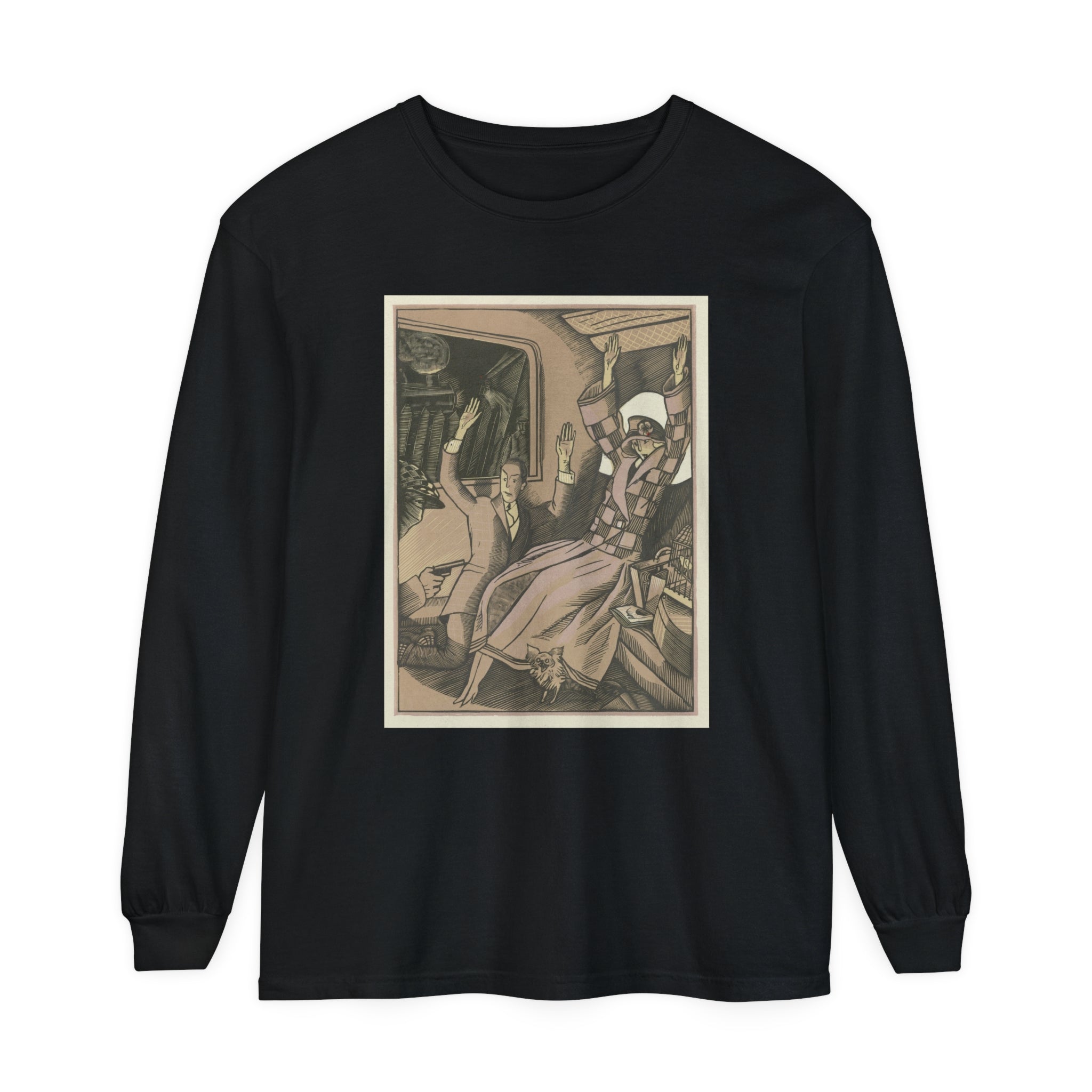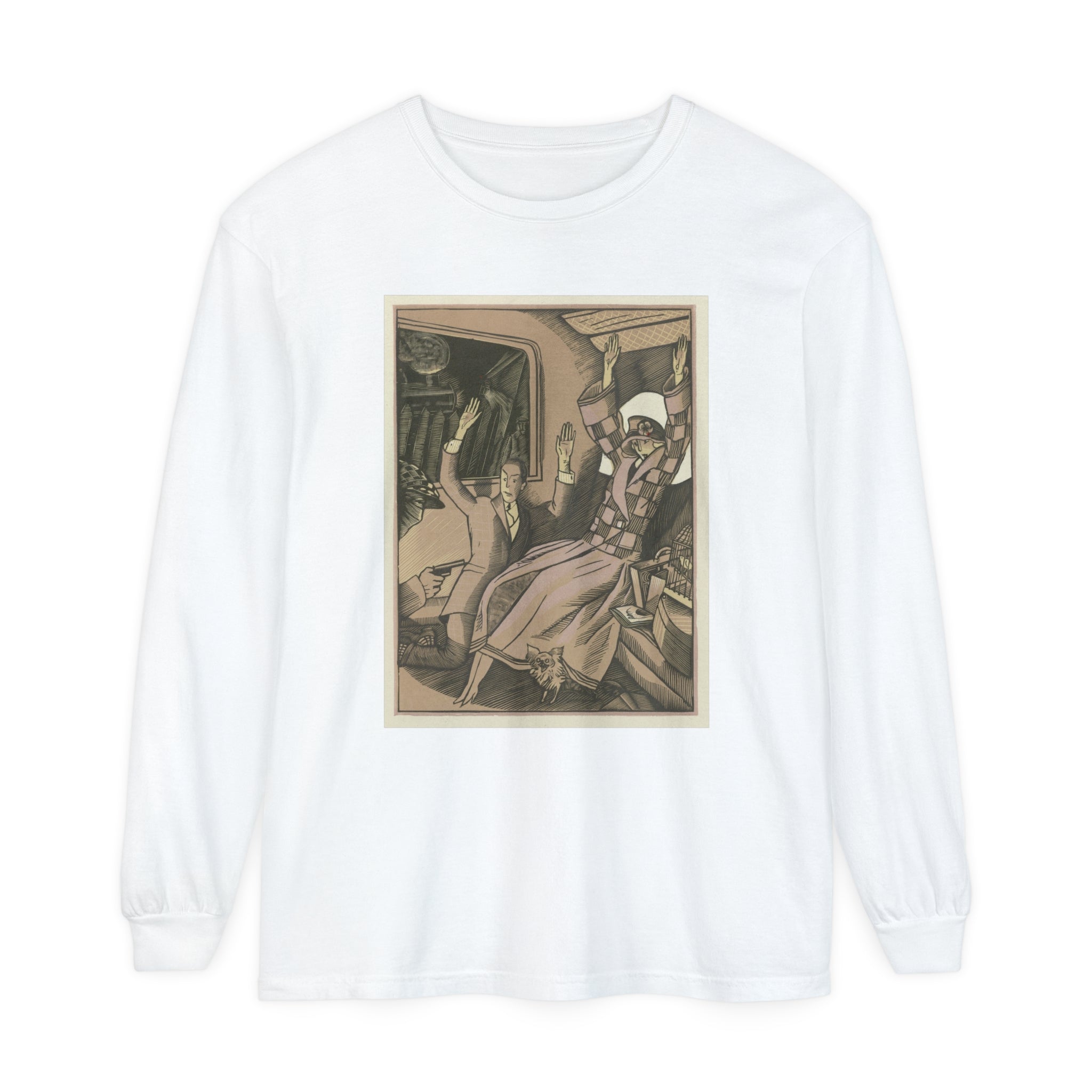 Artwork designed and digitally remastered by Sarasvati Designs. L’Attentat" by Fernand Siméon is a dramatic painting from 1923 that captures a moment of intense action and suspense. The scene is set in the back of a vehicle, possibly a train, where a vintage couple dressed in fashionable attire is being held up by a masked man with a gun. The couple, clearly startled, has their arms thrown up in the air in a gesture of shock and surrender. Their elegant clothing and the overall composition suggest a scene from a bygone era, adding a touch of historical intrigue to the painting.