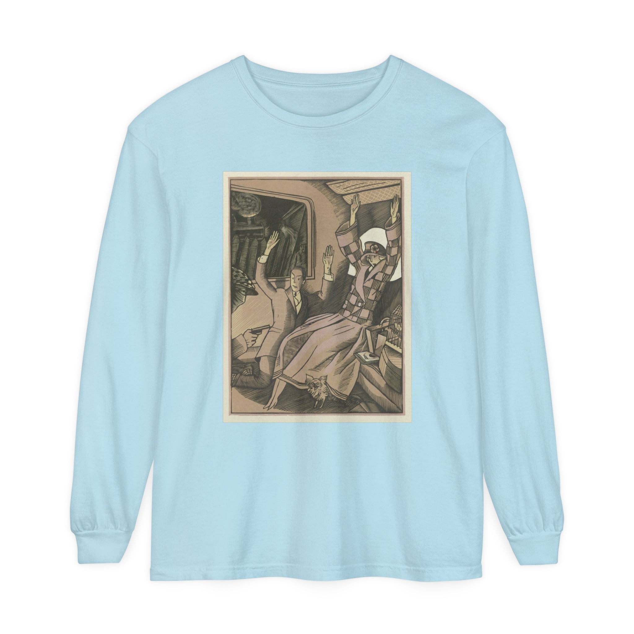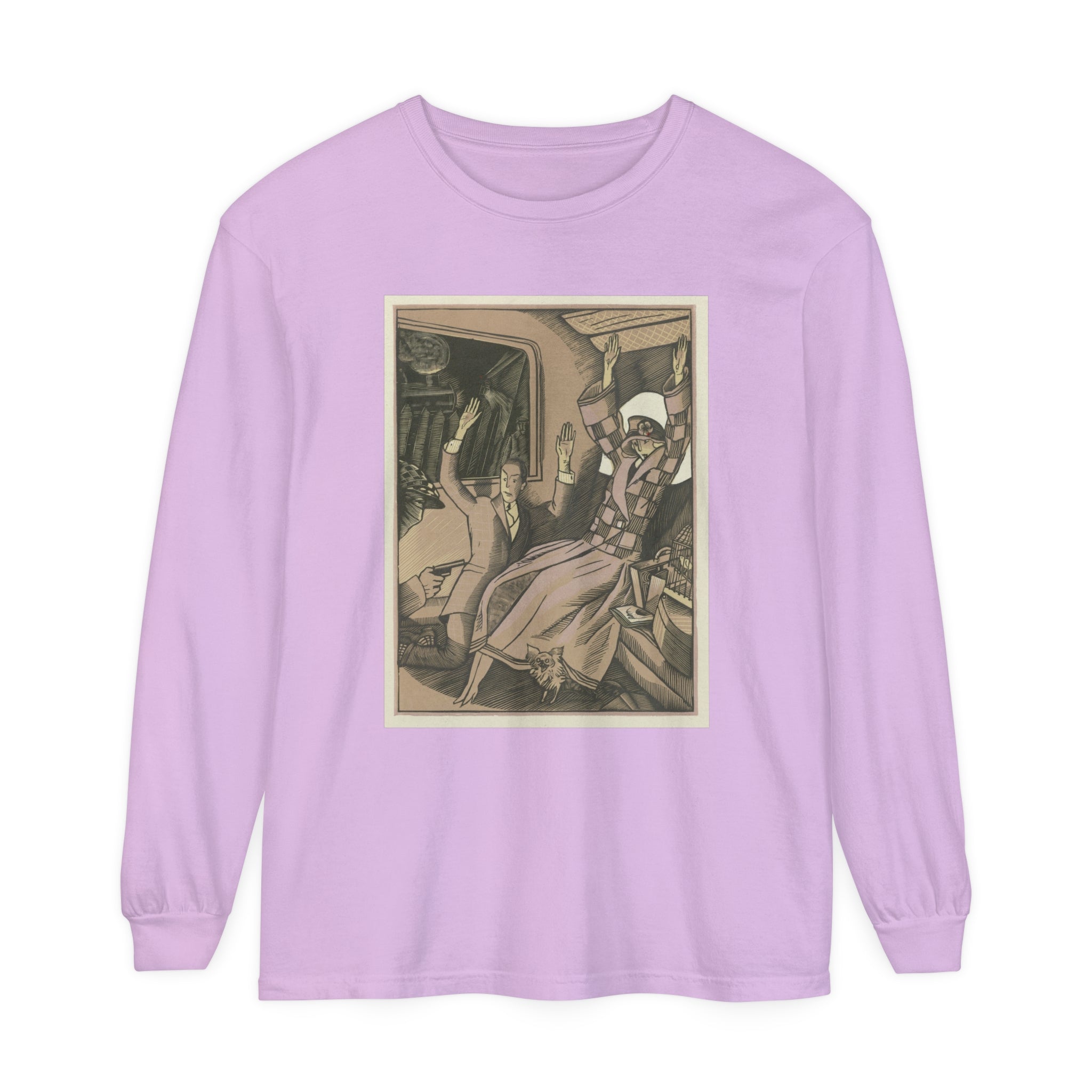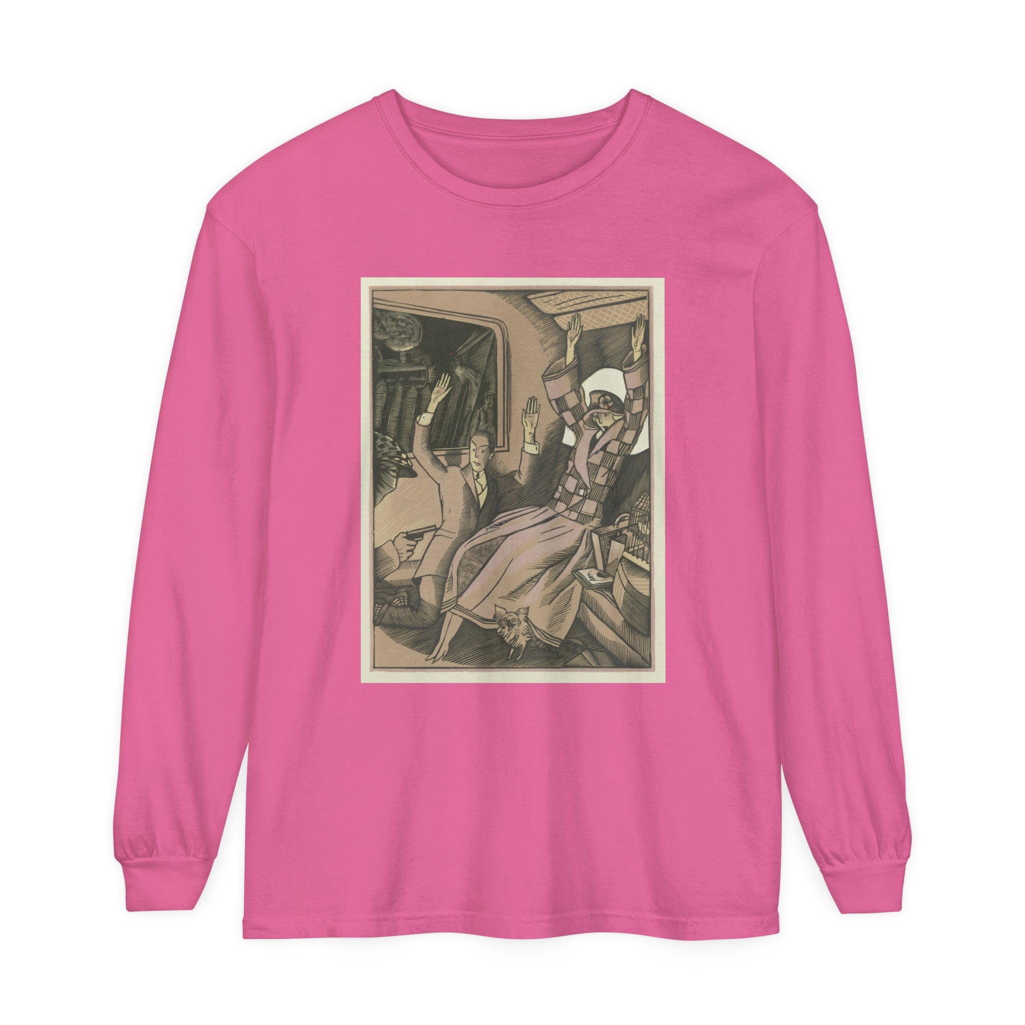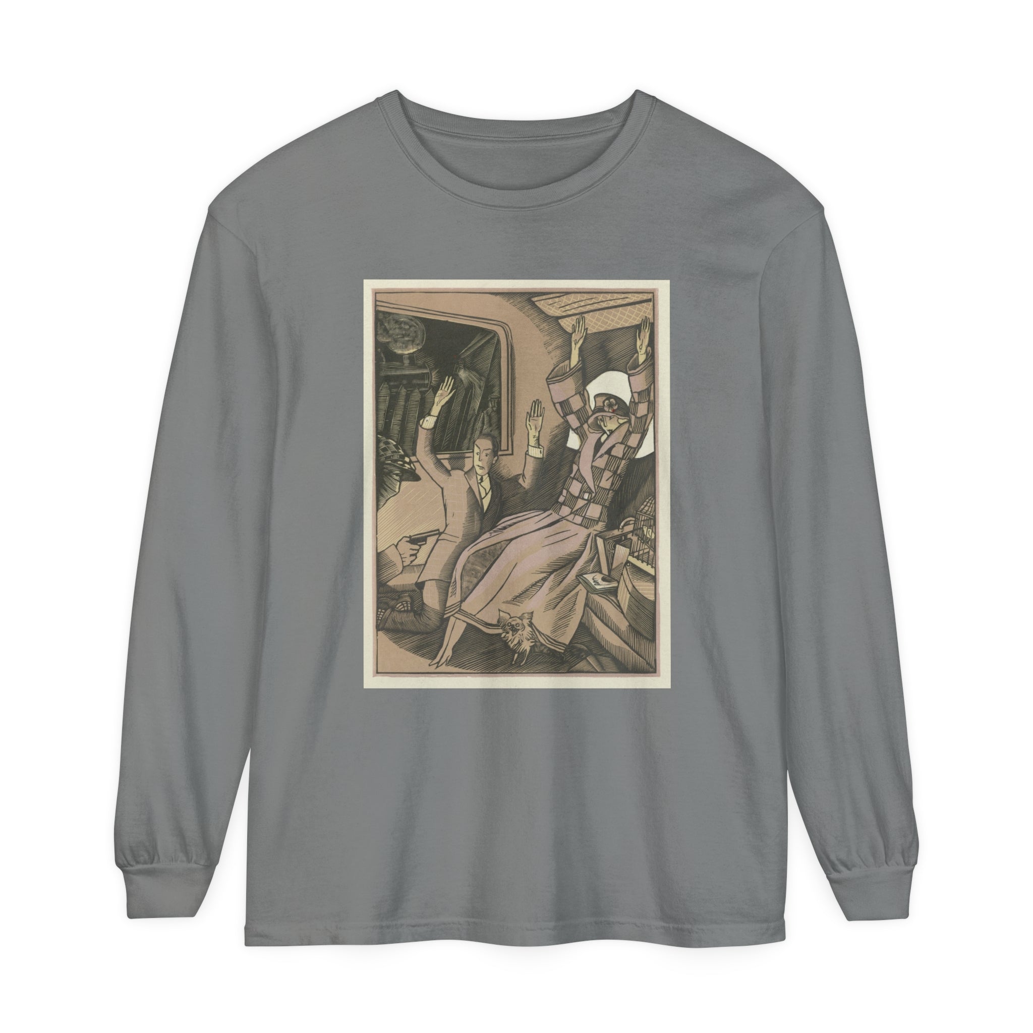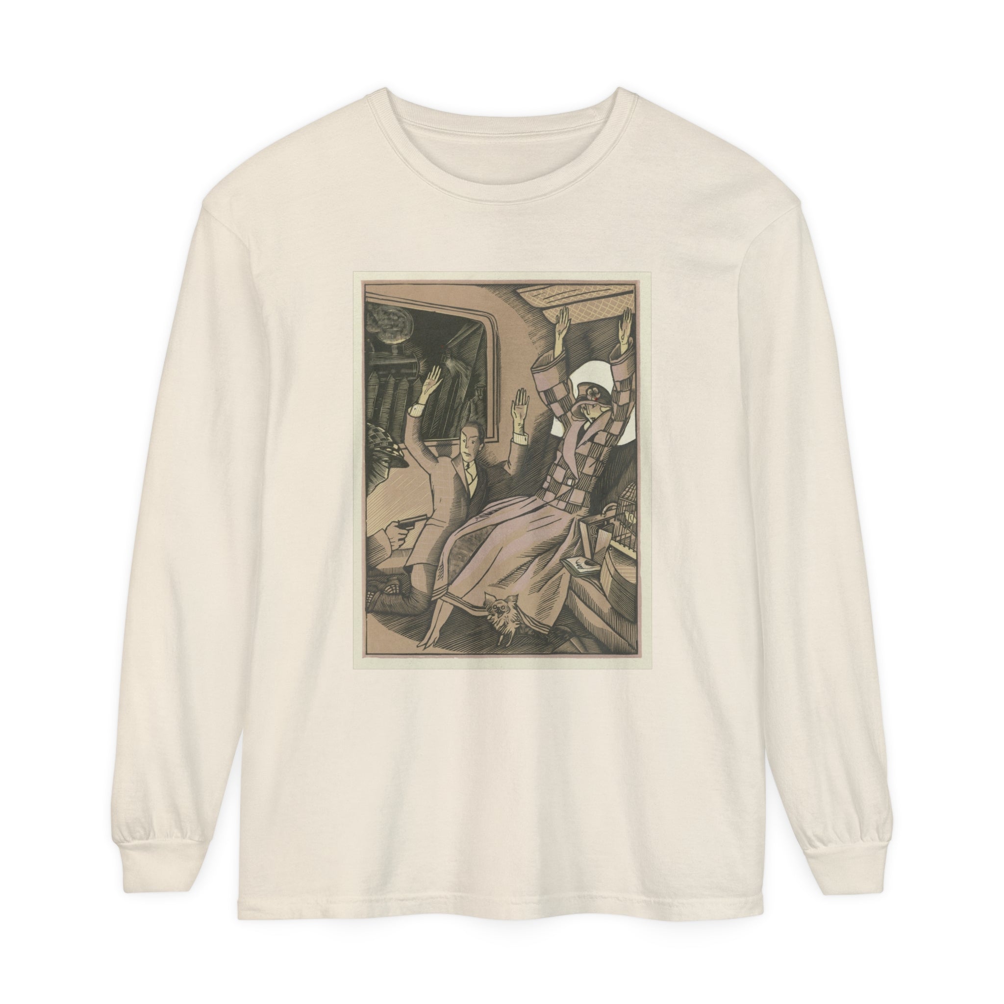 Artwork designed and digitally remastered by Sarasvati Designs. L’Attentat" by Fernand Siméon is a dramatic painting from 1923 that captures a moment of intense action and suspense. The scene is set in the back of a vehicle, possibly a train, where a vintage couple dressed in fashionable attire is being held up by a masked man with a gun. The couple, clearly startled, has their arms thrown up in the air in a gesture of shock and surrender. Their elegant clothing and the overall composition suggest a scene from a bygone era, adding a touch of historical intrigue to the painting.