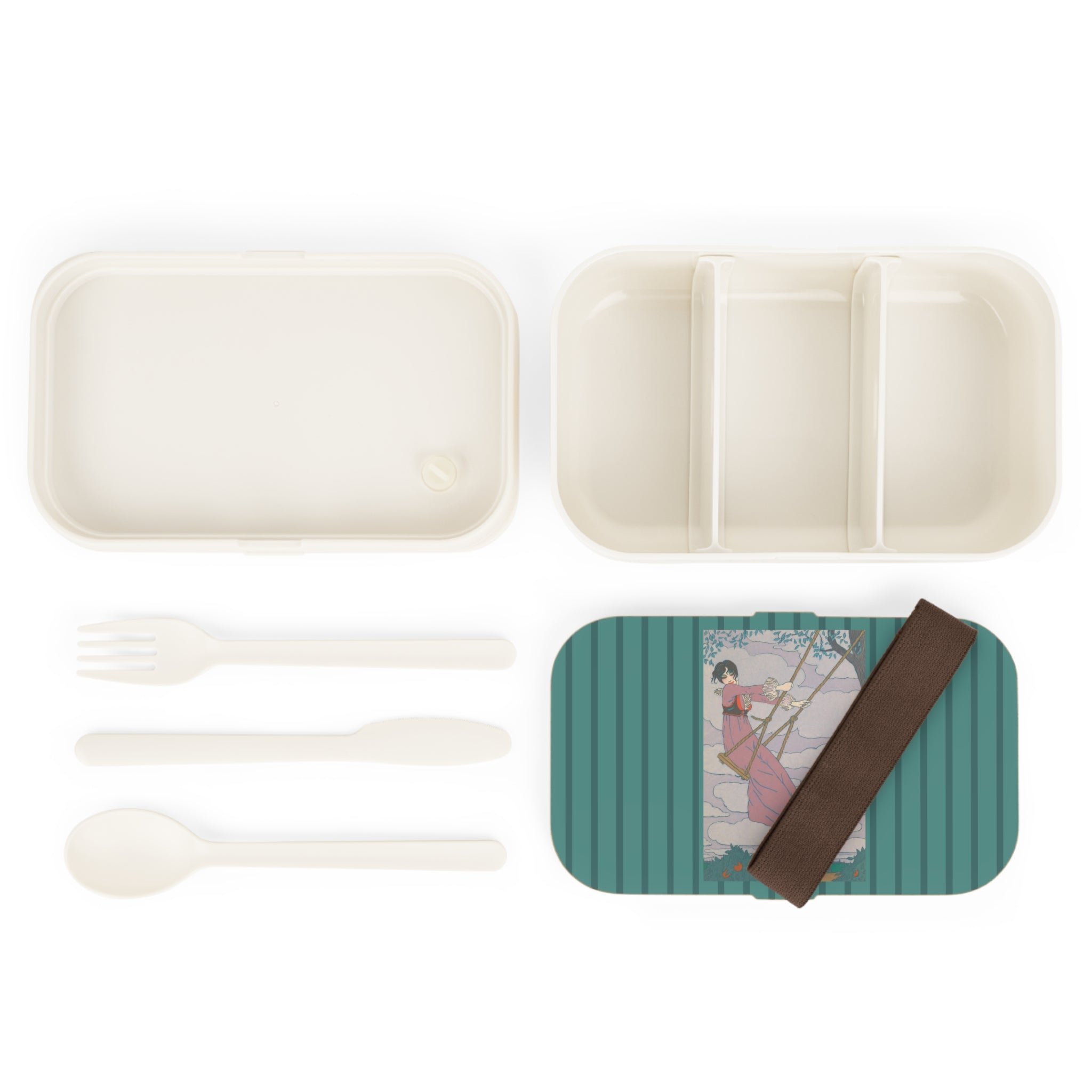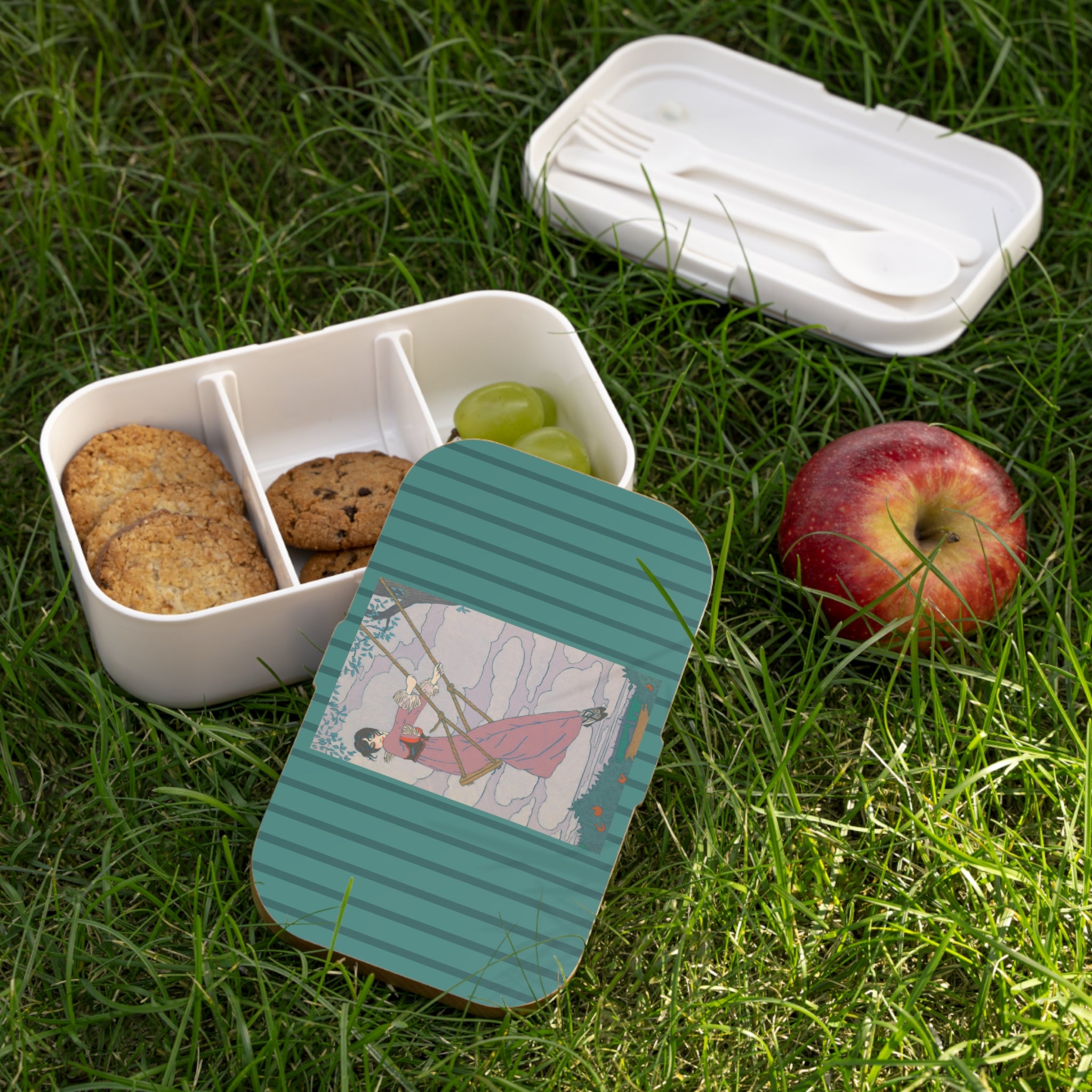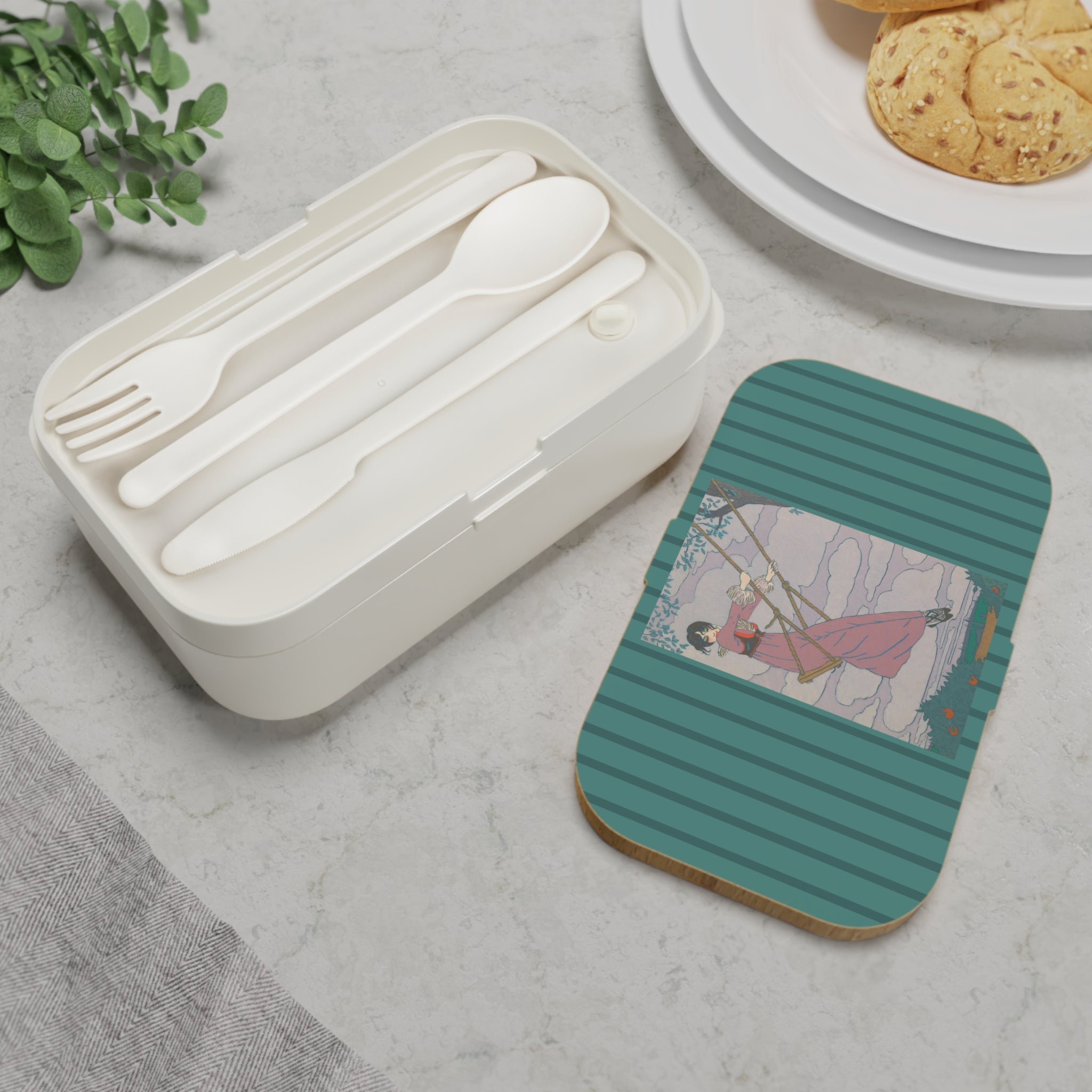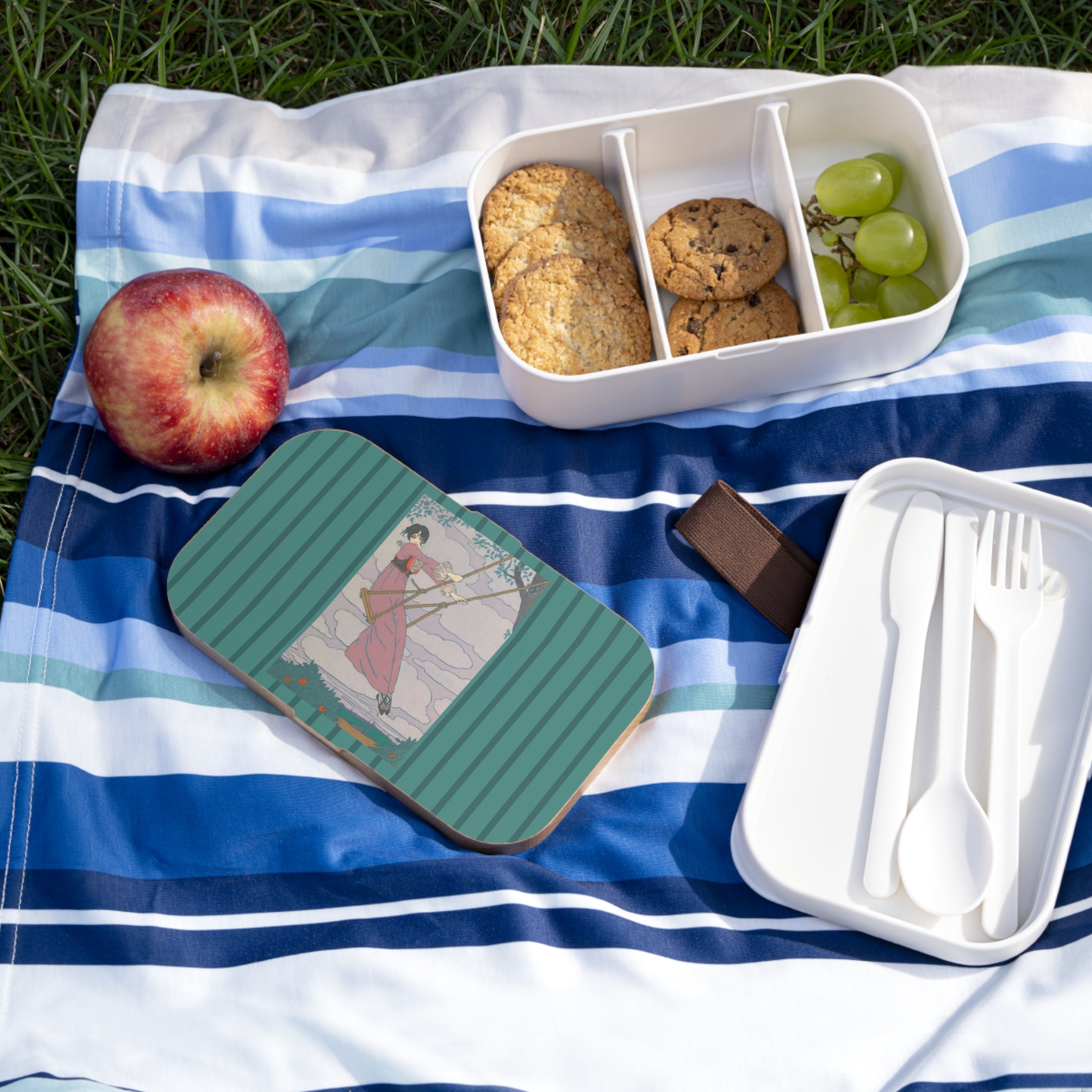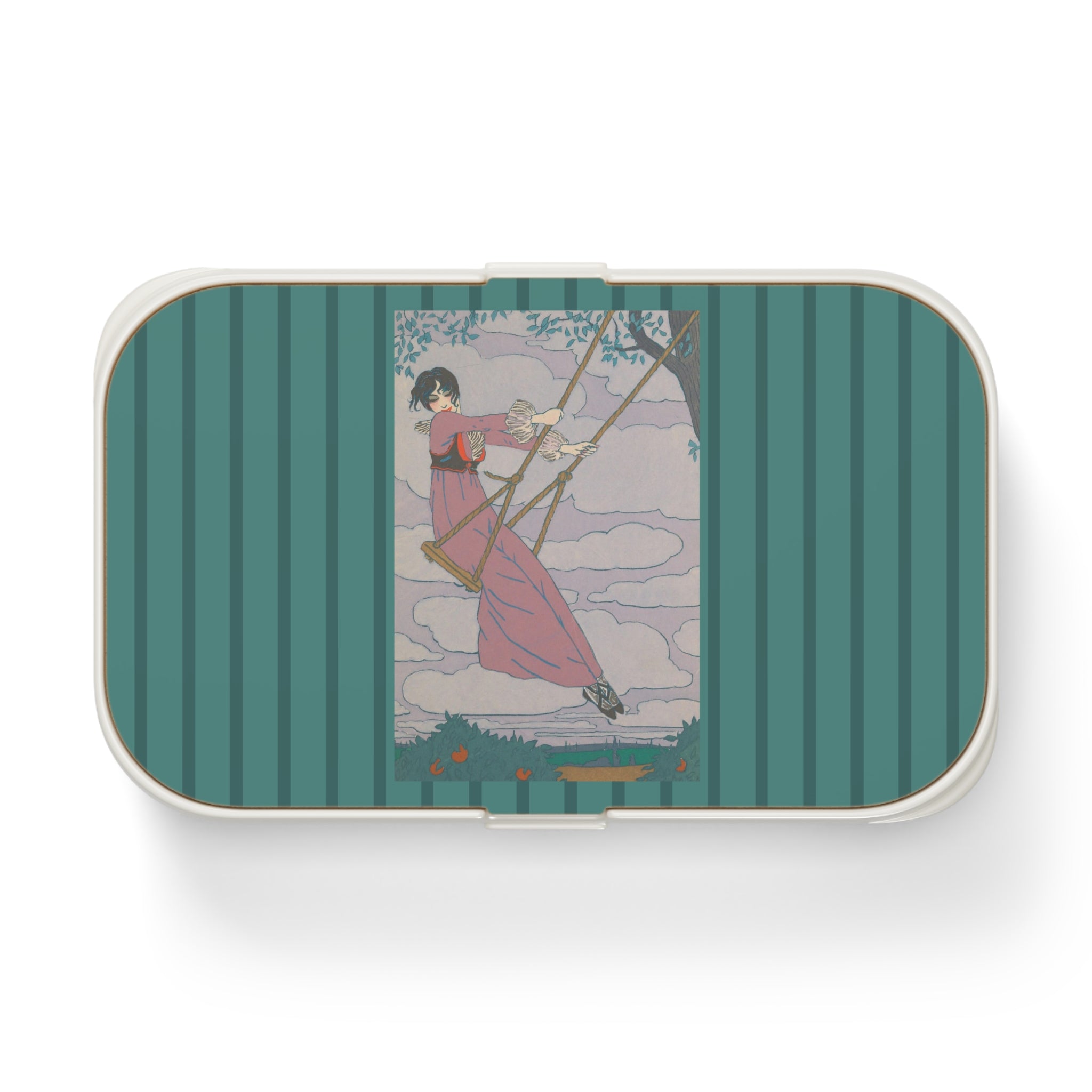 Add a touch of whimsical artistry to your everyday meals with our La Balançoire Bento Lunch Box, inspired by Georges Lepape’s enchanting illustration “La balançoire” (The Swing). This refined design combines modern functionality with the romantic charm of early 20th-century French art, transforming a simple lunch into an elegant experience. Lepape’s scene—depicting a graceful woman mid-swing in a flowing, exotic dress—infuses the piece with joyful movement and vibrant color, perfectly capturing the carefree sophistication of his Art Nouveau and oriental influences.