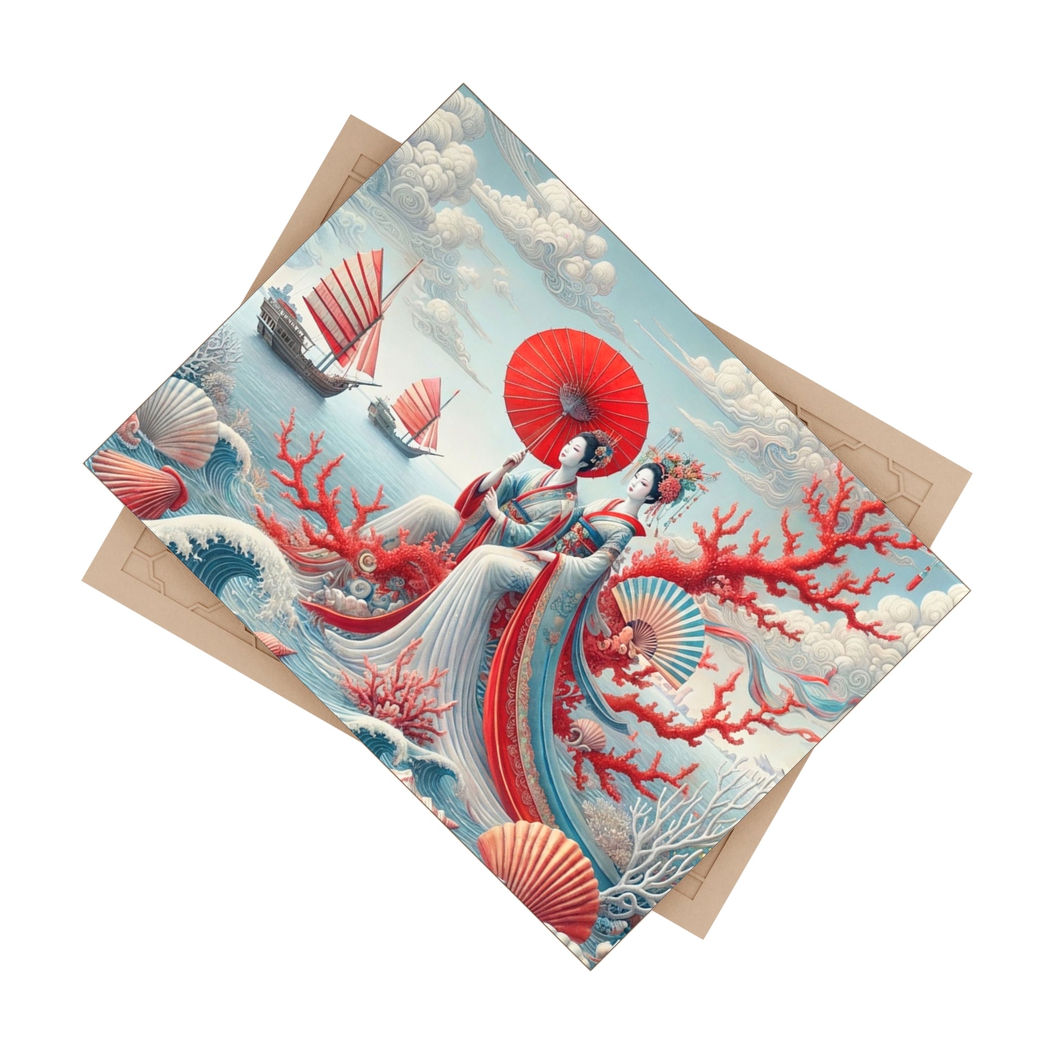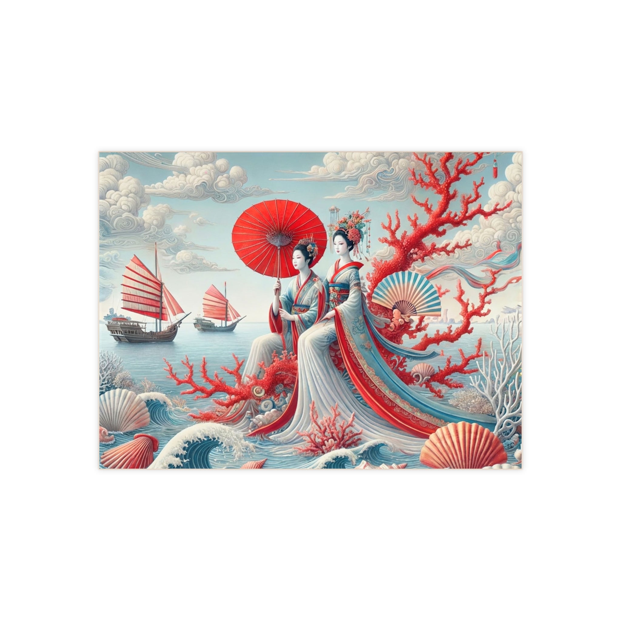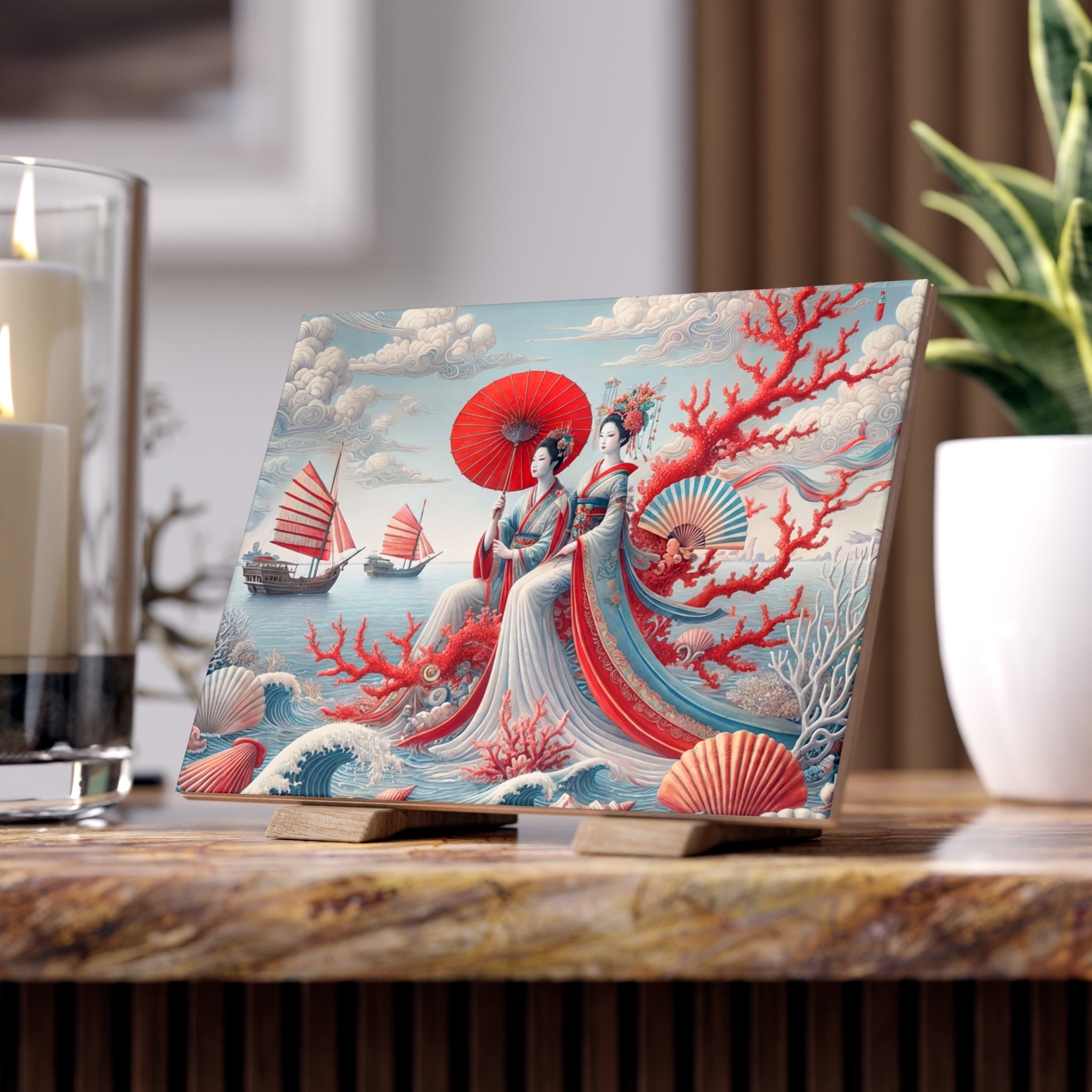 The tile features a serene coastal scene in which two elegantly dressed figures rest beside a tranquil sea. Soft drifting clouds, coral branches, and distant red-sailed boats frame the composition, while flowing robes and delicate fans echo the gentle rhythm of the water. A harmonious palette of soft blues, ivory, and muted reds creates a calm, timeless mood, blending classical East Asian influence with a dreamlike maritime setting. The result is a quietly expressive art piece that feels both elegant and contemplative.