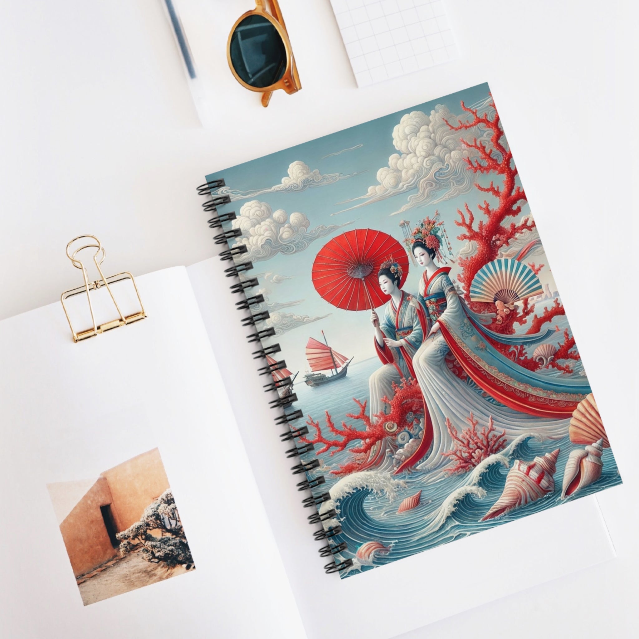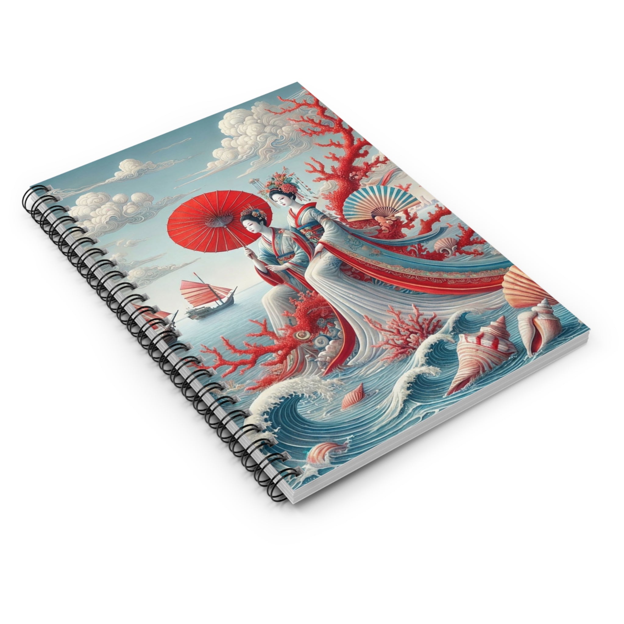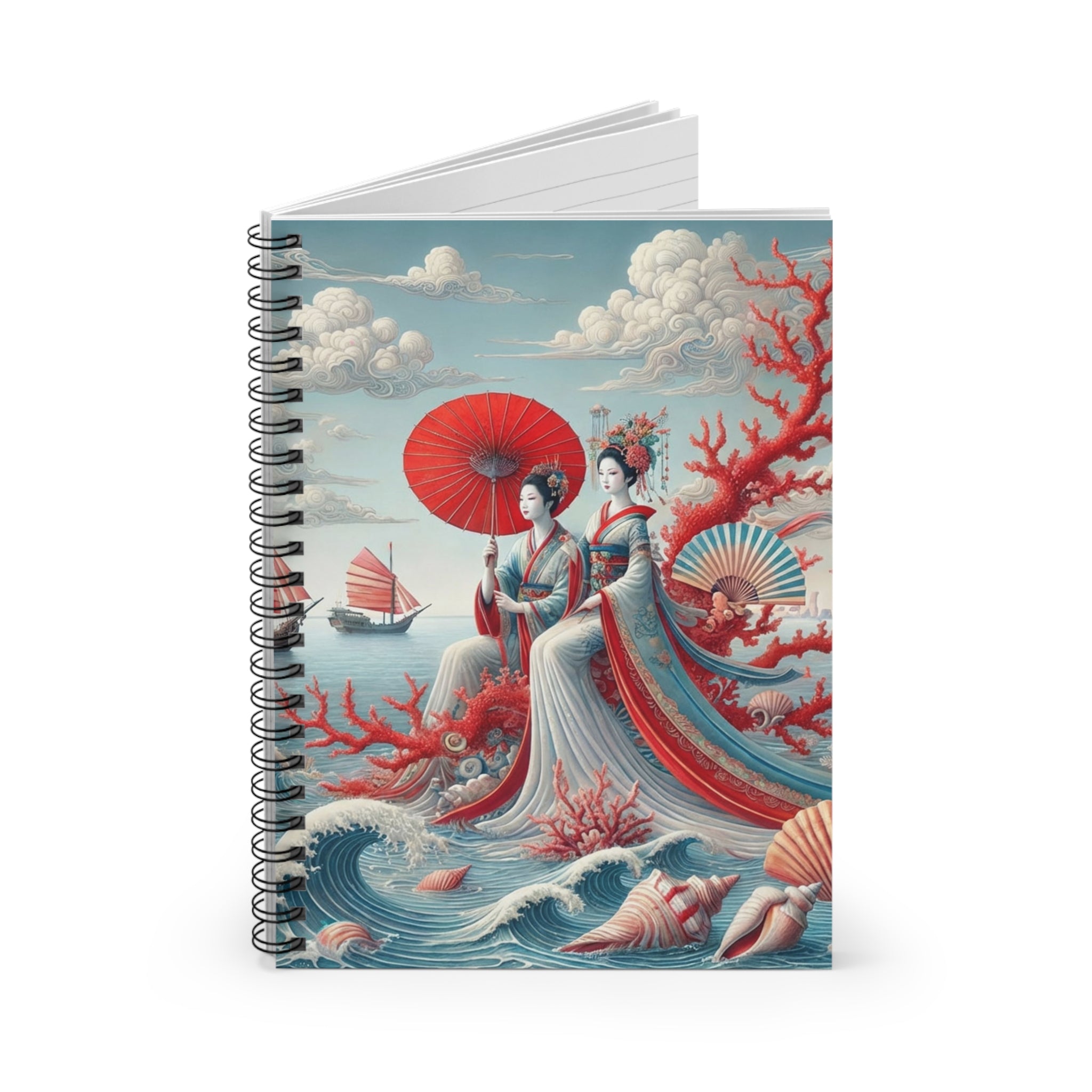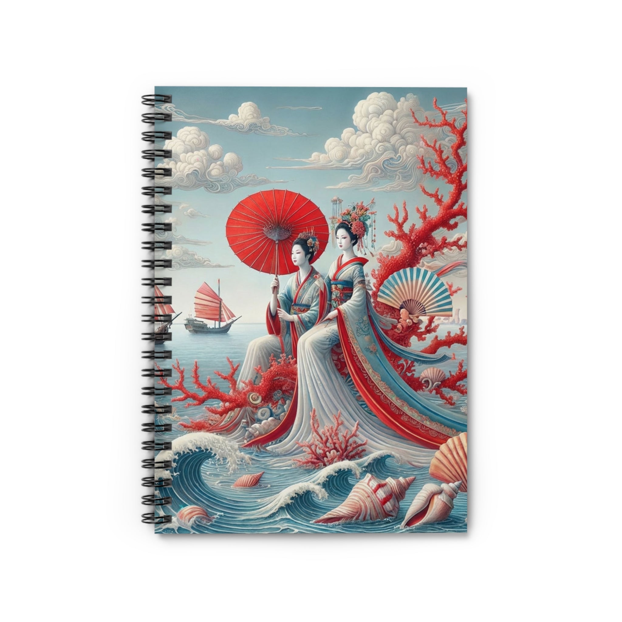 The cover artwork unfolds into a serene coastal scene where two elegantly dressed figures rest beside a tranquil sea, framed by soft drifting clouds, coral branches, and distant red-sailed boats. Flowing robes and delicate fans echo the gentle rhythm of the water, while a harmonious palette of soft blues, ivory, and muted reds evokes a timeless sense of balance and quiet reflection. Classical East Asian influence blends seamlessly with a dreamlike maritime setting, creating a notebook that feels both peaceful and visually engaging.
