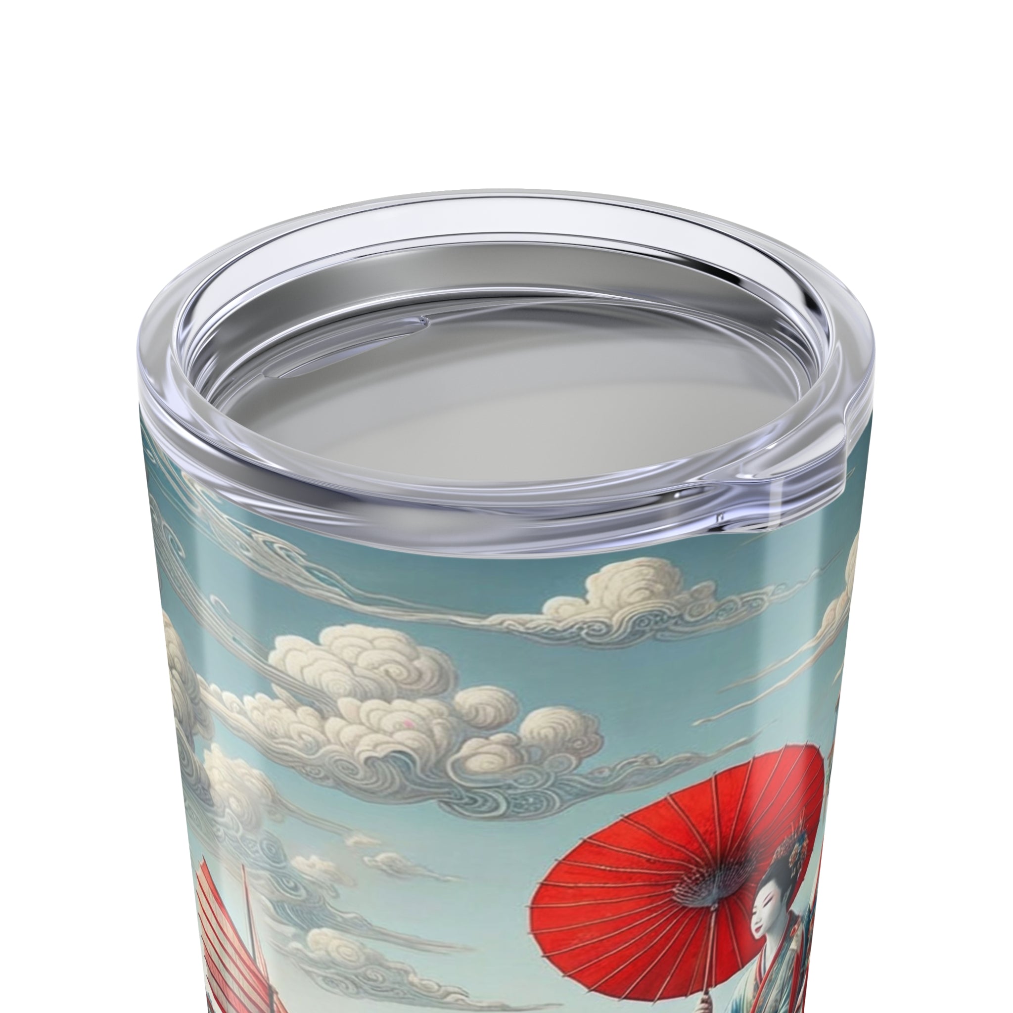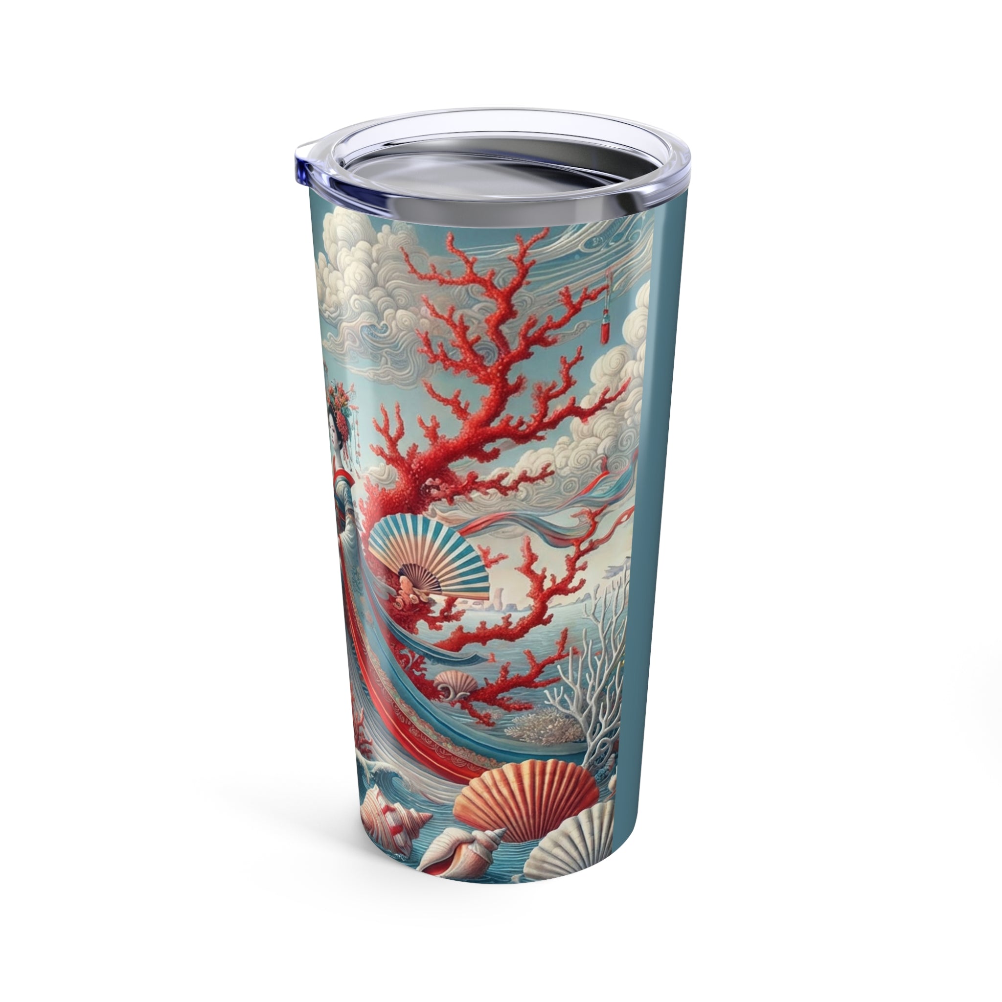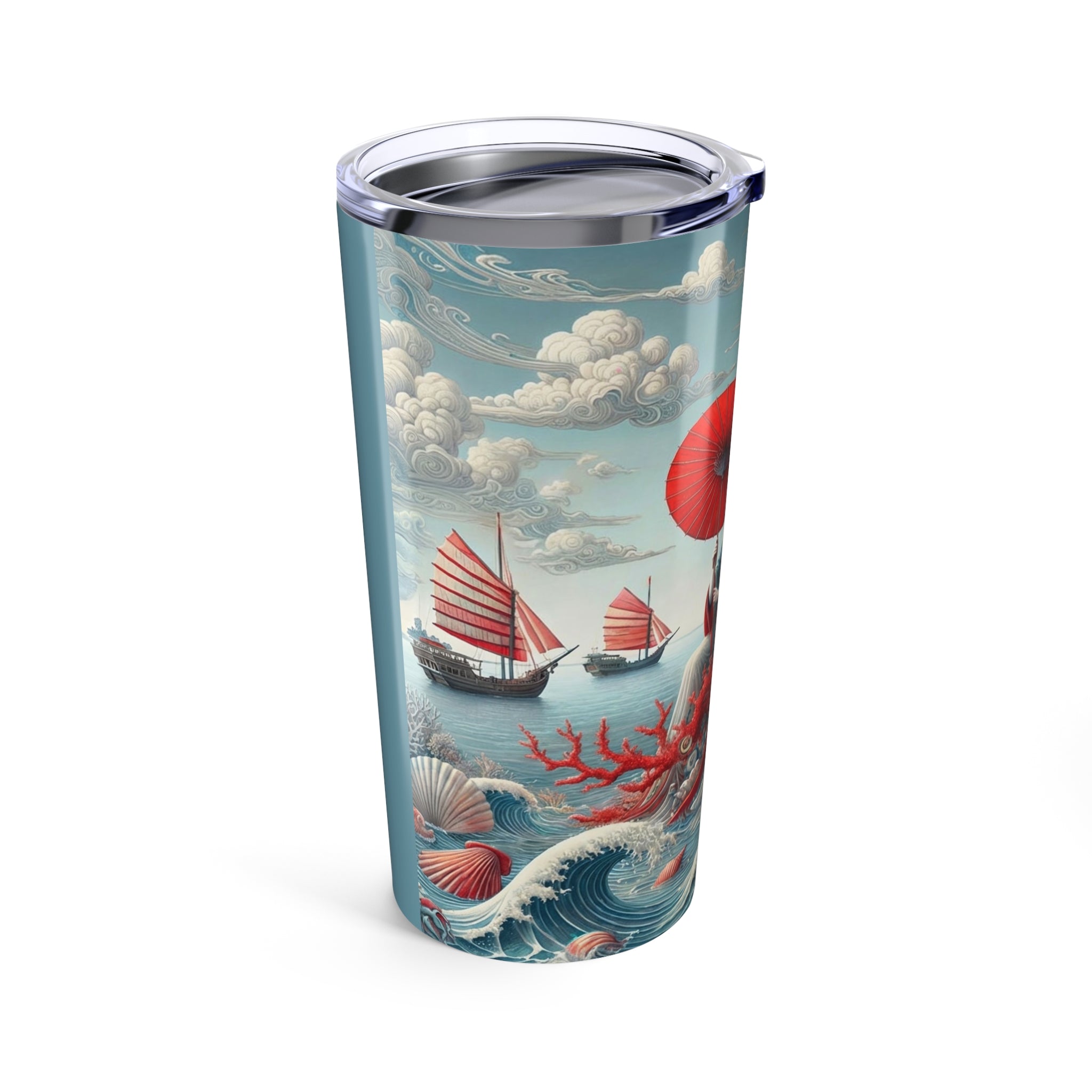 Wrapped around the tumbler is a serene coastal scene where two elegantly dressed figures rest beside a tranquil sea, framed by soft drifting clouds, coral branches, and distant red-sailed boats. Flowing robes and delicate fans echo the gentle rhythm of the water, while a harmonious palette of soft blues, ivory, and muted reds creates a calm, timeless atmosphere inspired by classical East Asian aesthetics and a dreamlike maritime setting.