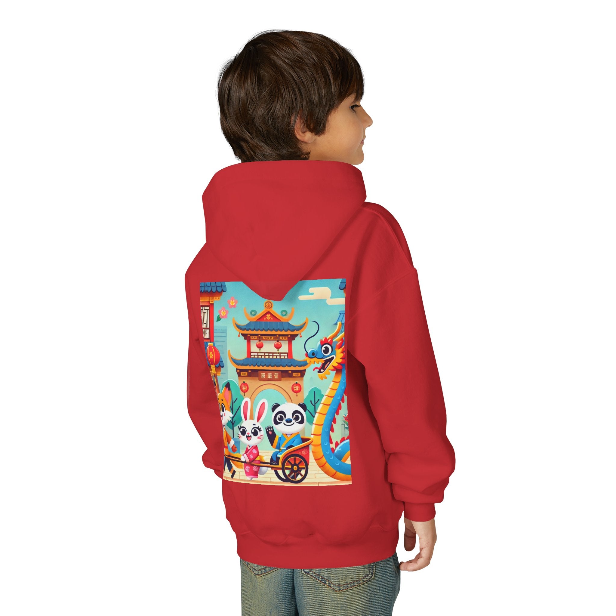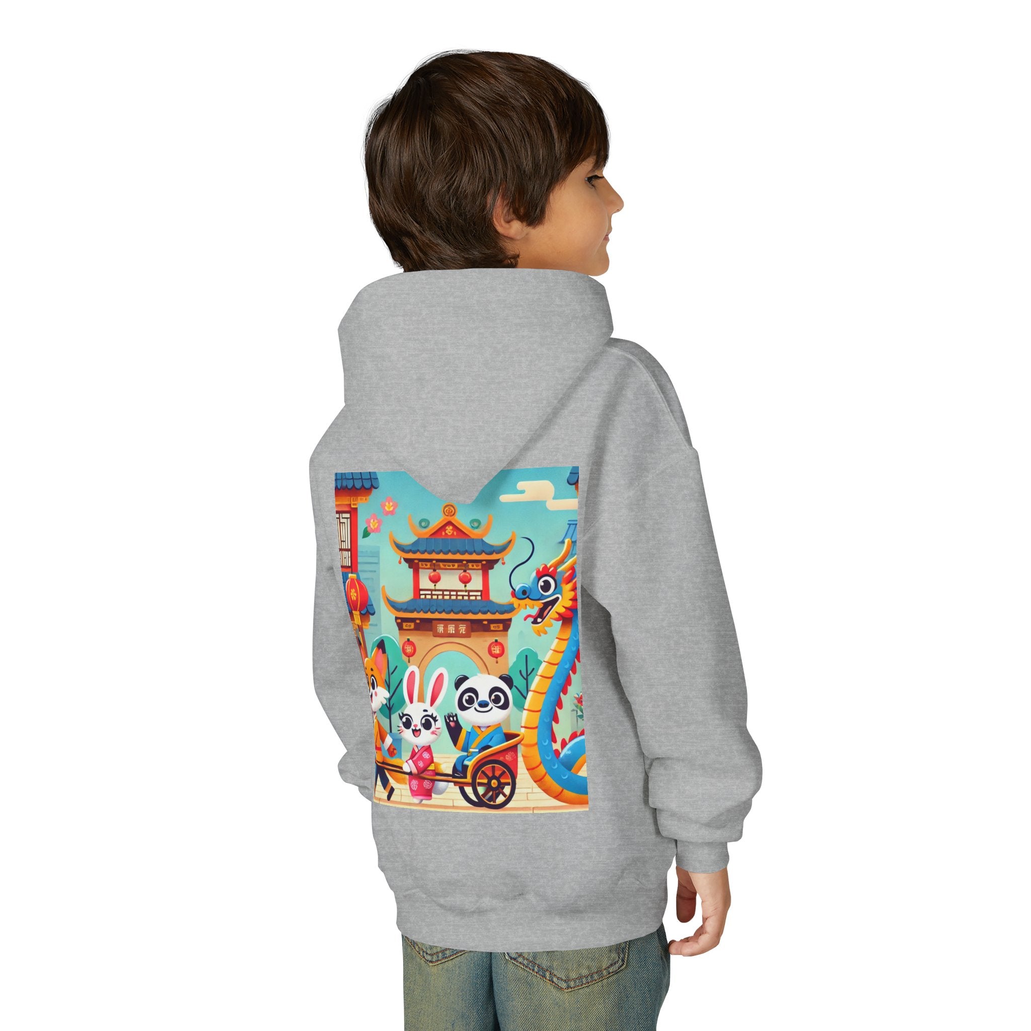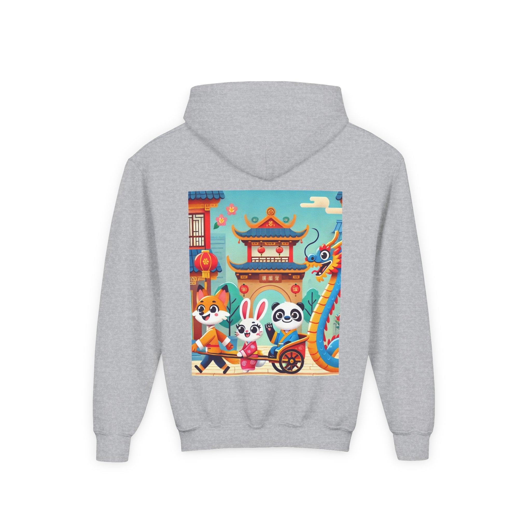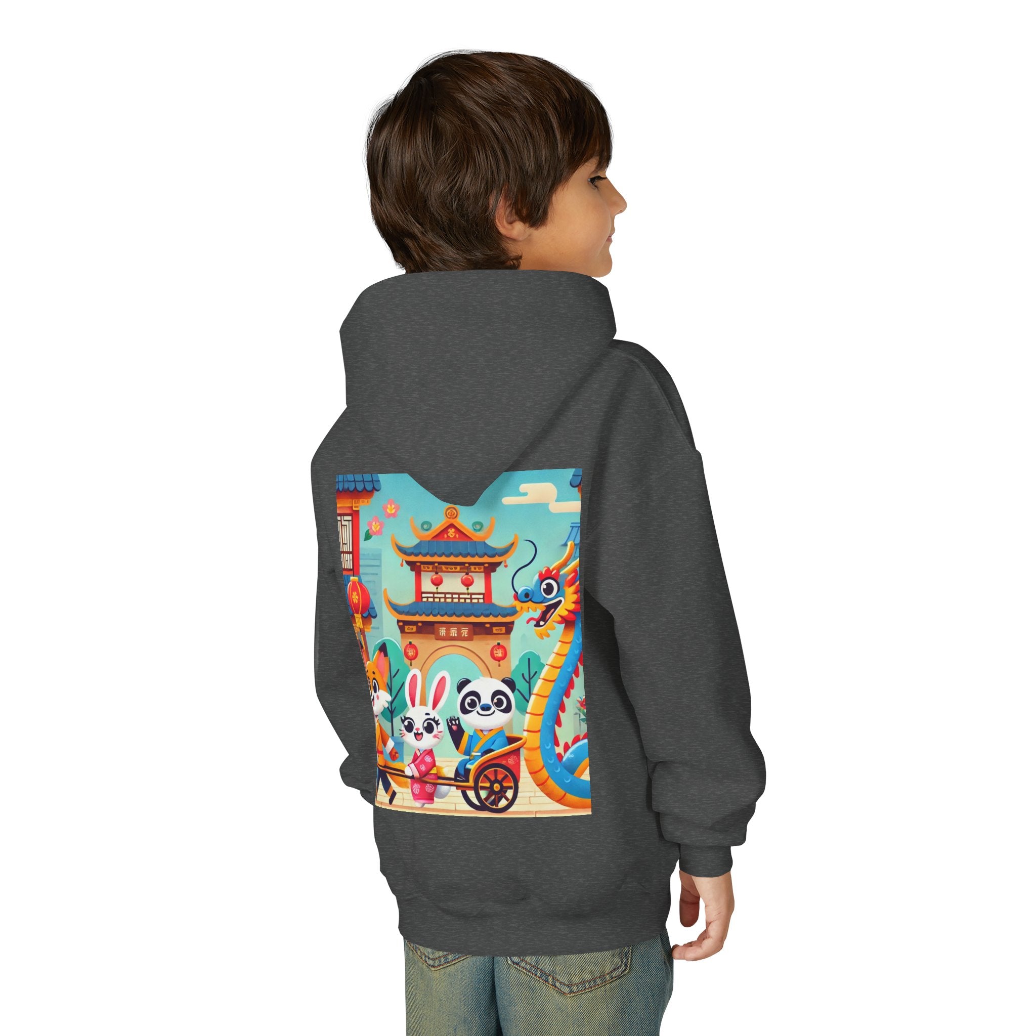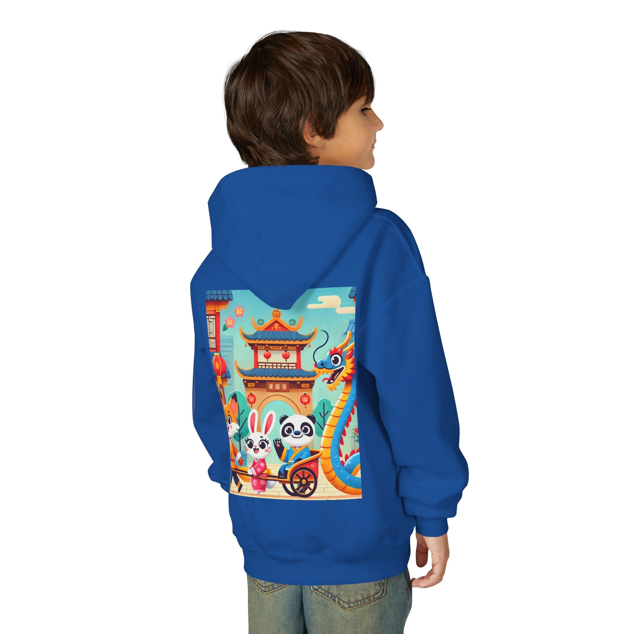 Lantern Street Dragon Parade Youth Heavy Blend Hooded Sweatshirt brings the cozy comfort of ultra-soft, preshrunk fleece to a lively storybook scene set on an ancient lantern-lined street. Made with a durable 50% cotton / 50% polyester blend that helps reduce lint buildup, this hoodie stays warm and comfy while the artwork glows with a cheerful blue-and-gold dragon swirling above a joyful procession of animal friends in traditional Hanfu. Bright rooftops, curved eaves, soft clouds, and glowing red lanterns create a warm, celebratory atmosphere that feels full of motion, tradition, and kid-friendly magic.
