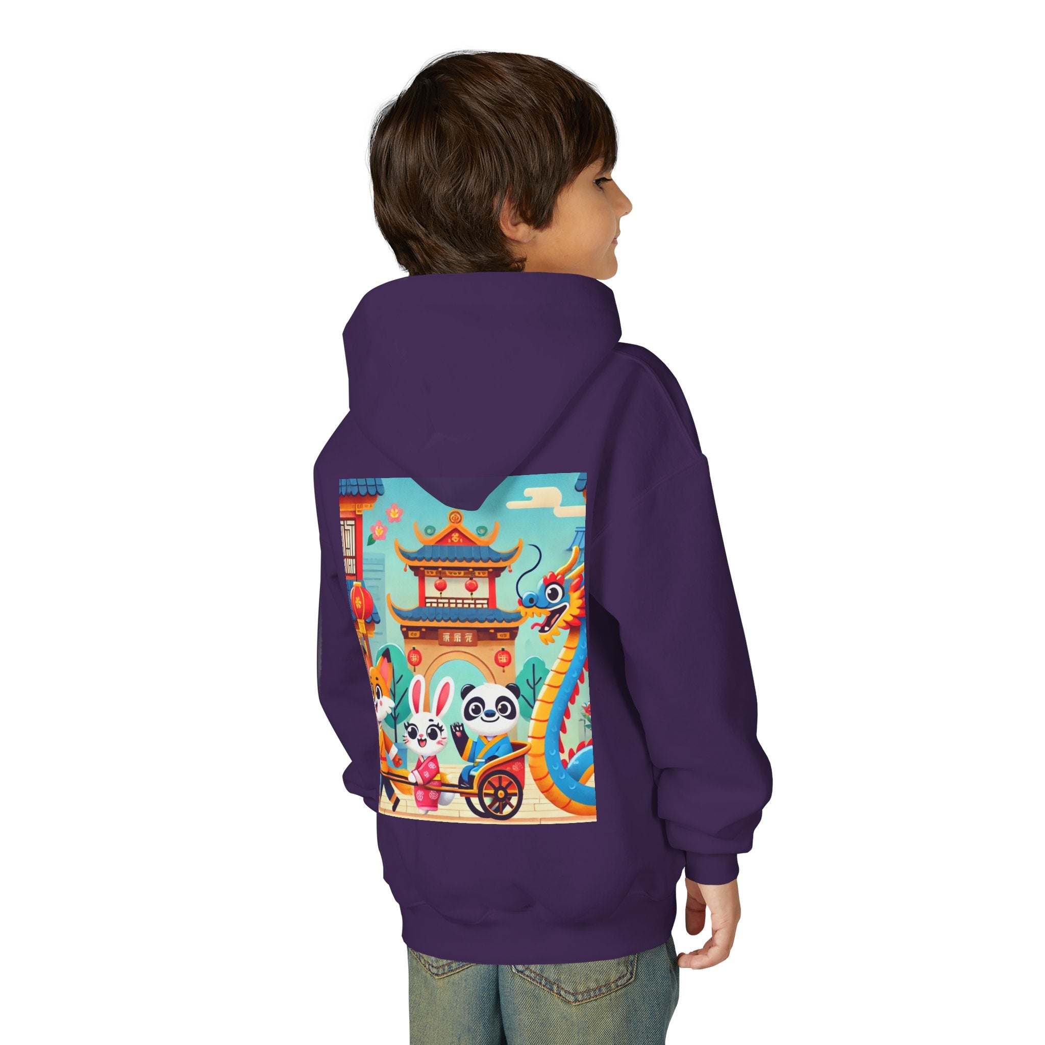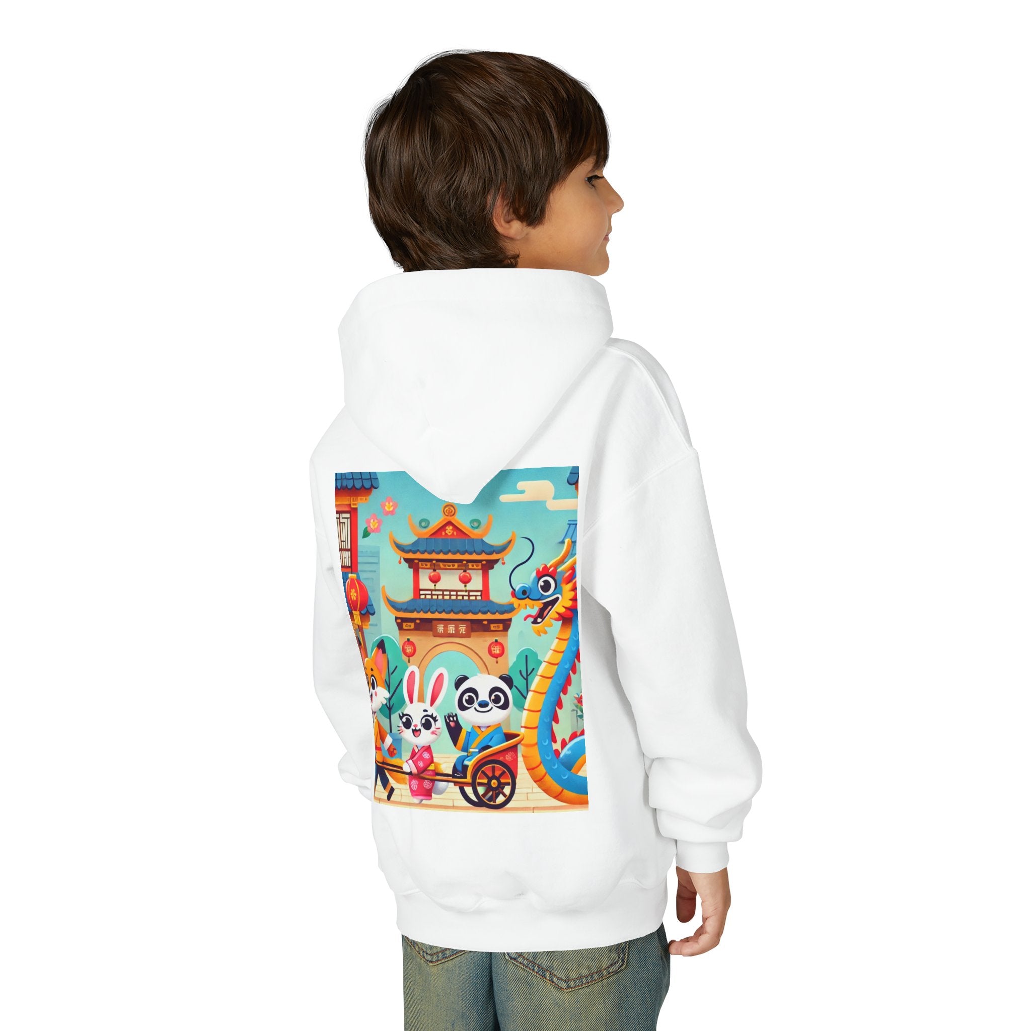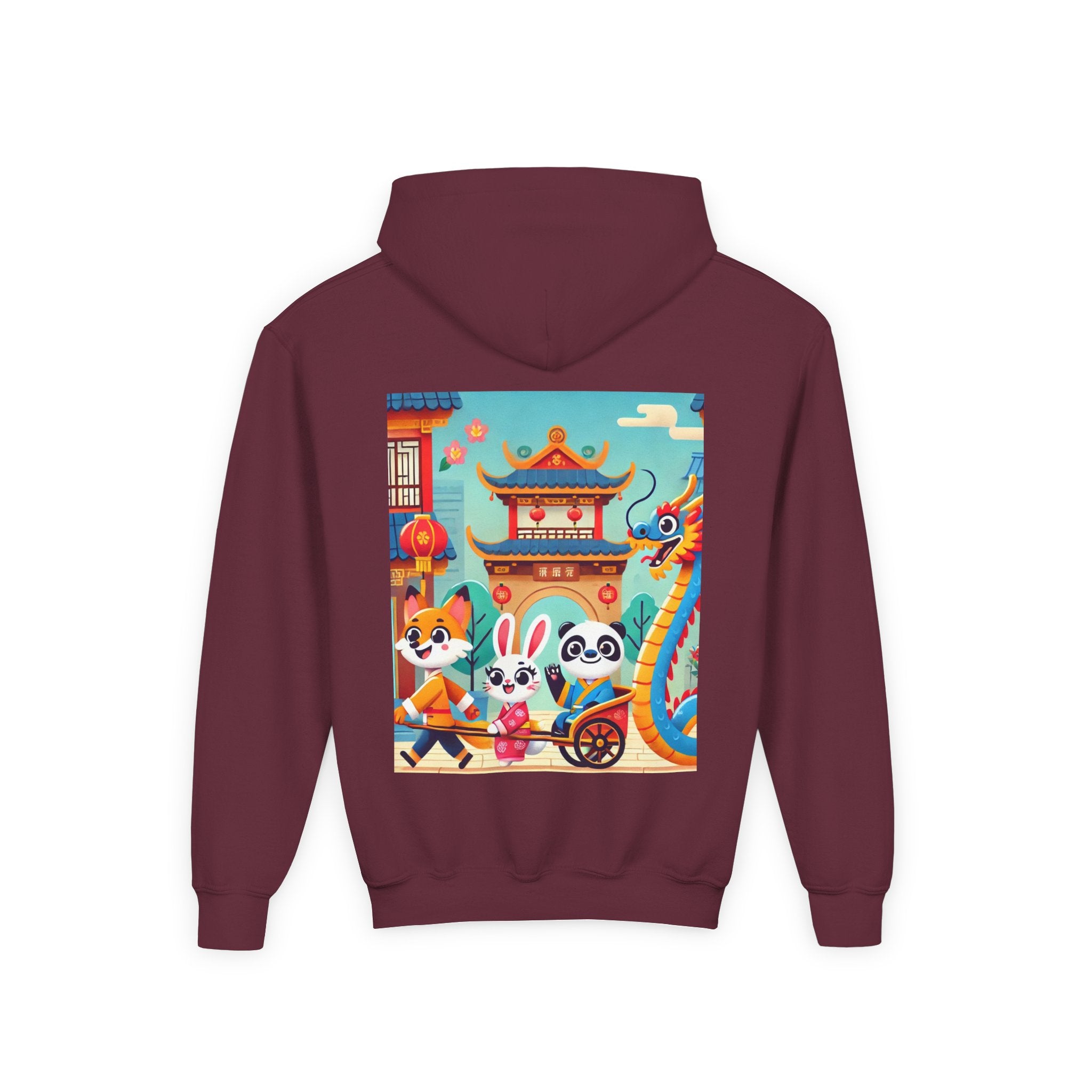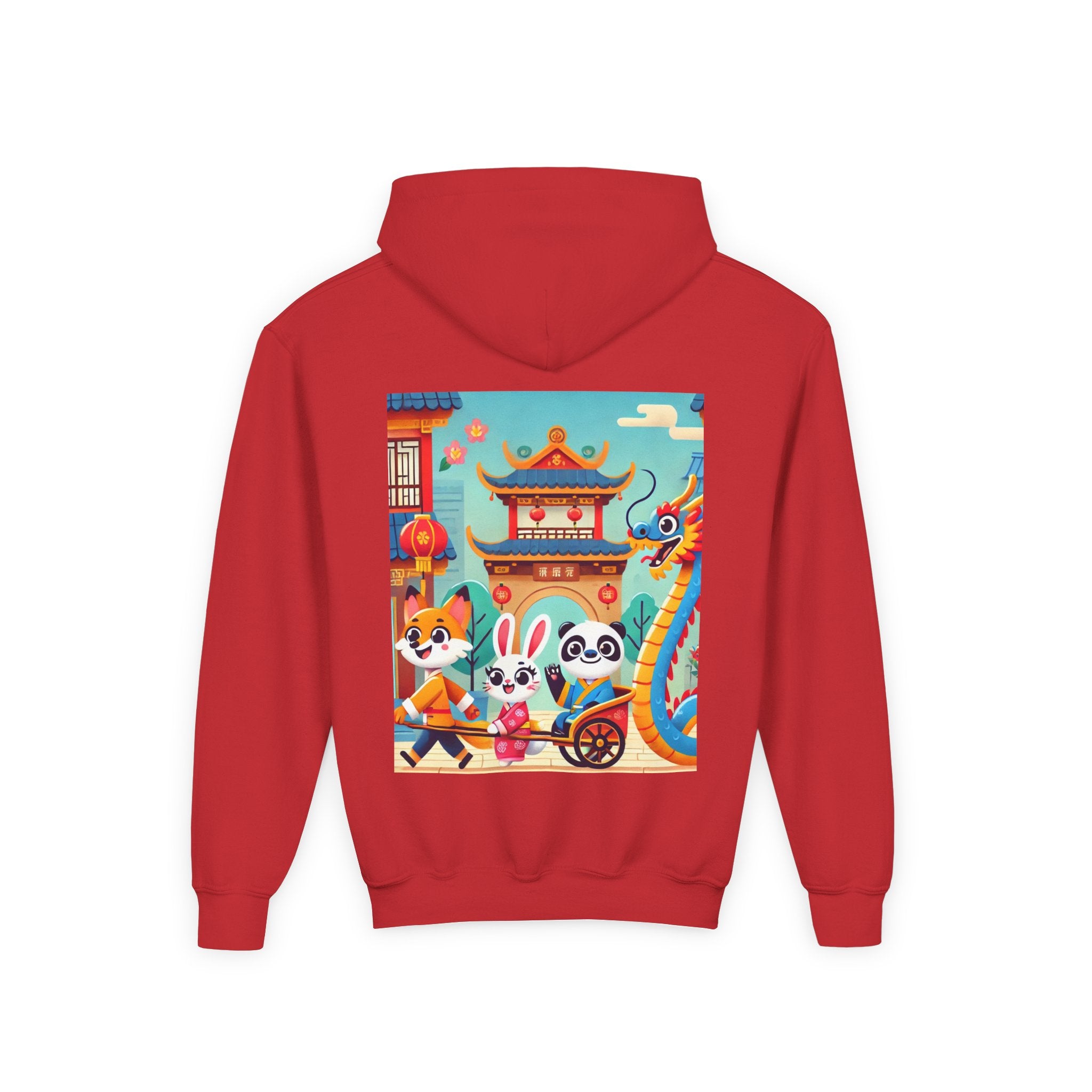 Lantern Street Dragon Parade Youth Heavy Blend Hooded Sweatshirt brings the cozy comfort of ultra-soft, preshrunk fleece to a lively storybook scene set on an ancient lantern-lined street. Made with a durable 50% cotton / 50% polyester blend that helps reduce lint buildup, this hoodie stays warm and comfy while the artwork glows with a cheerful blue-and-gold dragon swirling above a joyful procession of animal friends in traditional Hanfu. Bright rooftops, curved eaves, soft clouds, and glowing red lanterns create a warm, celebratory atmosphere that feels full of motion, tradition, and kid-friendly magic.
