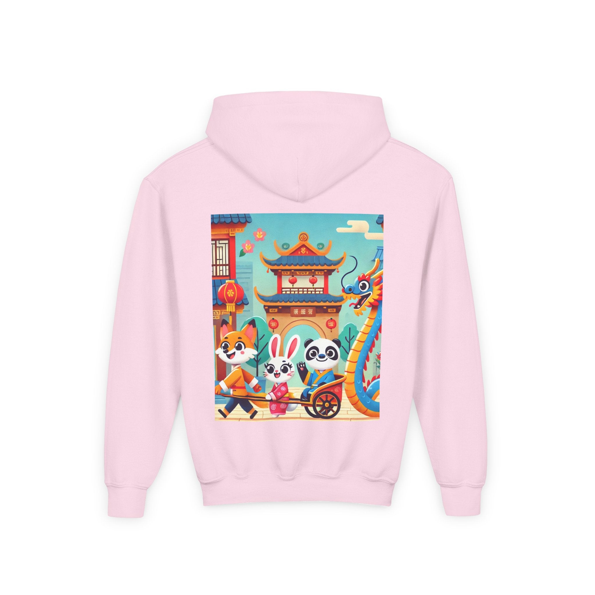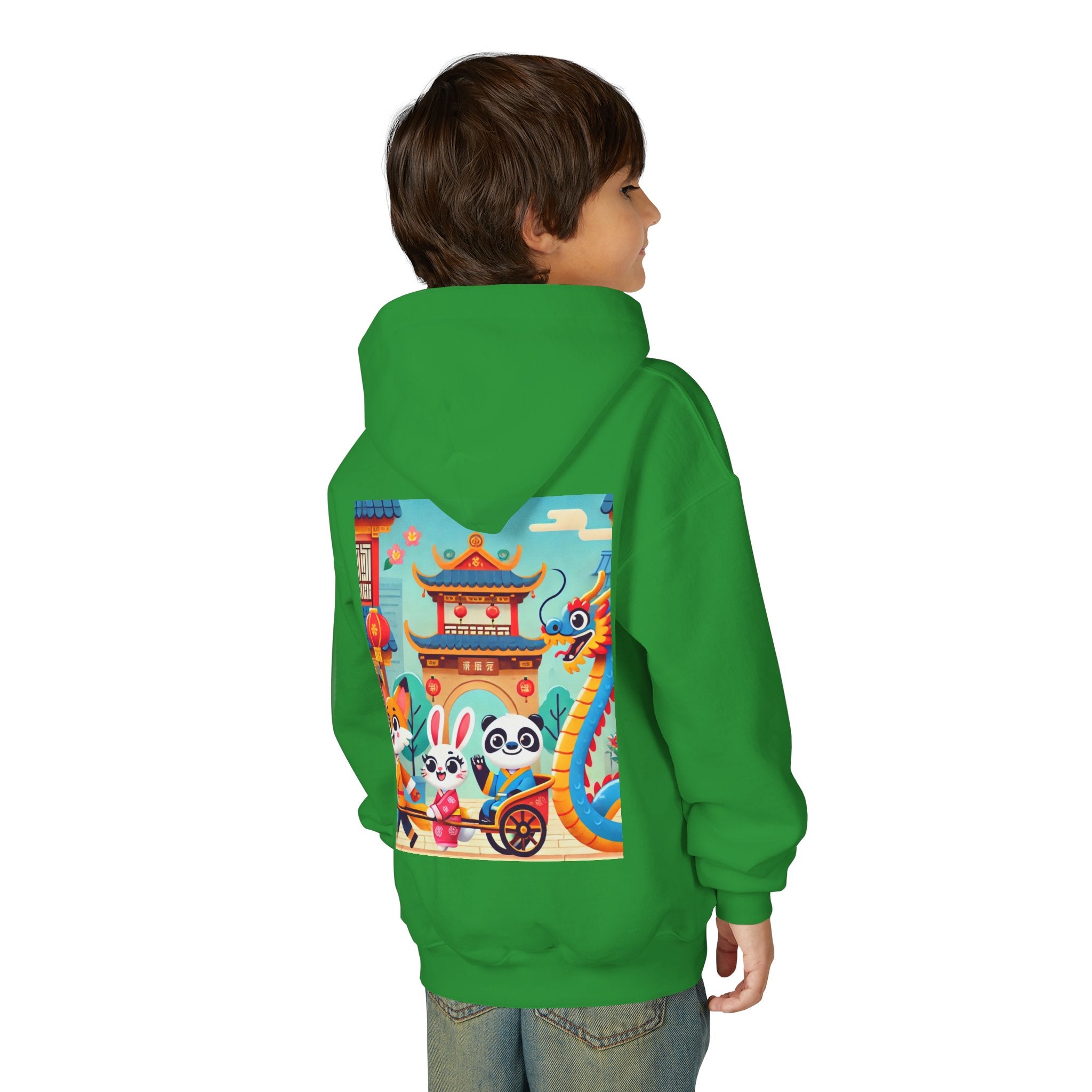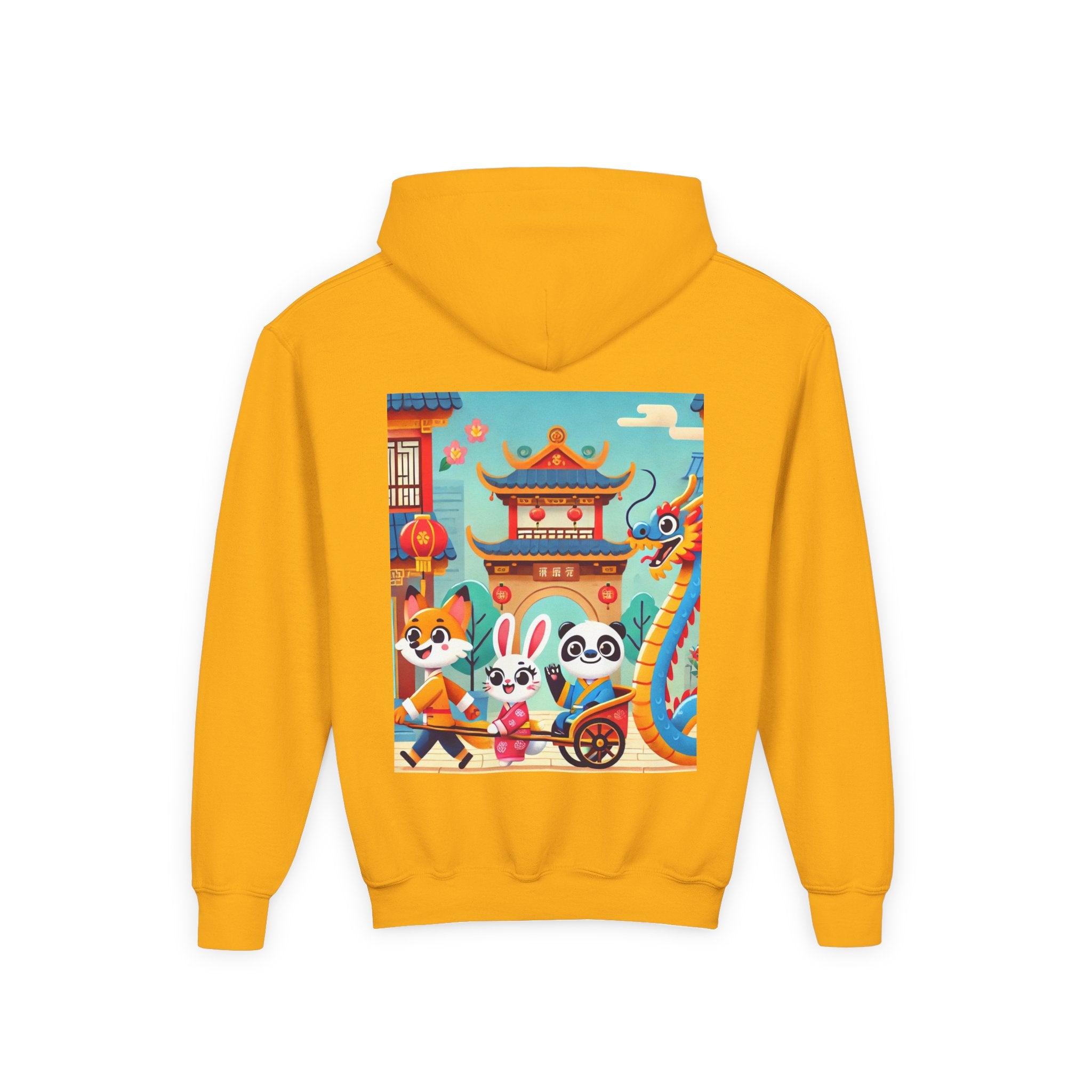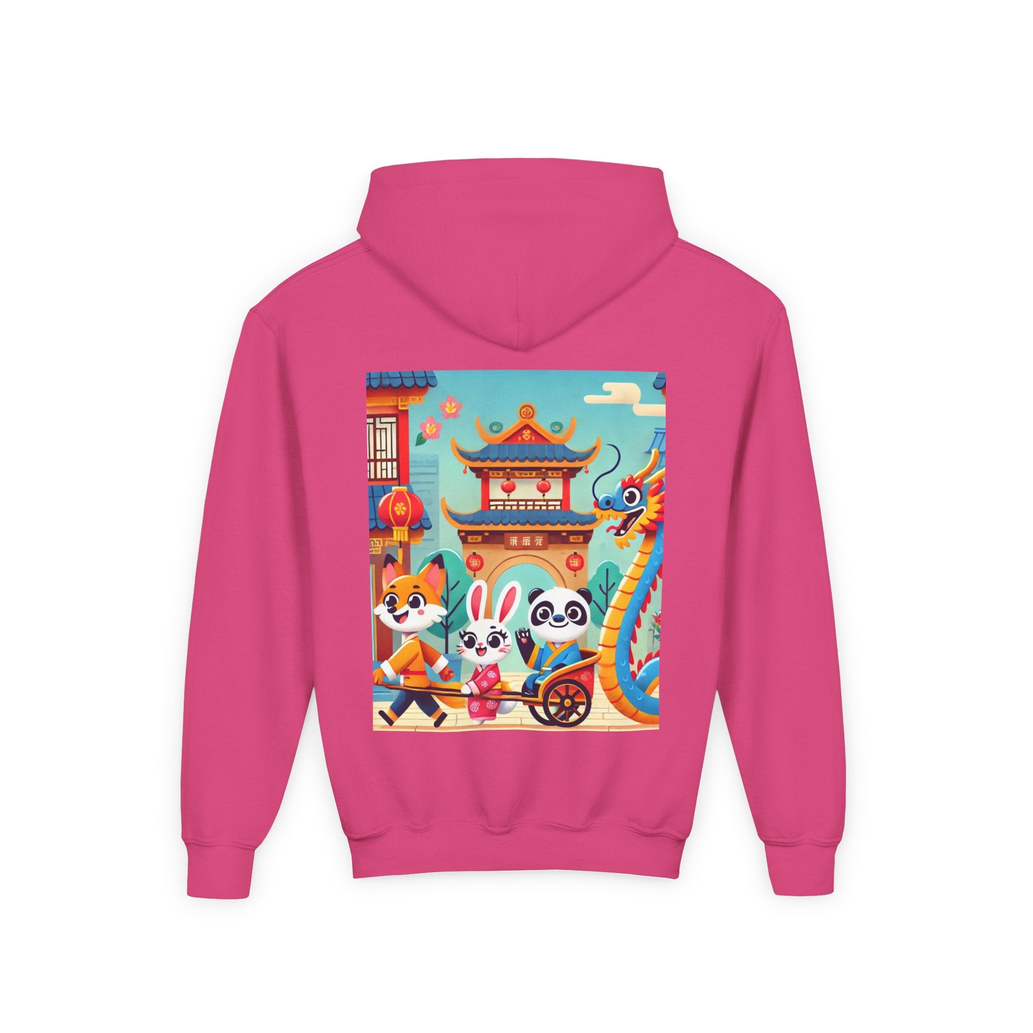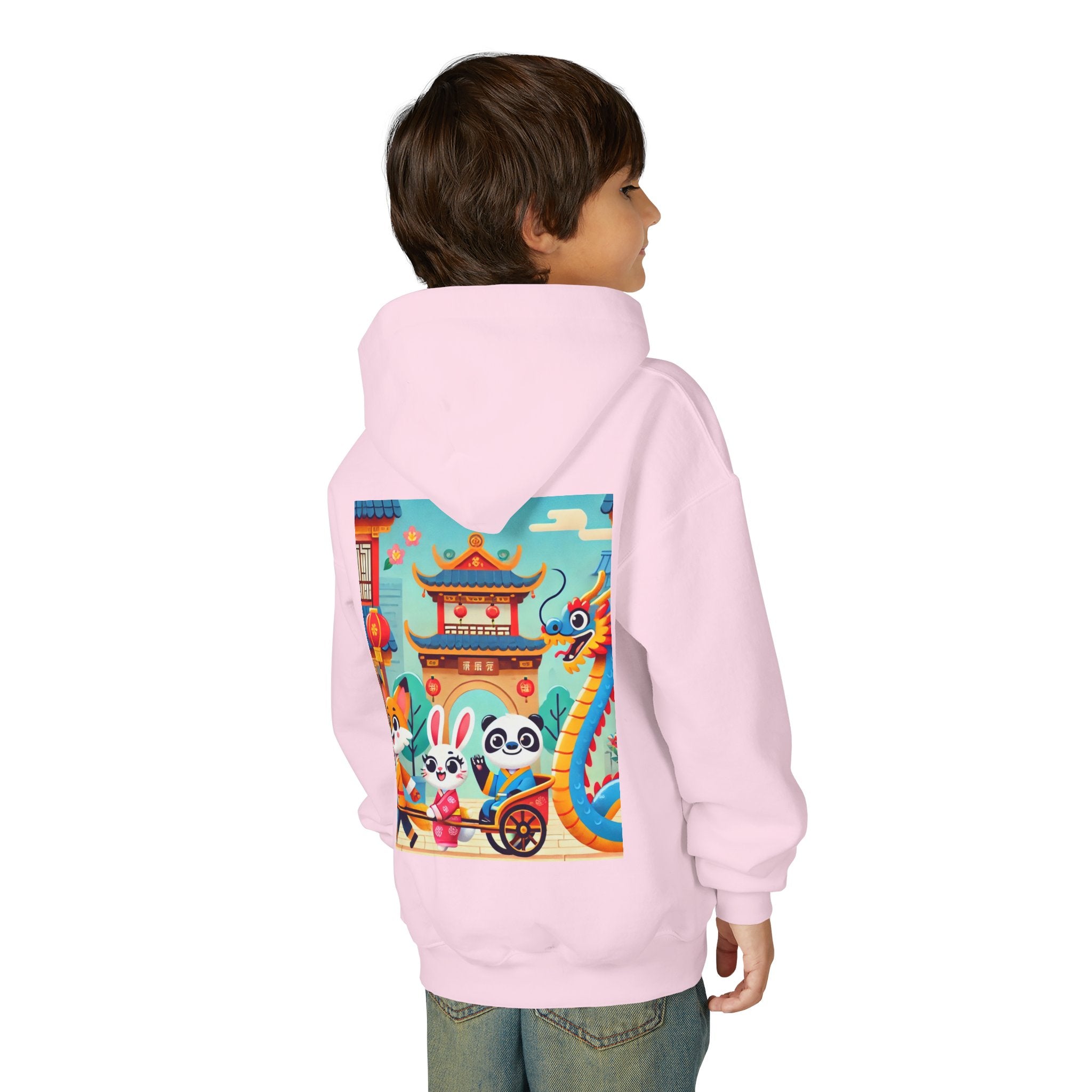 Lantern Street Dragon Parade Youth Heavy Blend Hooded Sweatshirt brings the cozy comfort of ultra-soft, preshrunk fleece to a lively storybook scene set on an ancient lantern-lined street. Made with a durable 50% cotton / 50% polyester blend that helps reduce lint buildup, this hoodie stays warm and comfy while the artwork glows with a cheerful blue-and-gold dragon swirling above a joyful procession of animal friends in traditional Hanfu. Bright rooftops, curved eaves, soft clouds, and glowing red lanterns create a warm, celebratory atmosphere that feels full of motion, tradition, and kid-friendly magic.