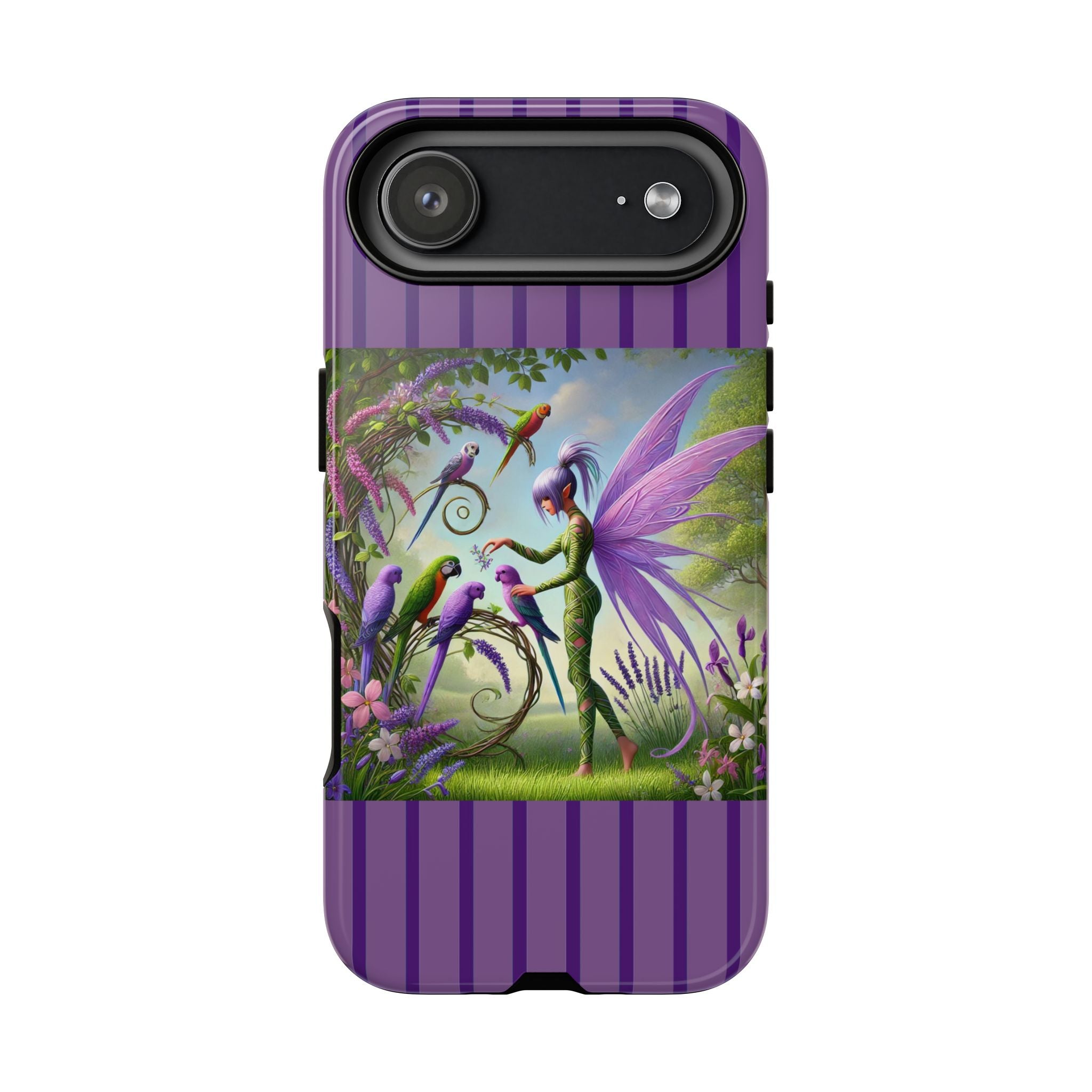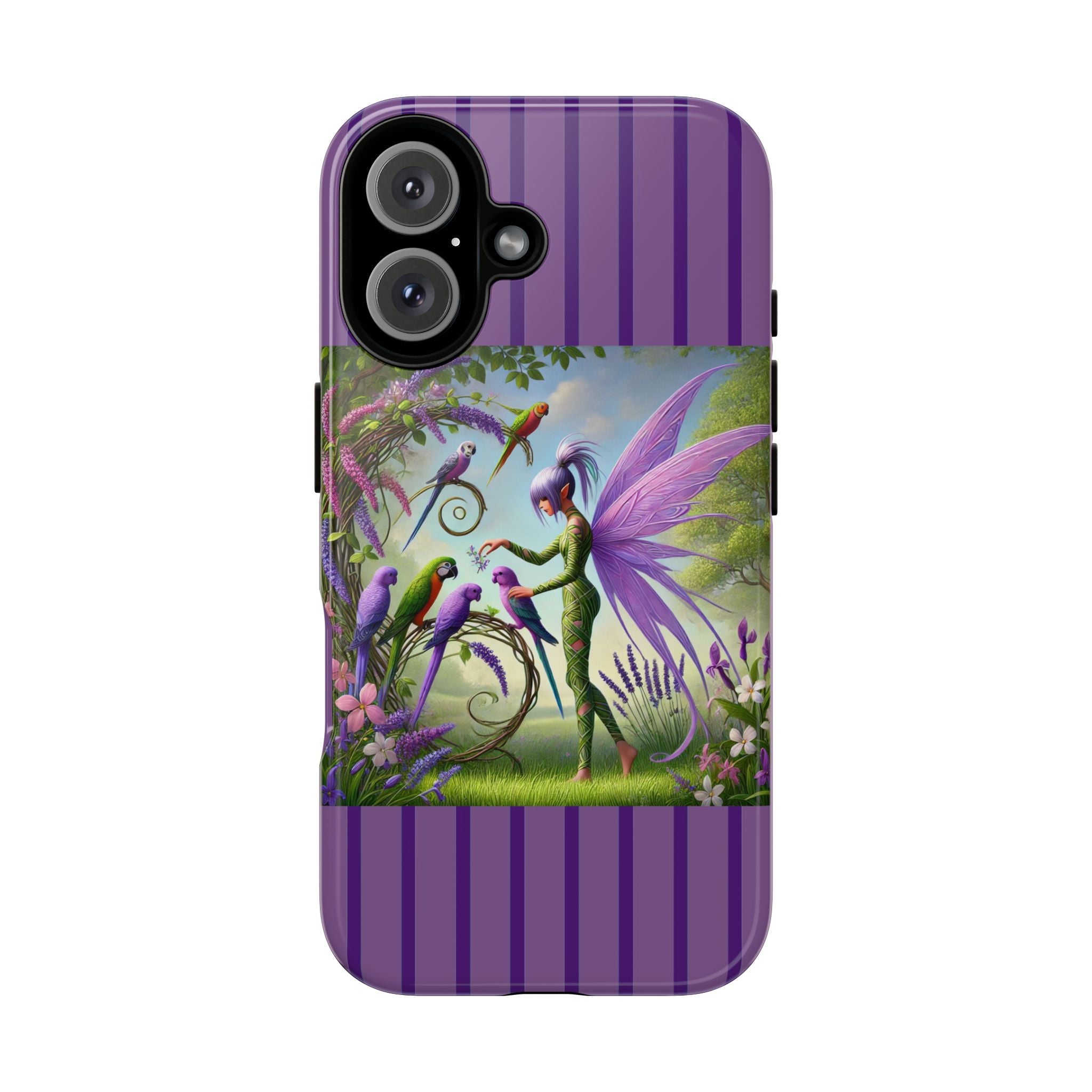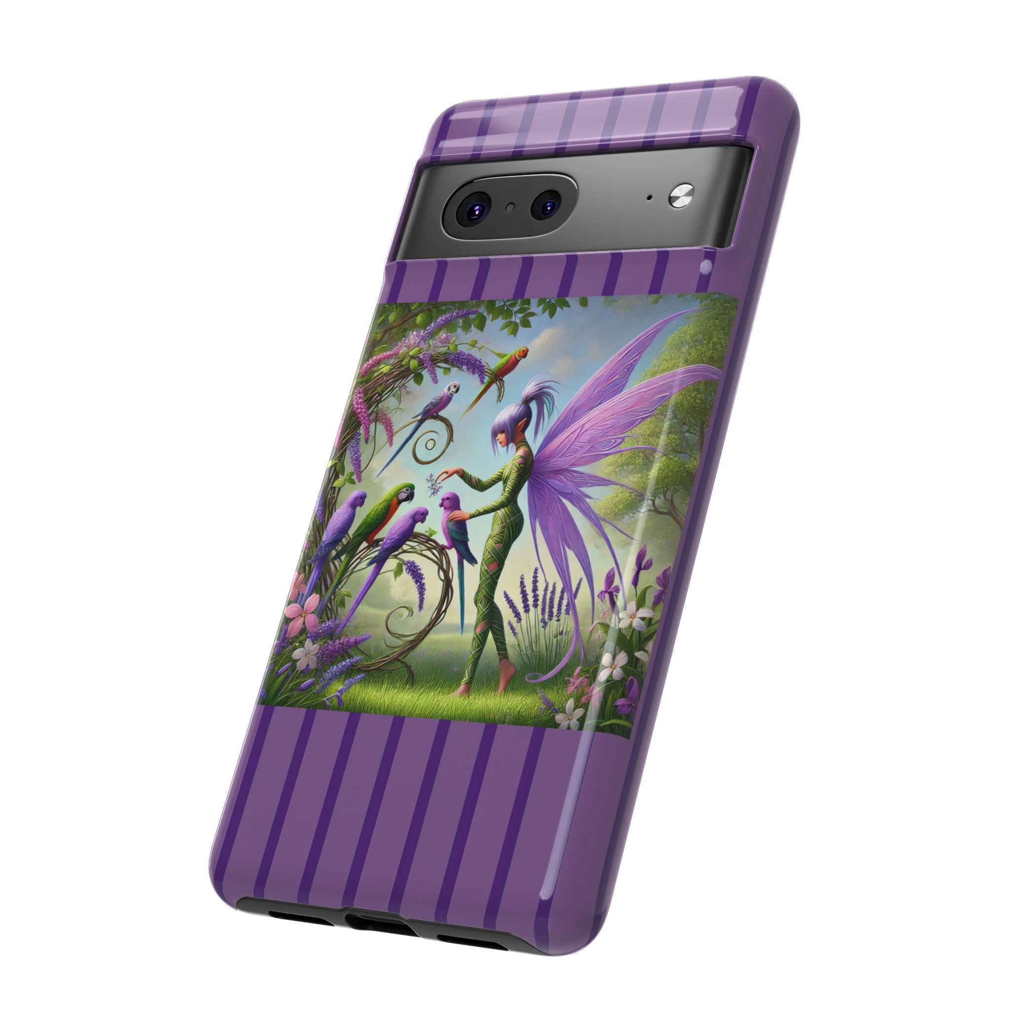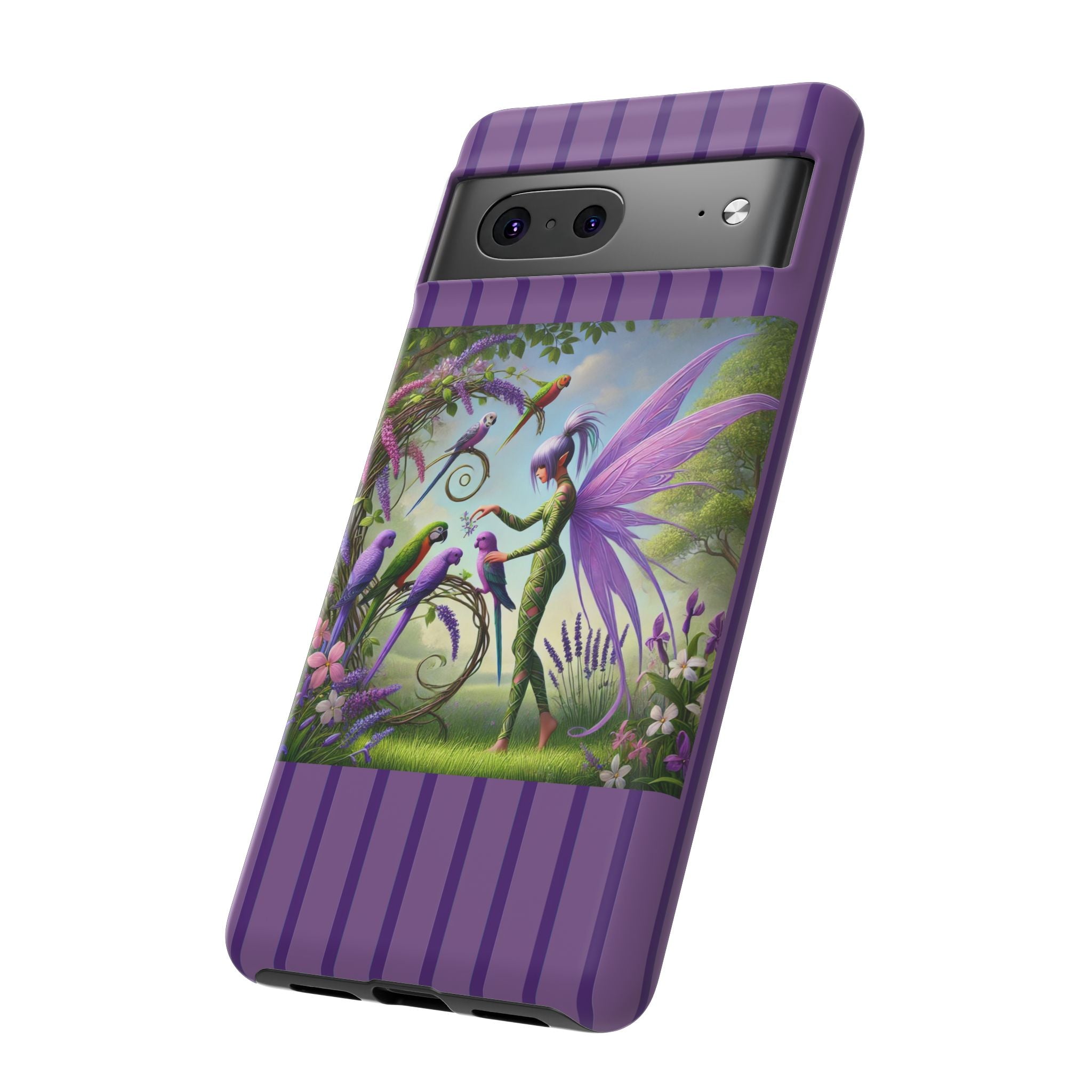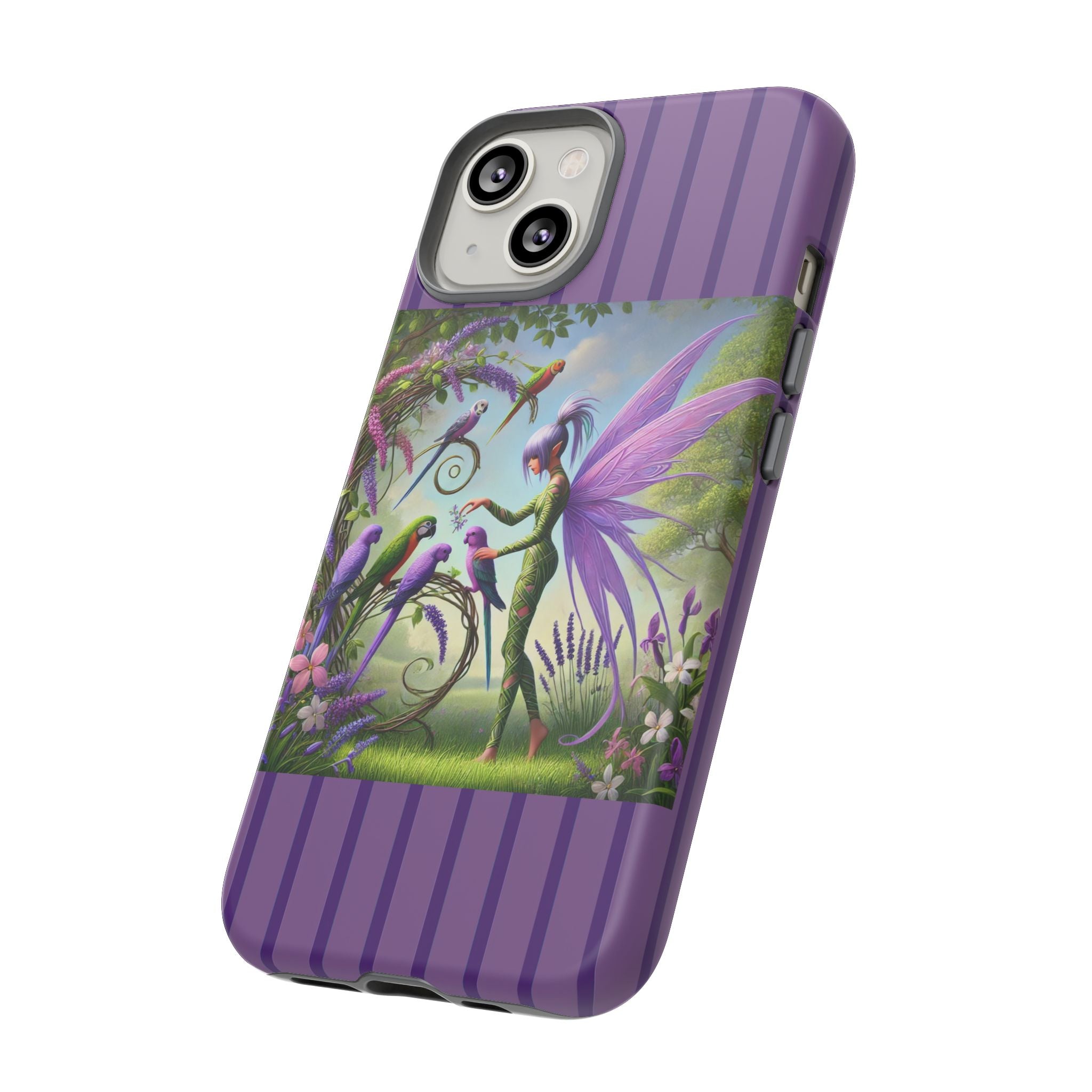 Lavender-Winged Fairy Phone Case transforms your phone into a scene of dreamy elegance and modern charm. Designed for iPhone, Samsung Galaxy, and Google Pixel devices, this case blends fine artistry with reliable protection. The design features a long, stylish fairy with shimmering lavender wings surrounded by vibrantly colored parrots under soft natural daylight. Lush greenery and blooms in shades of purple, pink, and white create an atmosphere of whimsy and freshness—capturing the magic of spring with contemporary sophistication. Choose a glossy or matte finish to bring this enchanting illustration to life while keeping your phone safe and stylish.