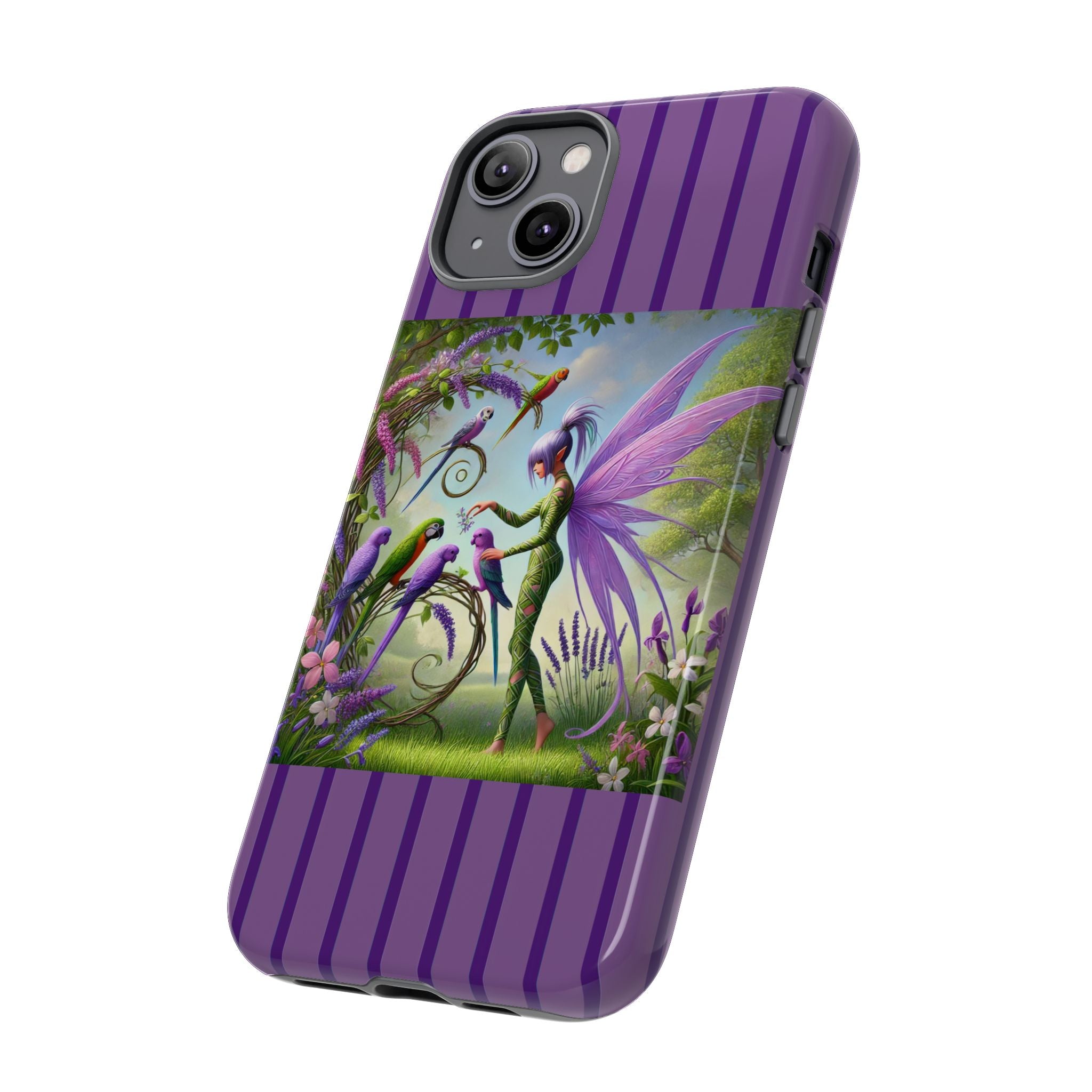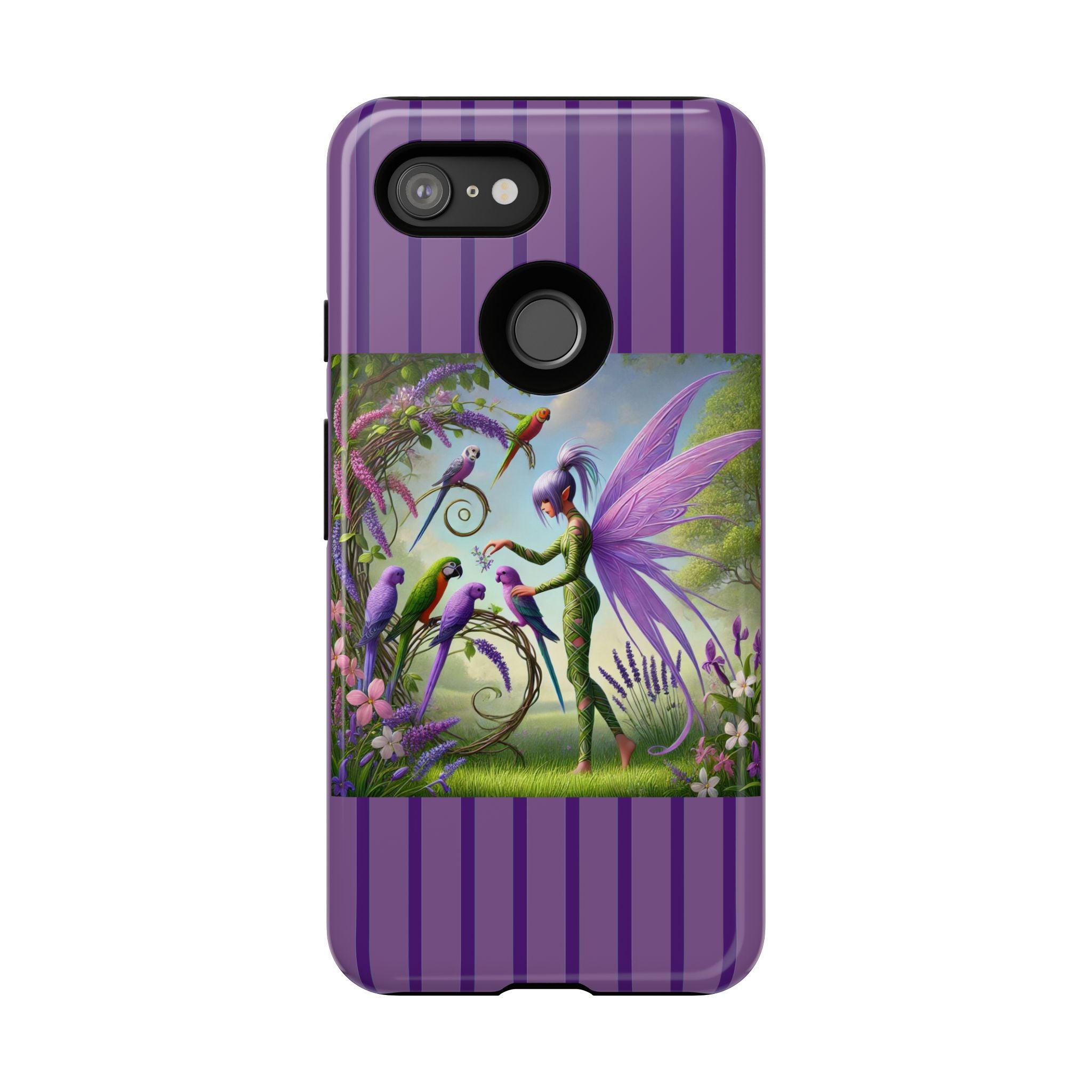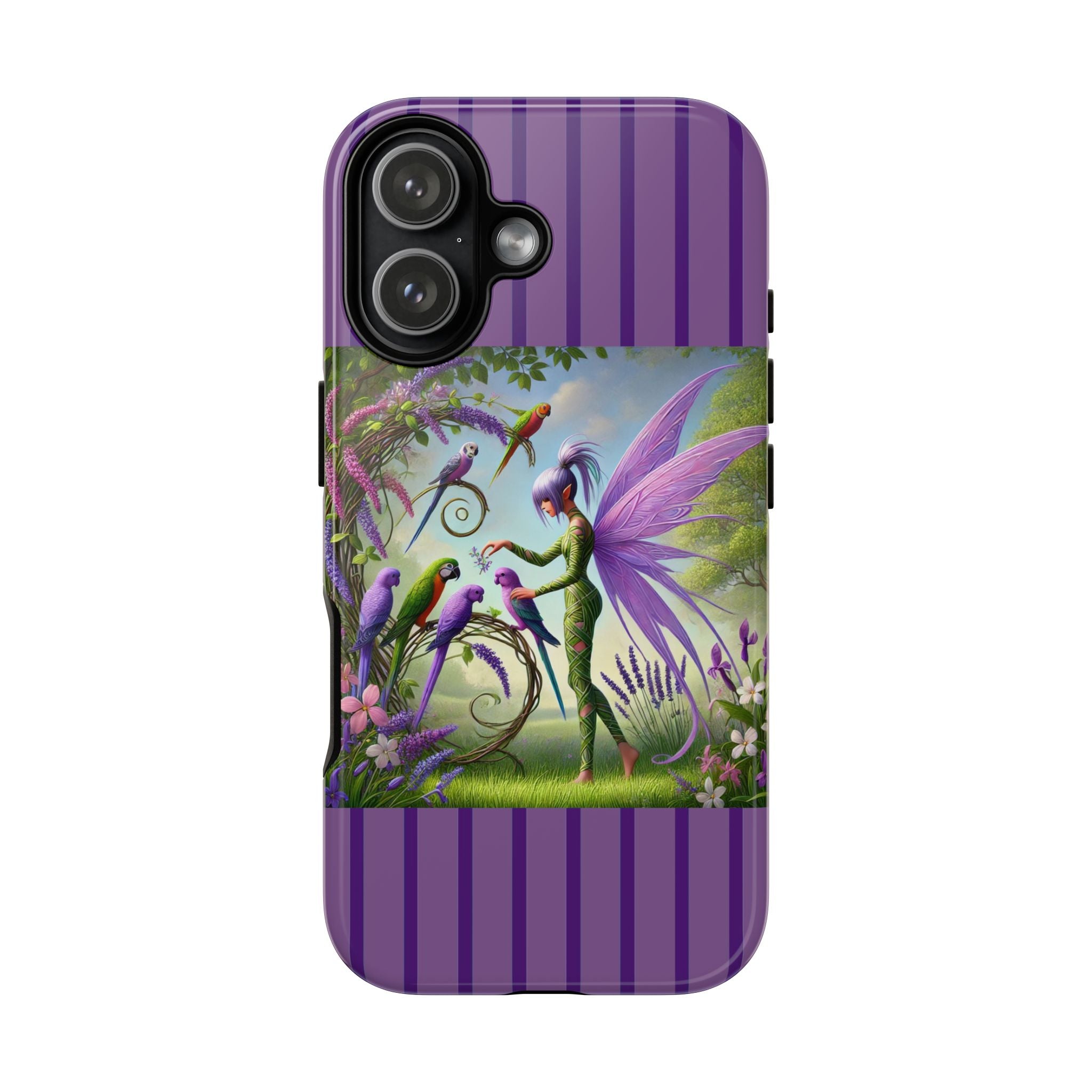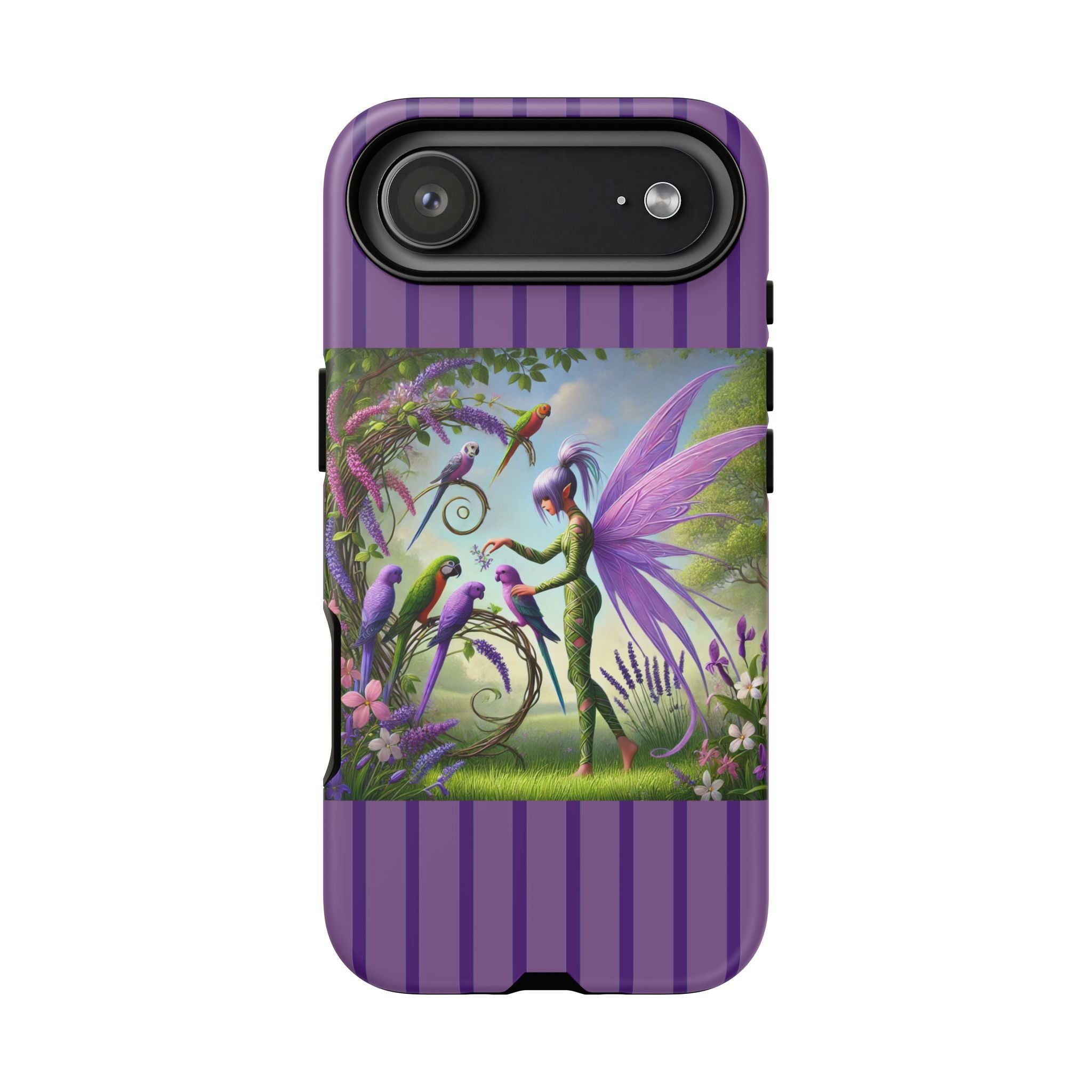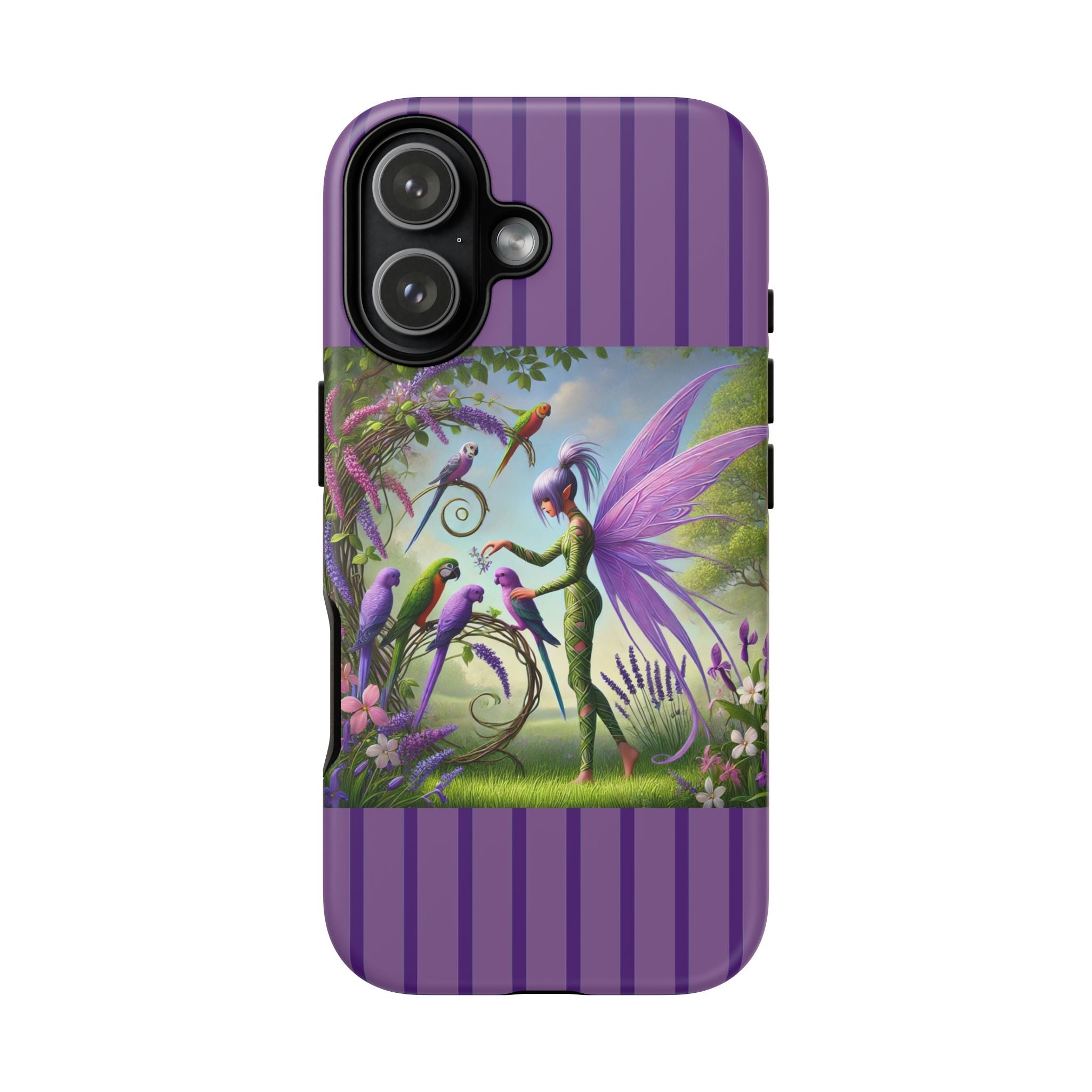 Lavender-Winged Fairy Phone Case transforms your phone into a scene of dreamy elegance and modern charm. Designed for iPhone, Samsung Galaxy, and Google Pixel devices, this case blends fine artistry with reliable protection. The design features a long, stylish fairy with shimmering lavender wings surrounded by vibrantly colored parrots under soft natural daylight. Lush greenery and blooms in shades of purple, pink, and white create an atmosphere of whimsy and freshness—capturing the magic of spring with contemporary sophistication. Choose a glossy or matte finish to bring this enchanting illustration to life while keeping your phone safe and stylish.