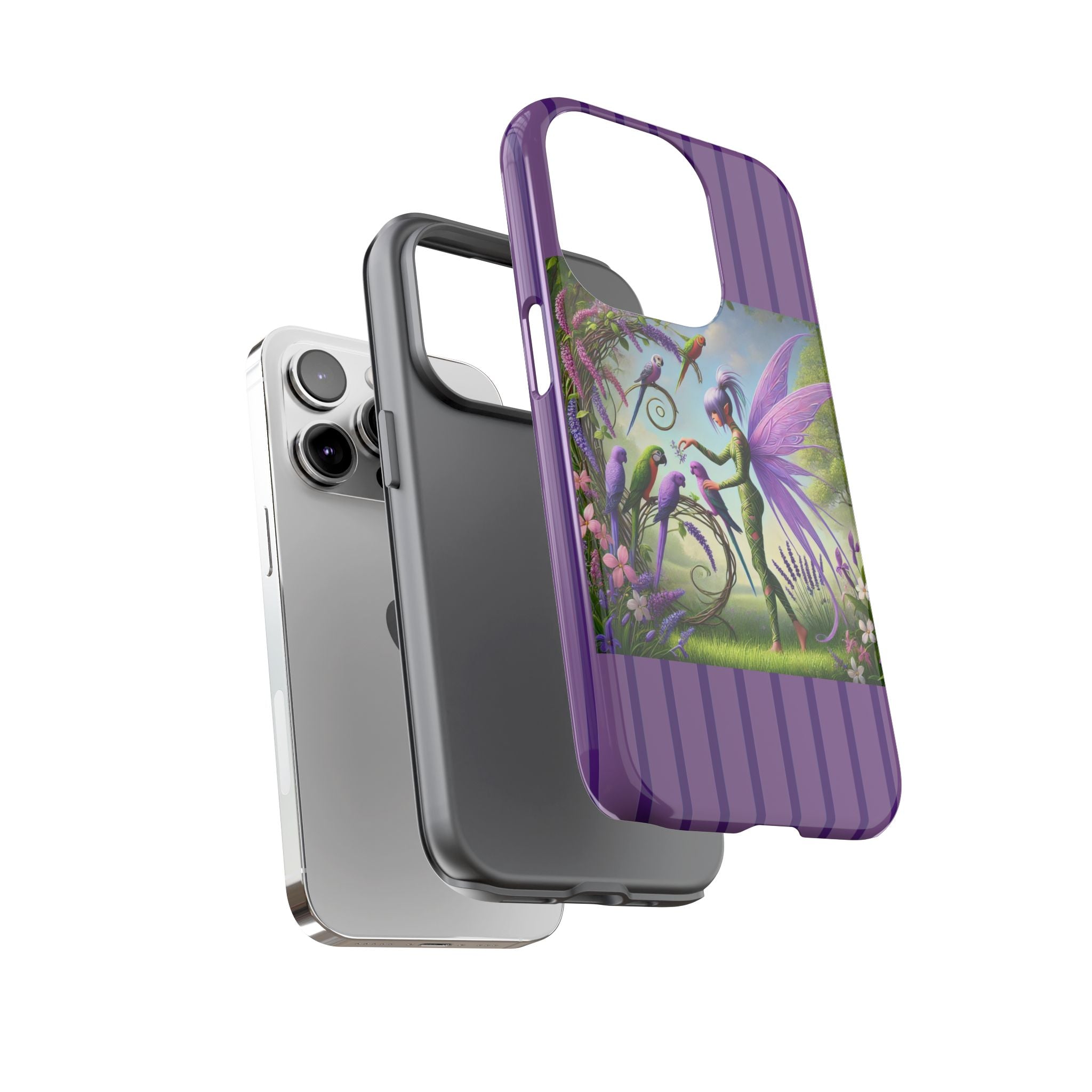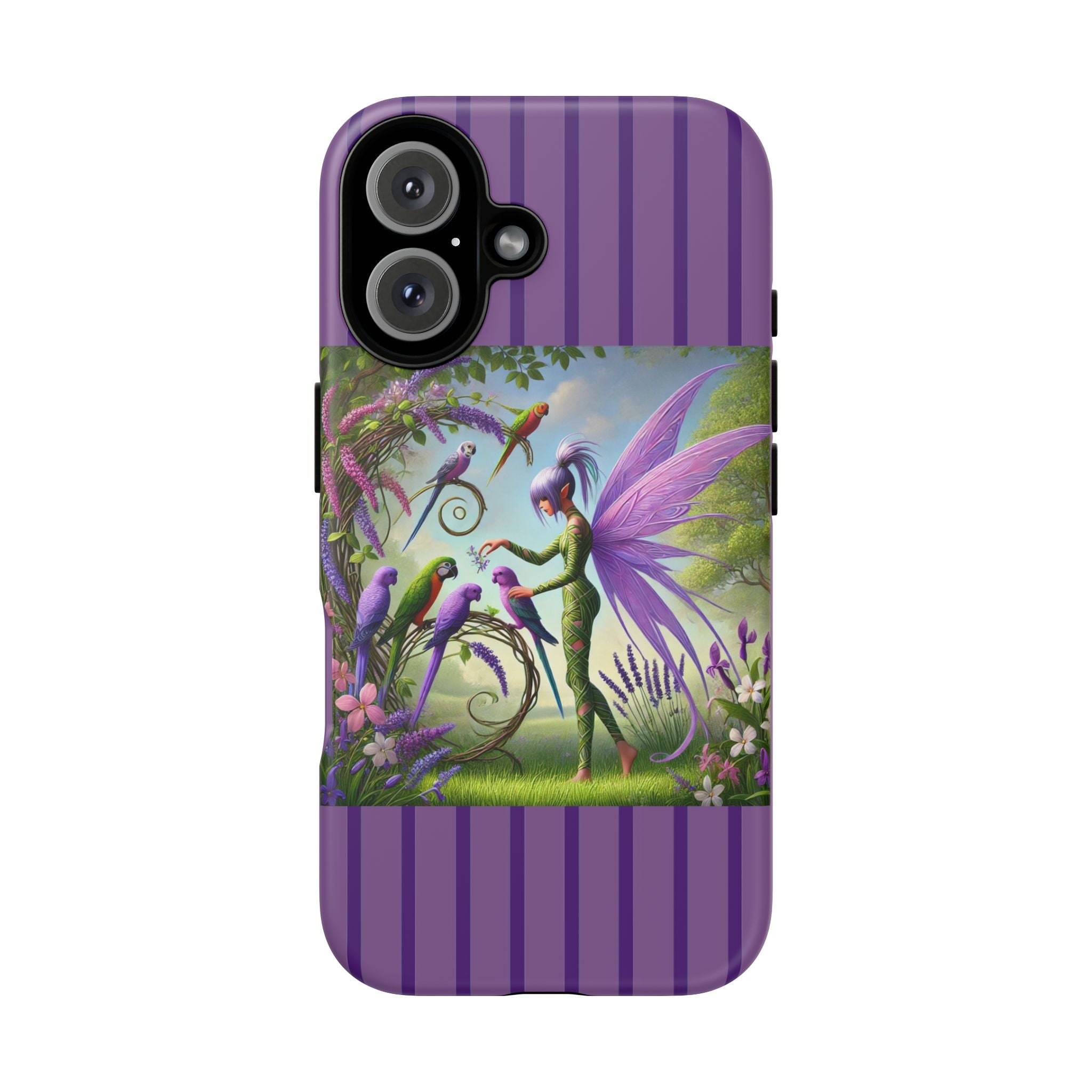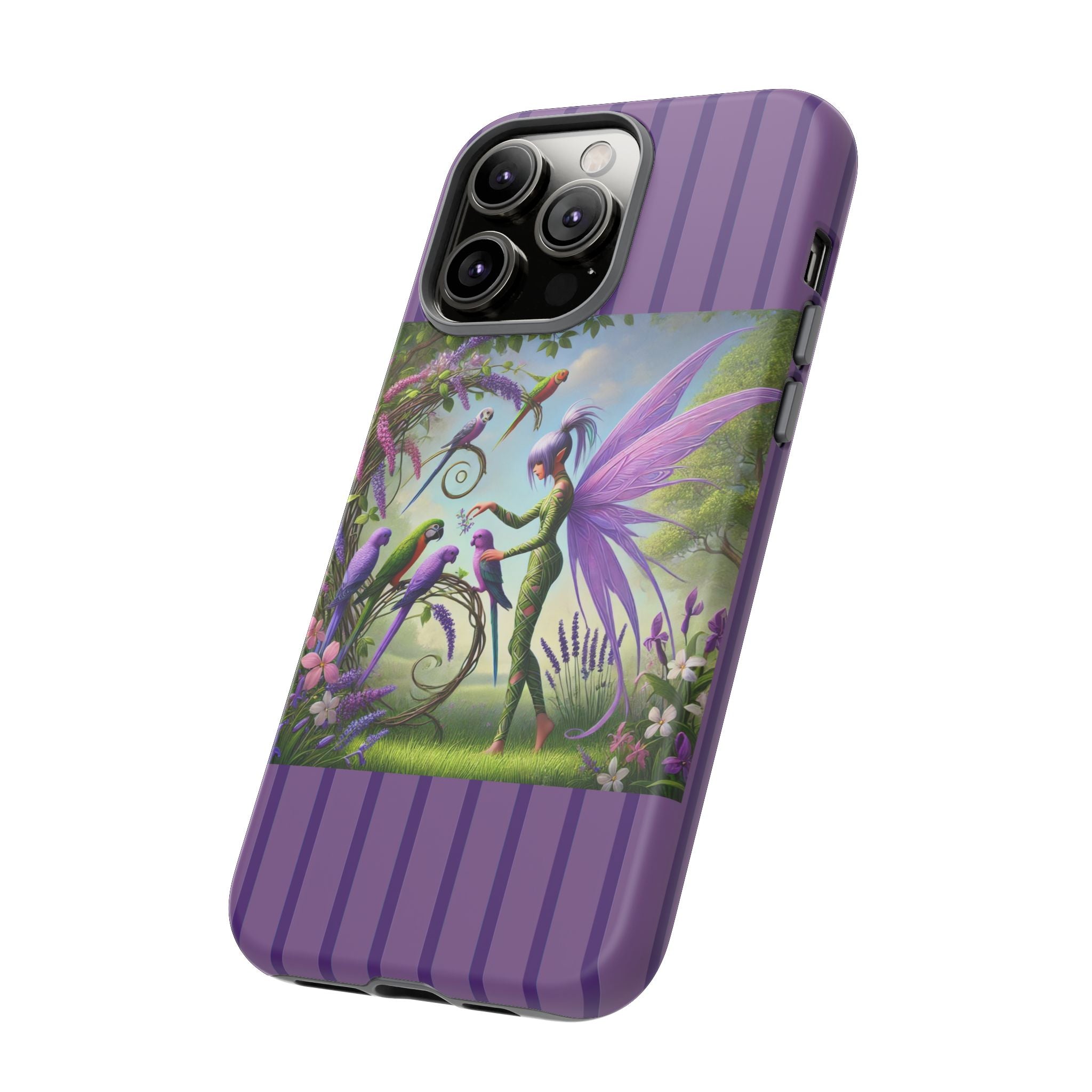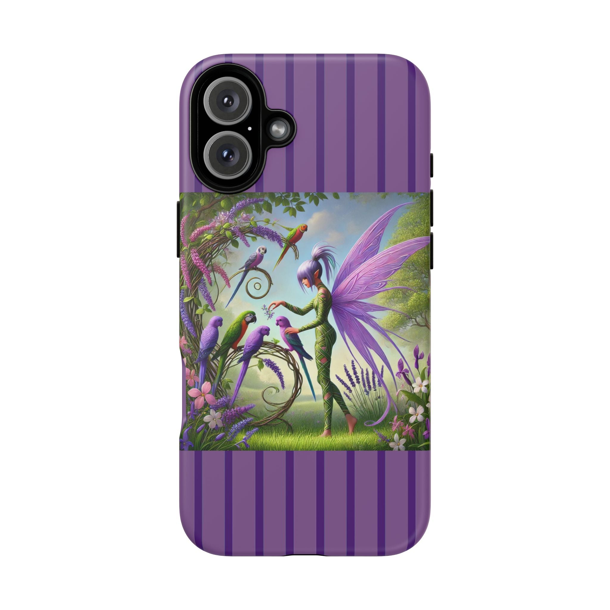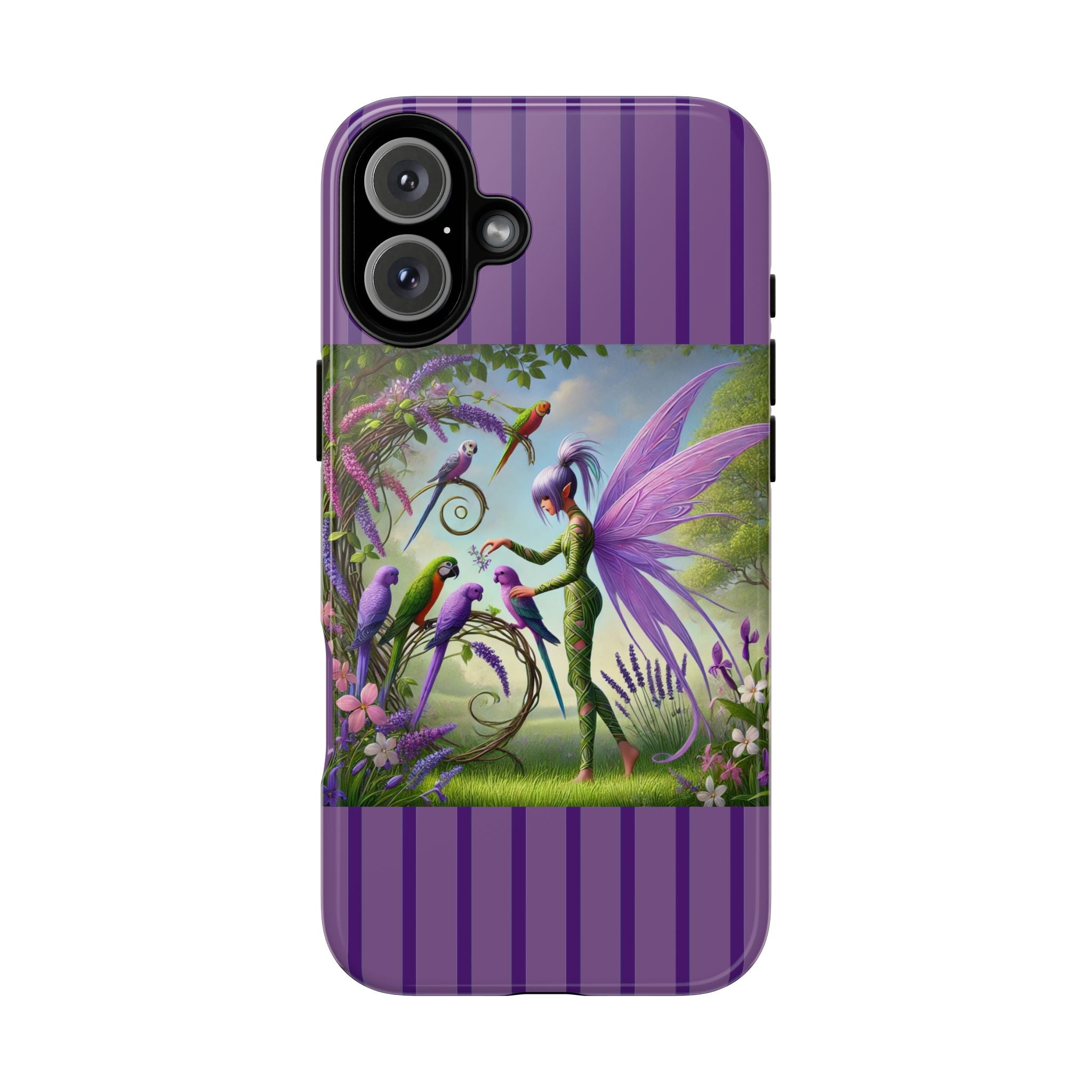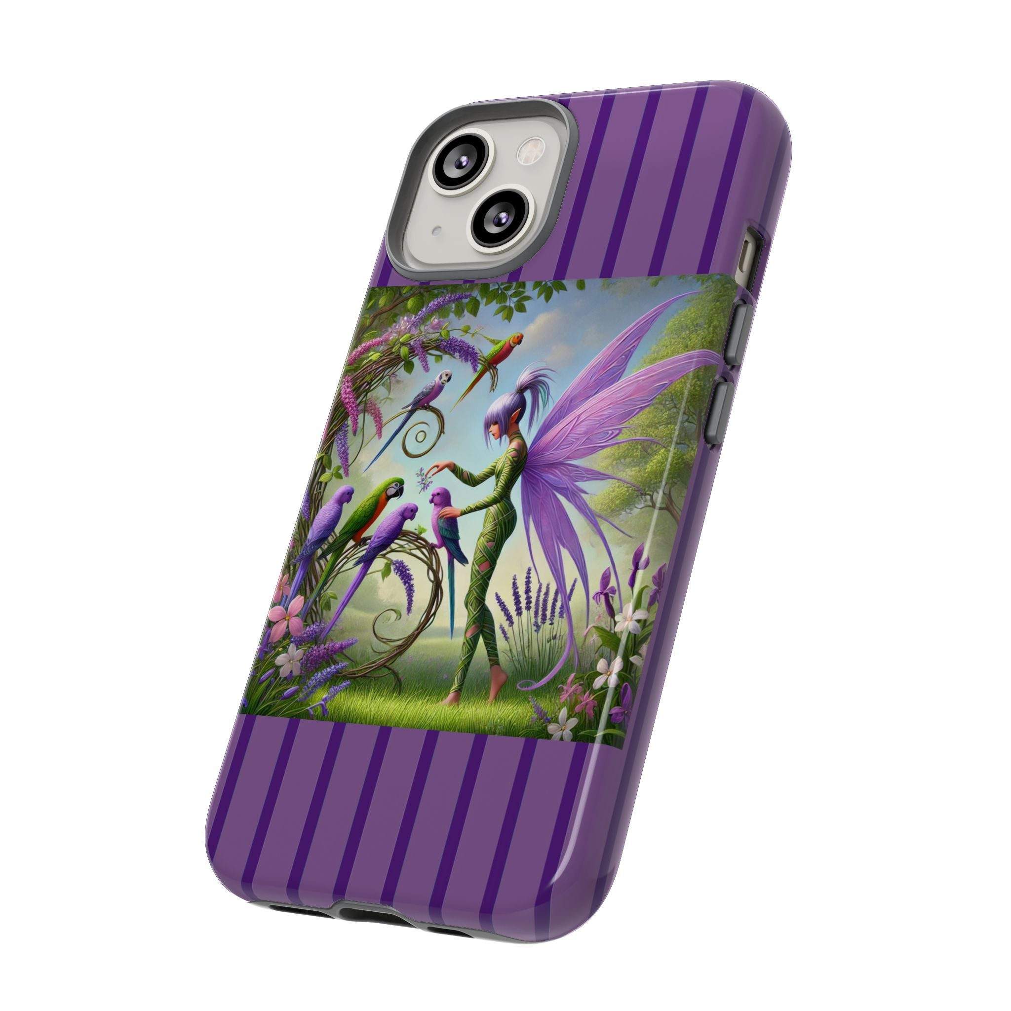 Lavender-Winged Fairy Phone Case transforms your phone into a scene of dreamy elegance and modern charm. Designed for iPhone, Samsung Galaxy, and Google Pixel devices, this case blends fine artistry with reliable protection. The design features a long, stylish fairy with shimmering lavender wings surrounded by vibrantly colored parrots under soft natural daylight. Lush greenery and blooms in shades of purple, pink, and white create an atmosphere of whimsy and freshness—capturing the magic of spring with contemporary sophistication. Choose a glossy or matte finish to bring this enchanting illustration to life while keeping your phone safe and stylish.