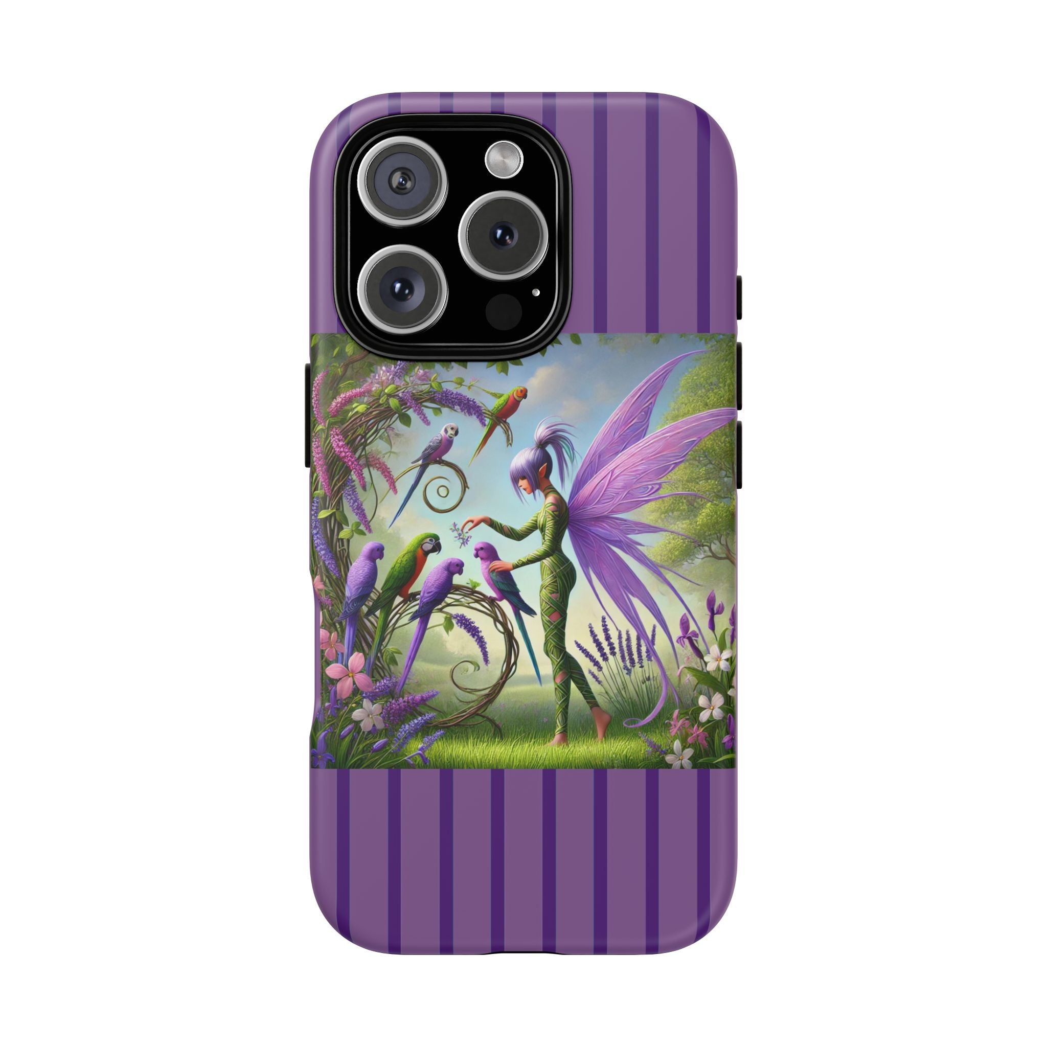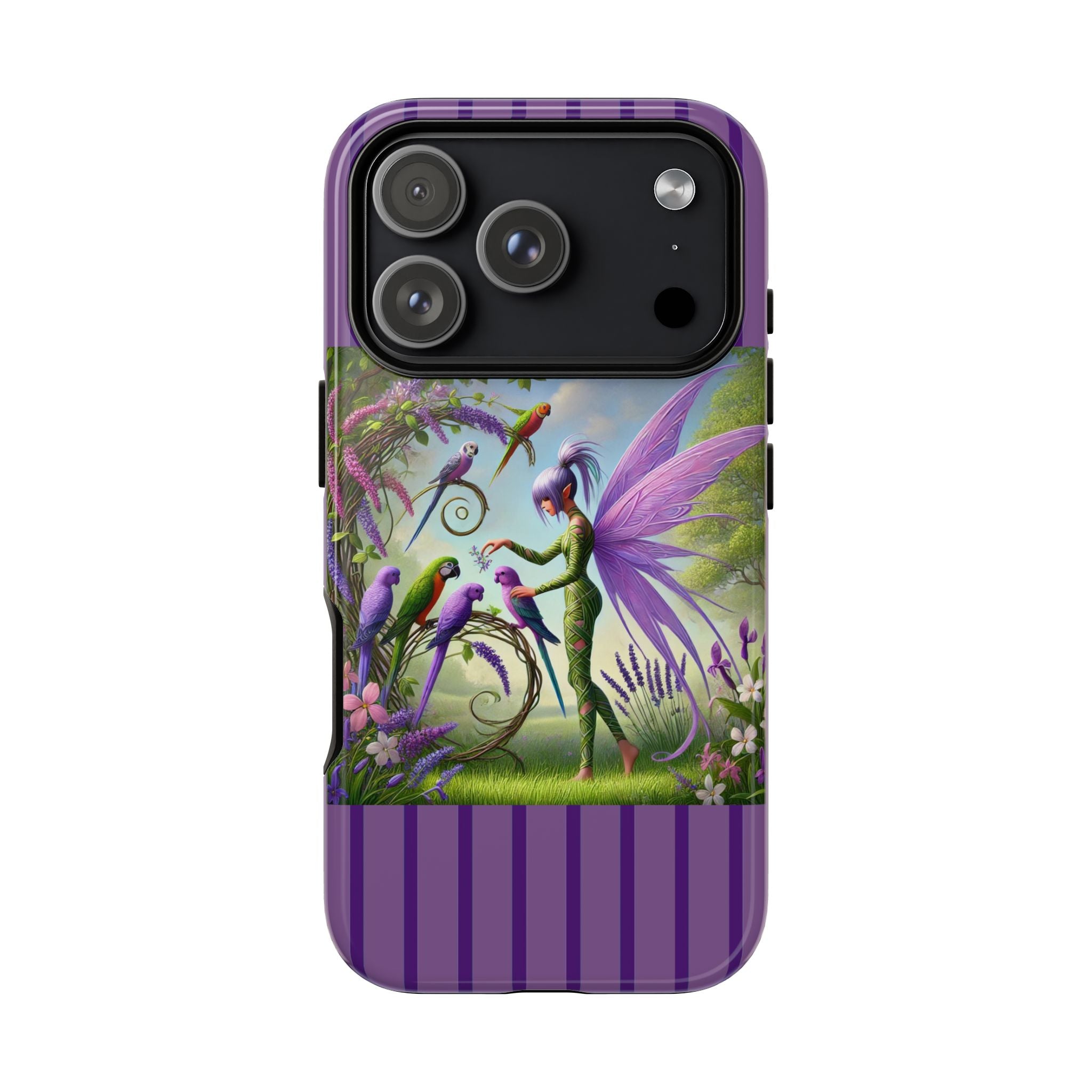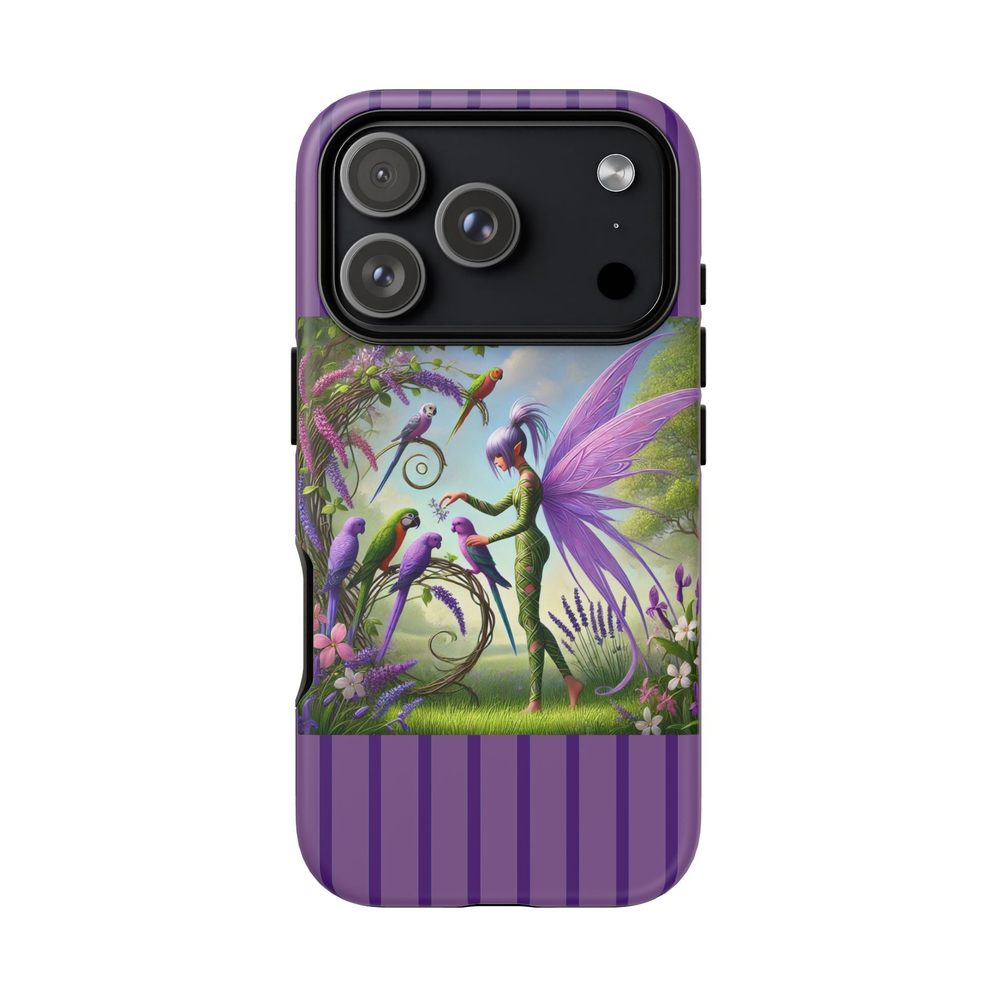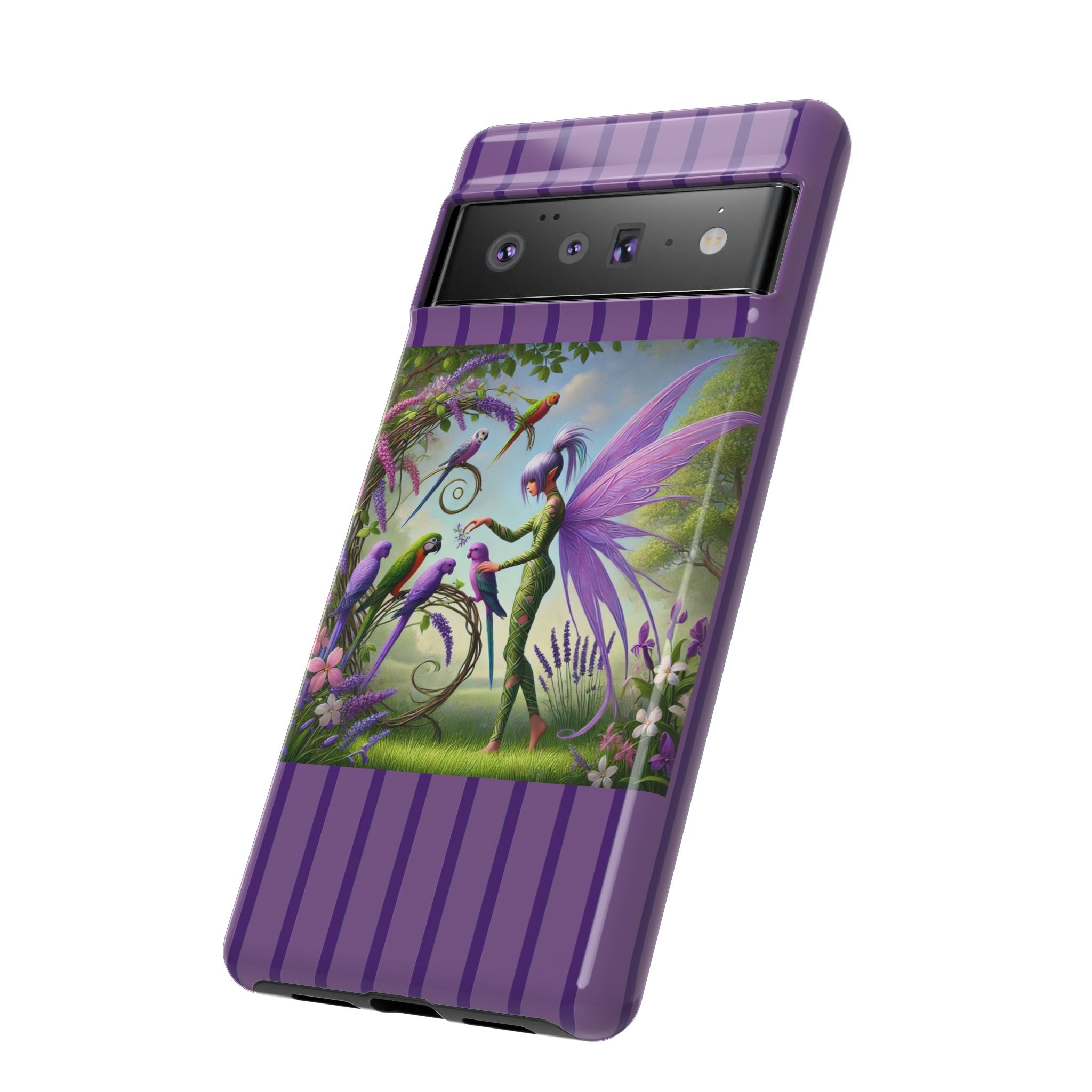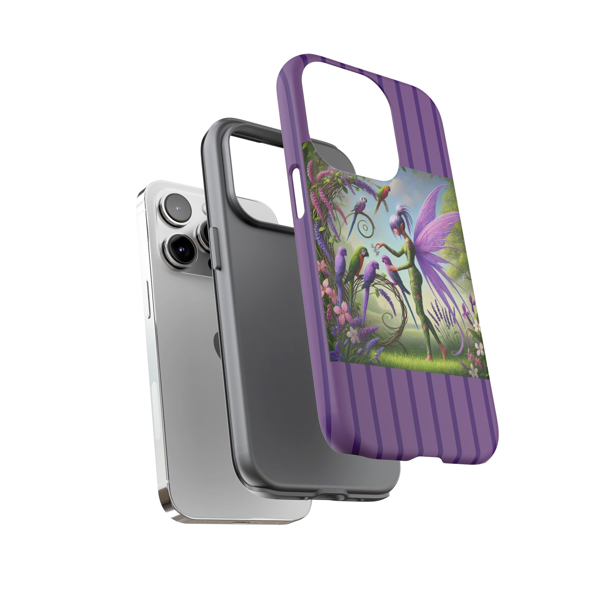 Lavender-Winged Fairy Phone Case transforms your phone into a scene of dreamy elegance and modern charm. Designed for iPhone, Samsung Galaxy, and Google Pixel devices, this case blends fine artistry with reliable protection. The design features a long, stylish fairy with shimmering lavender wings surrounded by vibrantly colored parrots under soft natural daylight. Lush greenery and blooms in shades of purple, pink, and white create an atmosphere of whimsy and freshness—capturing the magic of spring with contemporary sophistication. Choose a glossy or matte finish to bring this enchanting illustration to life while keeping your phone safe and stylish.