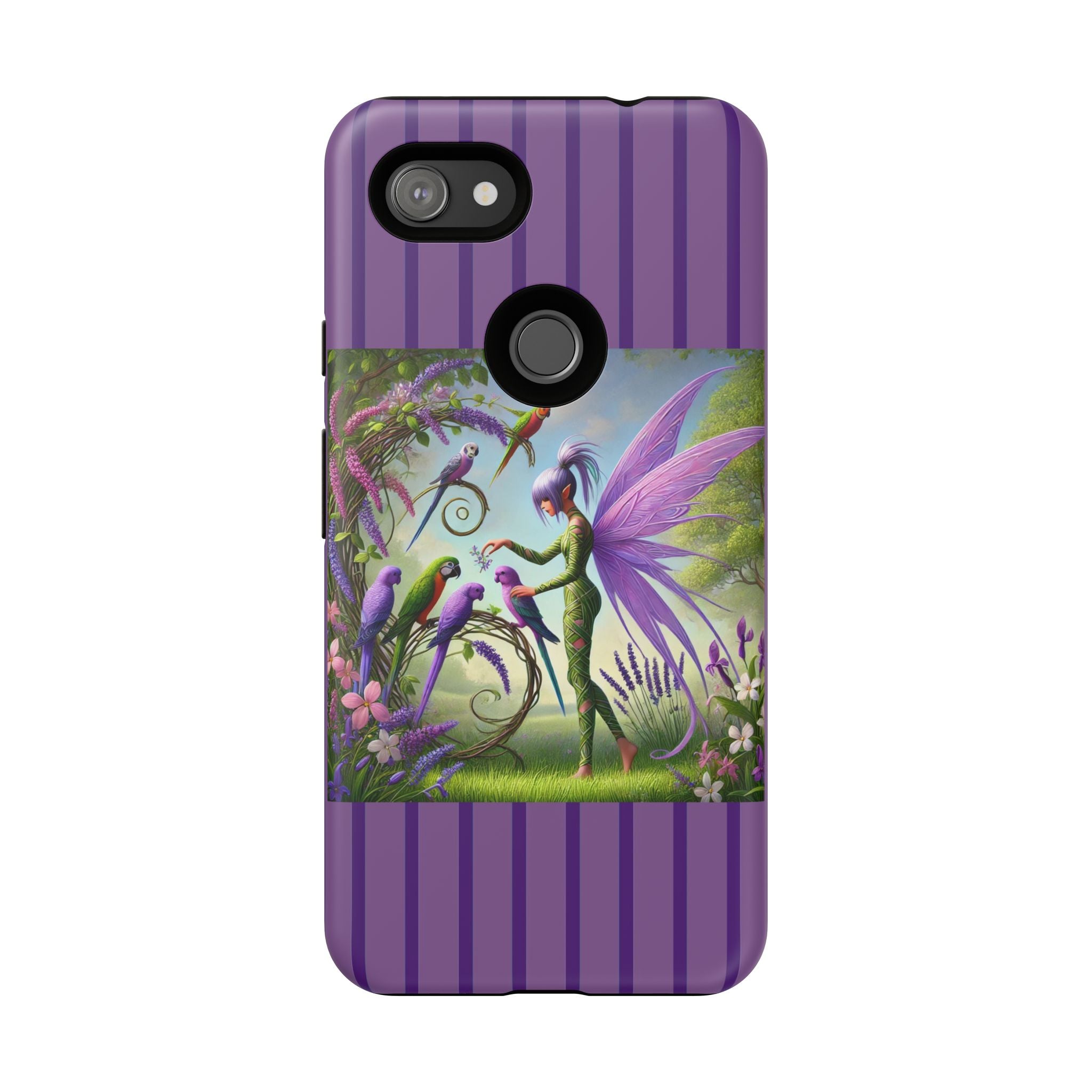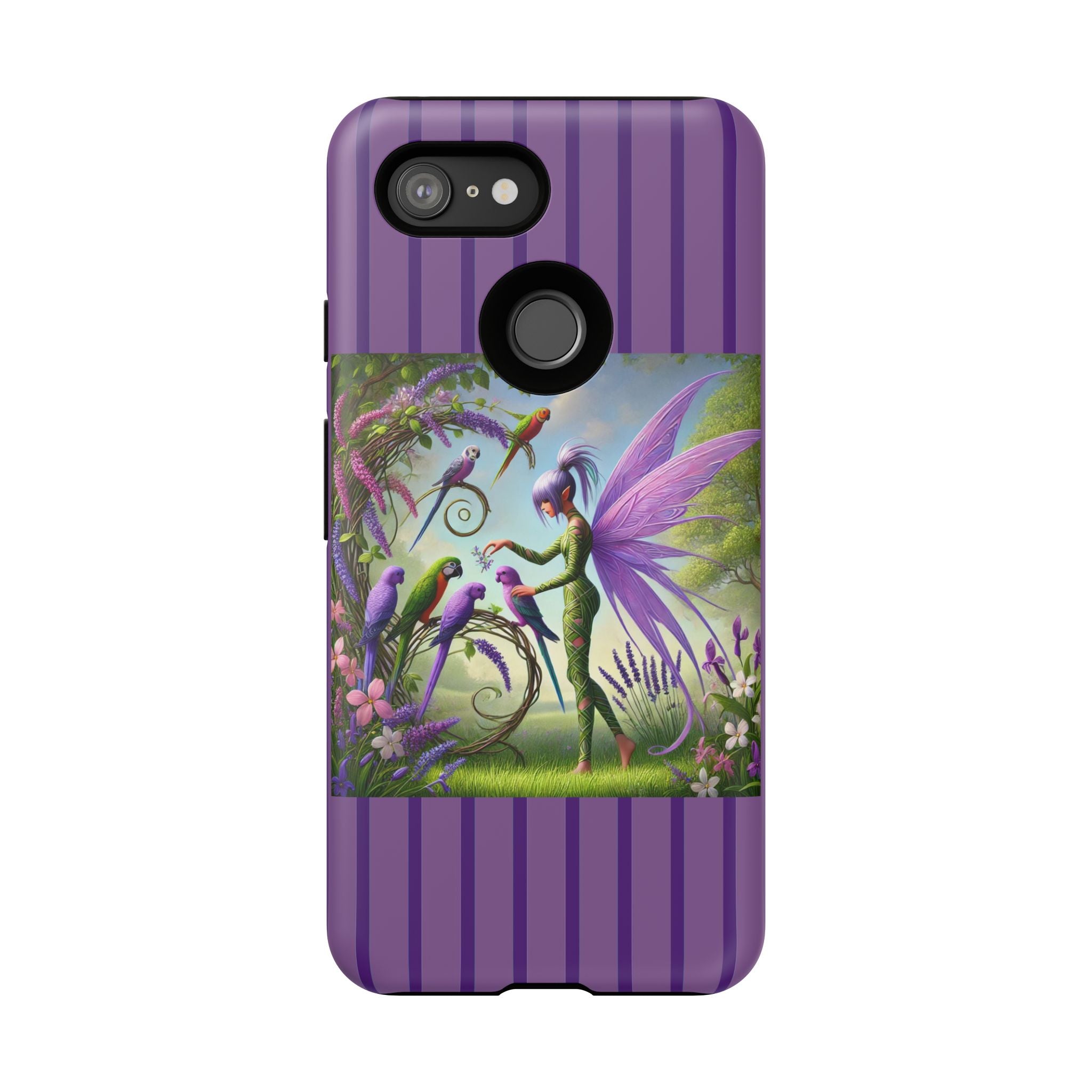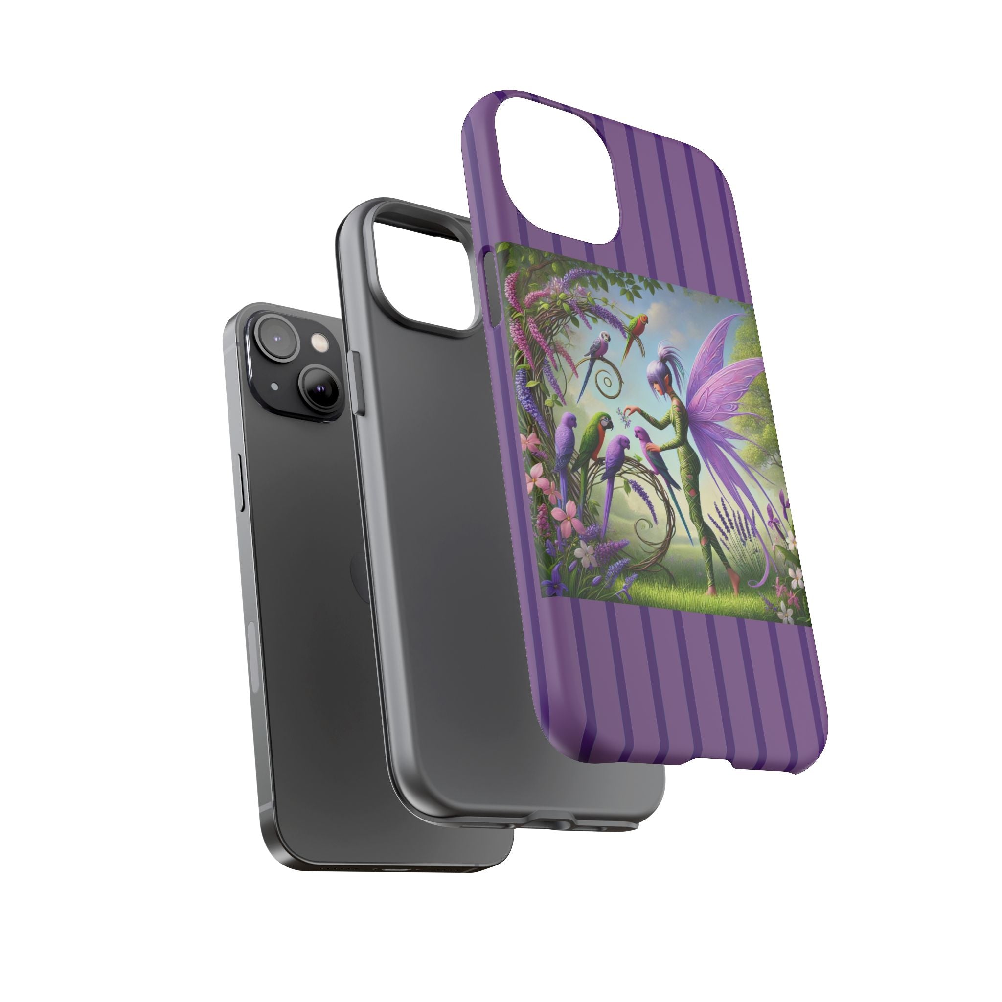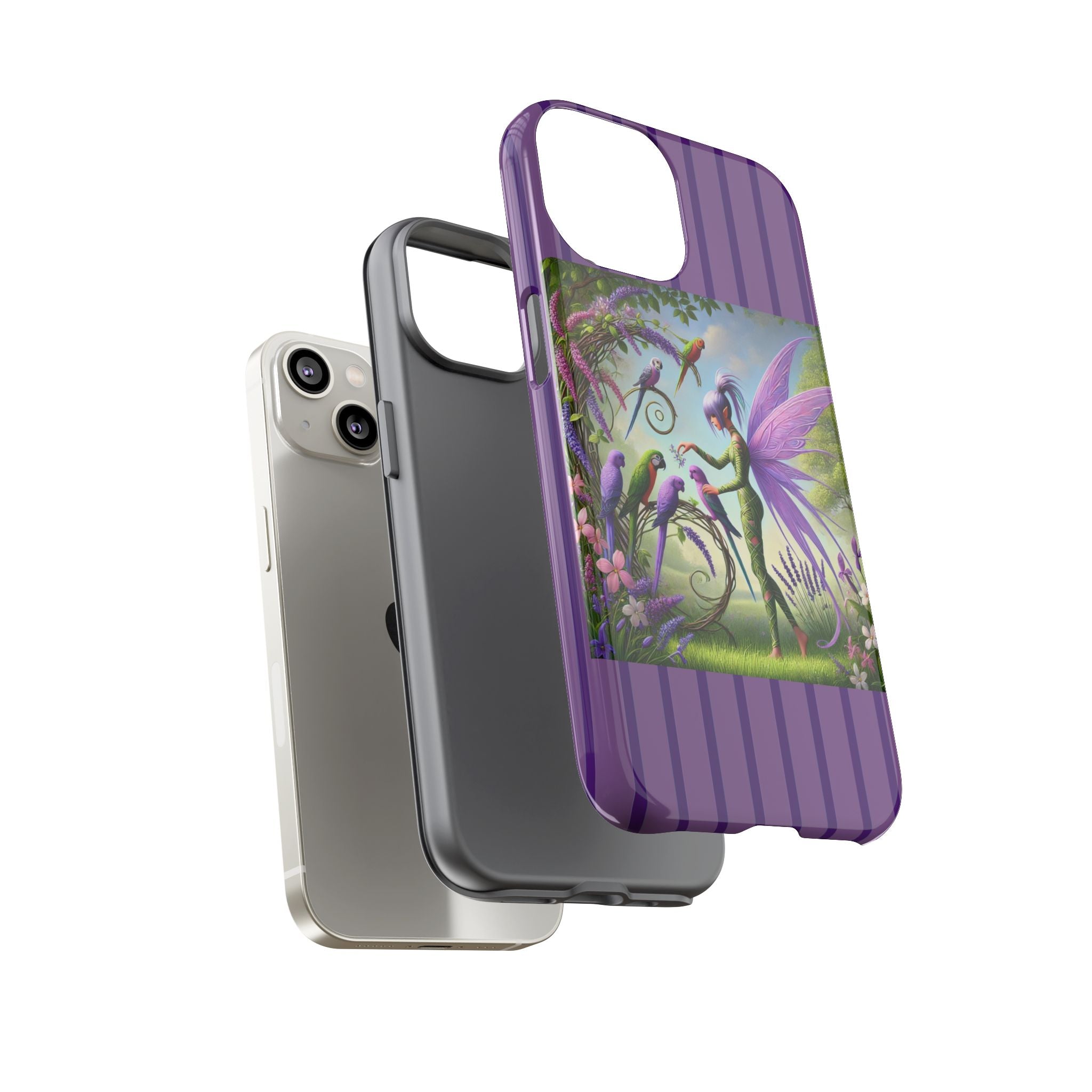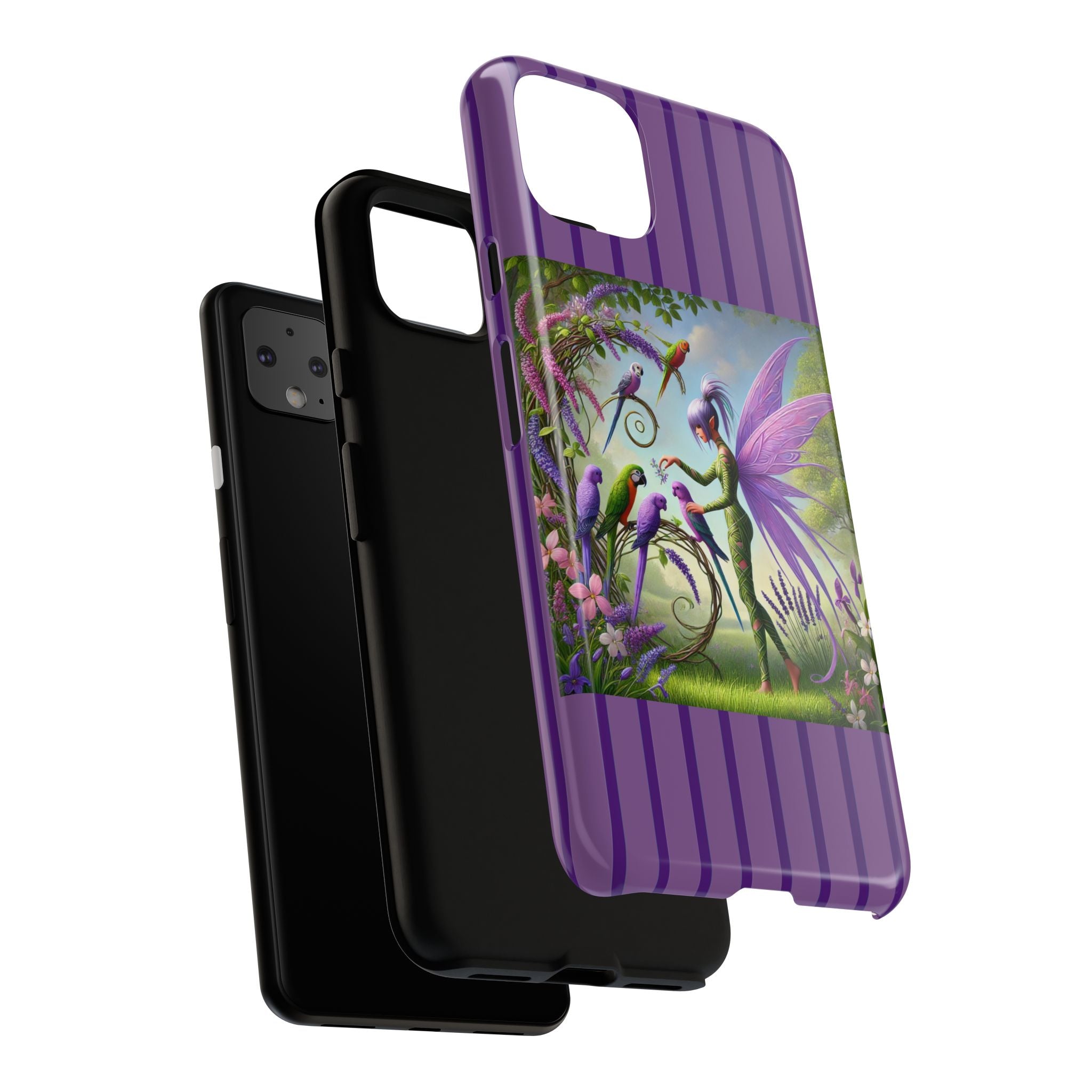 Lavender-Winged Fairy Phone Case transforms your phone into a scene of dreamy elegance and modern charm. Designed for iPhone, Samsung Galaxy, and Google Pixel devices, this case blends fine artistry with reliable protection. The design features a long, stylish fairy with shimmering lavender wings surrounded by vibrantly colored parrots under soft natural daylight. Lush greenery and blooms in shades of purple, pink, and white create an atmosphere of whimsy and freshness—capturing the magic of spring with contemporary sophistication. Choose a glossy or matte finish to bring this enchanting illustration to life while keeping your phone safe and stylish.