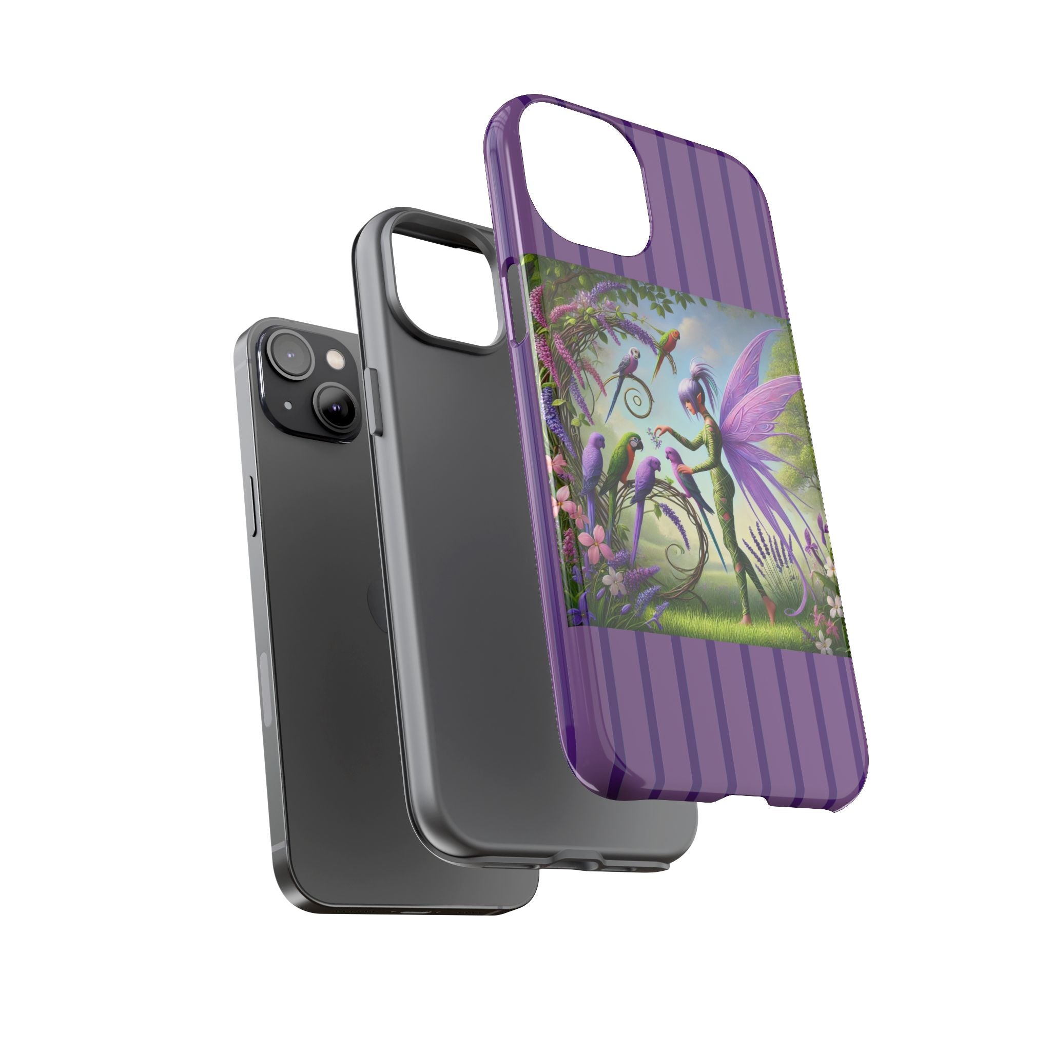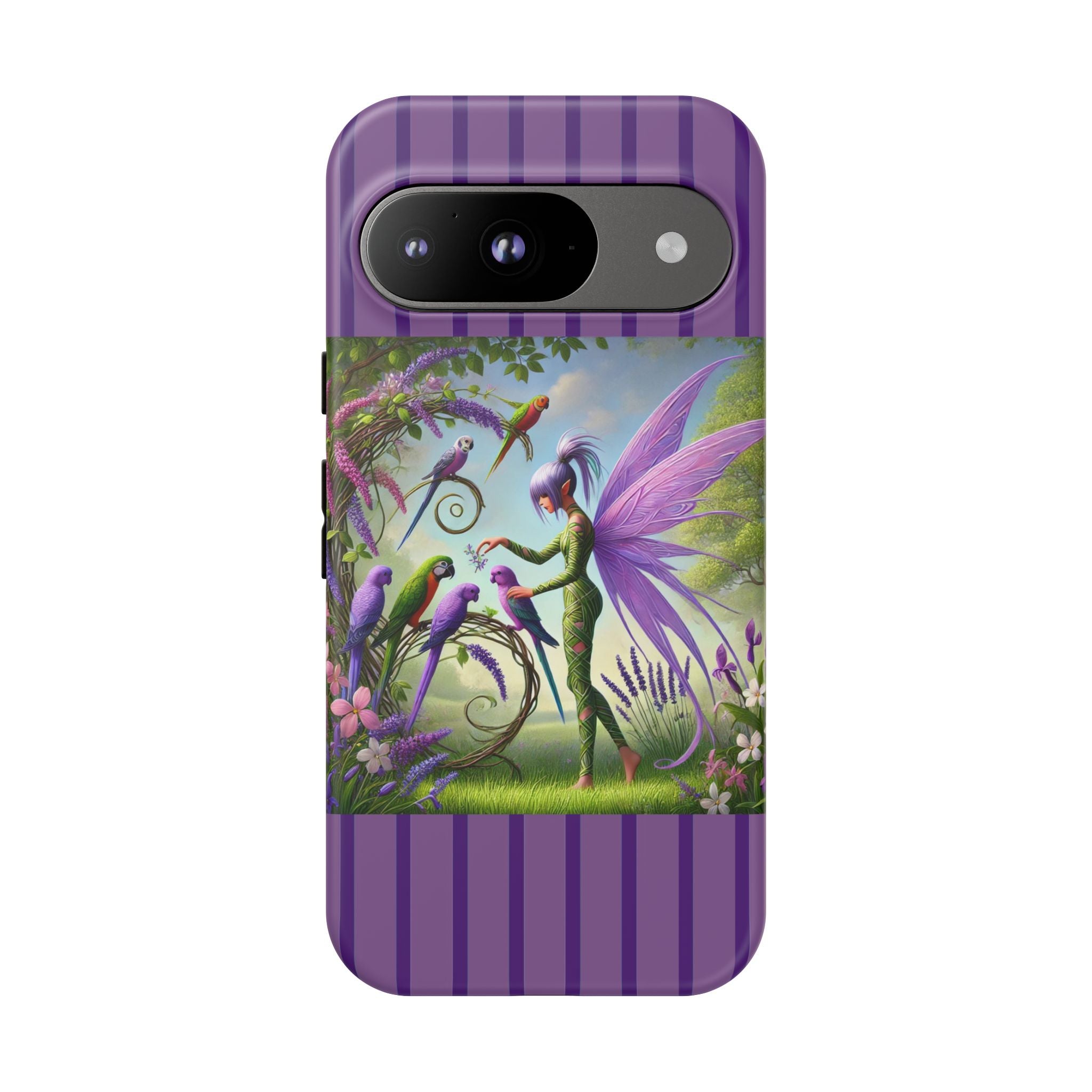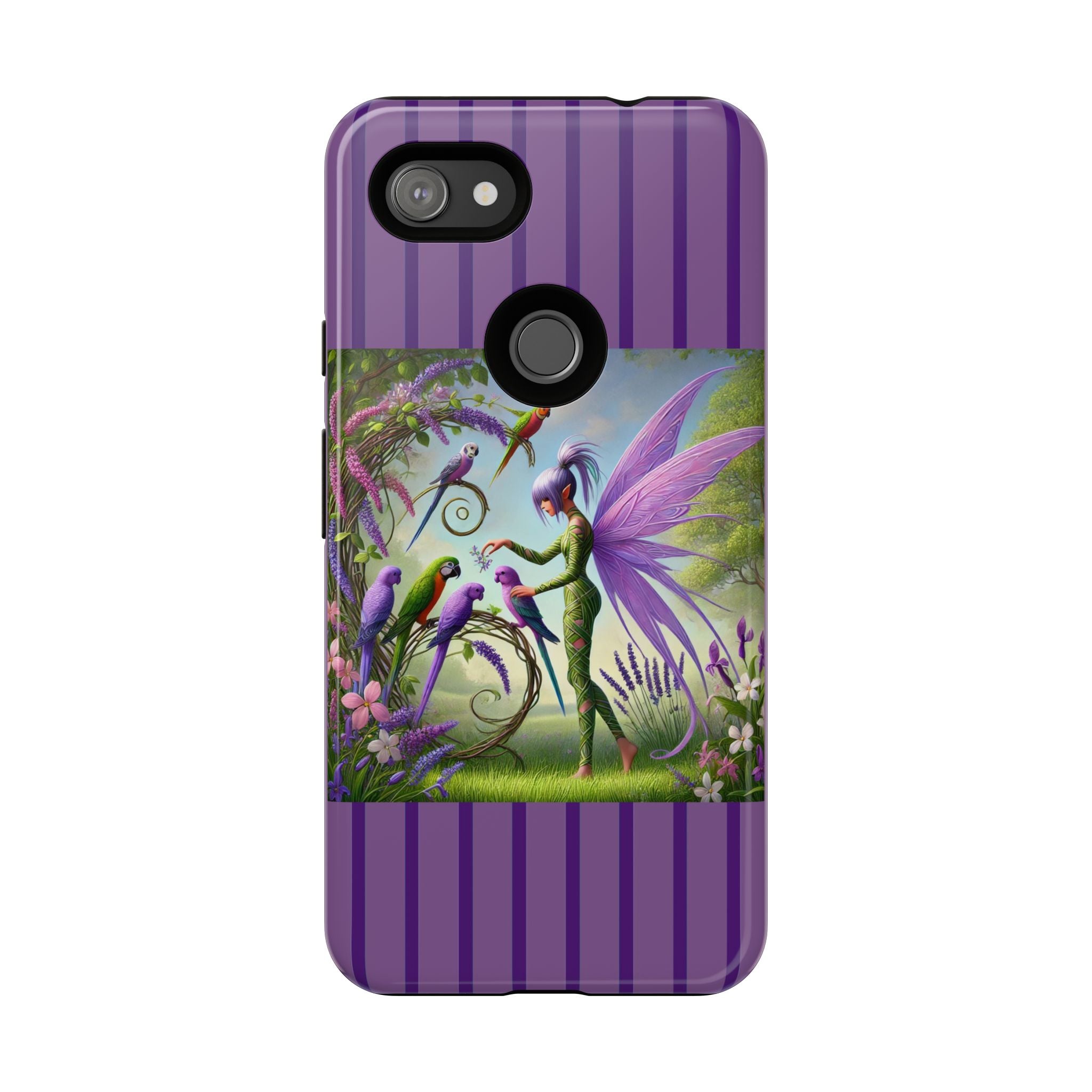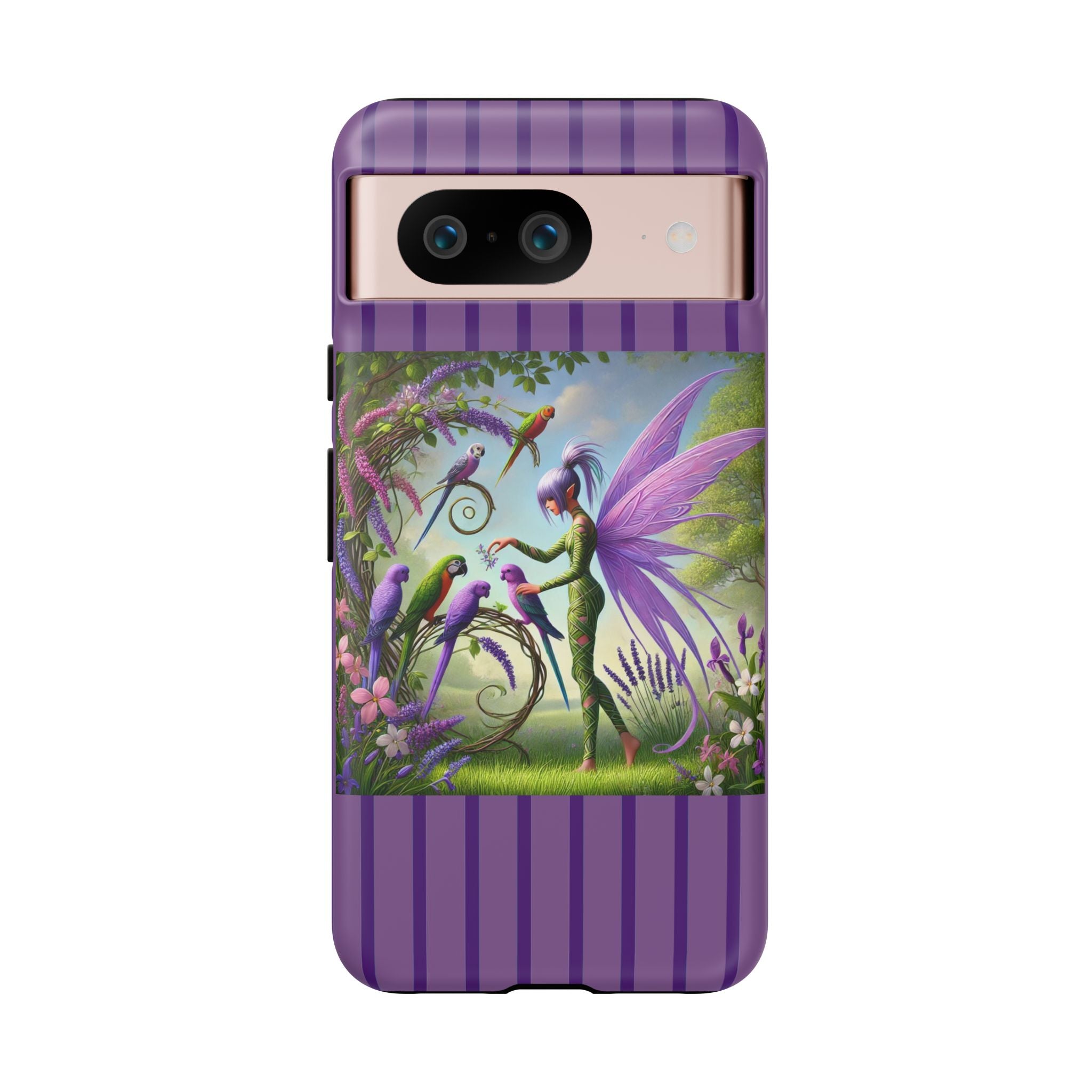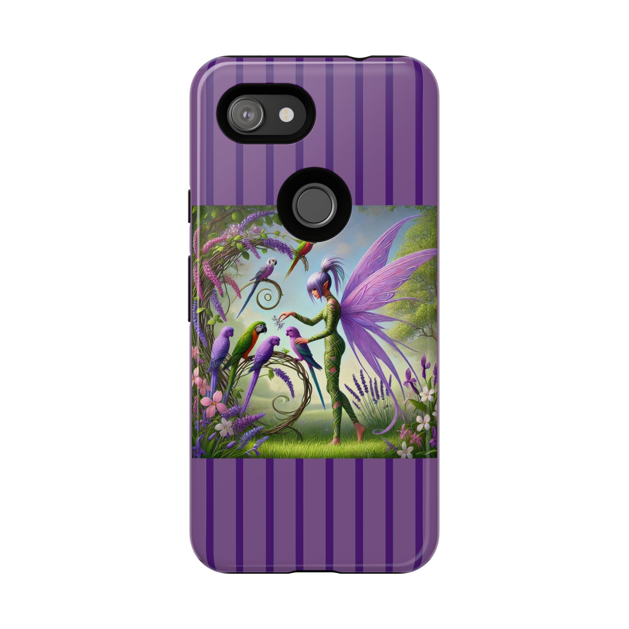 Lavender-Winged Fairy Phone Case transforms your phone into a scene of dreamy elegance and modern charm. Designed for iPhone, Samsung Galaxy, and Google Pixel devices, this case blends fine artistry with reliable protection. The design features a long, stylish fairy with shimmering lavender wings surrounded by vibrantly colored parrots under soft natural daylight. Lush greenery and blooms in shades of purple, pink, and white create an atmosphere of whimsy and freshness—capturing the magic of spring with contemporary sophistication. Choose a glossy or matte finish to bring this enchanting illustration to life while keeping your phone safe and stylish.