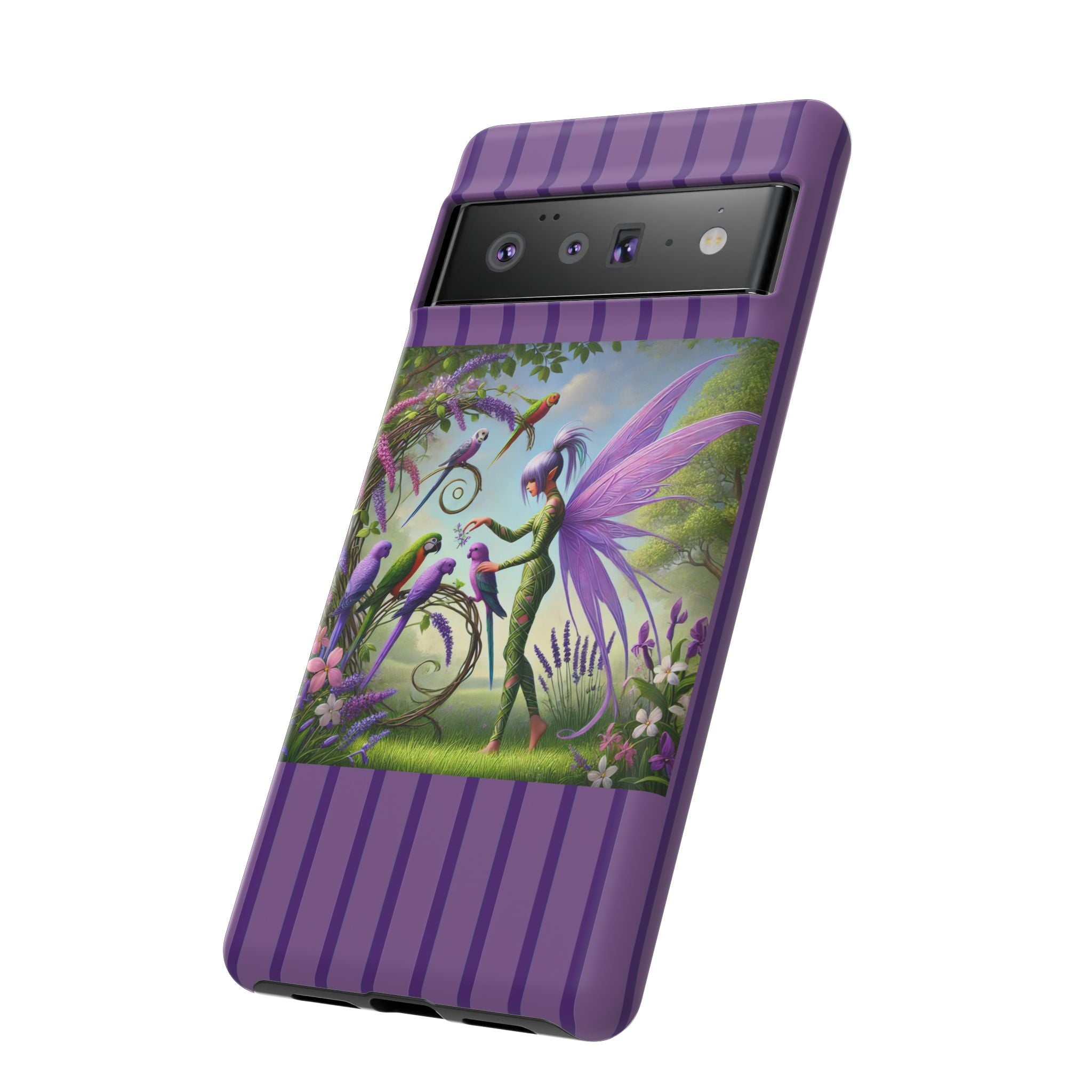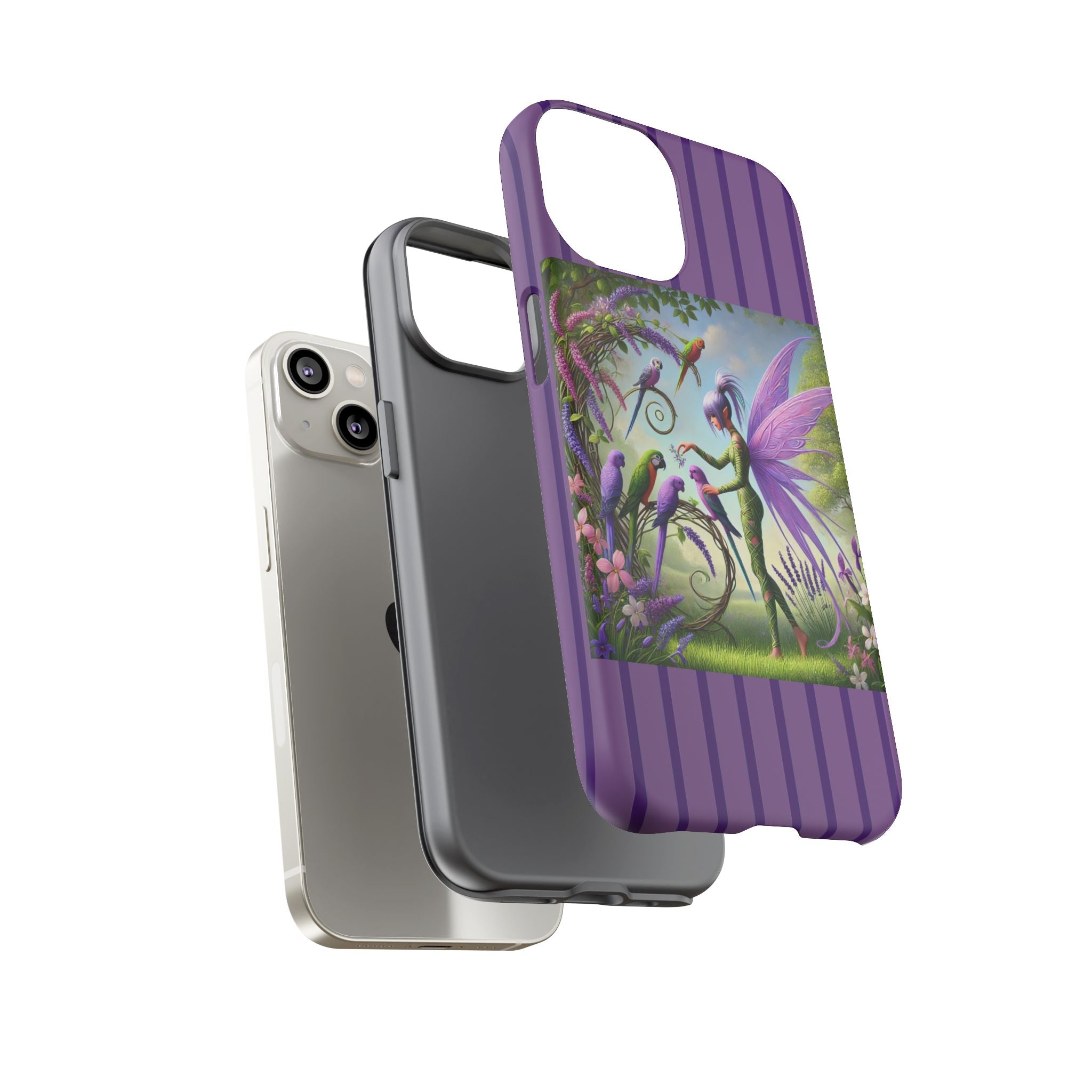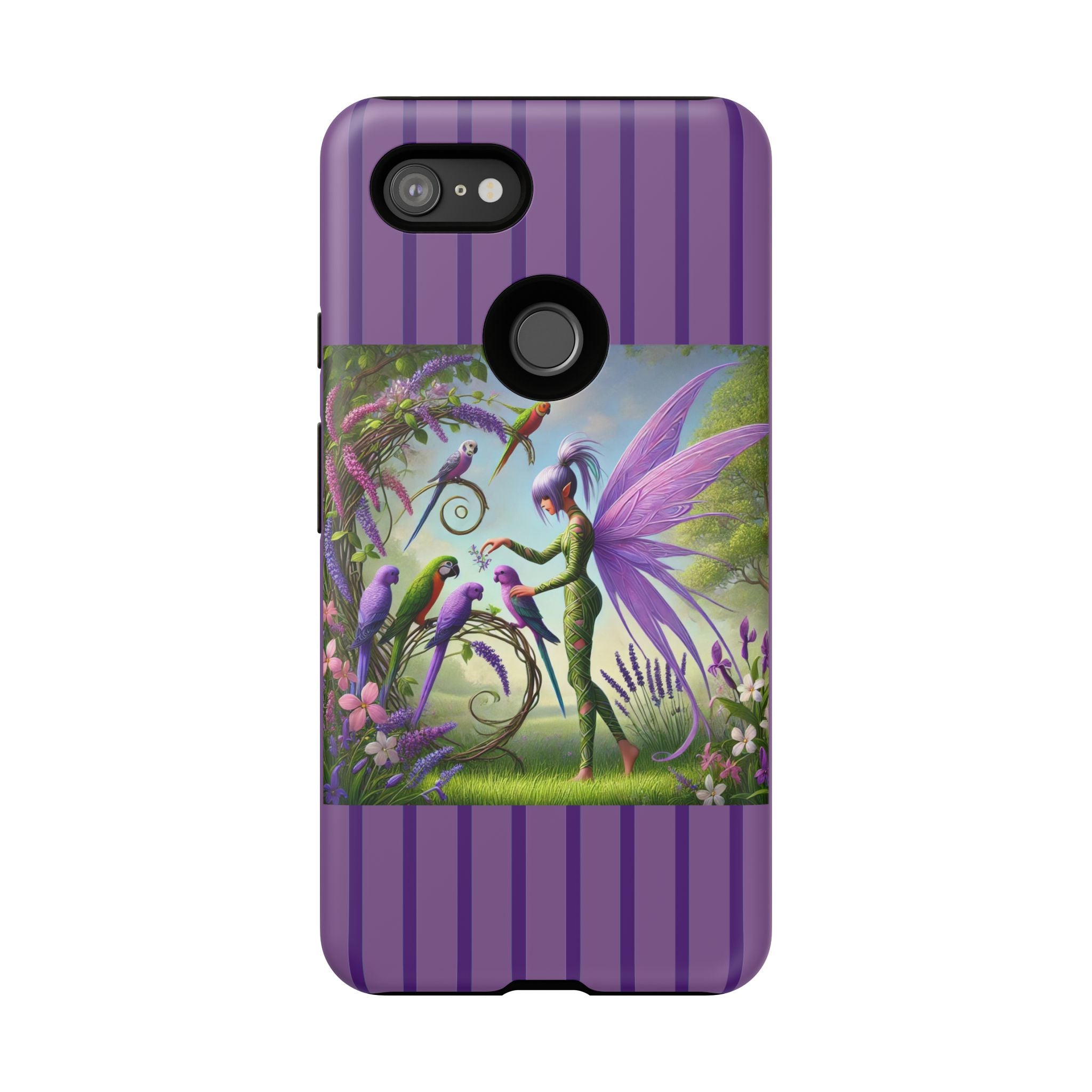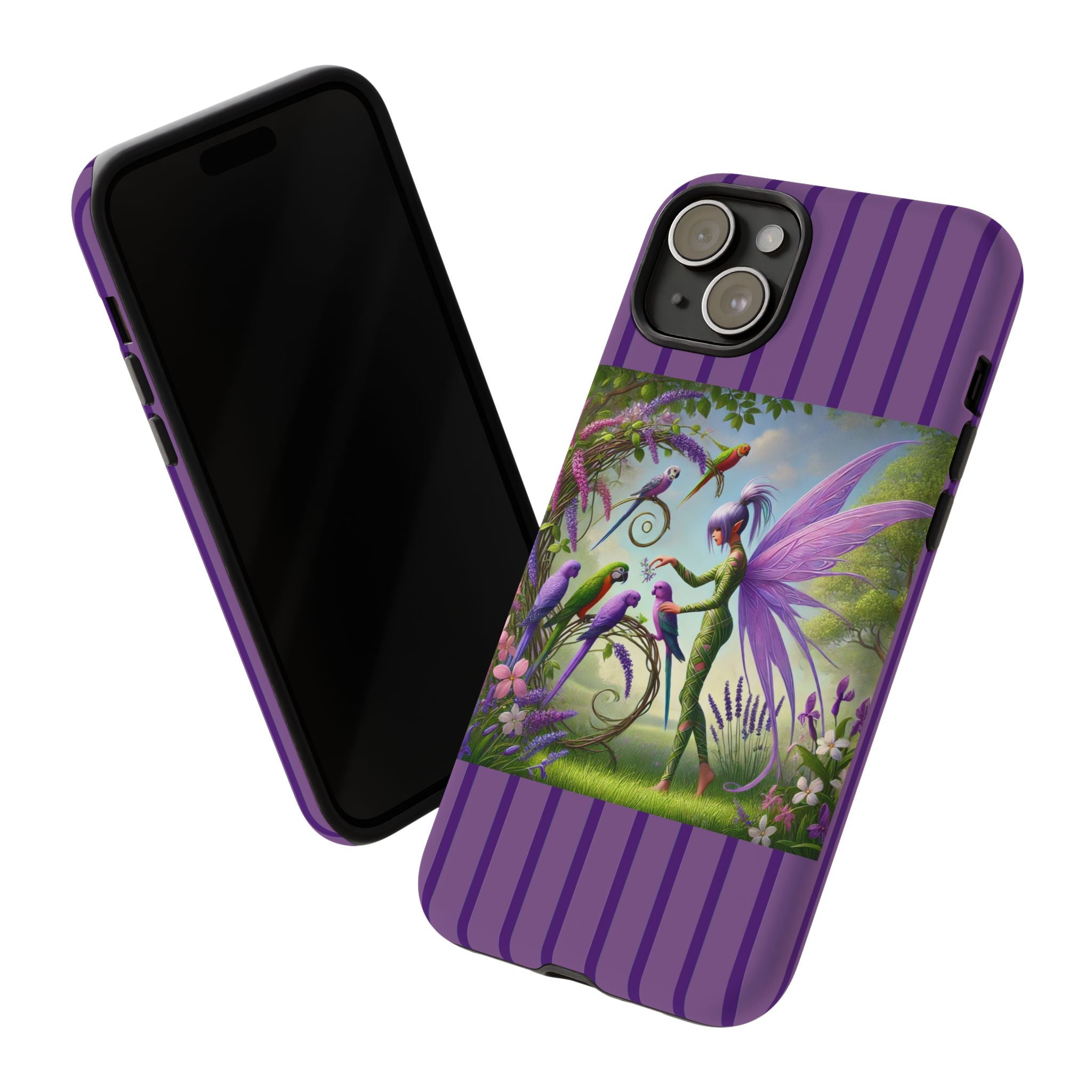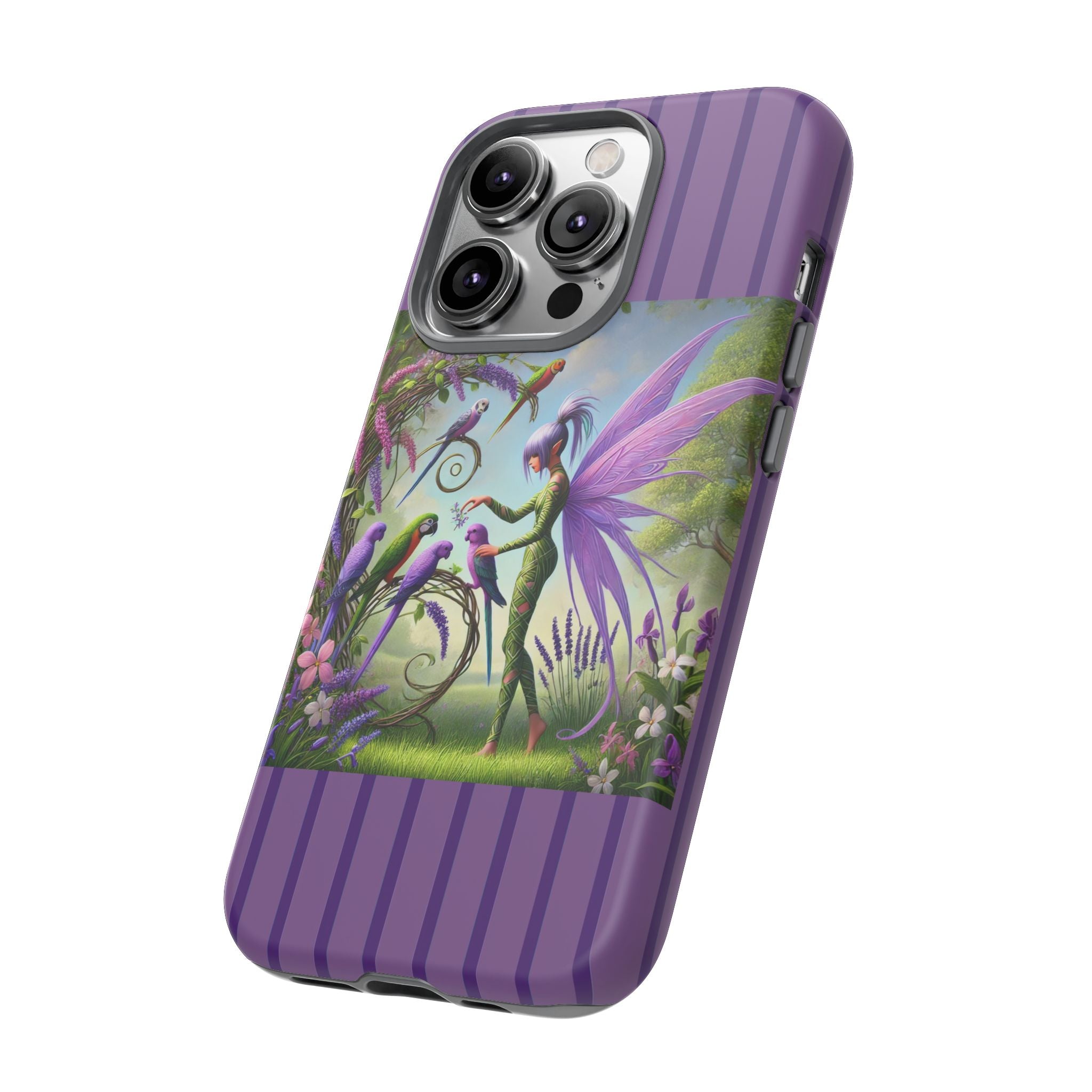 Lavender-Winged Fairy Phone Case transforms your phone into a scene of dreamy elegance and modern charm. Designed for iPhone, Samsung Galaxy, and Google Pixel devices, this case blends fine artistry with reliable protection. The design features a long, stylish fairy with shimmering lavender wings surrounded by vibrantly colored parrots under soft natural daylight. Lush greenery and blooms in shades of purple, pink, and white create an atmosphere of whimsy and freshness—capturing the magic of spring with contemporary sophistication. Choose a glossy or matte finish to bring this enchanting illustration to life while keeping your phone safe and stylish.