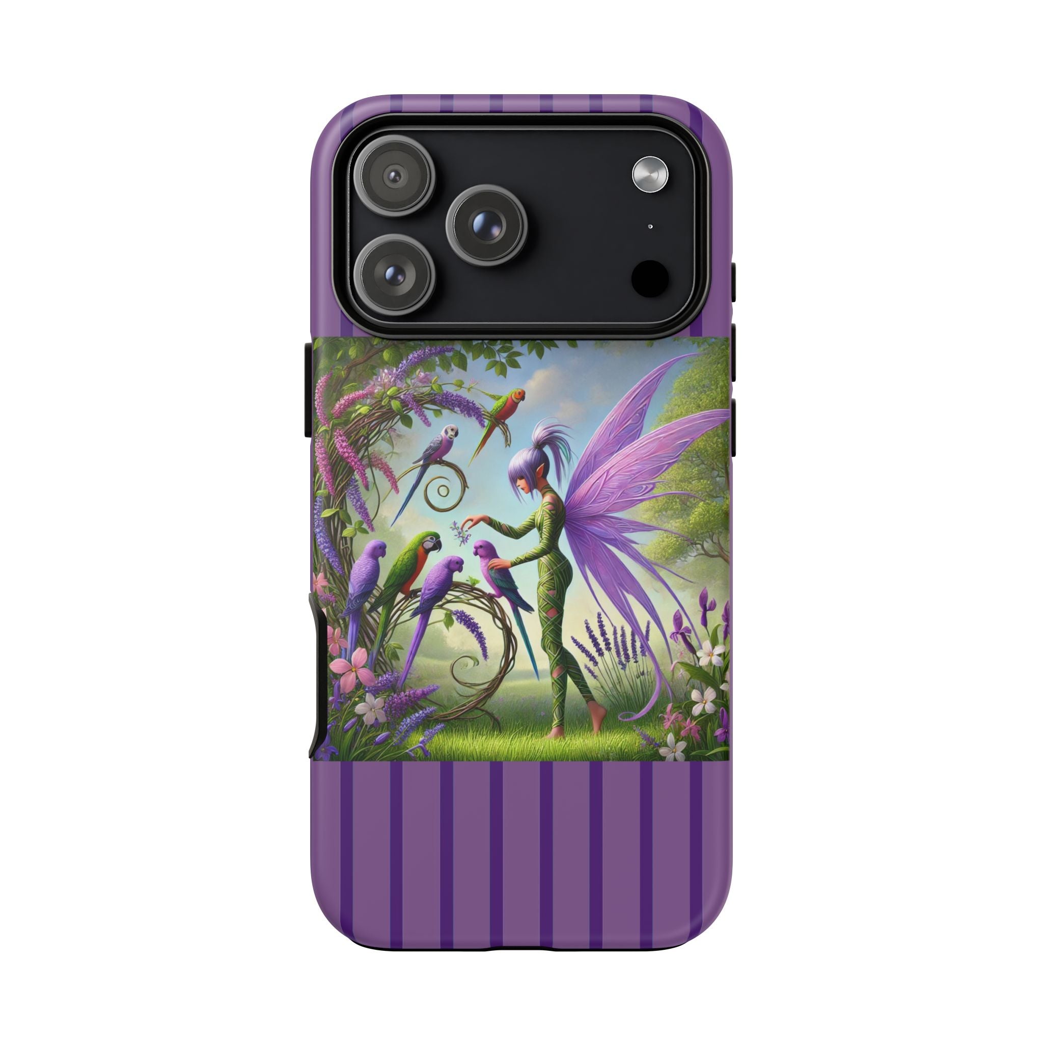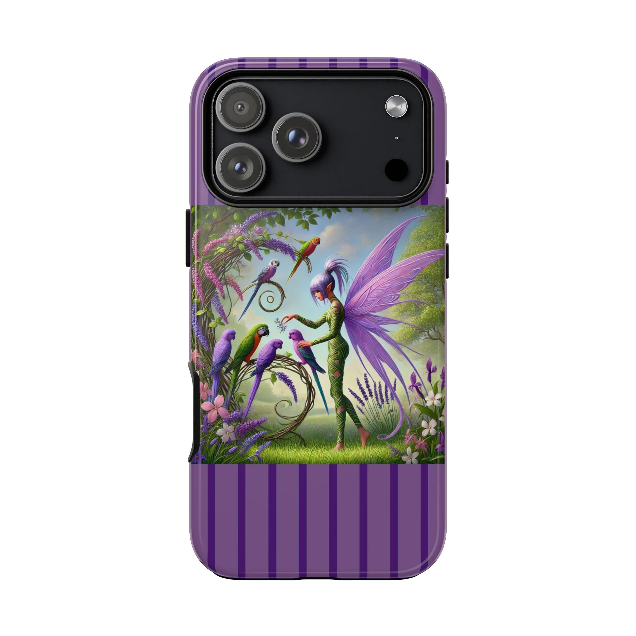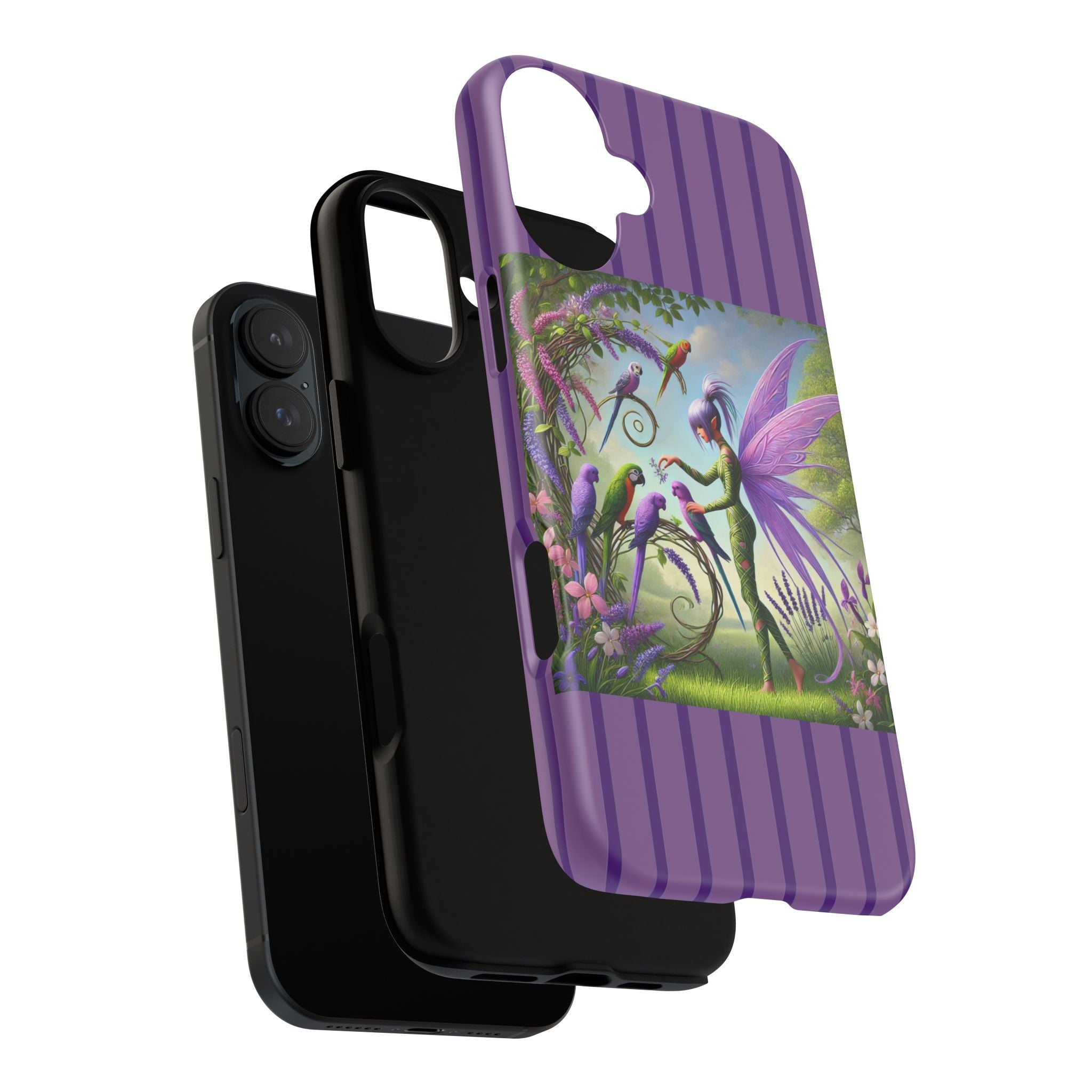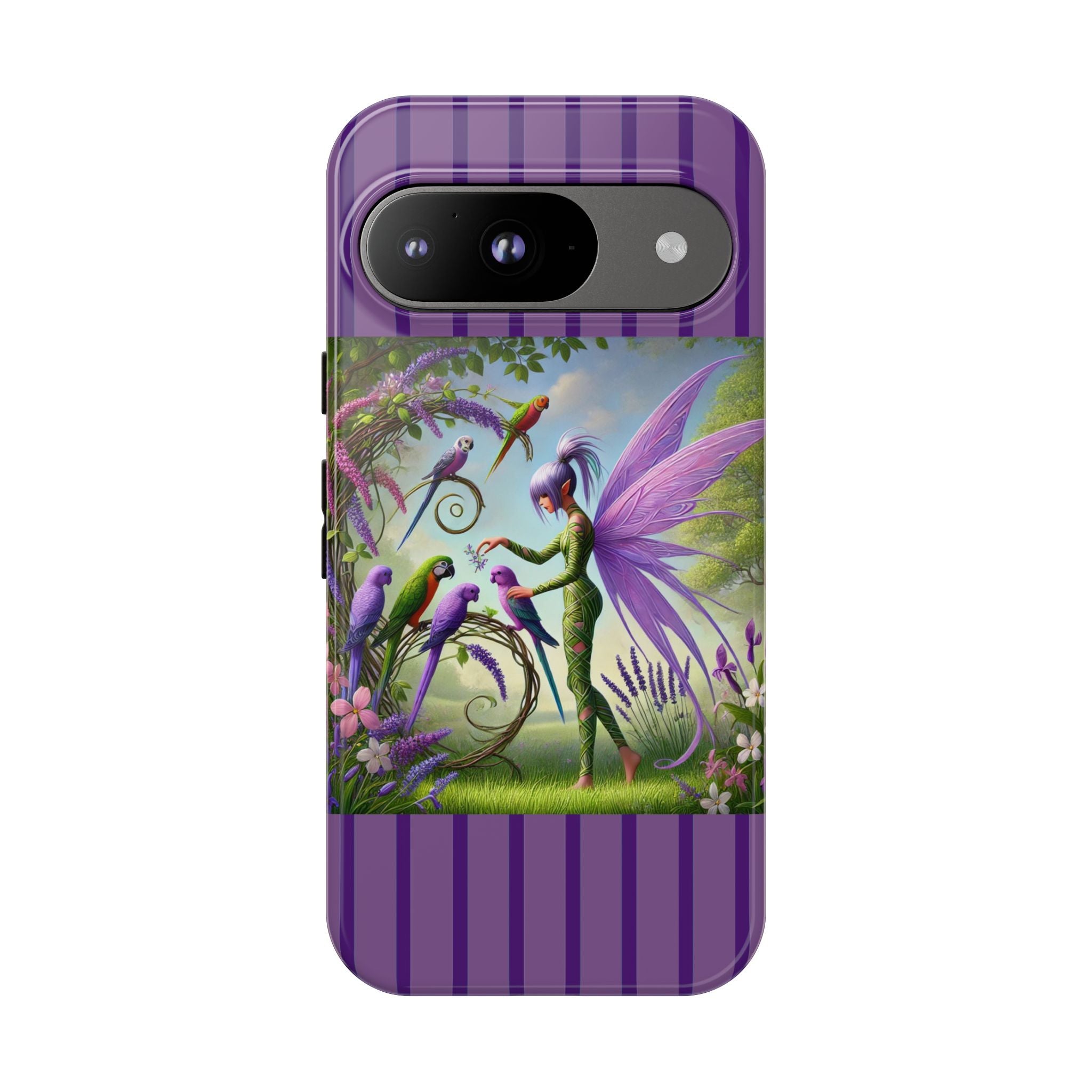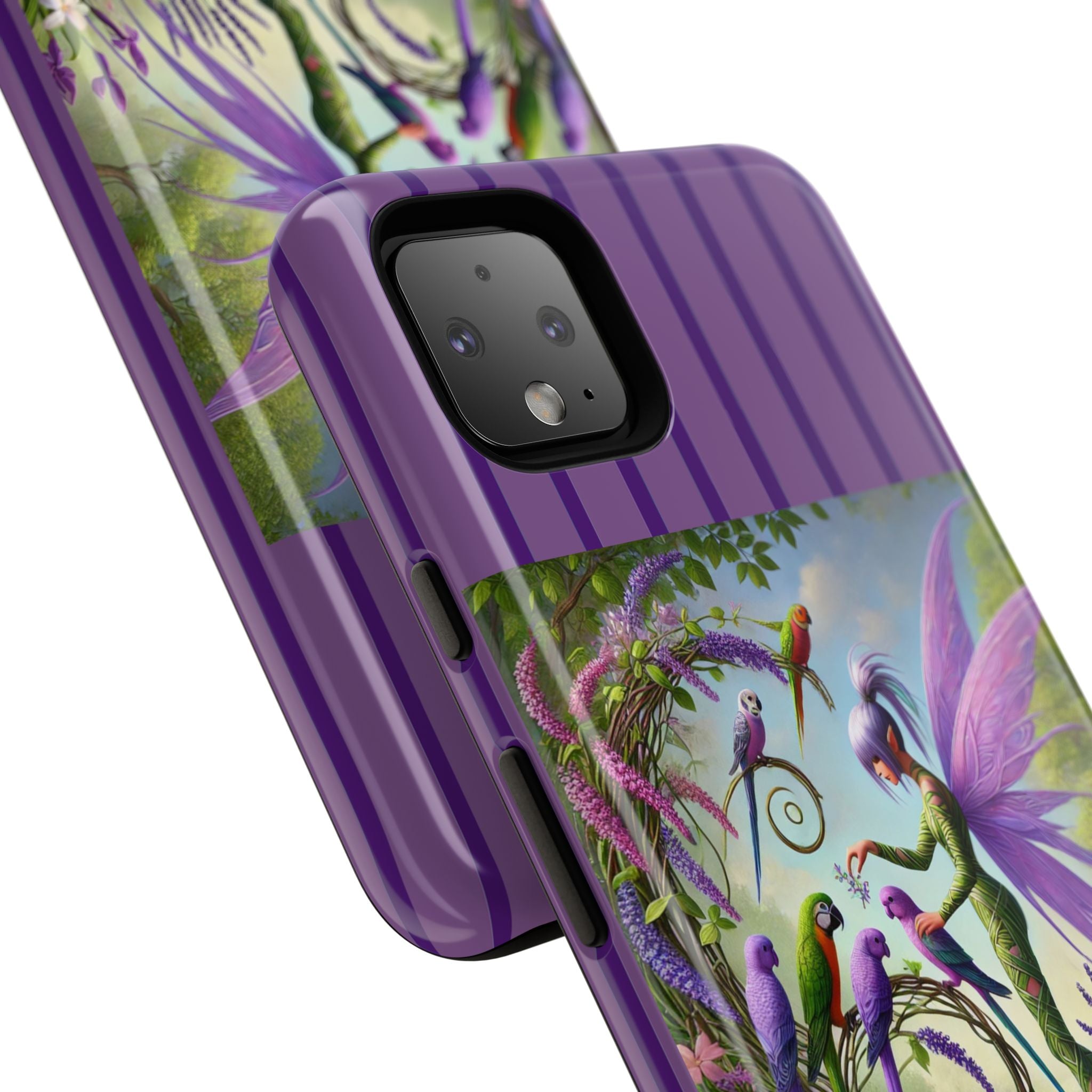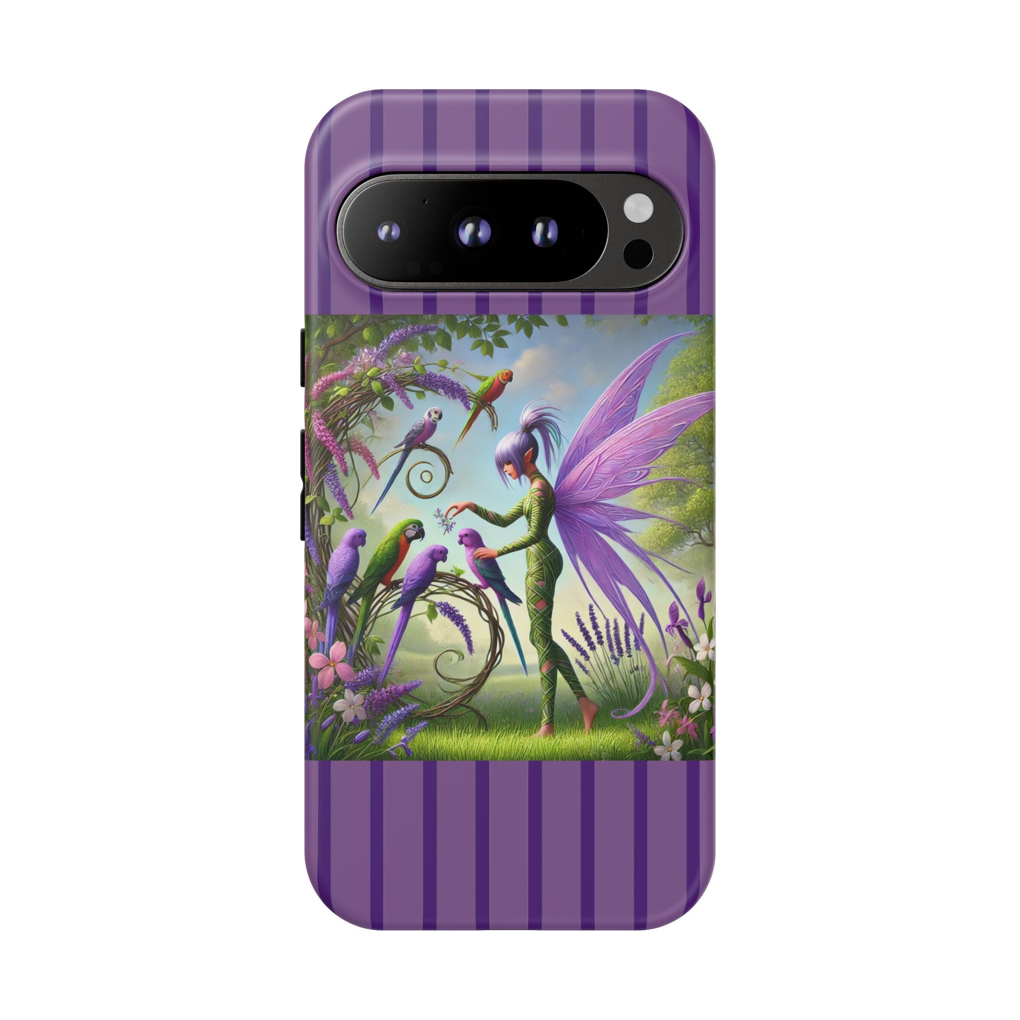Lavender-Winged Fairy Phone Case transforms your phone into a scene of dreamy elegance and modern charm. Designed for iPhone, Samsung Galaxy, and Google Pixel devices, this case blends fine artistry with reliable protection. The design features a long, stylish fairy with shimmering lavender wings surrounded by vibrantly colored parrots under soft natural daylight. Lush greenery and blooms in shades of purple, pink, and white create an atmosphere of whimsy and freshness—capturing the magic of spring with contemporary sophistication. Choose a glossy or matte finish to bring this enchanting illustration to life while keeping your phone safe and stylish.