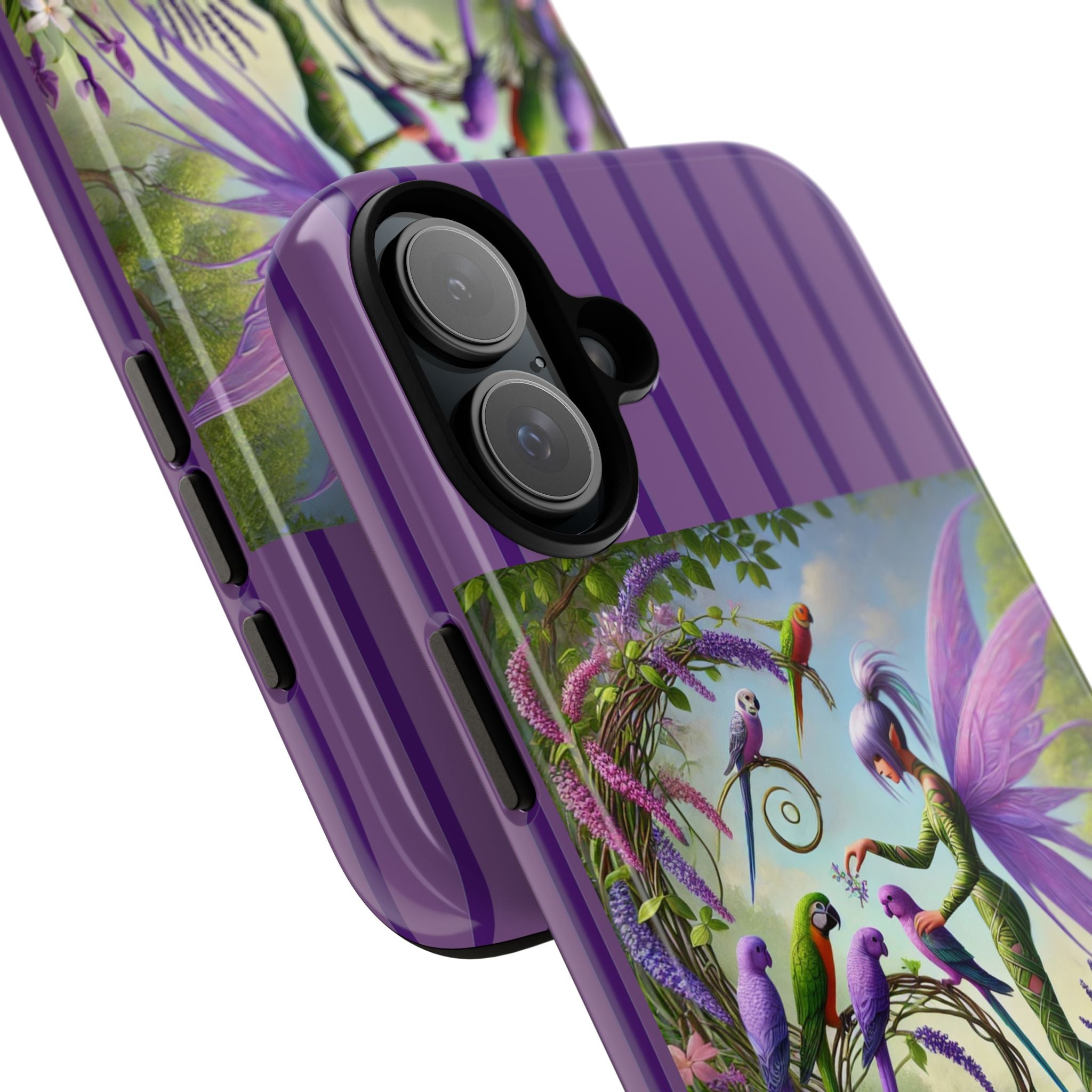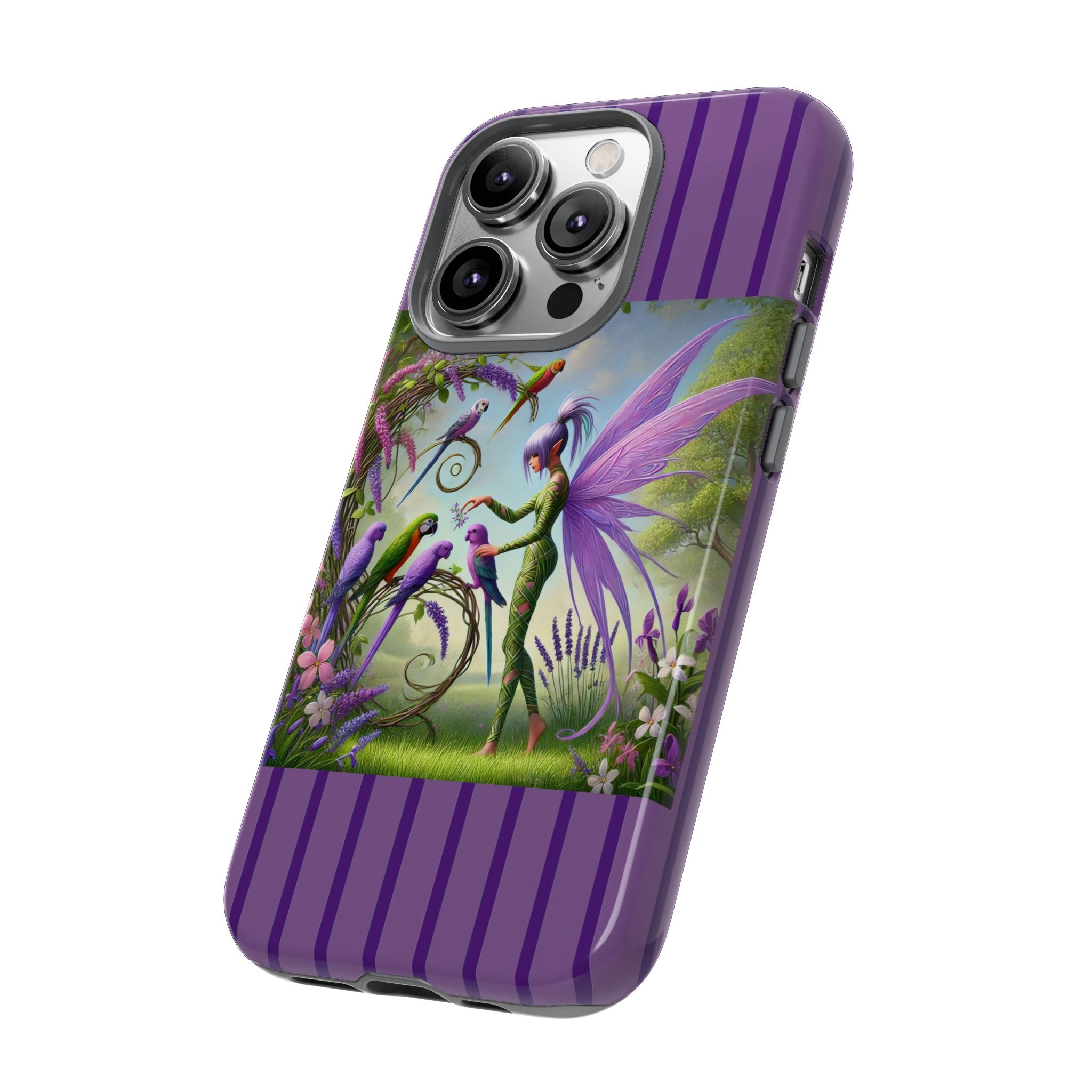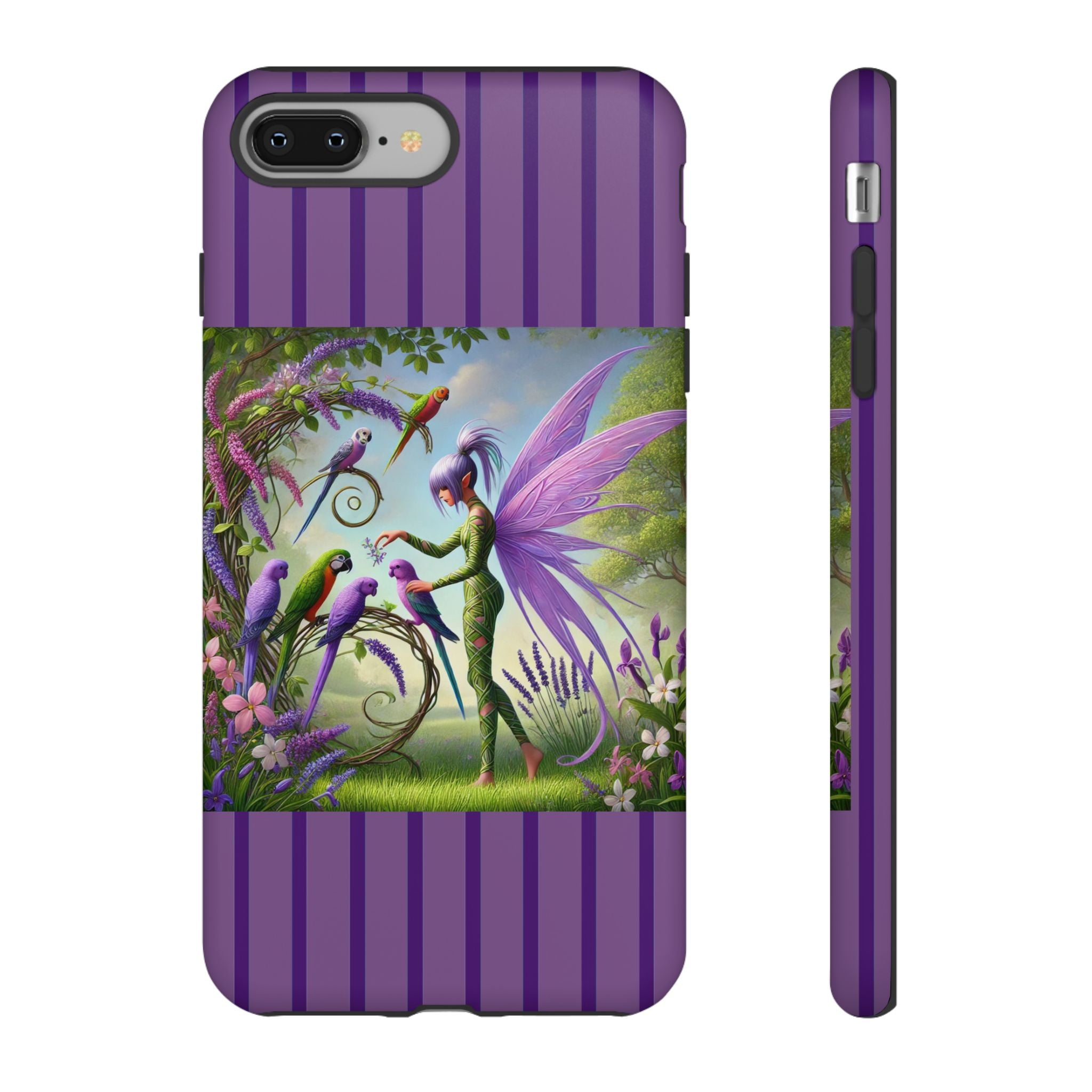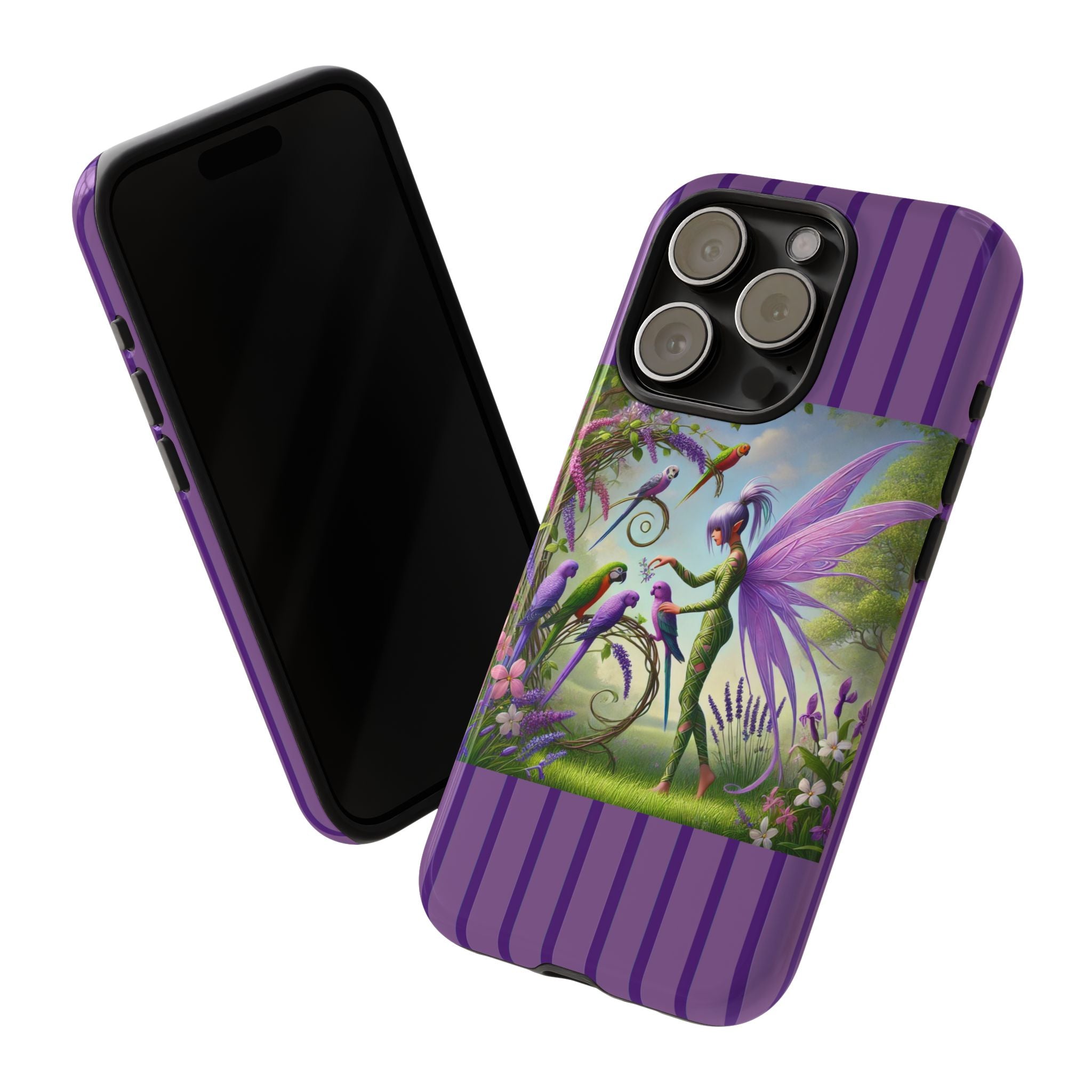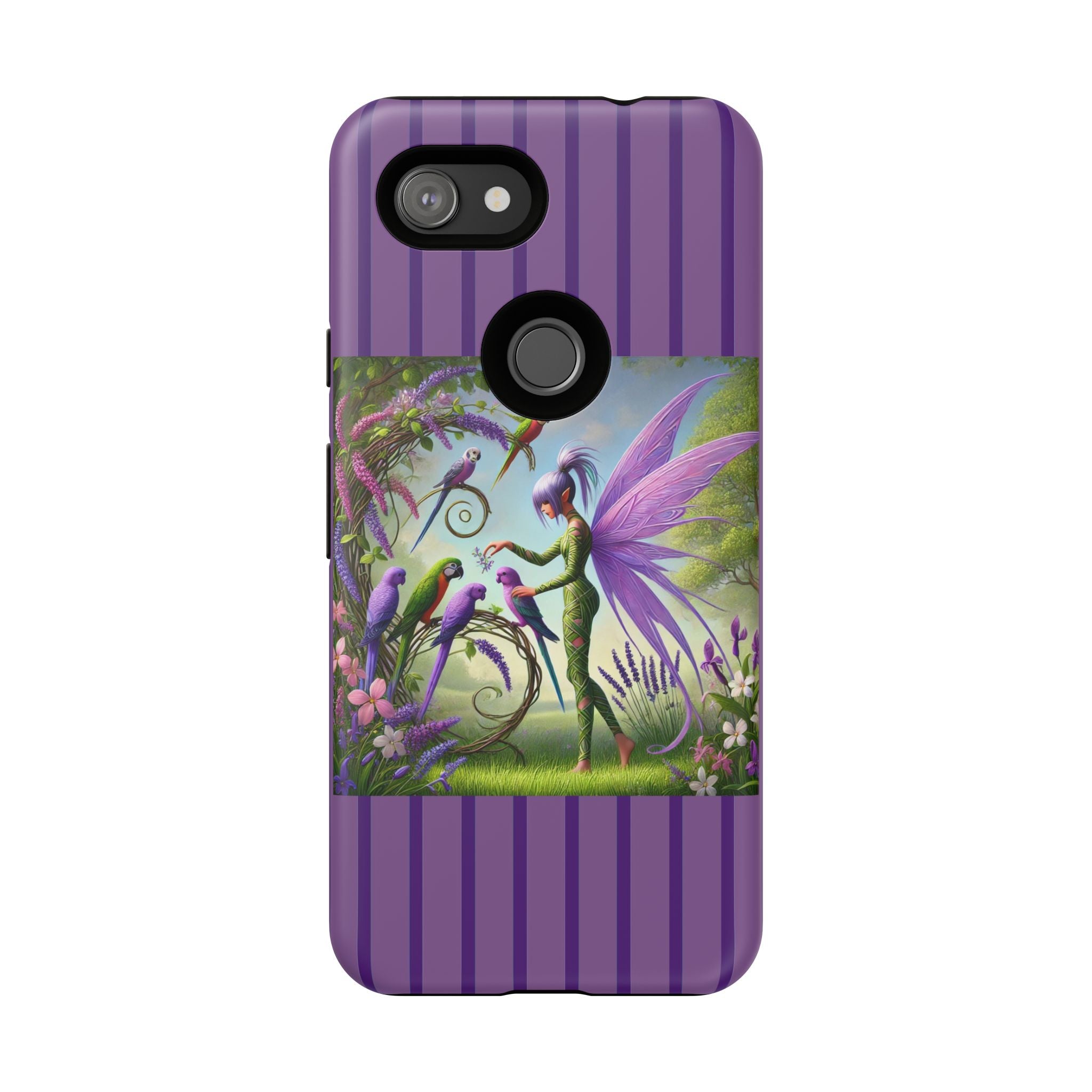 Lavender-Winged Fairy Phone Case transforms your phone into a scene of dreamy elegance and modern charm. Designed for iPhone, Samsung Galaxy, and Google Pixel devices, this case blends fine artistry with reliable protection. The design features a long, stylish fairy with shimmering lavender wings surrounded by vibrantly colored parrots under soft natural daylight. Lush greenery and blooms in shades of purple, pink, and white create an atmosphere of whimsy and freshness—capturing the magic of spring with contemporary sophistication. Choose a glossy or matte finish to bring this enchanting illustration to life while keeping your phone safe and stylish.
