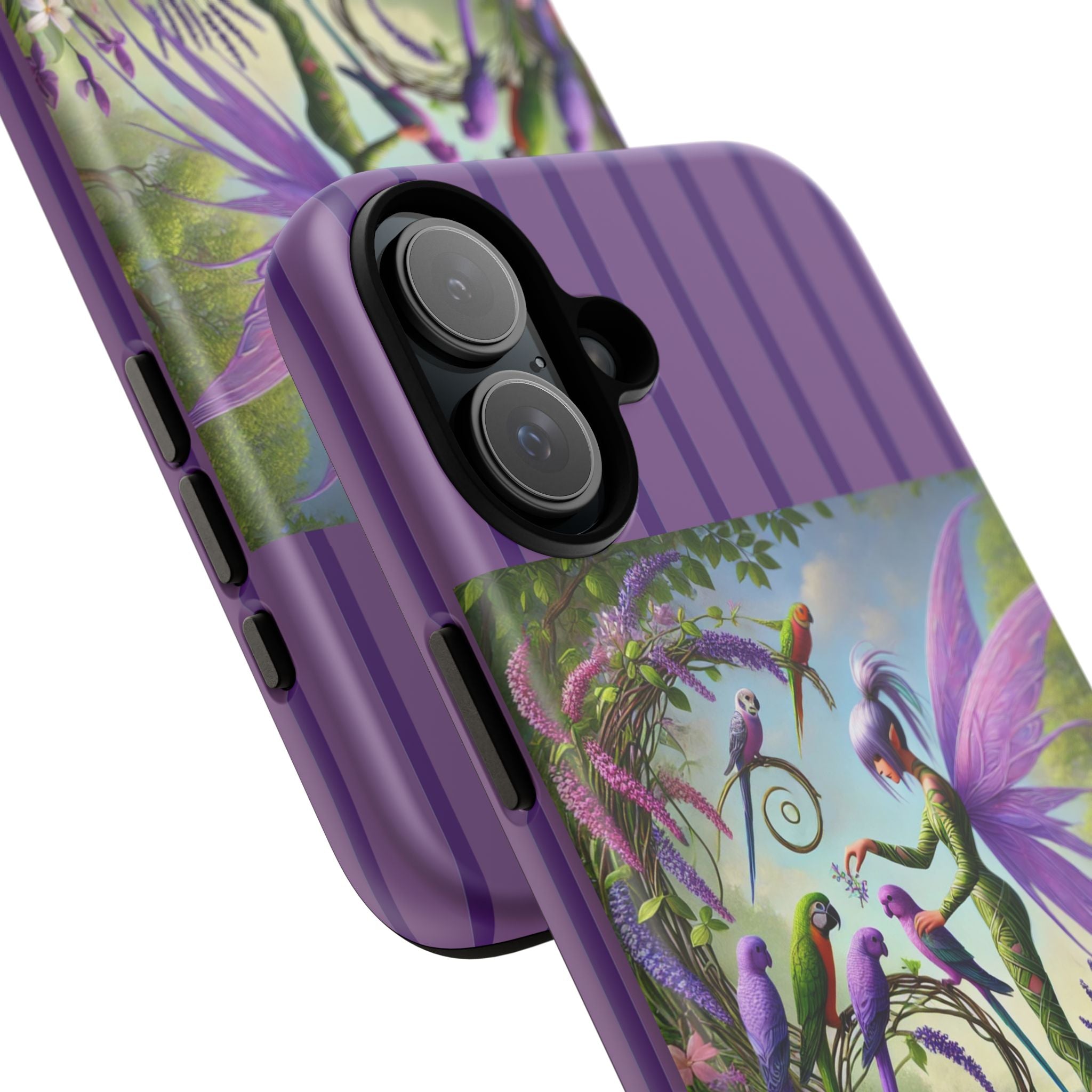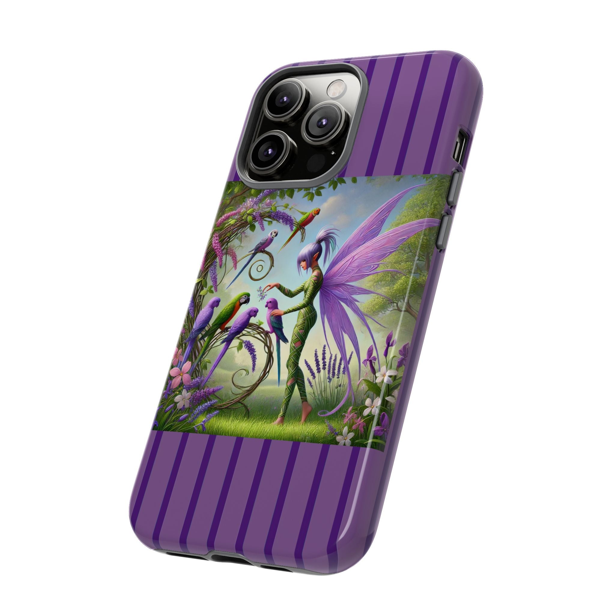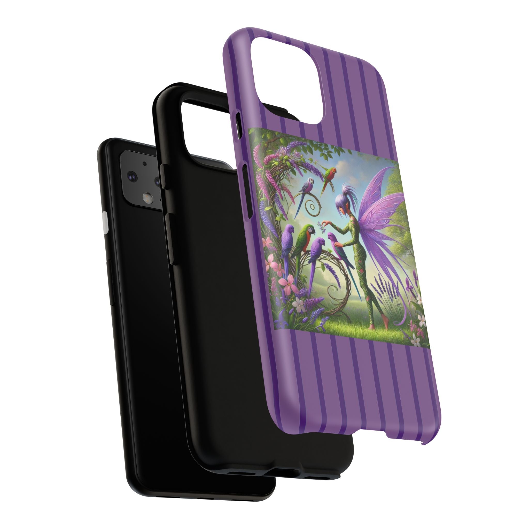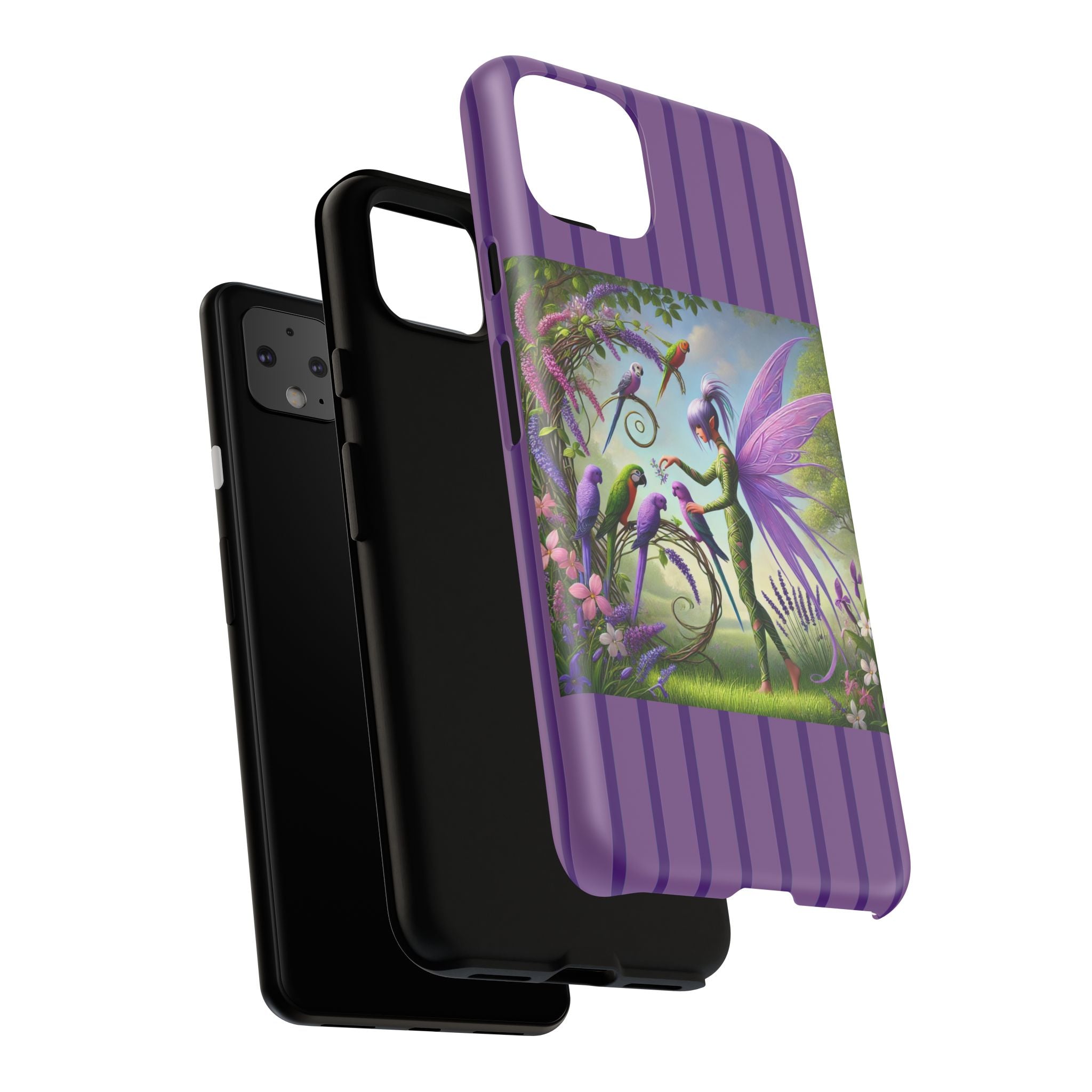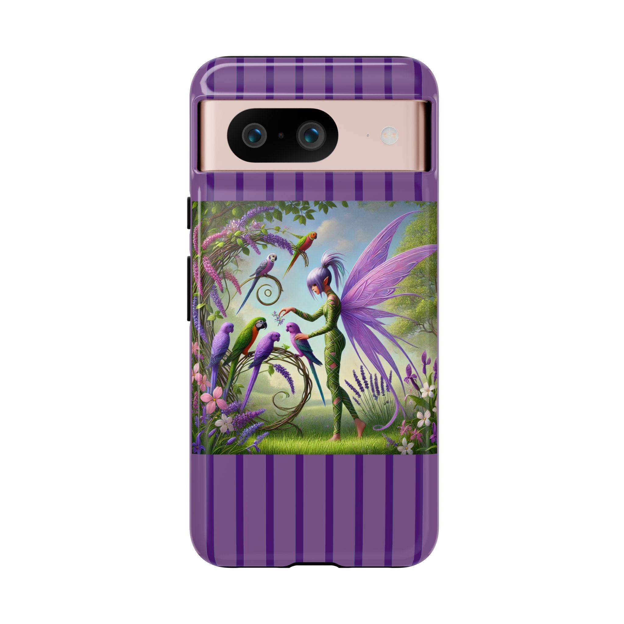 Lavender-Winged Fairy Phone Case transforms your phone into a scene of dreamy elegance and modern charm. Designed for iPhone, Samsung Galaxy, and Google Pixel devices, this case blends fine artistry with reliable protection. The design features a long, stylish fairy with shimmering lavender wings surrounded by vibrantly colored parrots under soft natural daylight. Lush greenery and blooms in shades of purple, pink, and white create an atmosphere of whimsy and freshness—capturing the magic of spring with contemporary sophistication. Choose a glossy or matte finish to bring this enchanting illustration to life while keeping your phone safe and stylish.