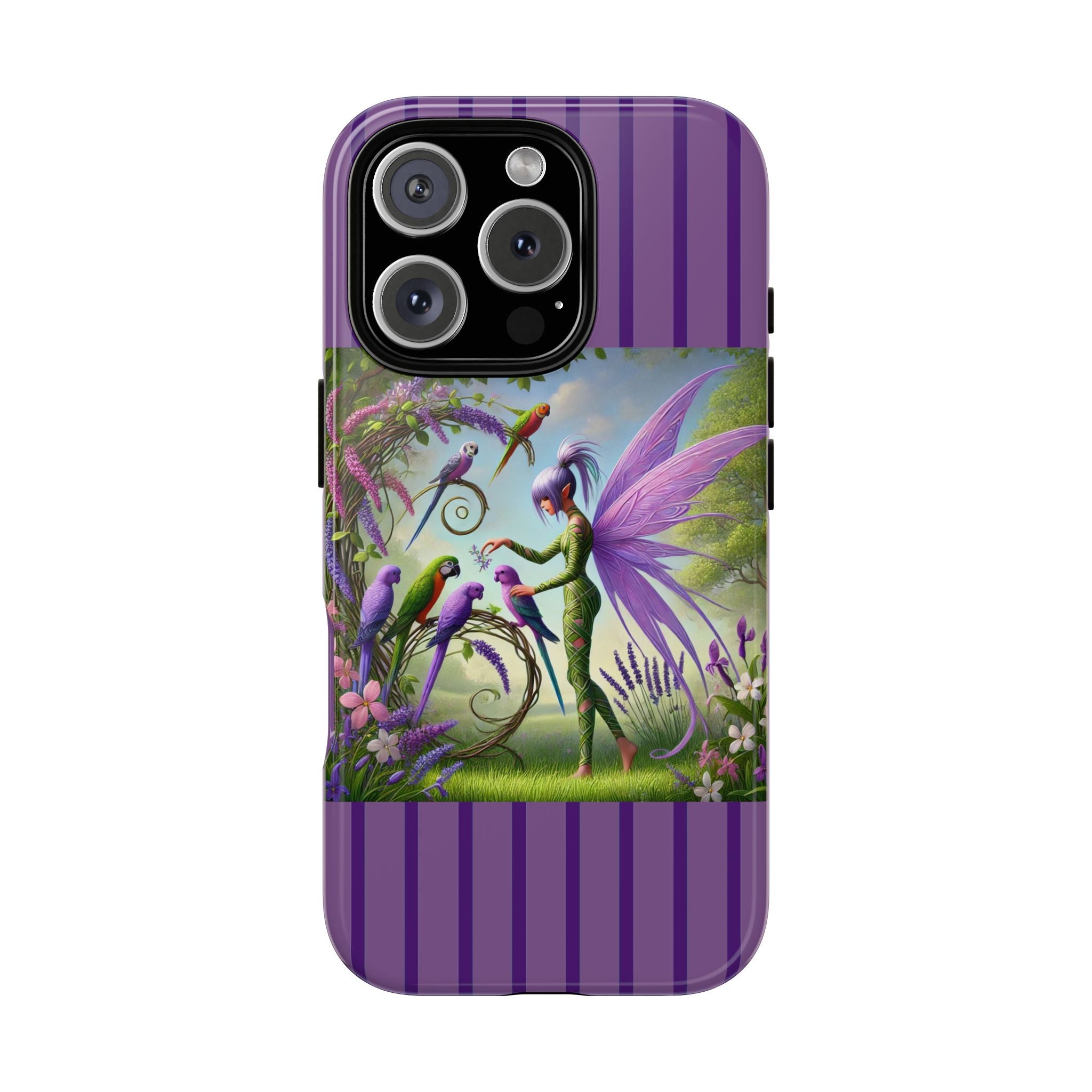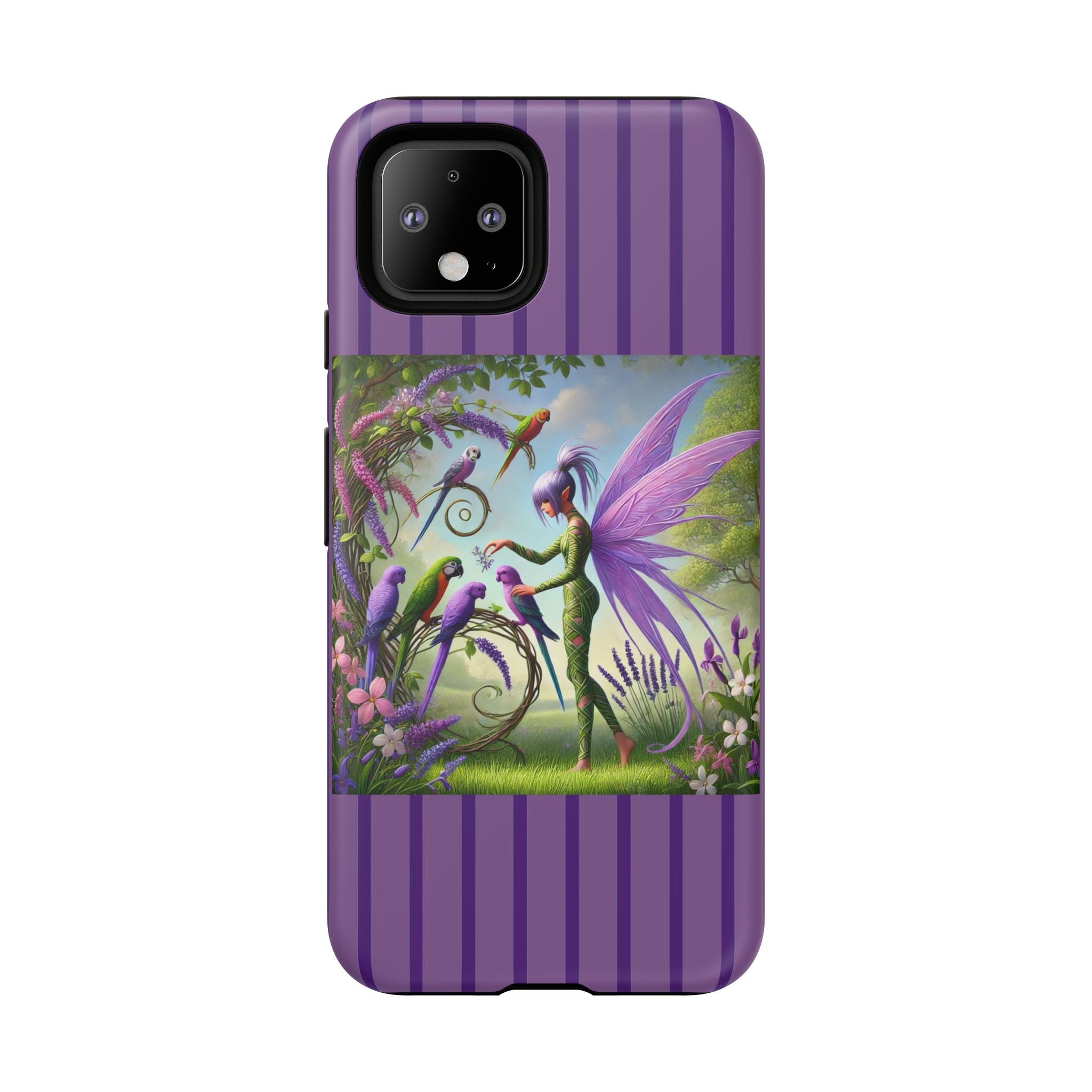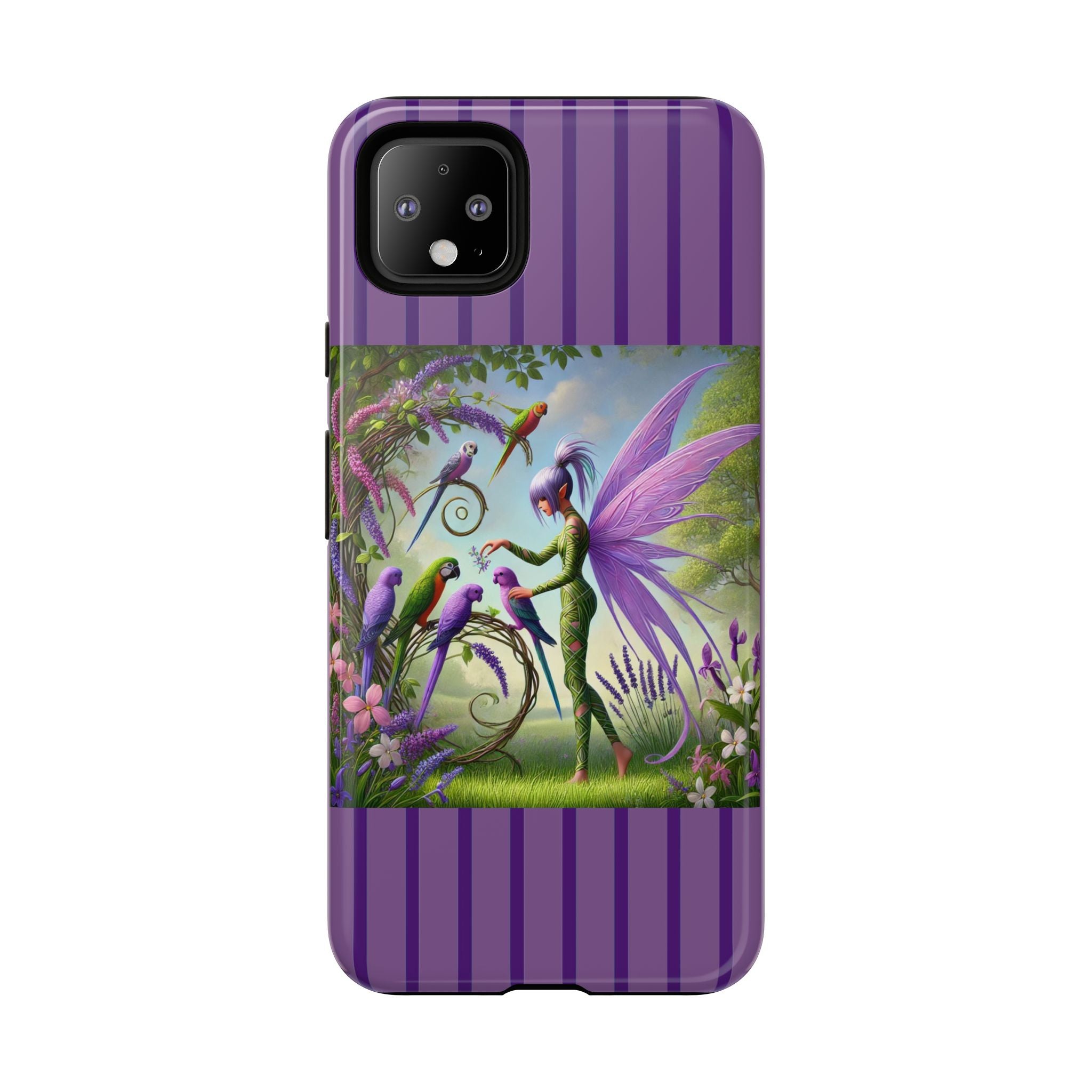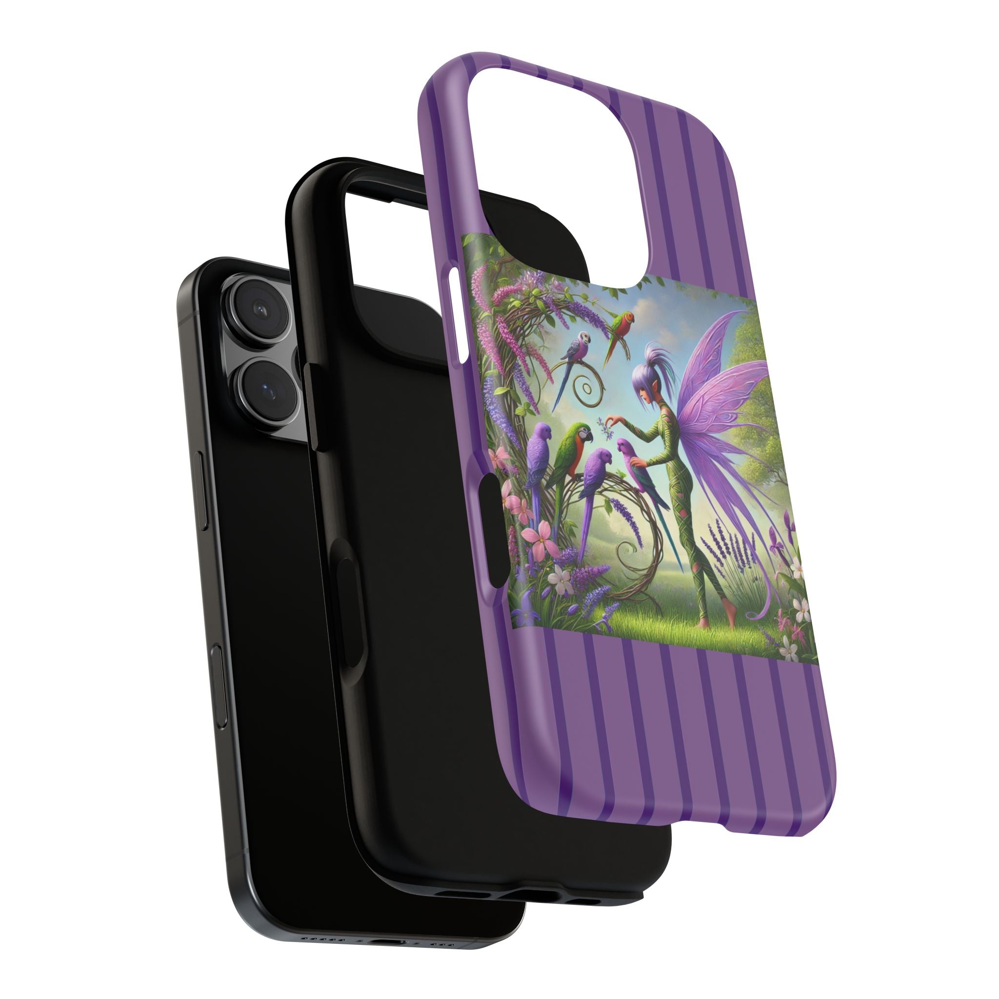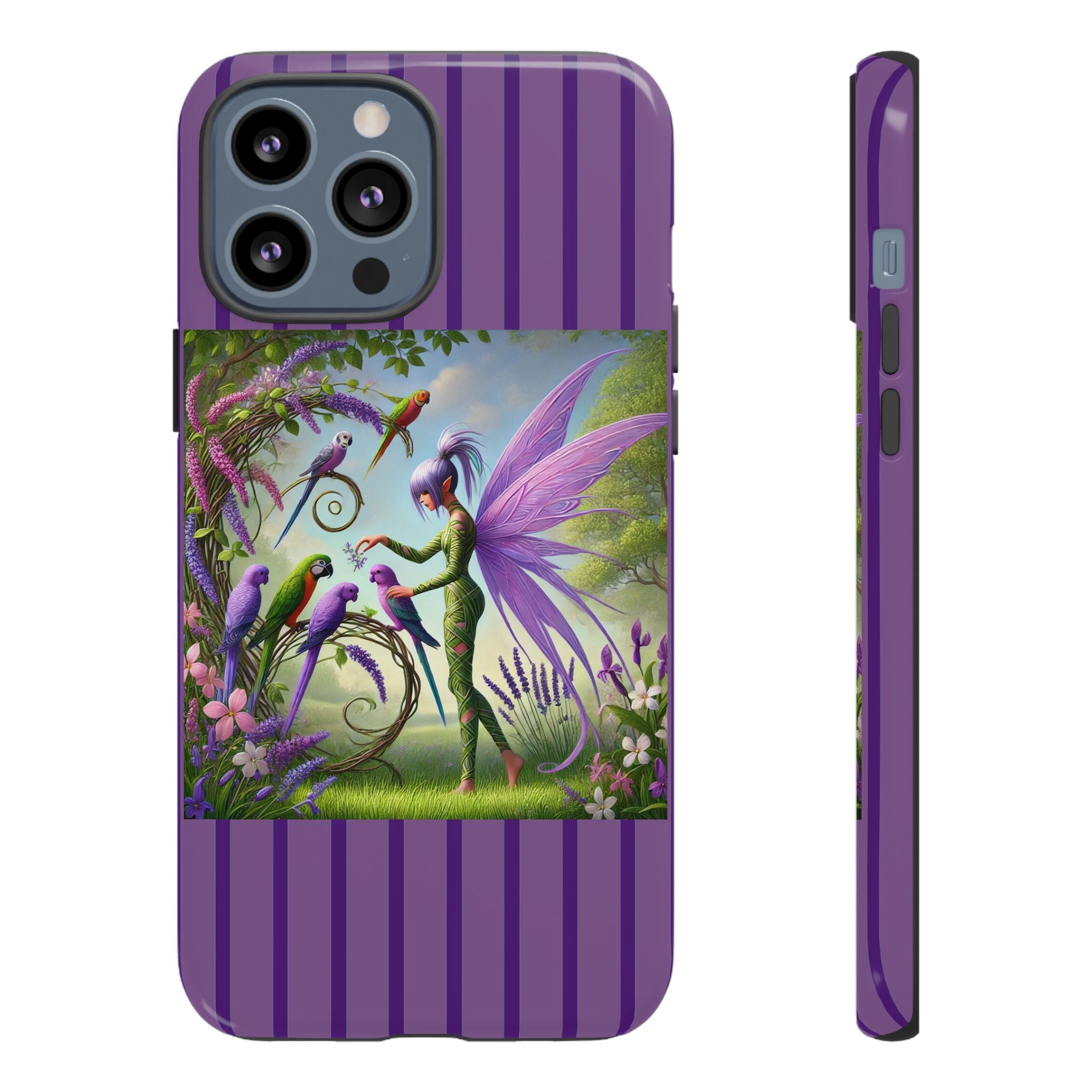 Lavender-Winged Fairy Phone Case transforms your phone into a scene of dreamy elegance and modern charm. Designed for iPhone, Samsung Galaxy, and Google Pixel devices, this case blends fine artistry with reliable protection. The design features a long, stylish fairy with shimmering lavender wings surrounded by vibrantly colored parrots under soft natural daylight. Lush greenery and blooms in shades of purple, pink, and white create an atmosphere of whimsy and freshness—capturing the magic of spring with contemporary sophistication. Choose a glossy or matte finish to bring this enchanting illustration to life while keeping your phone safe and stylish.