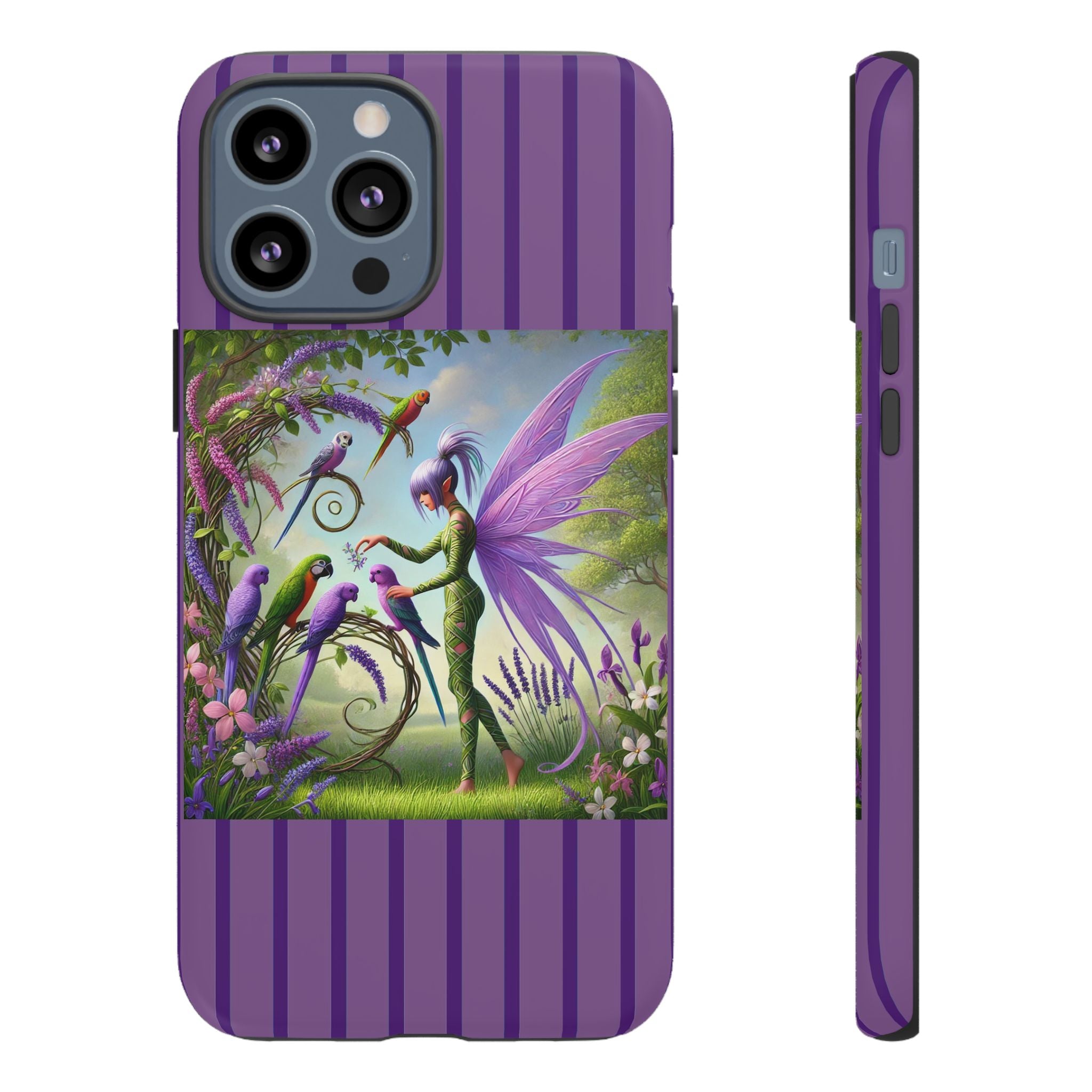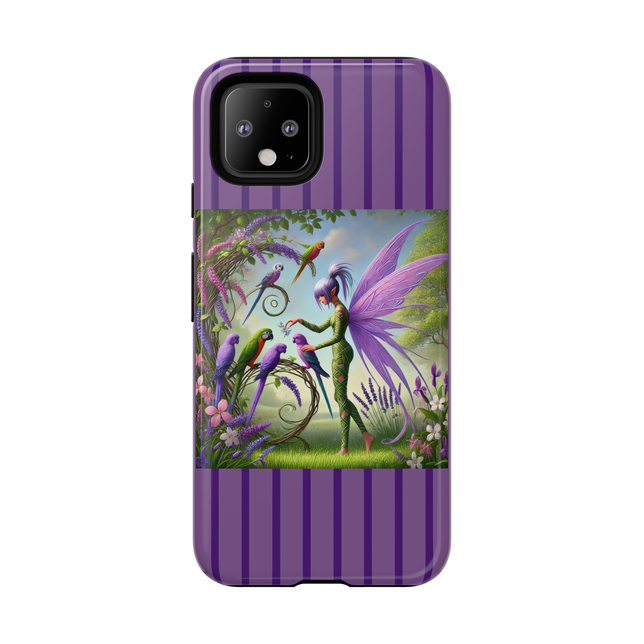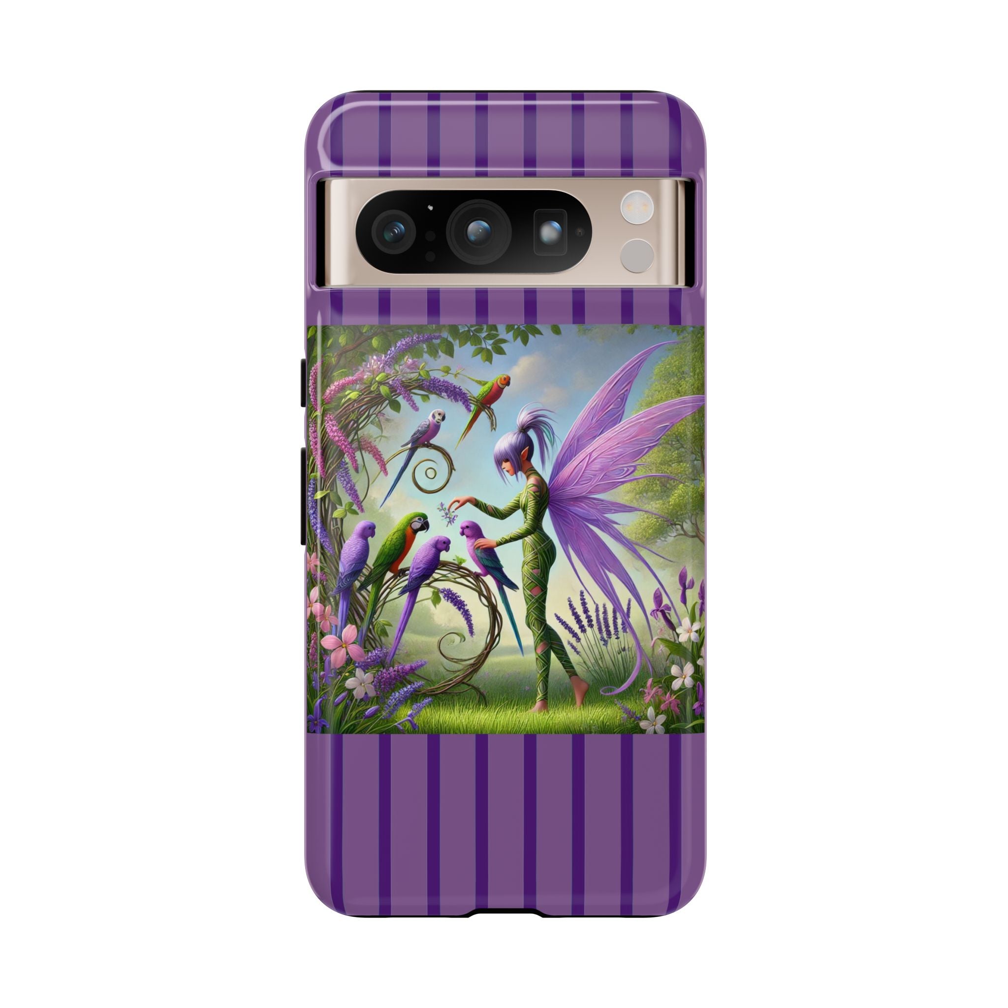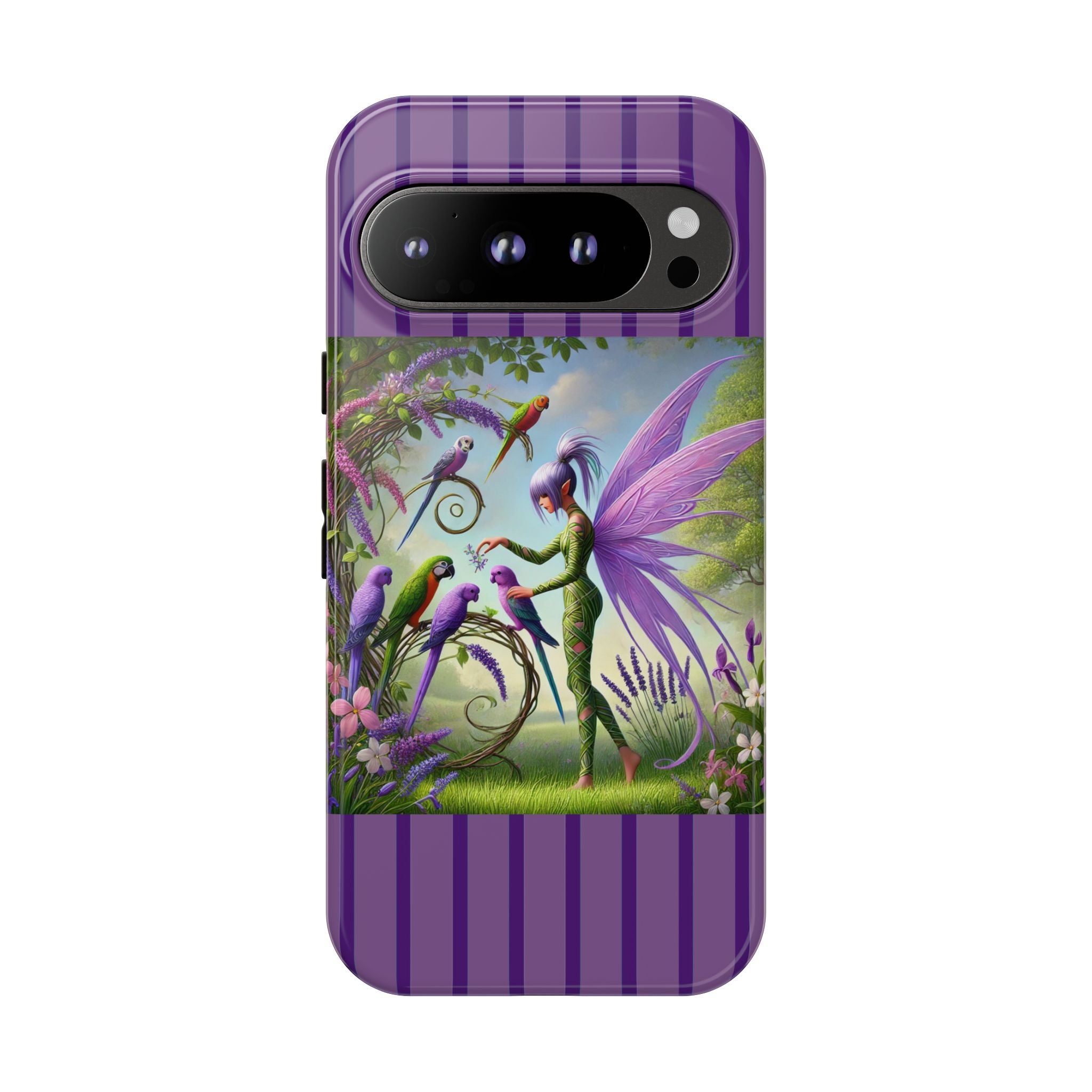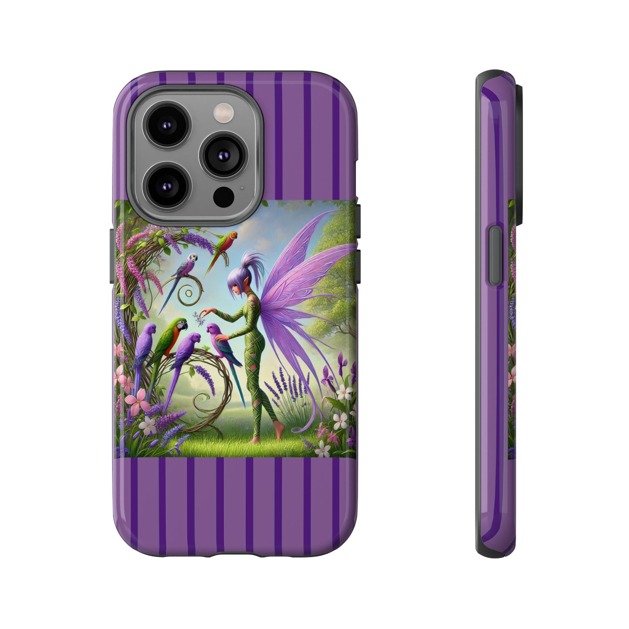 Lavender-Winged Fairy Phone Case transforms your phone into a scene of dreamy elegance and modern charm. Designed for iPhone, Samsung Galaxy, and Google Pixel devices, this case blends fine artistry with reliable protection. The design features a long, stylish fairy with shimmering lavender wings surrounded by vibrantly colored parrots under soft natural daylight. Lush greenery and blooms in shades of purple, pink, and white create an atmosphere of whimsy and freshness—capturing the magic of spring with contemporary sophistication. Choose a glossy or matte finish to bring this enchanting illustration to life while keeping your phone safe and stylish.
