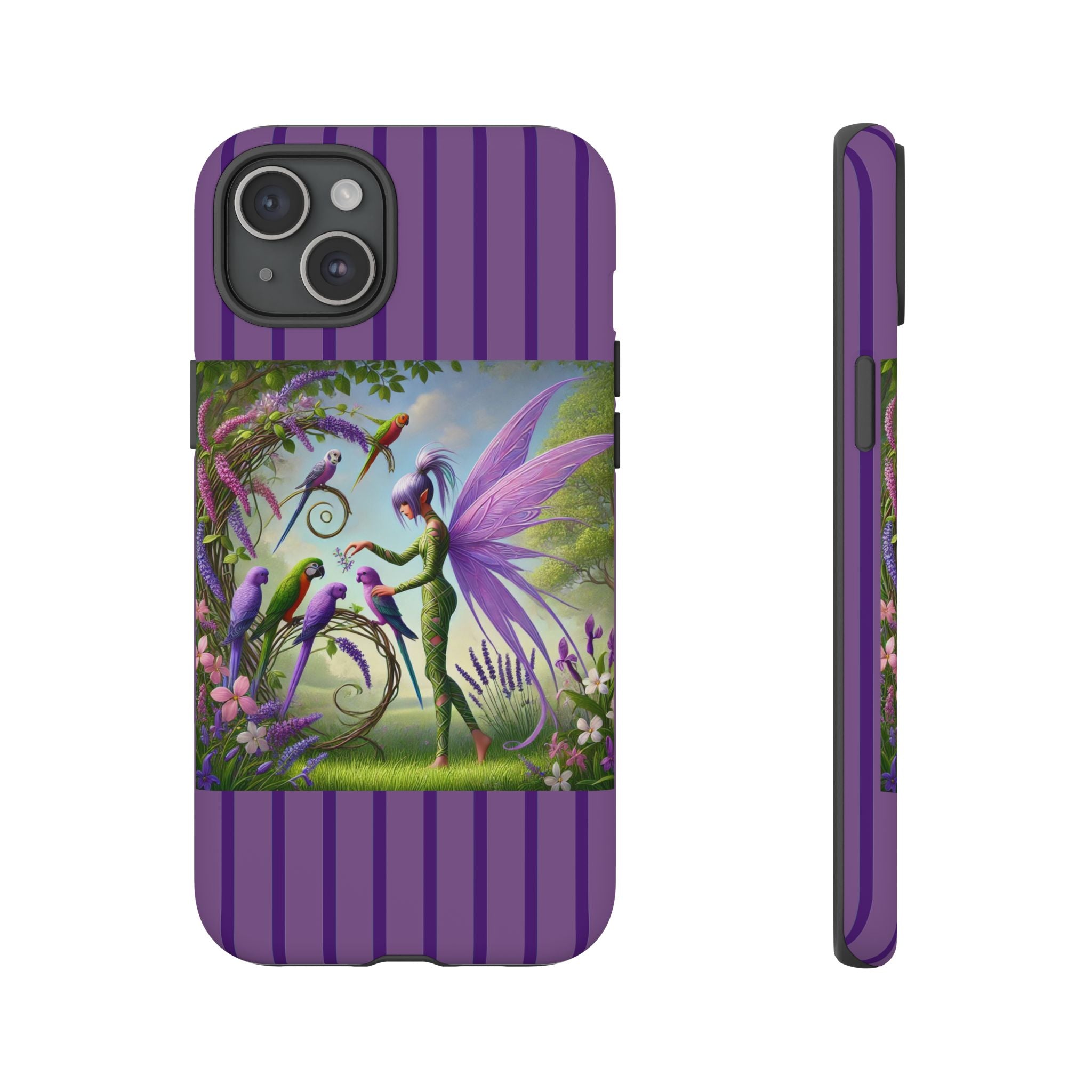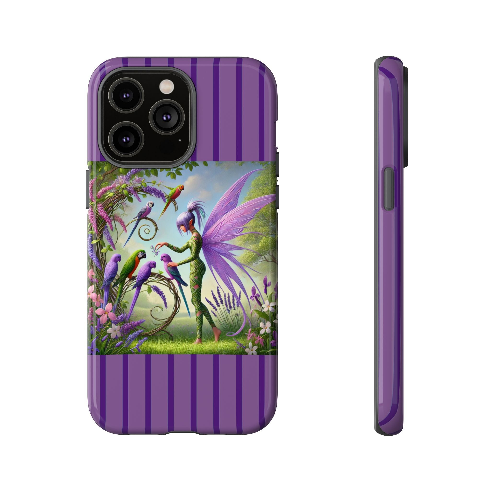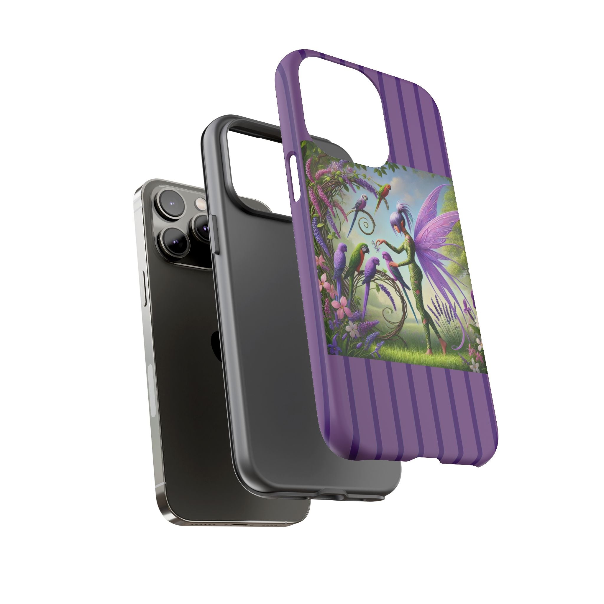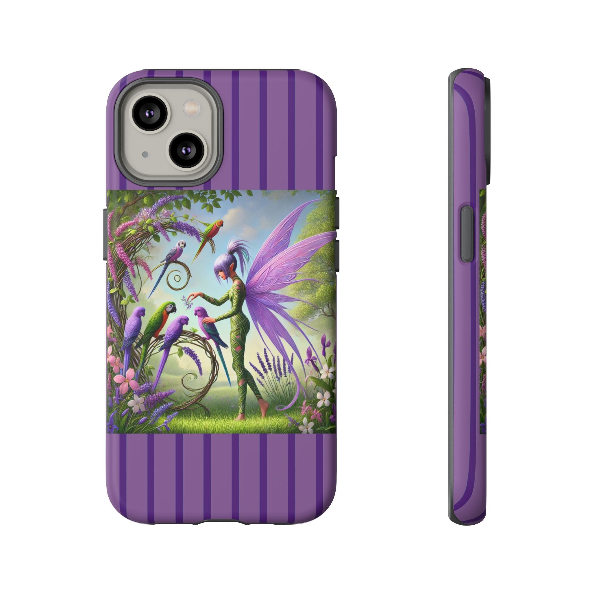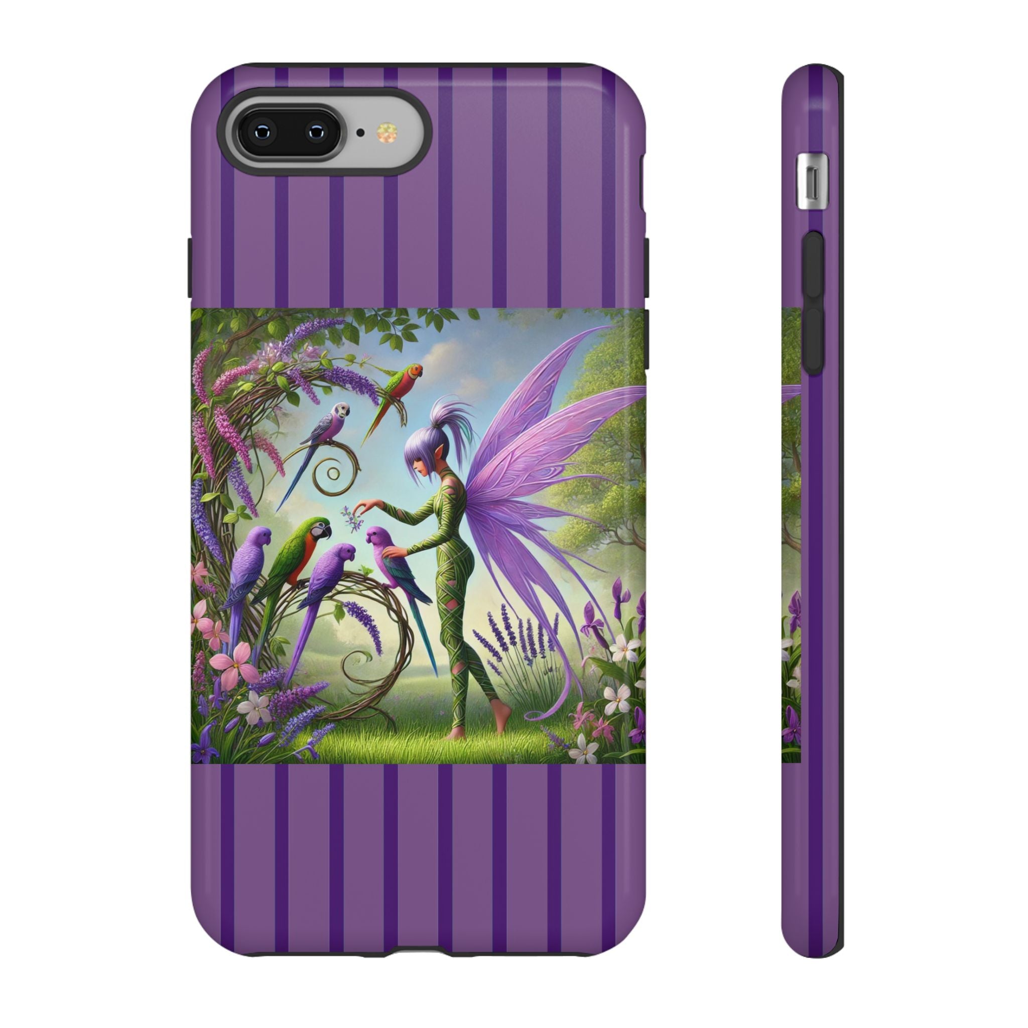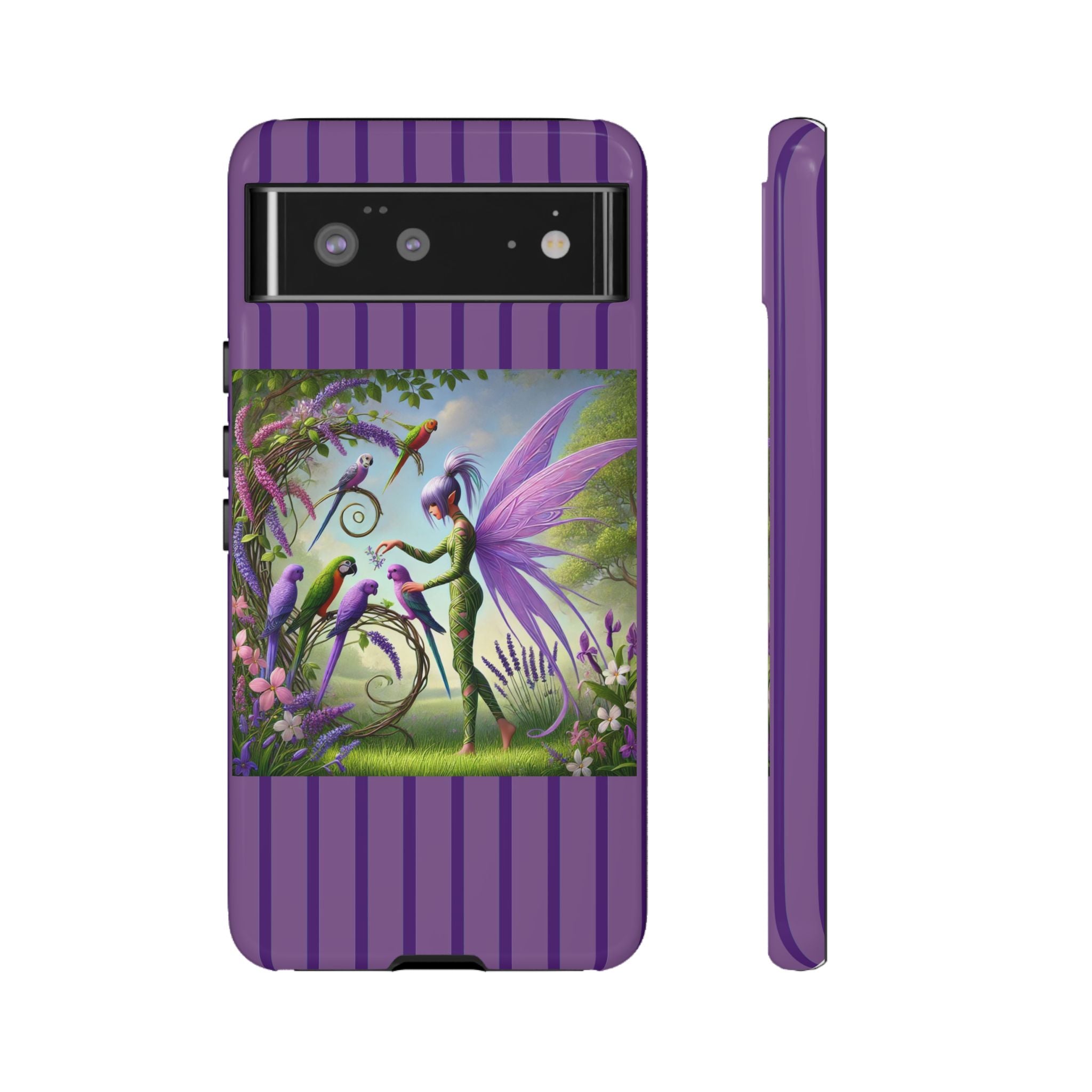 Lavender-Winged Fairy Phone Case transforms your phone into a scene of dreamy elegance and modern charm. Designed for iPhone, Samsung Galaxy, and Google Pixel devices, this case blends fine artistry with reliable protection. The design features a long, stylish fairy with shimmering lavender wings surrounded by vibrantly colored parrots under soft natural daylight. Lush greenery and blooms in shades of purple, pink, and white create an atmosphere of whimsy and freshness—capturing the magic of spring with contemporary sophistication. Choose a glossy or matte finish to bring this enchanting illustration to life while keeping your phone safe and stylish.