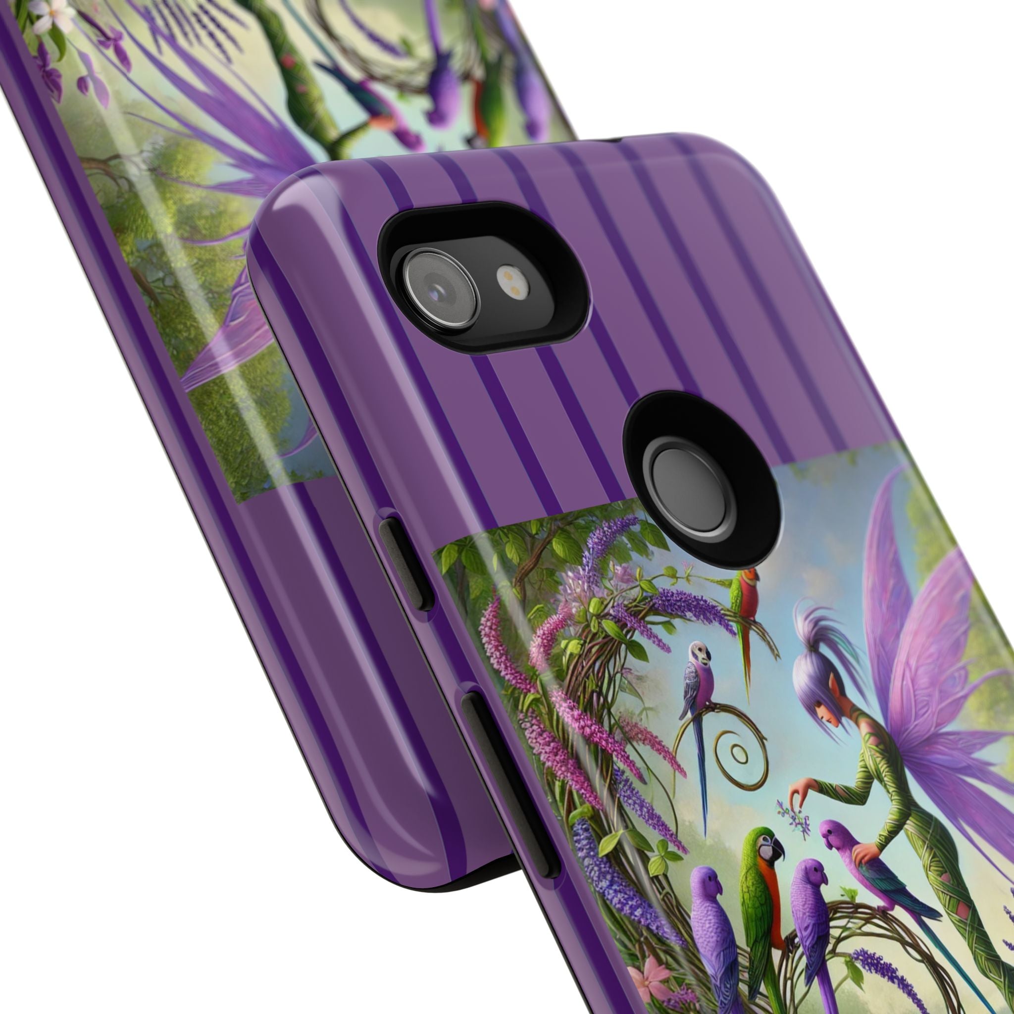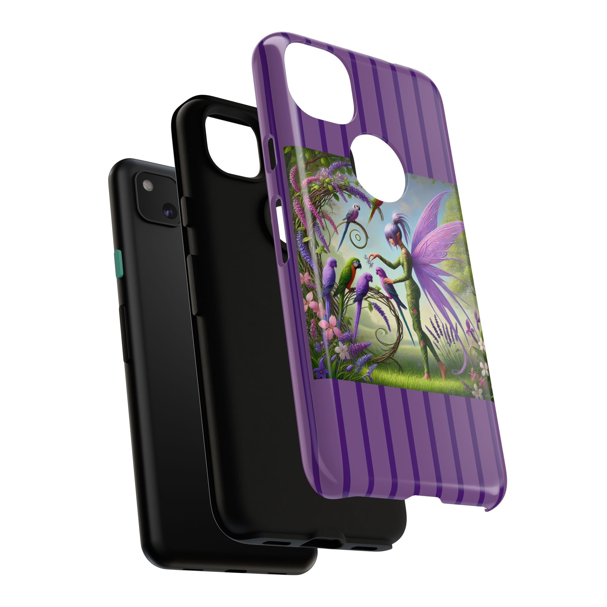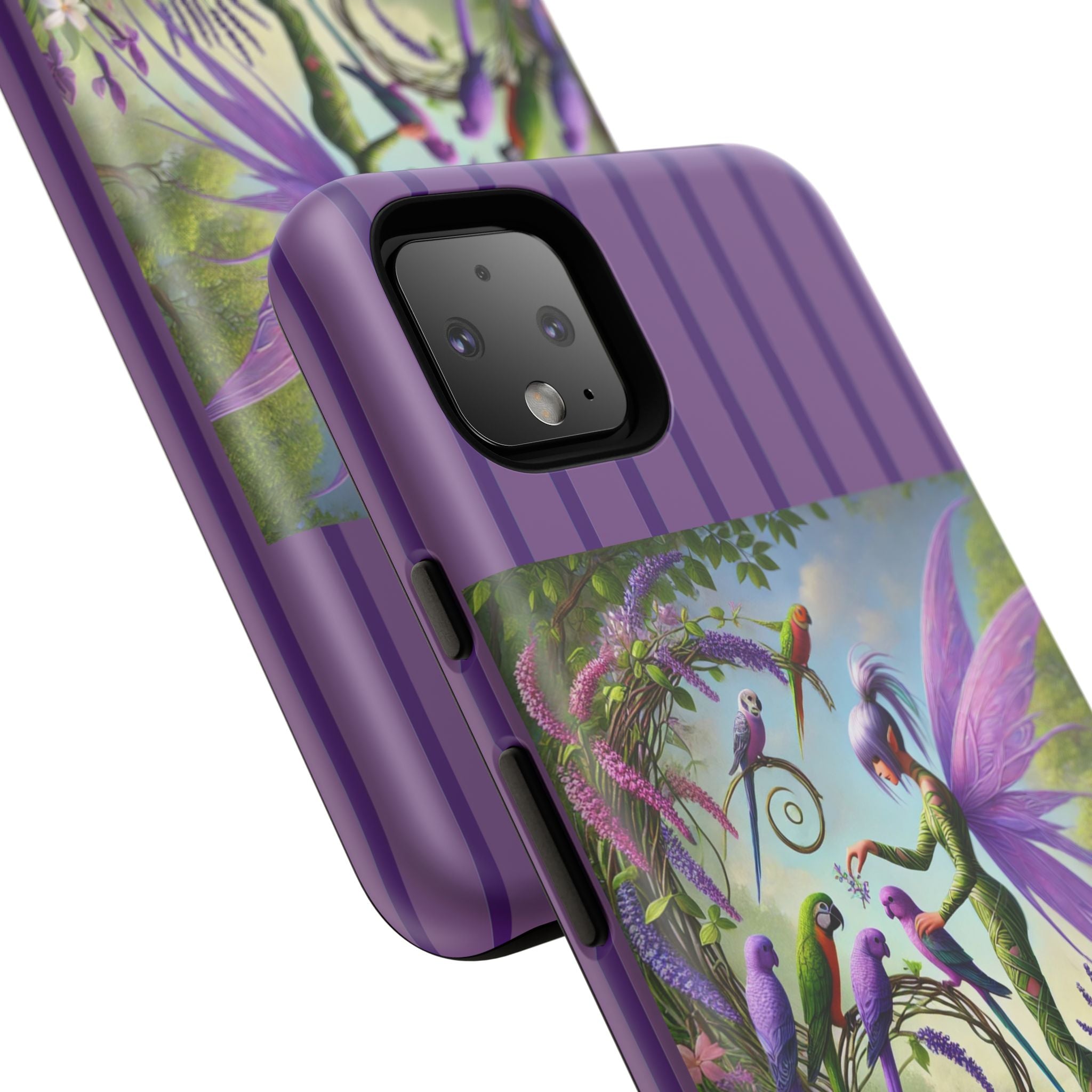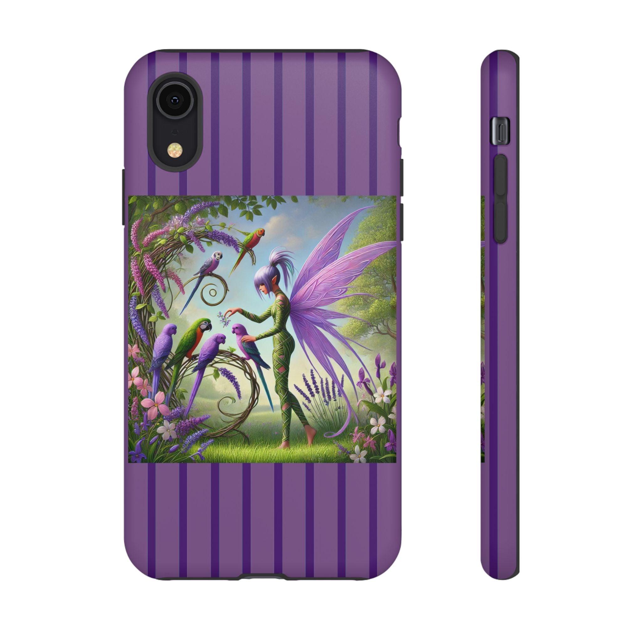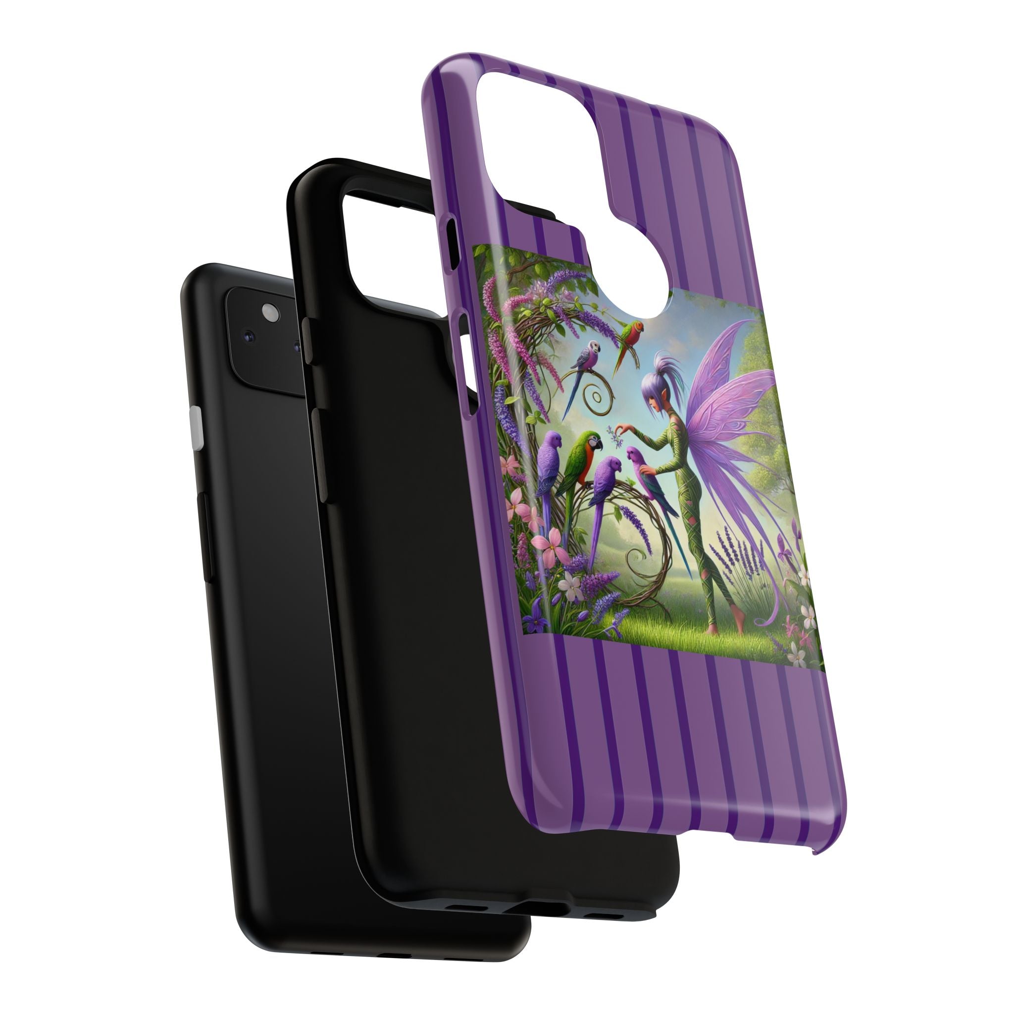 Lavender-Winged Fairy Phone Case transforms your phone into a scene of dreamy elegance and modern charm. Designed for iPhone, Samsung Galaxy, and Google Pixel devices, this case blends fine artistry with reliable protection. The design features a long, stylish fairy with shimmering lavender wings surrounded by vibrantly colored parrots under soft natural daylight. Lush greenery and blooms in shades of purple, pink, and white create an atmosphere of whimsy and freshness—capturing the magic of spring with contemporary sophistication. Choose a glossy or matte finish to bring this enchanting illustration to life while keeping your phone safe and stylish.