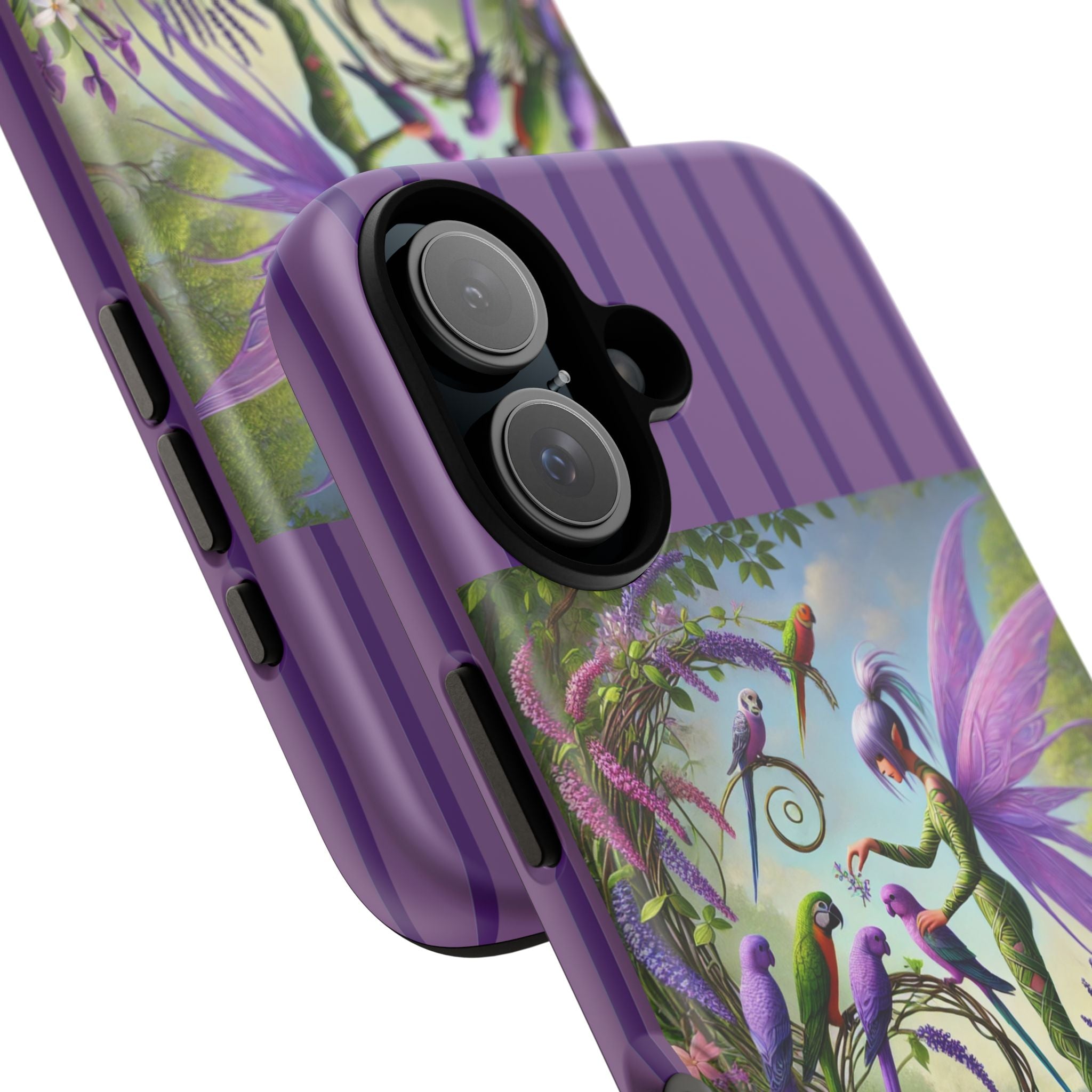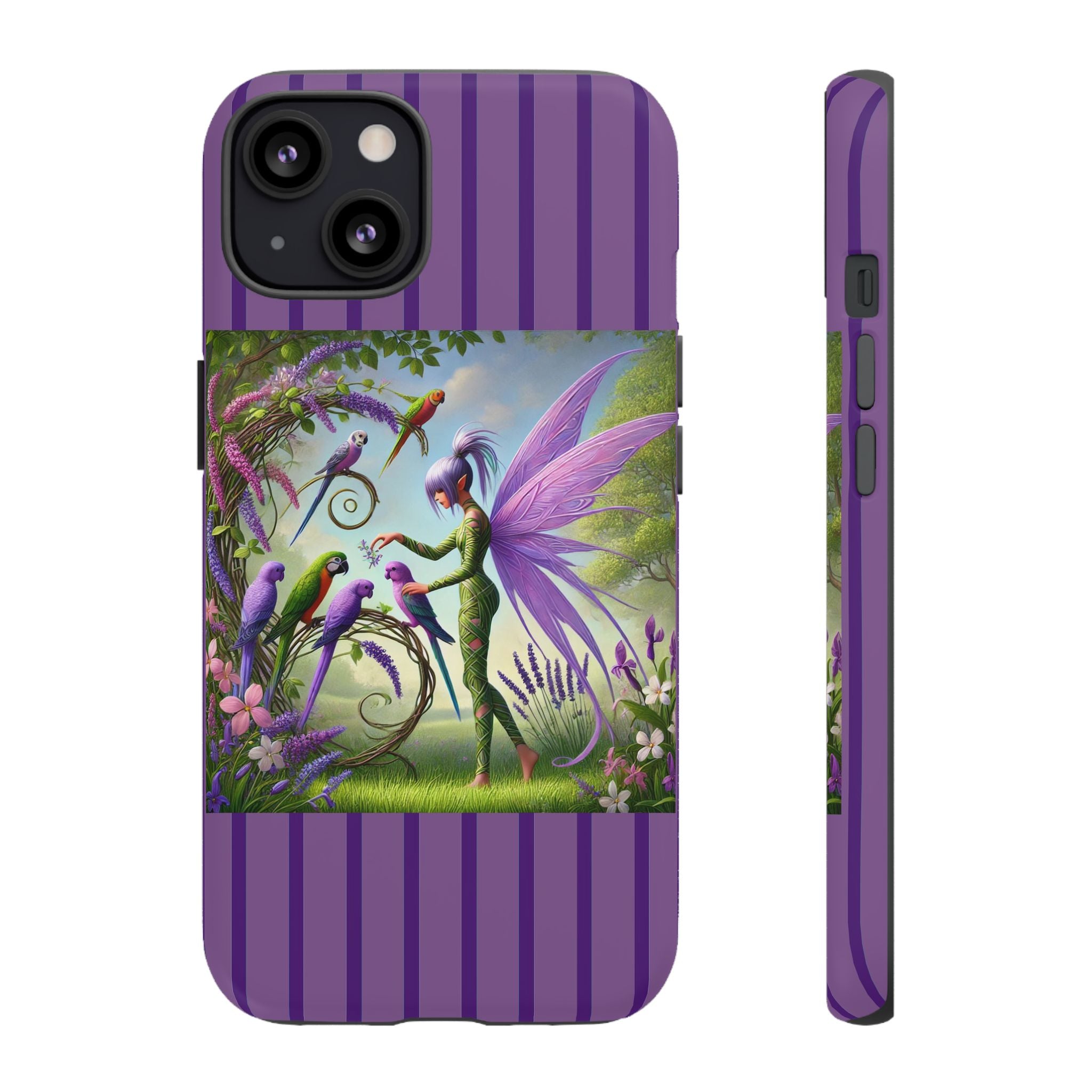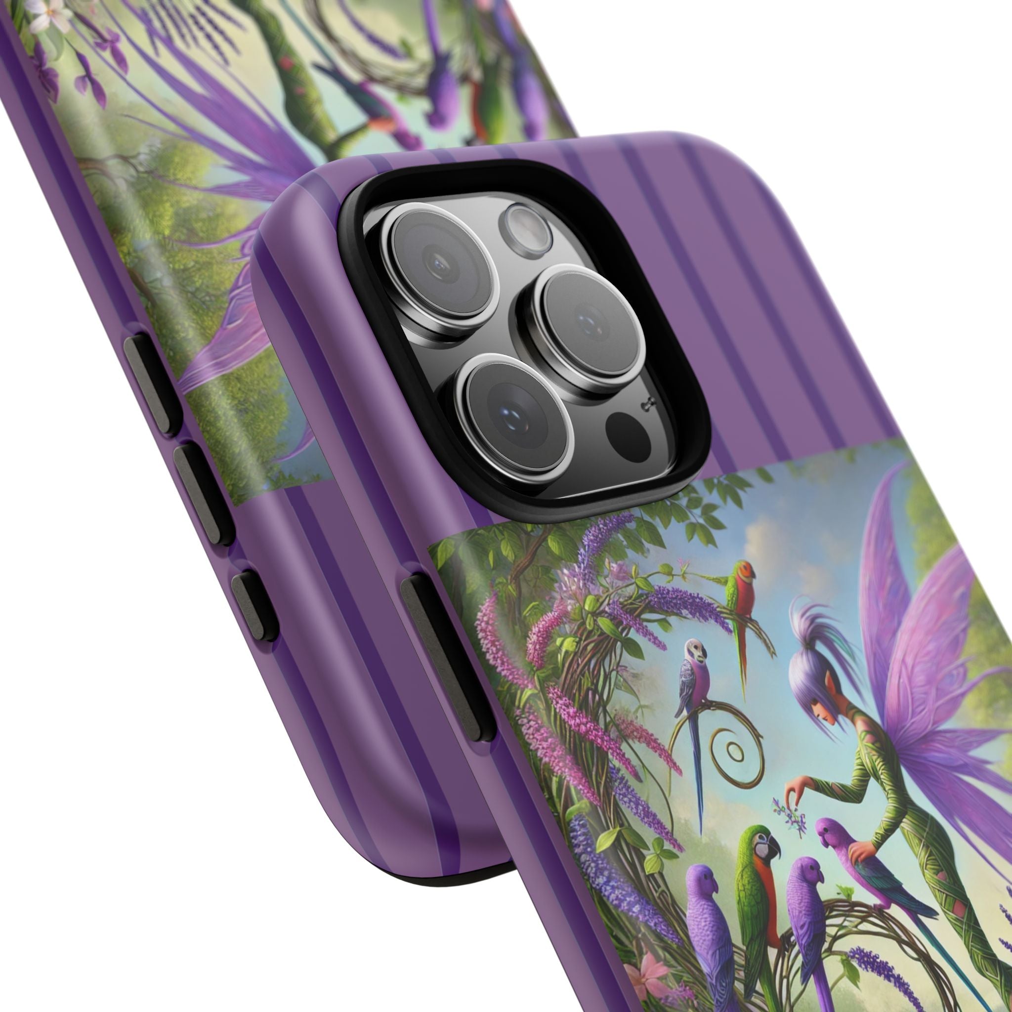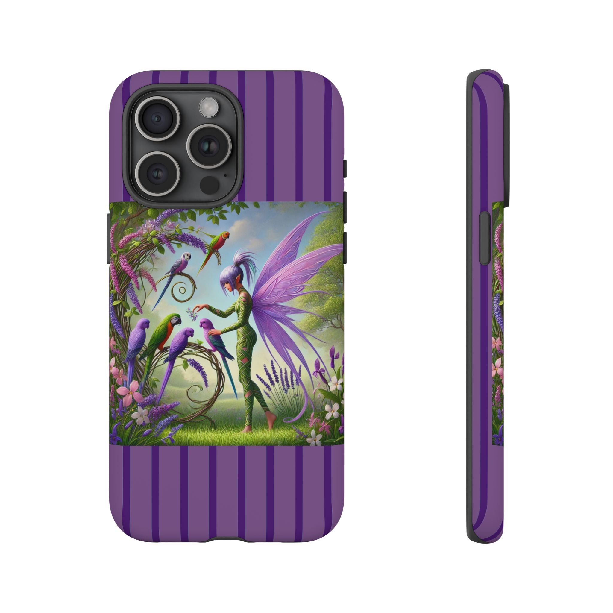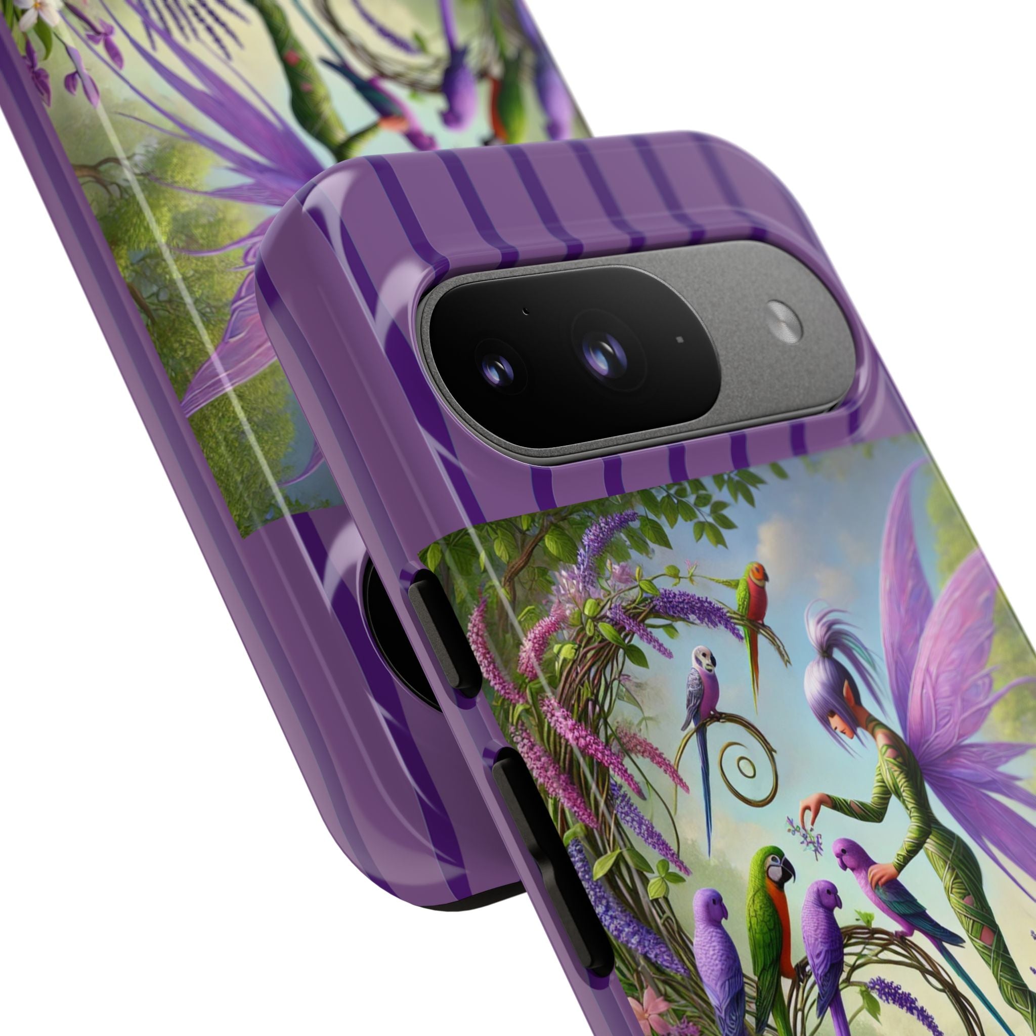 Lavender-Winged Fairy Phone Case transforms your phone into a scene of dreamy elegance and modern charm. Designed for iPhone, Samsung Galaxy, and Google Pixel devices, this case blends fine artistry with reliable protection. The design features a long, stylish fairy with shimmering lavender wings surrounded by vibrantly colored parrots under soft natural daylight. Lush greenery and blooms in shades of purple, pink, and white create an atmosphere of whimsy and freshness—capturing the magic of spring with contemporary sophistication. Choose a glossy or matte finish to bring this enchanting illustration to life while keeping your phone safe and stylish.
