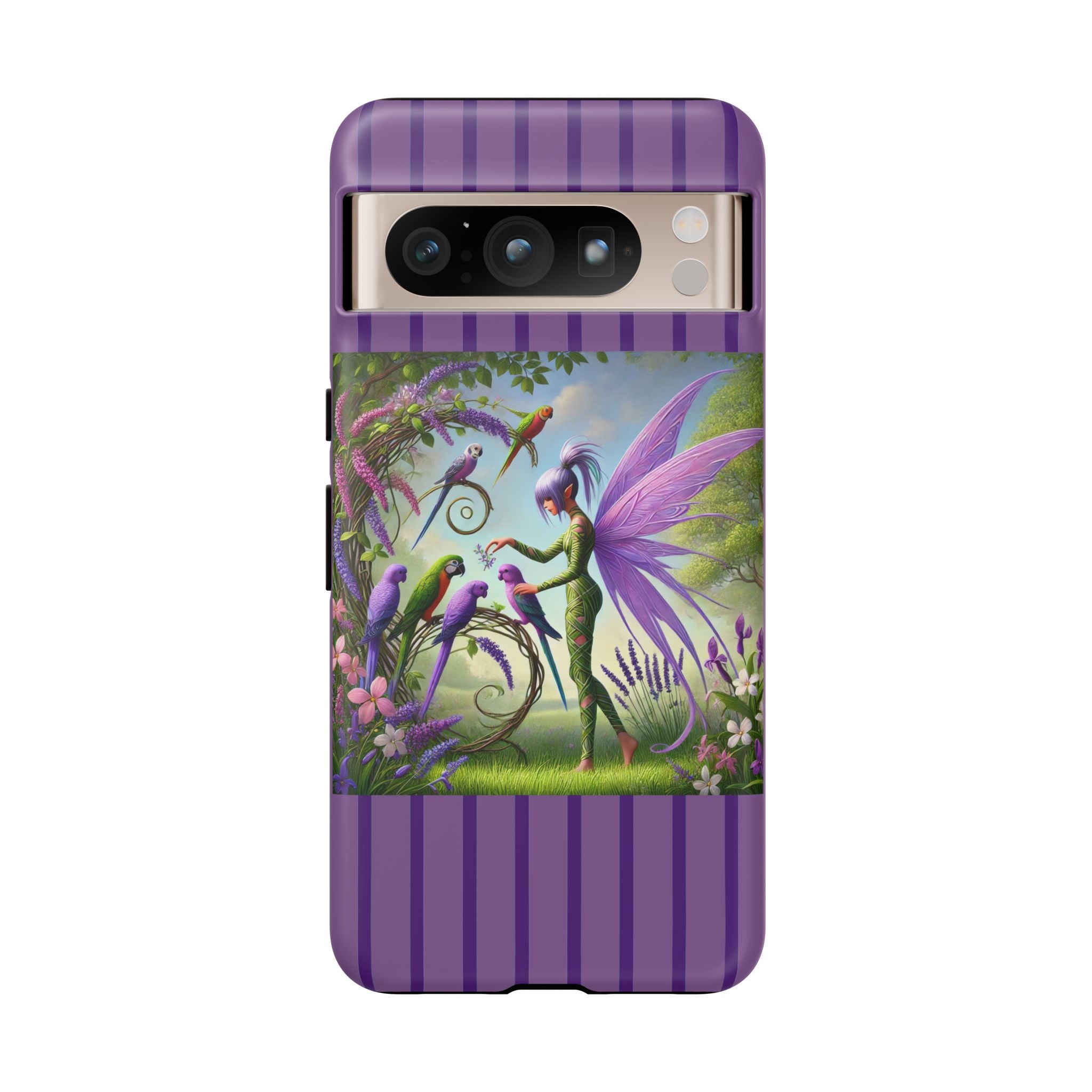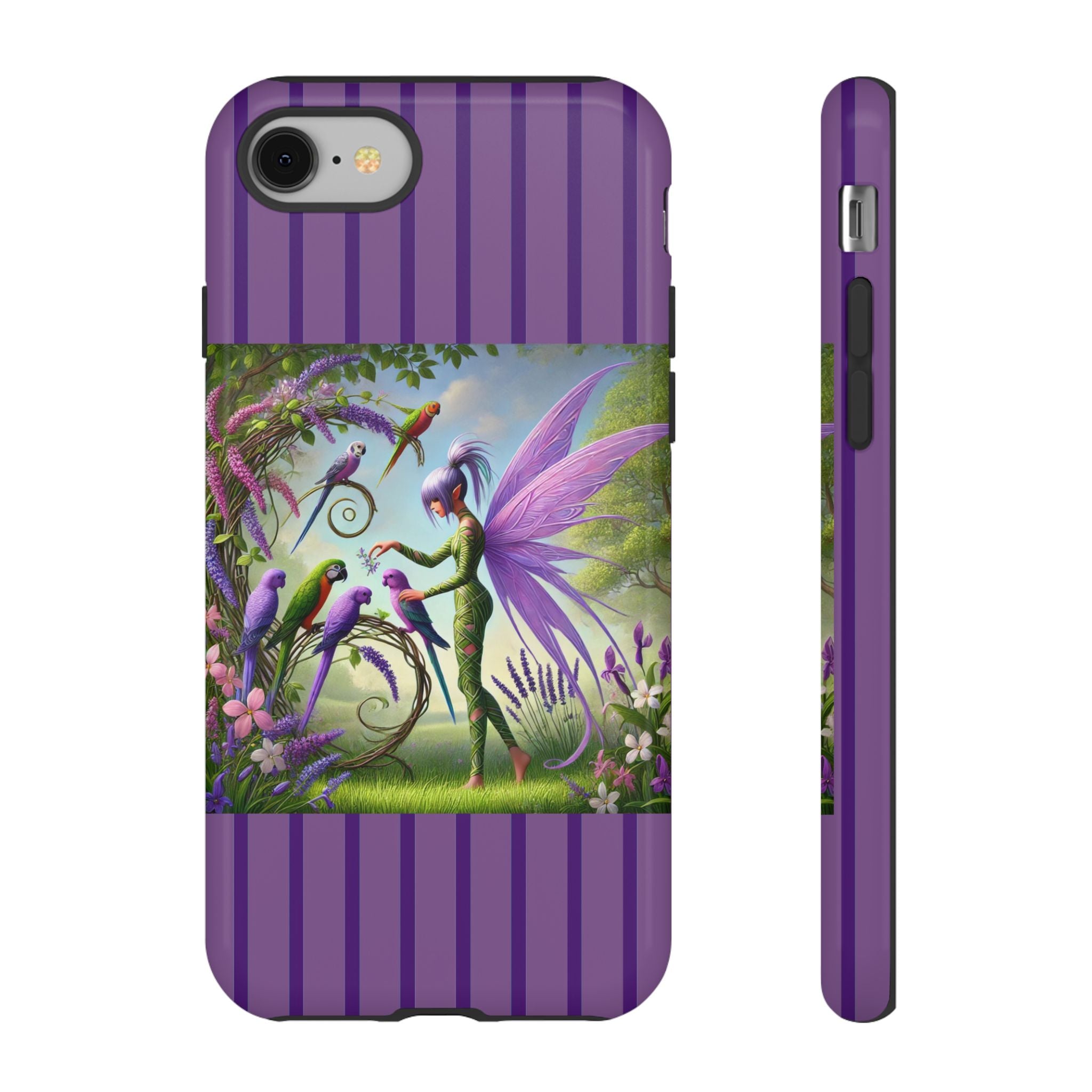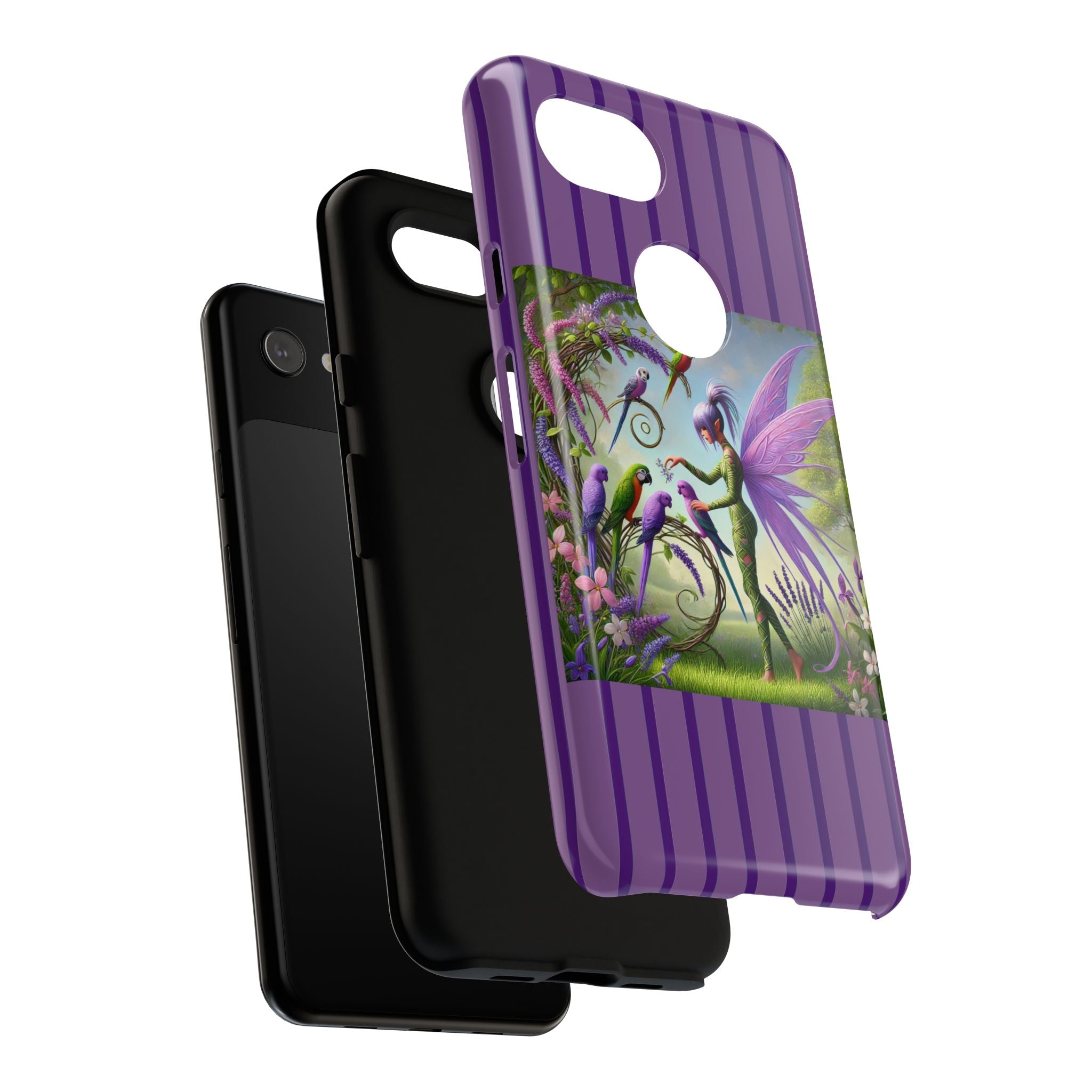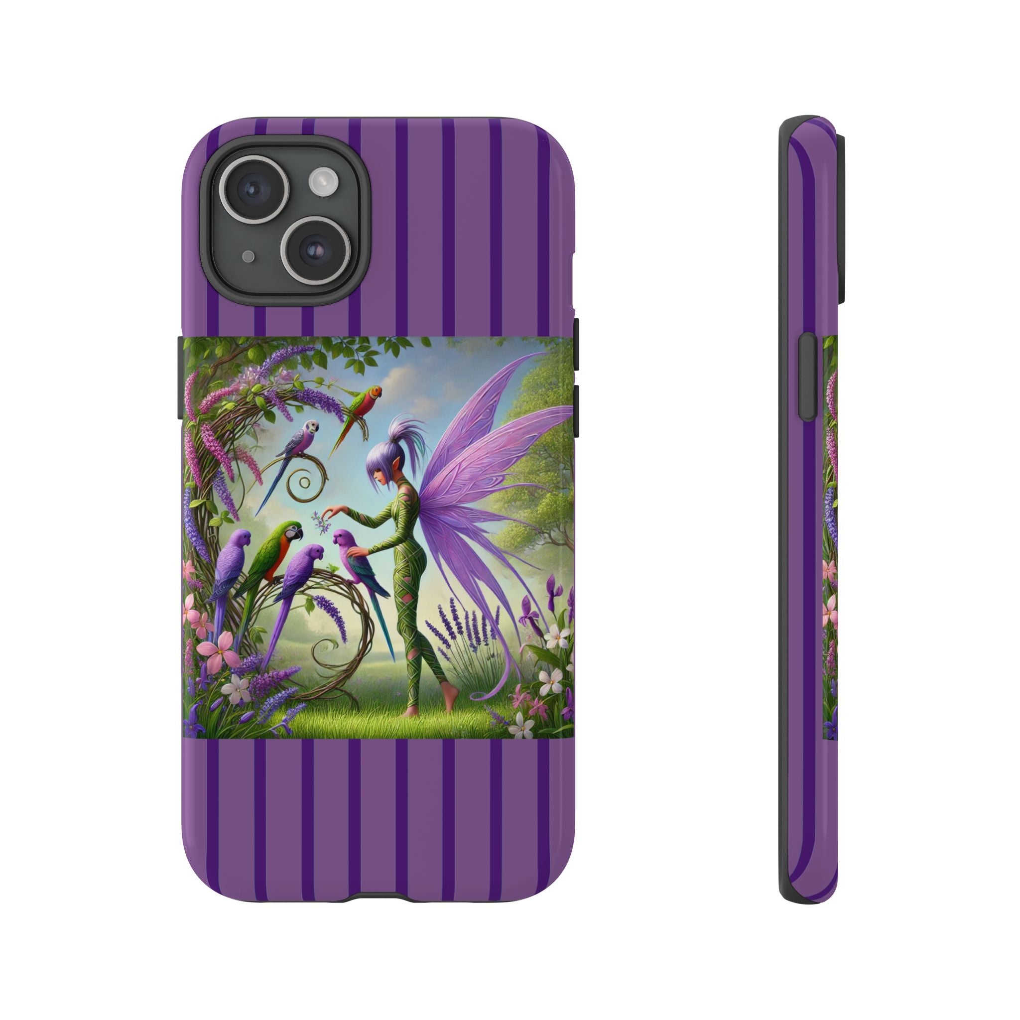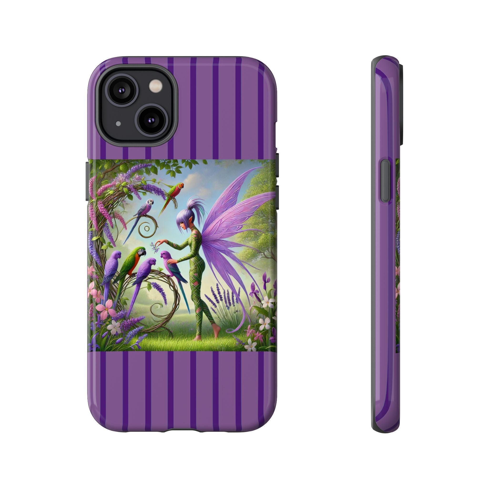Lavender-Winged Fairy Phone Case transforms your phone into a scene of dreamy elegance and modern charm. Designed for iPhone, Samsung Galaxy, and Google Pixel devices, this case blends fine artistry with reliable protection. The design features a long, stylish fairy with shimmering lavender wings surrounded by vibrantly colored parrots under soft natural daylight. Lush greenery and blooms in shades of purple, pink, and white create an atmosphere of whimsy and freshness—capturing the magic of spring with contemporary sophistication. Choose a glossy or matte finish to bring this enchanting illustration to life while keeping your phone safe and stylish.