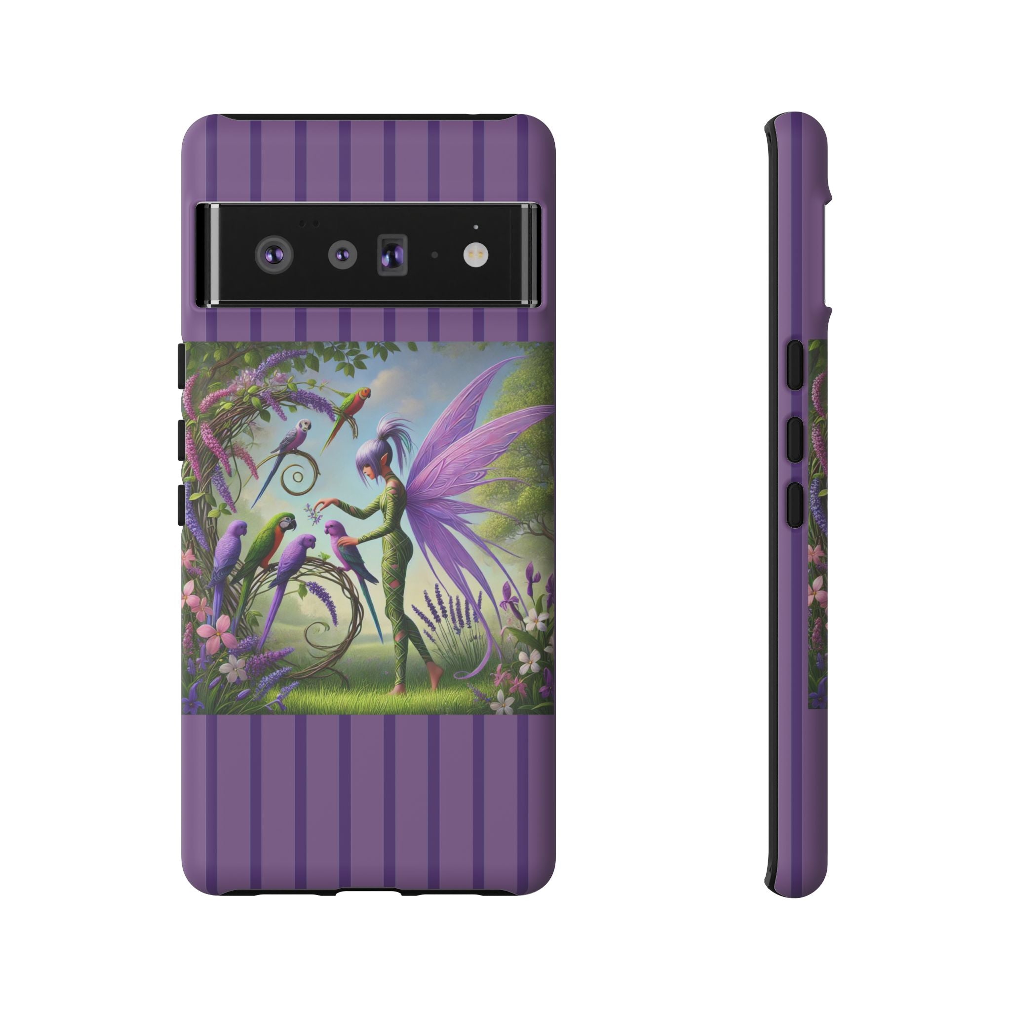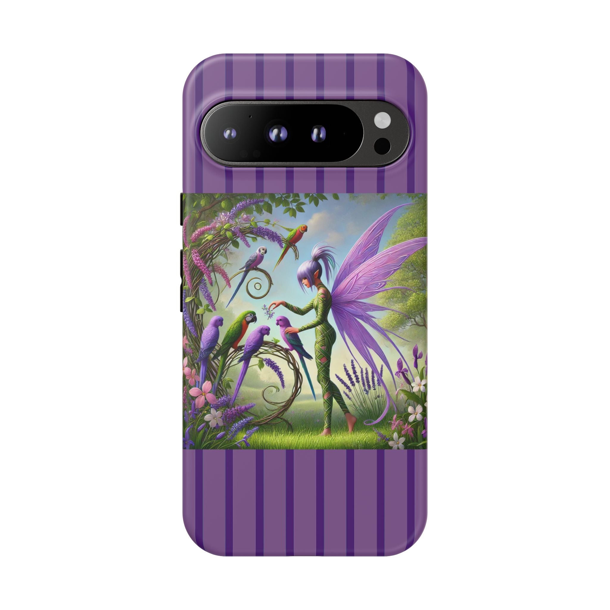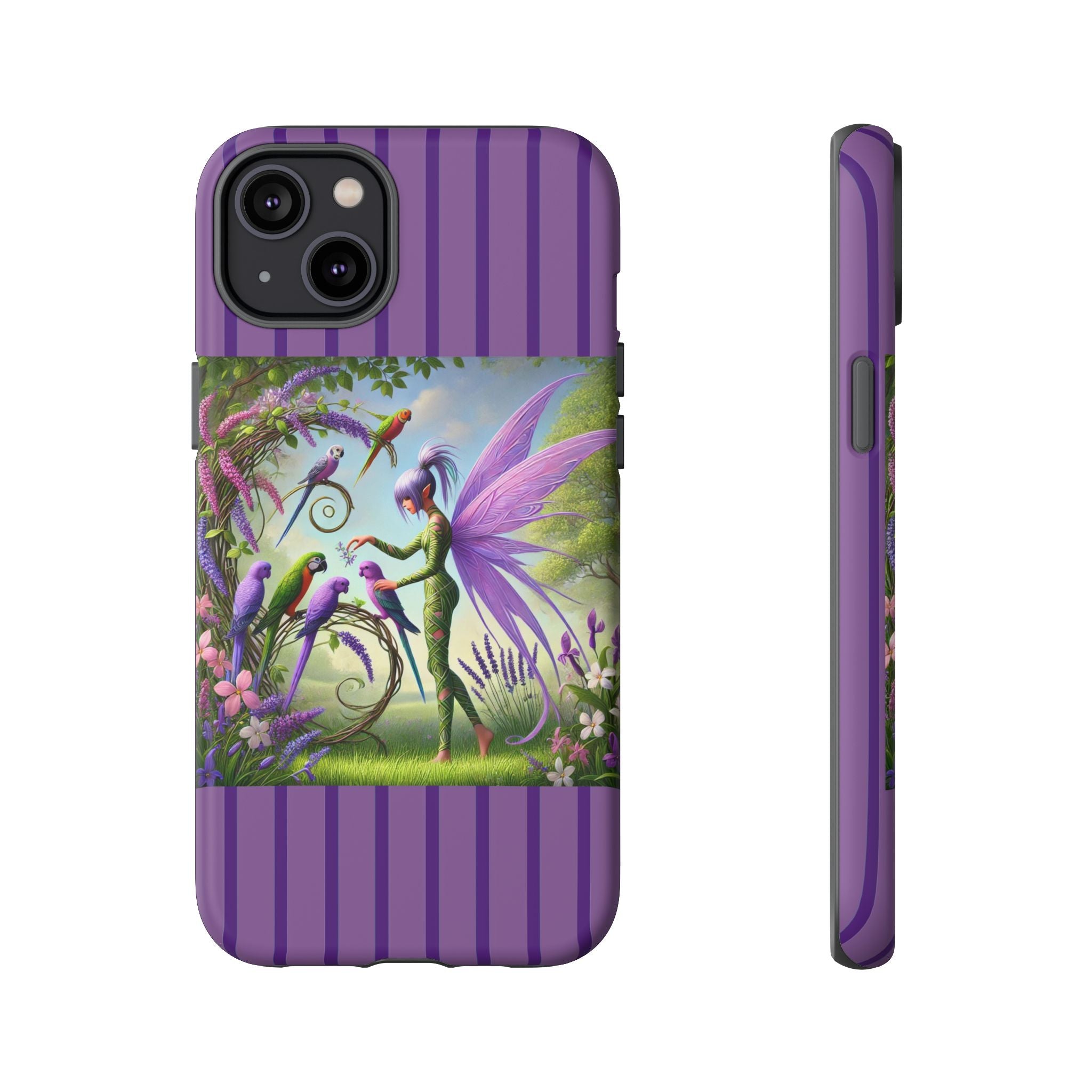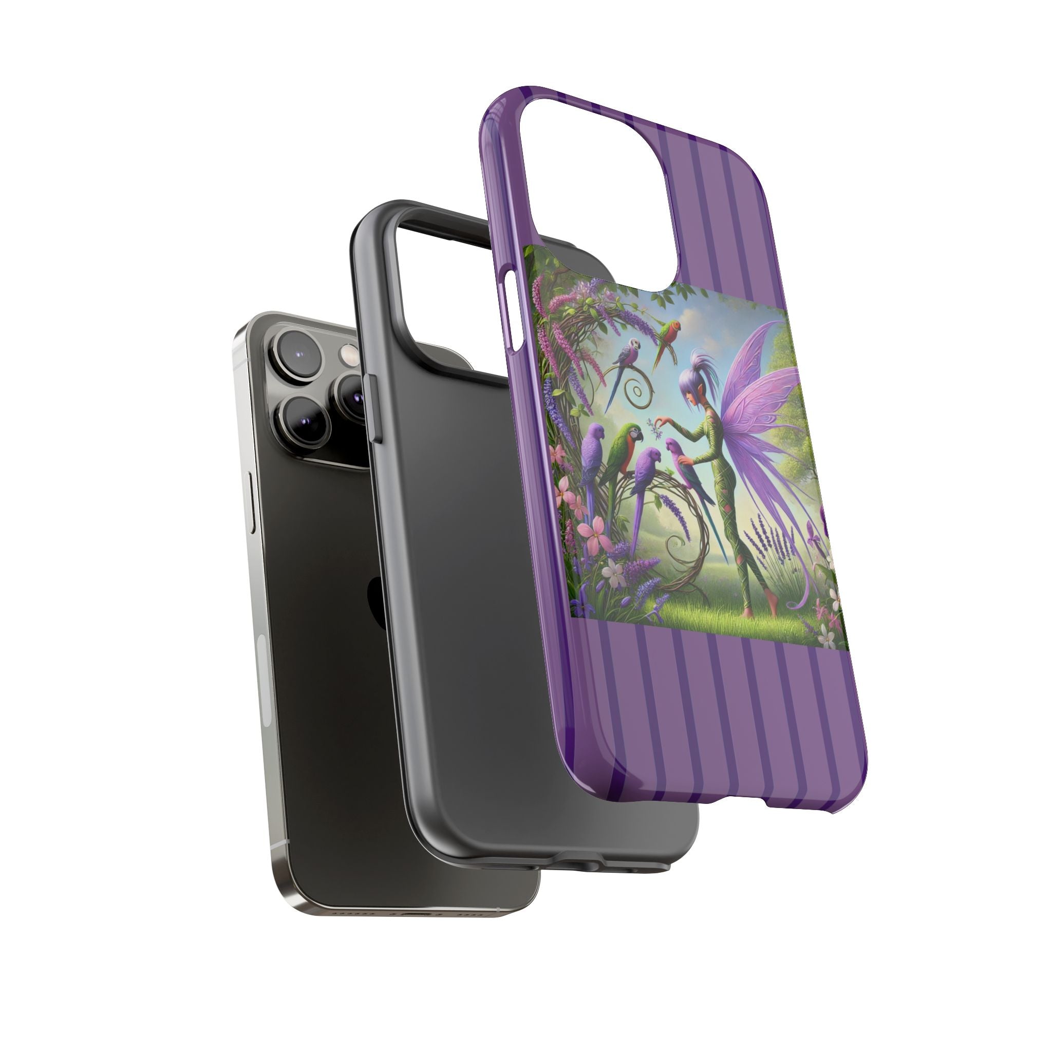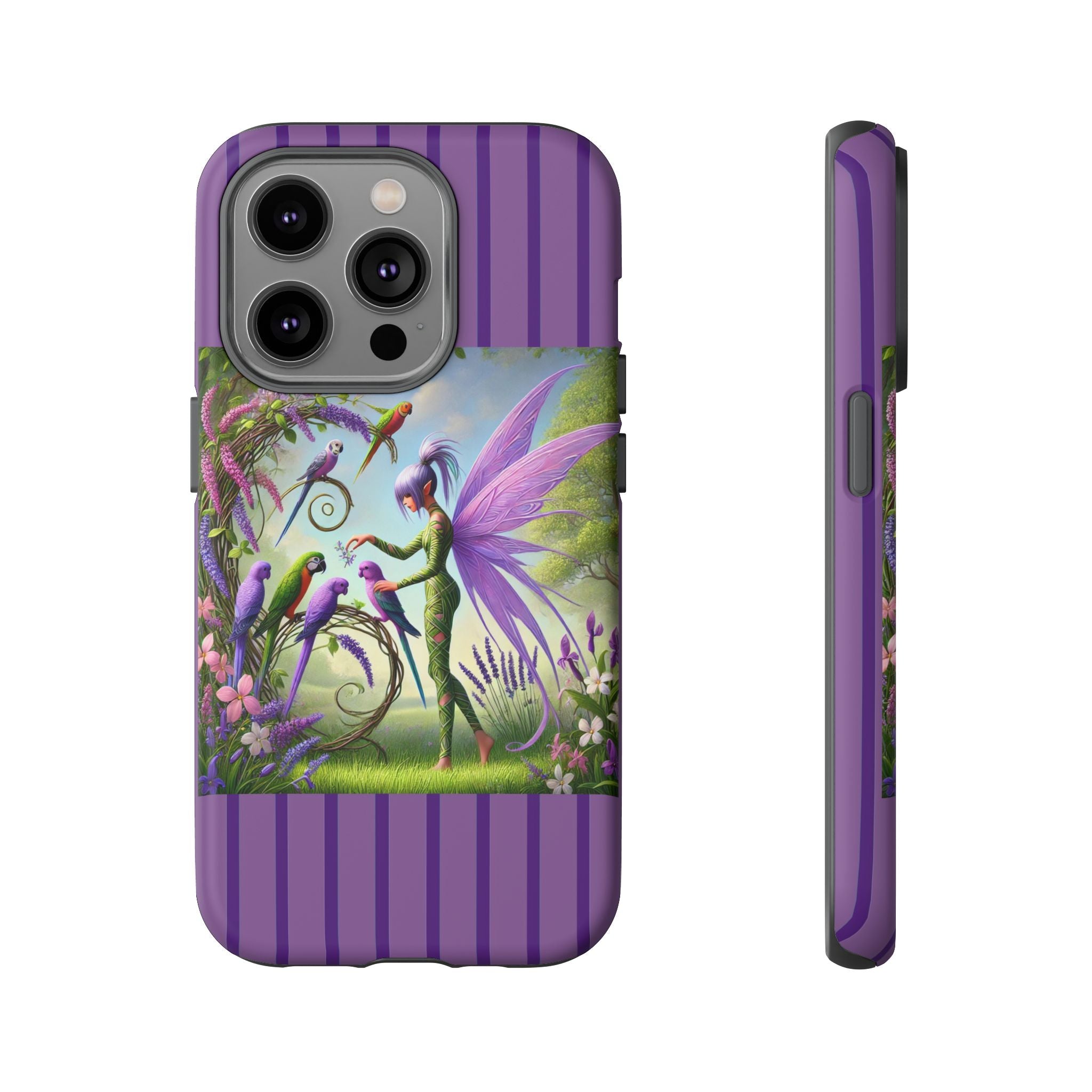 Lavender-Winged Fairy Phone Case transforms your phone into a scene of dreamy elegance and modern charm. Designed for iPhone, Samsung Galaxy, and Google Pixel devices, this case blends fine artistry with reliable protection. The design features a long, stylish fairy with shimmering lavender wings surrounded by vibrantly colored parrots under soft natural daylight. Lush greenery and blooms in shades of purple, pink, and white create an atmosphere of whimsy and freshness—capturing the magic of spring with contemporary sophistication. Choose a glossy or matte finish to bring this enchanting illustration to life while keeping your phone safe and stylish.