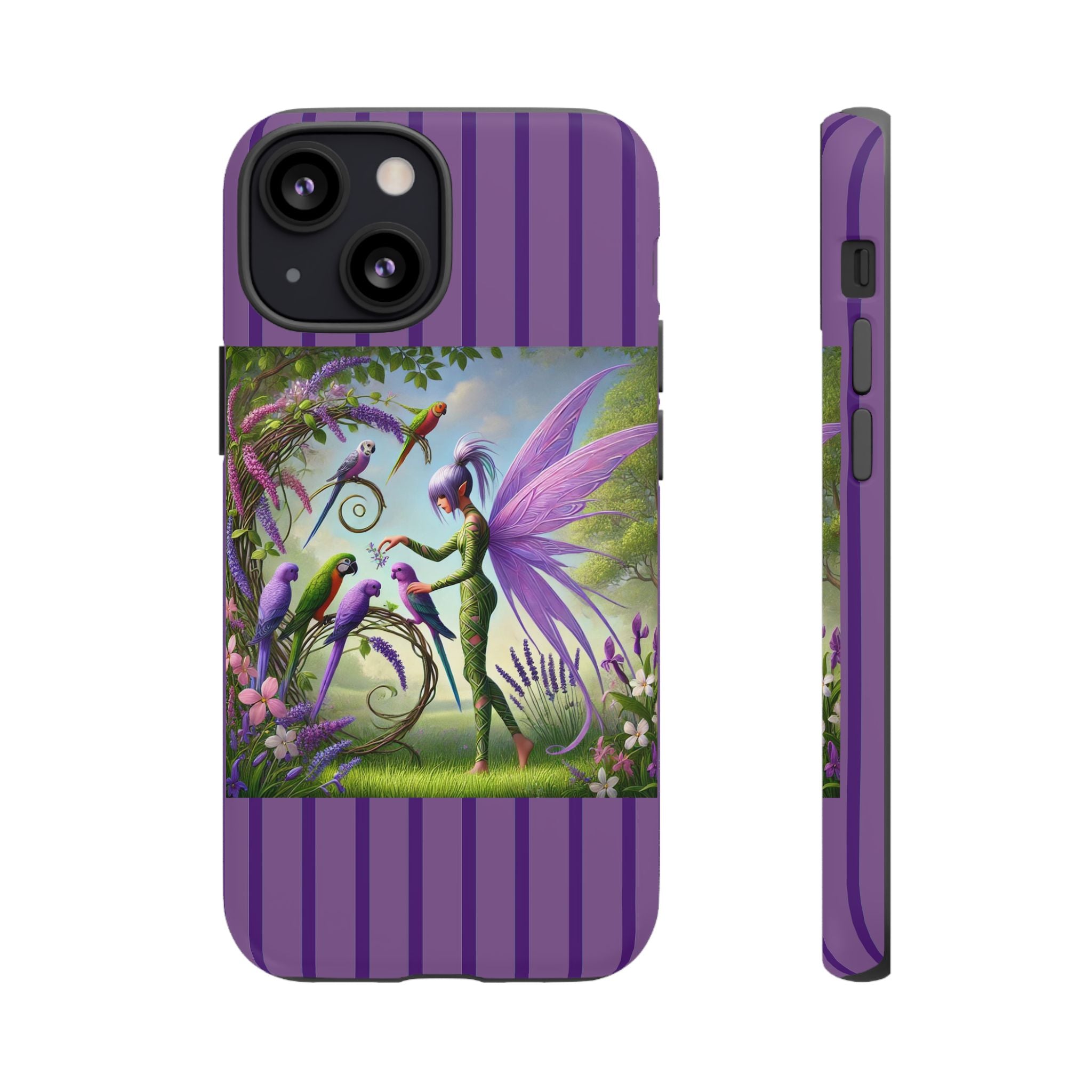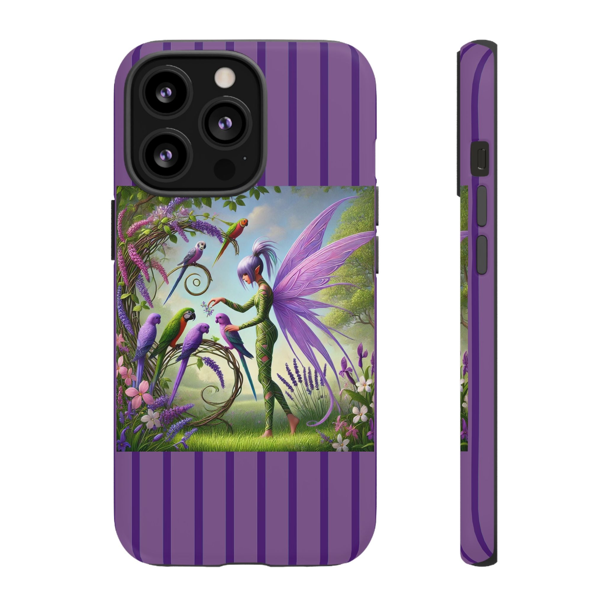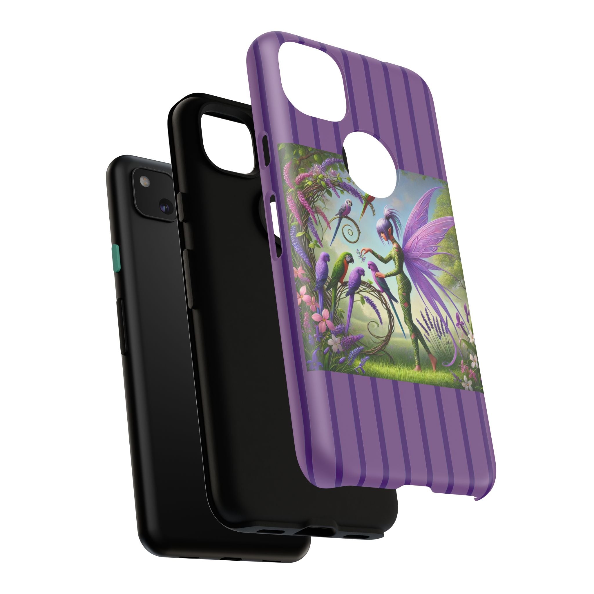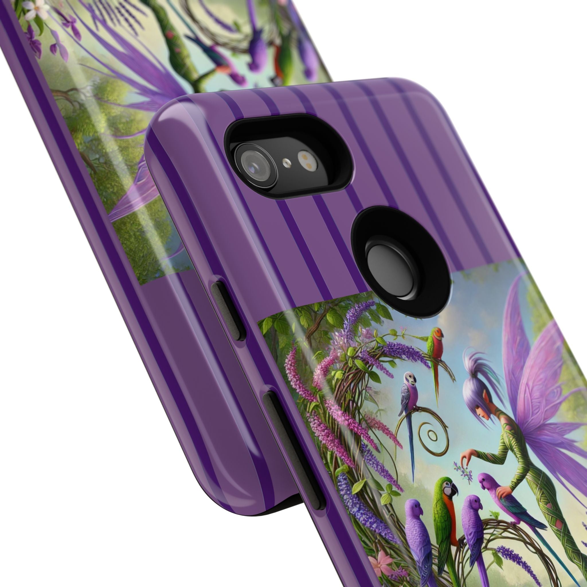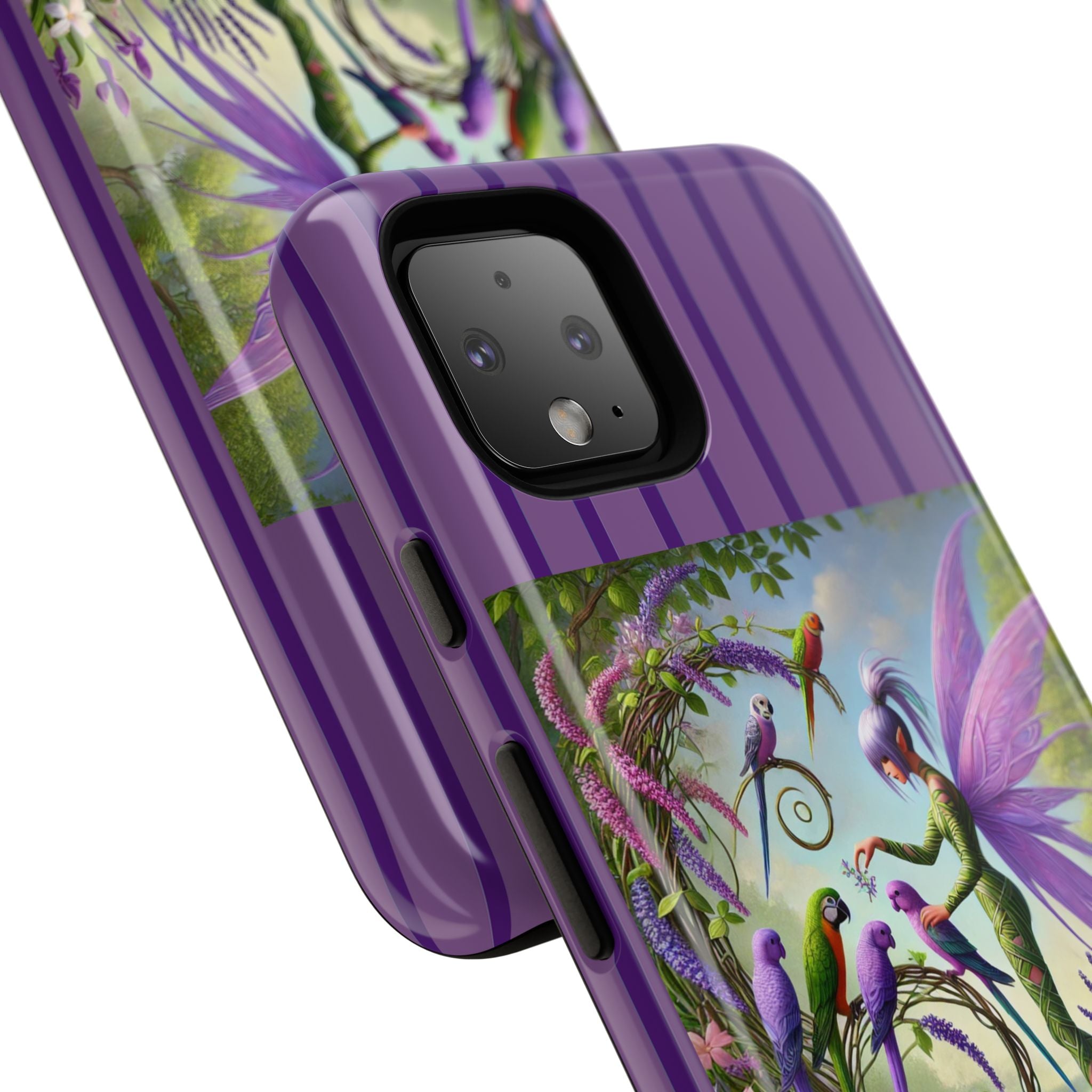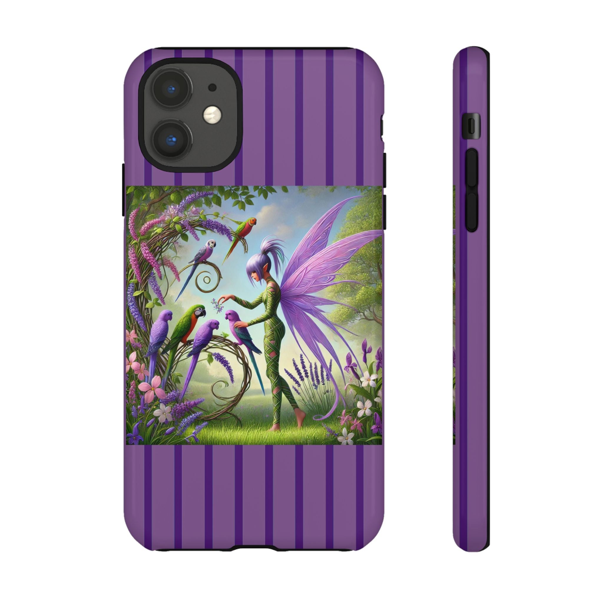 Lavender-Winged Fairy Phone Case transforms your phone into a scene of dreamy elegance and modern charm. Designed for iPhone, Samsung Galaxy, and Google Pixel devices, this case blends fine artistry with reliable protection. The design features a long, stylish fairy with shimmering lavender wings surrounded by vibrantly colored parrots under soft natural daylight. Lush greenery and blooms in shades of purple, pink, and white create an atmosphere of whimsy and freshness—capturing the magic of spring with contemporary sophistication. Choose a glossy or matte finish to bring this enchanting illustration to life while keeping your phone safe and stylish.