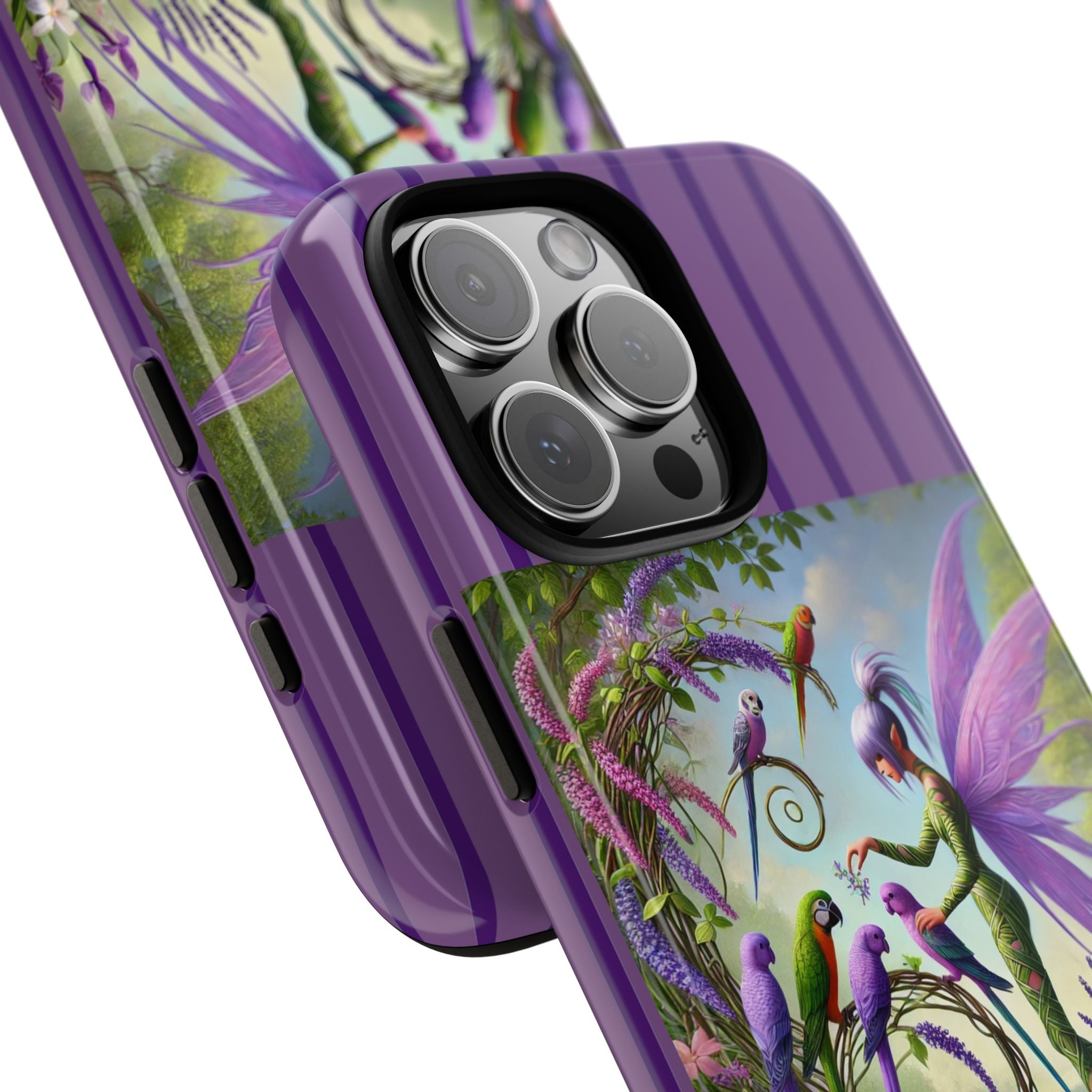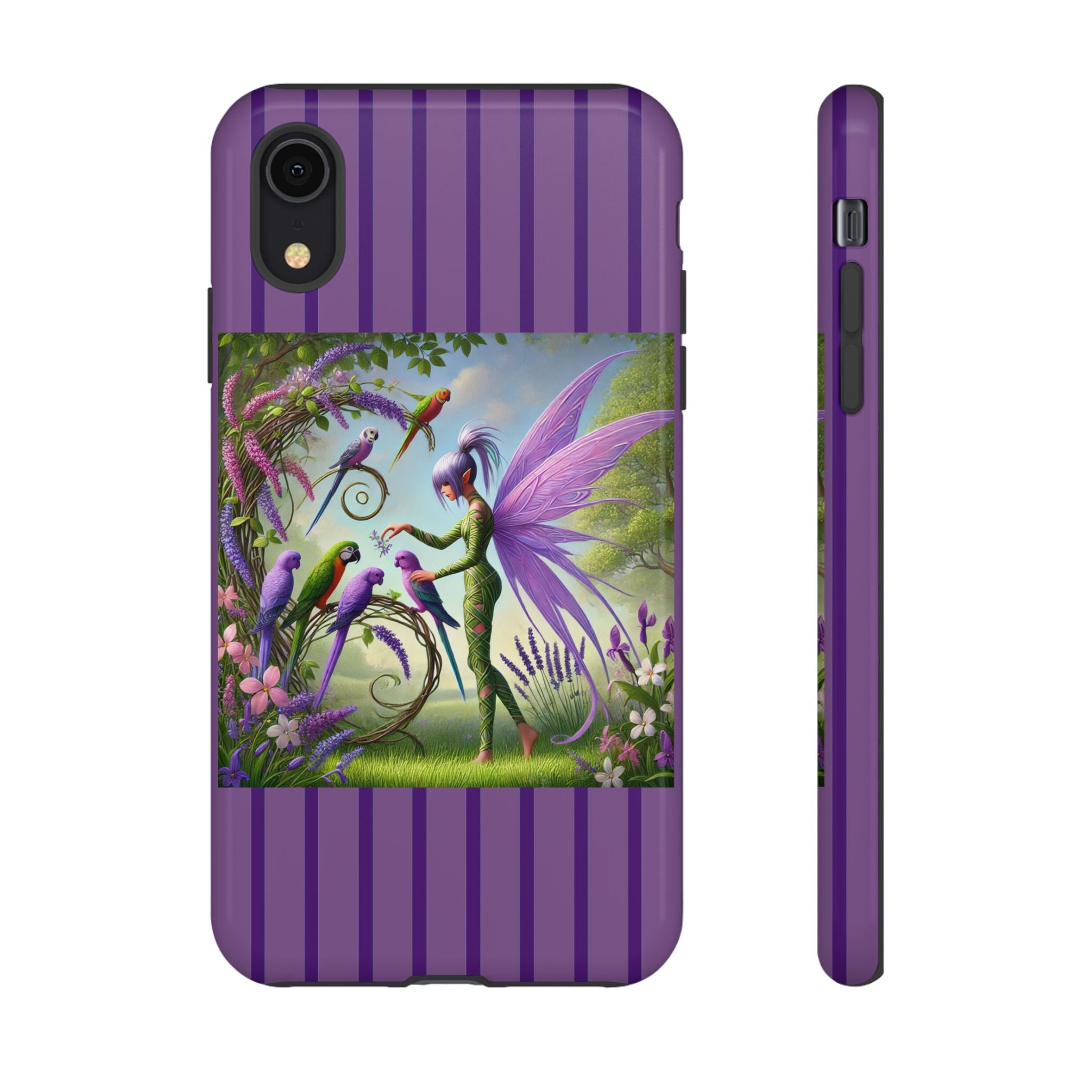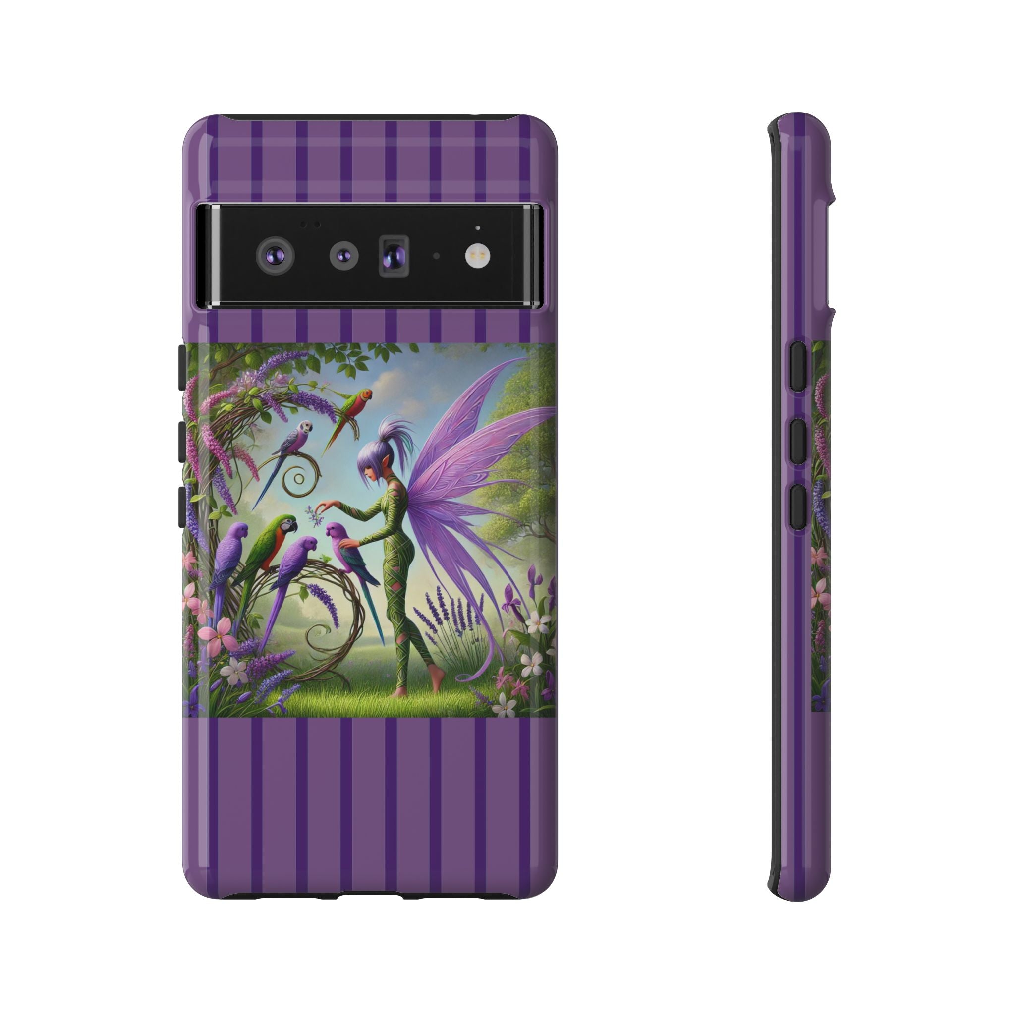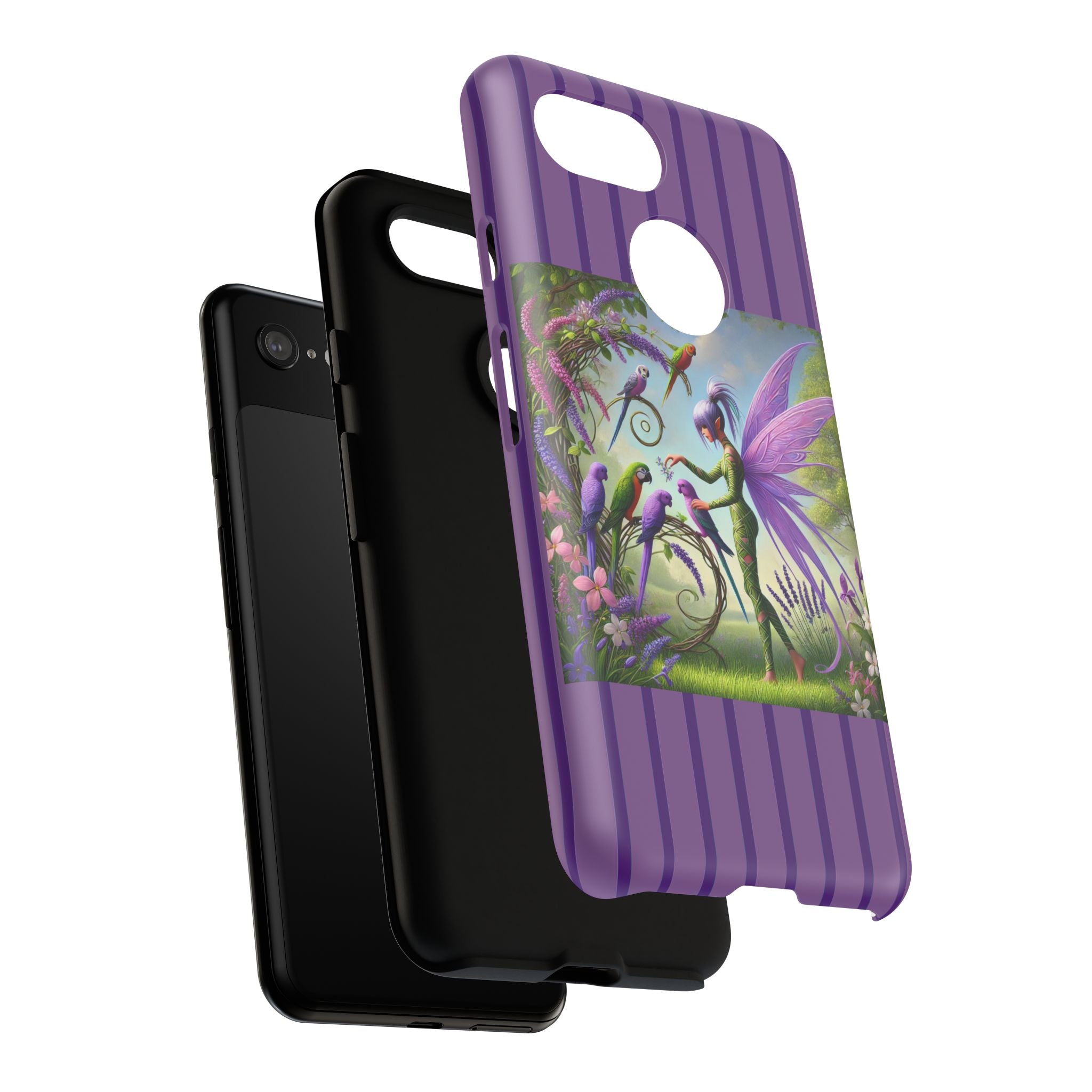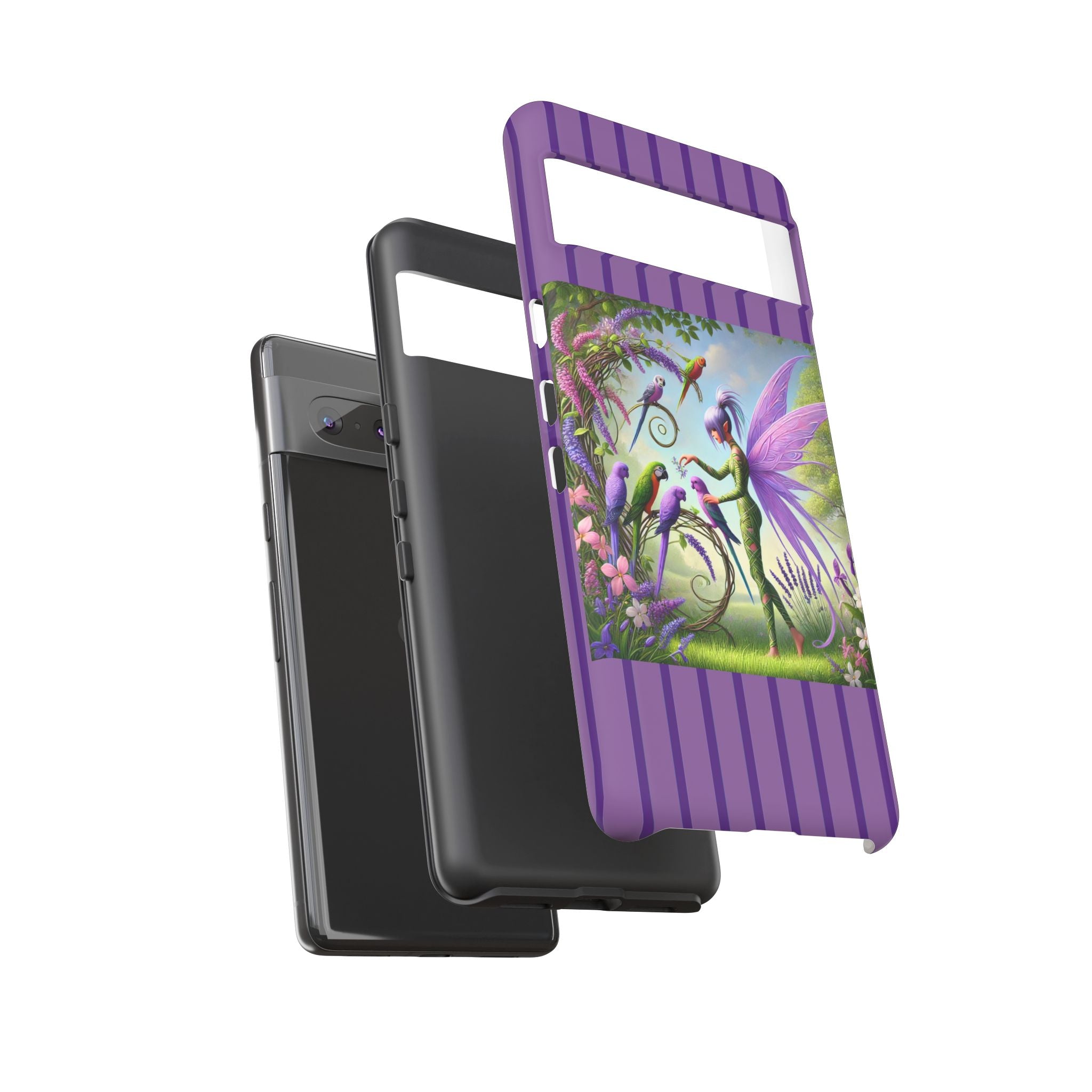 Lavender-Winged Fairy Phone Case transforms your phone into a scene of dreamy elegance and modern charm. Designed for iPhone, Samsung Galaxy, and Google Pixel devices, this case blends fine artistry with reliable protection. The design features a long, stylish fairy with shimmering lavender wings surrounded by vibrantly colored parrots under soft natural daylight. Lush greenery and blooms in shades of purple, pink, and white create an atmosphere of whimsy and freshness—capturing the magic of spring with contemporary sophistication. Choose a glossy or matte finish to bring this enchanting illustration to life while keeping your phone safe and stylish.