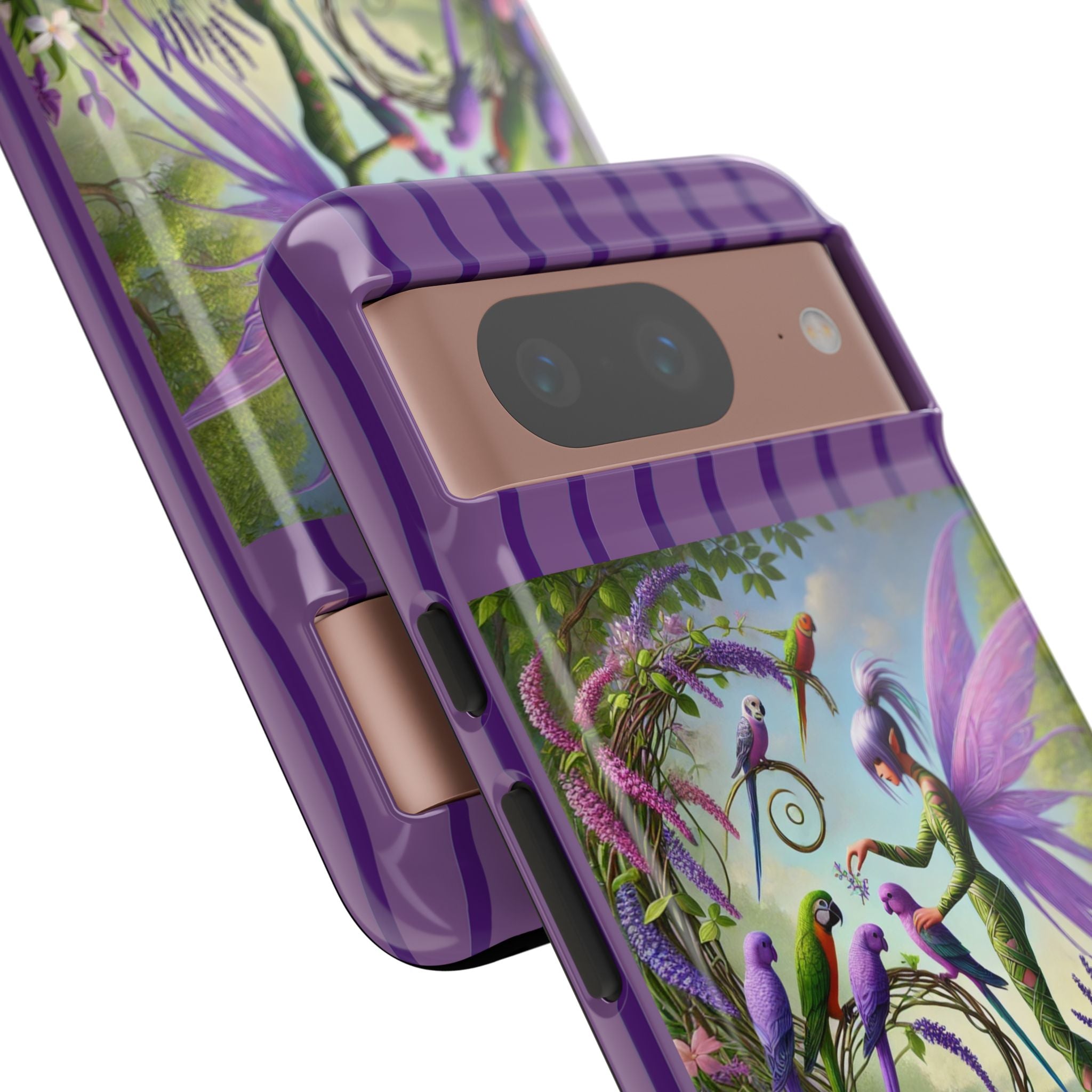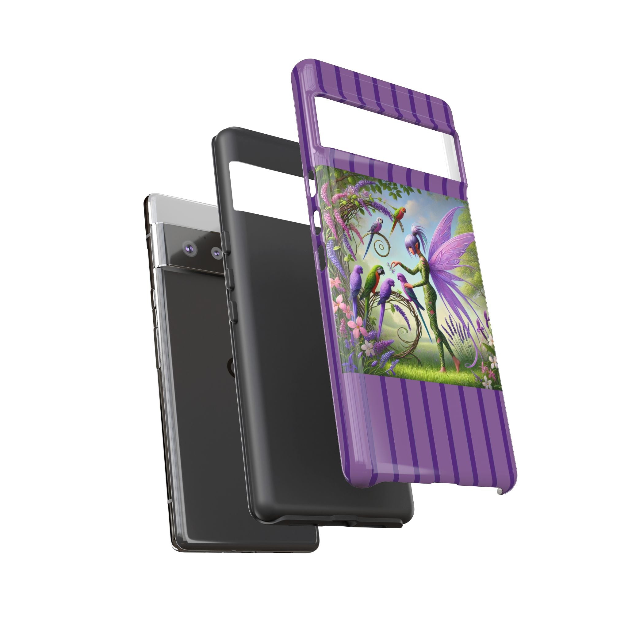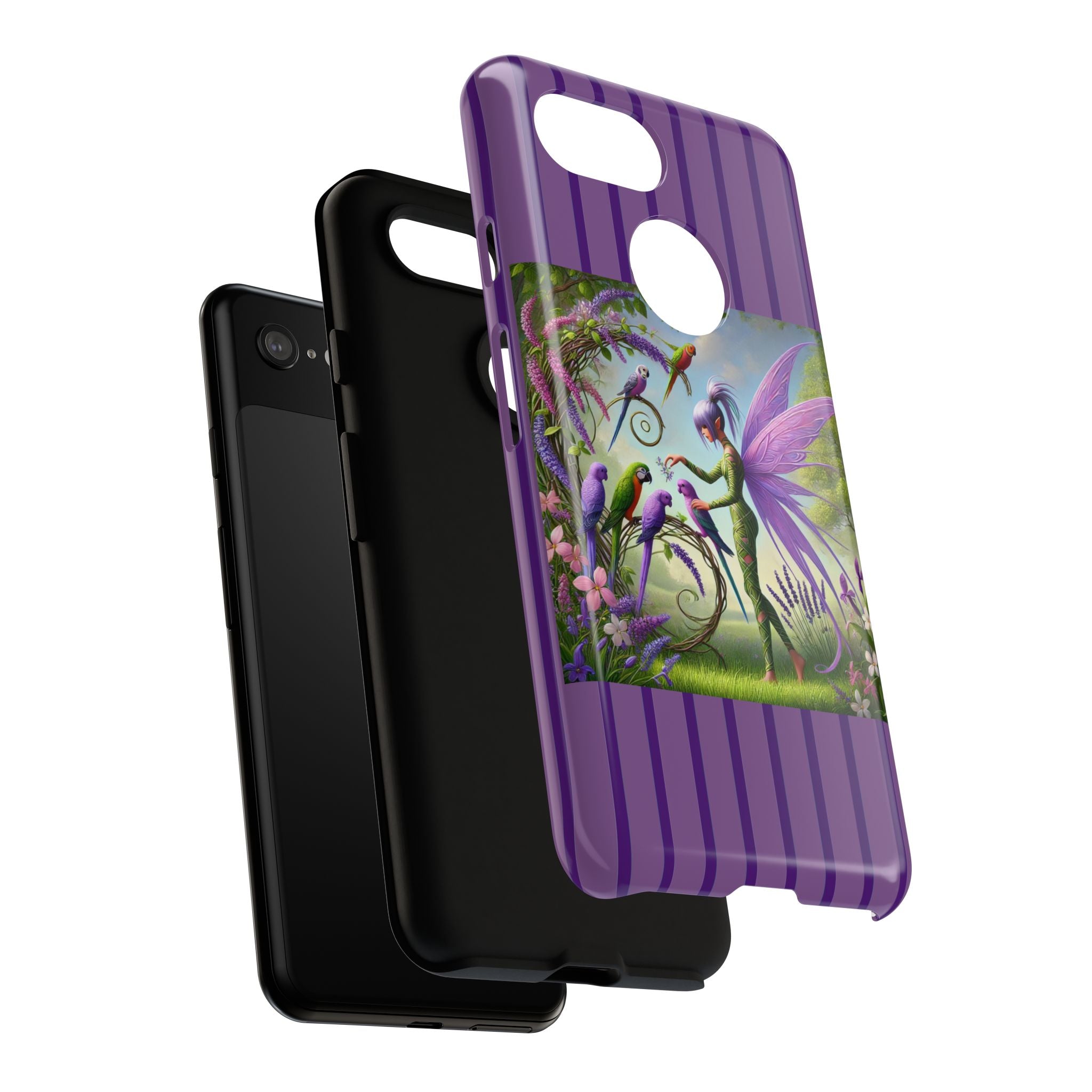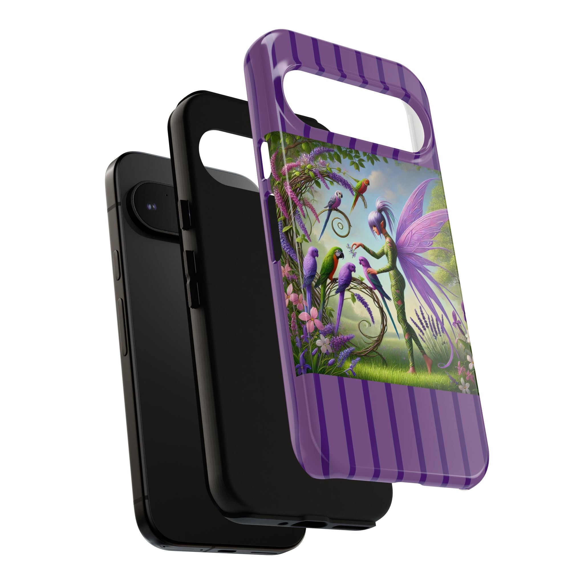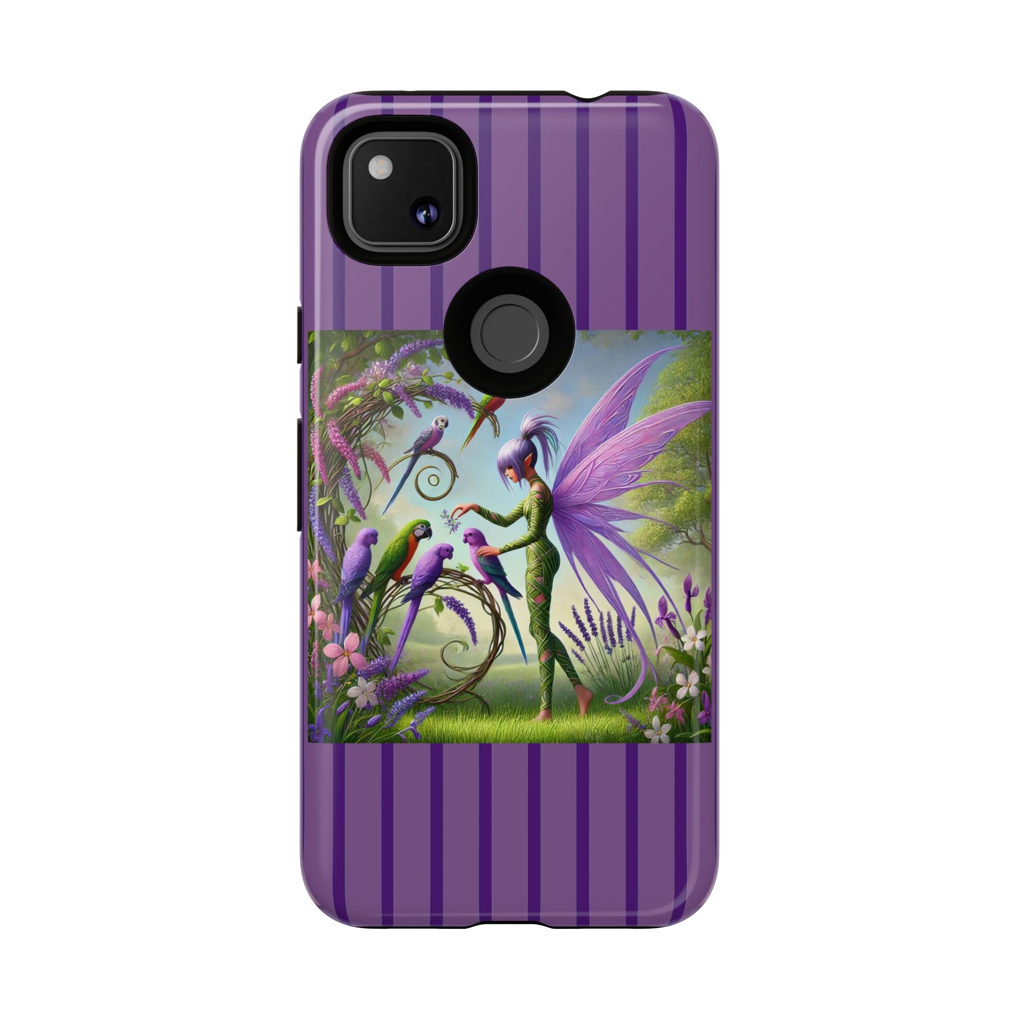Lavender-Winged Fairy Phone Case transforms your phone into a scene of dreamy elegance and modern charm. Designed for iPhone, Samsung Galaxy, and Google Pixel devices, this case blends fine artistry with reliable protection. The design features a long, stylish fairy with shimmering lavender wings surrounded by vibrantly colored parrots under soft natural daylight. Lush greenery and blooms in shades of purple, pink, and white create an atmosphere of whimsy and freshness—capturing the magic of spring with contemporary sophistication. Choose a glossy or matte finish to bring this enchanting illustration to life while keeping your phone safe and stylish.