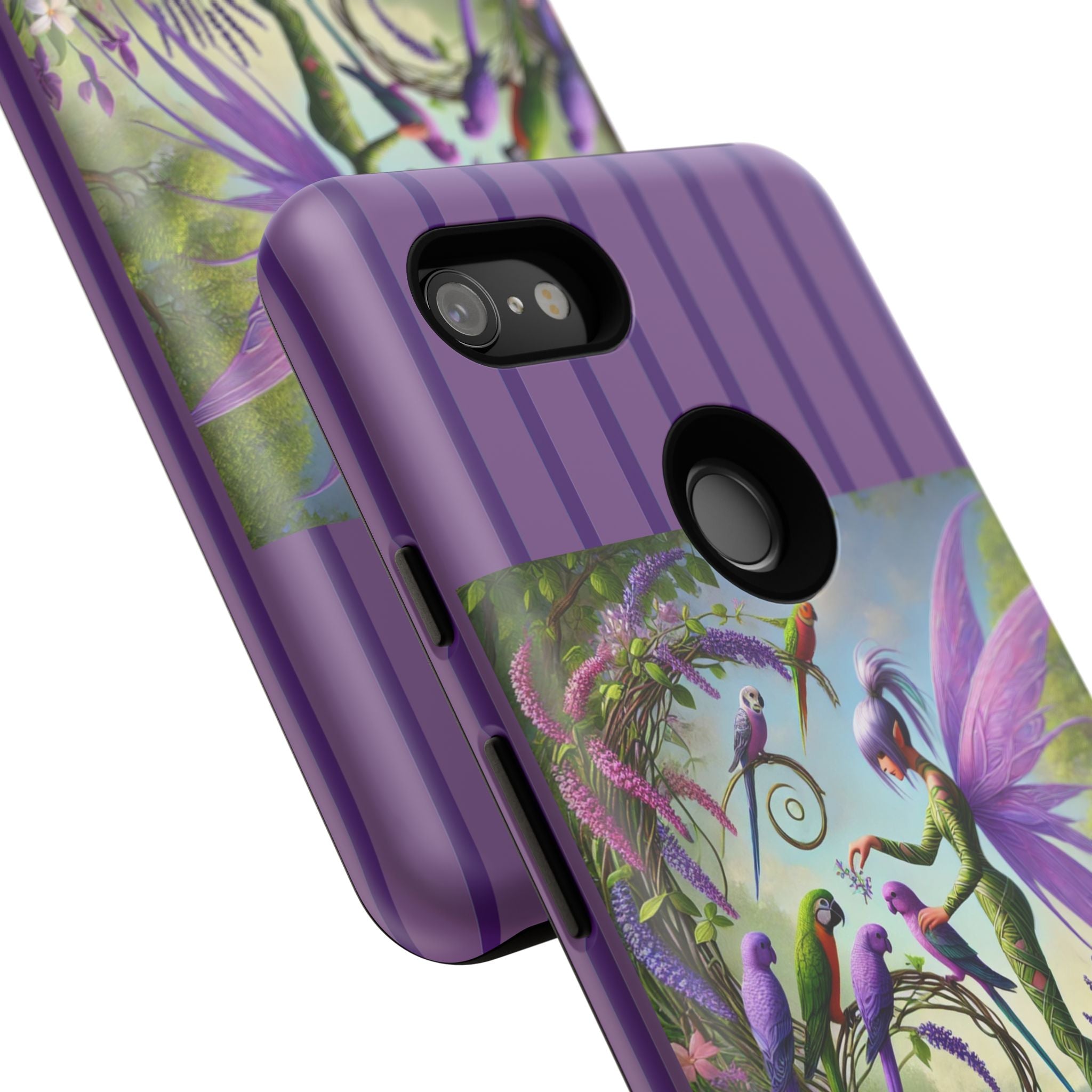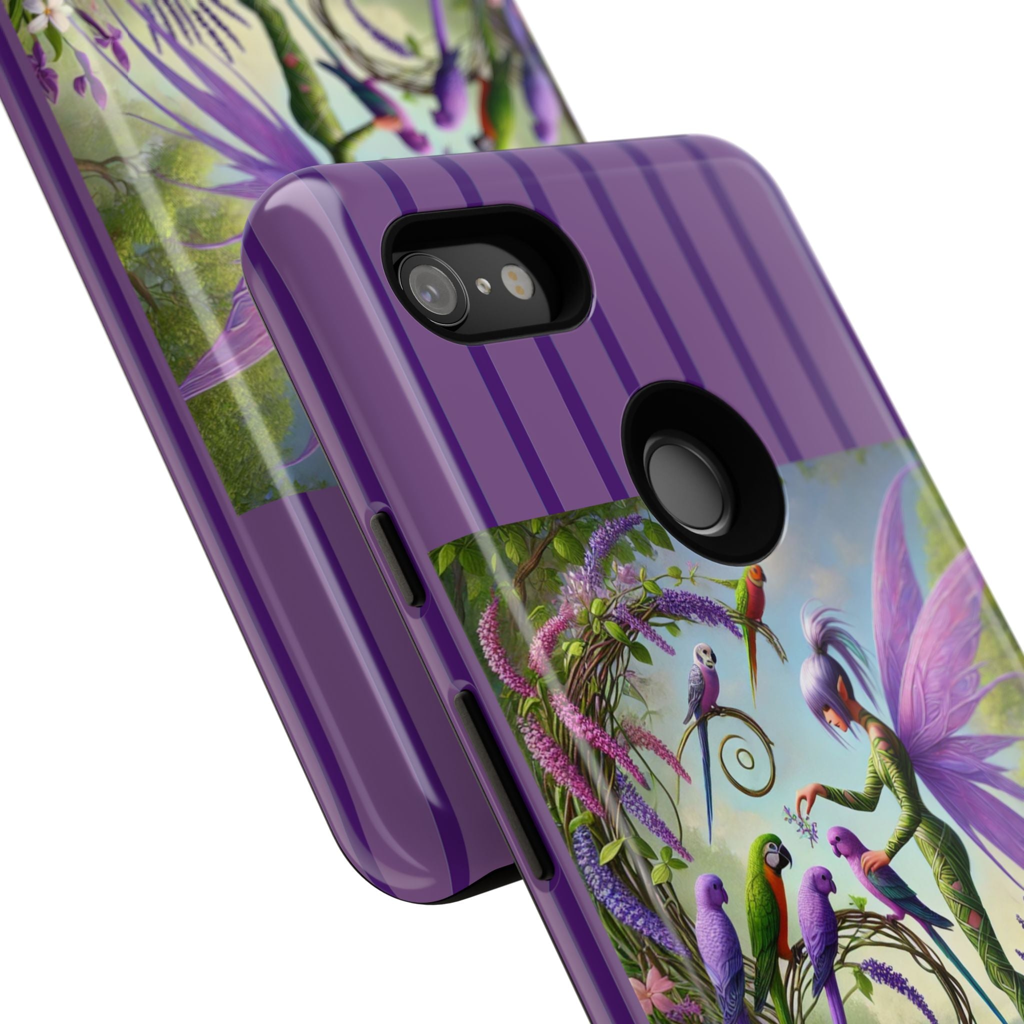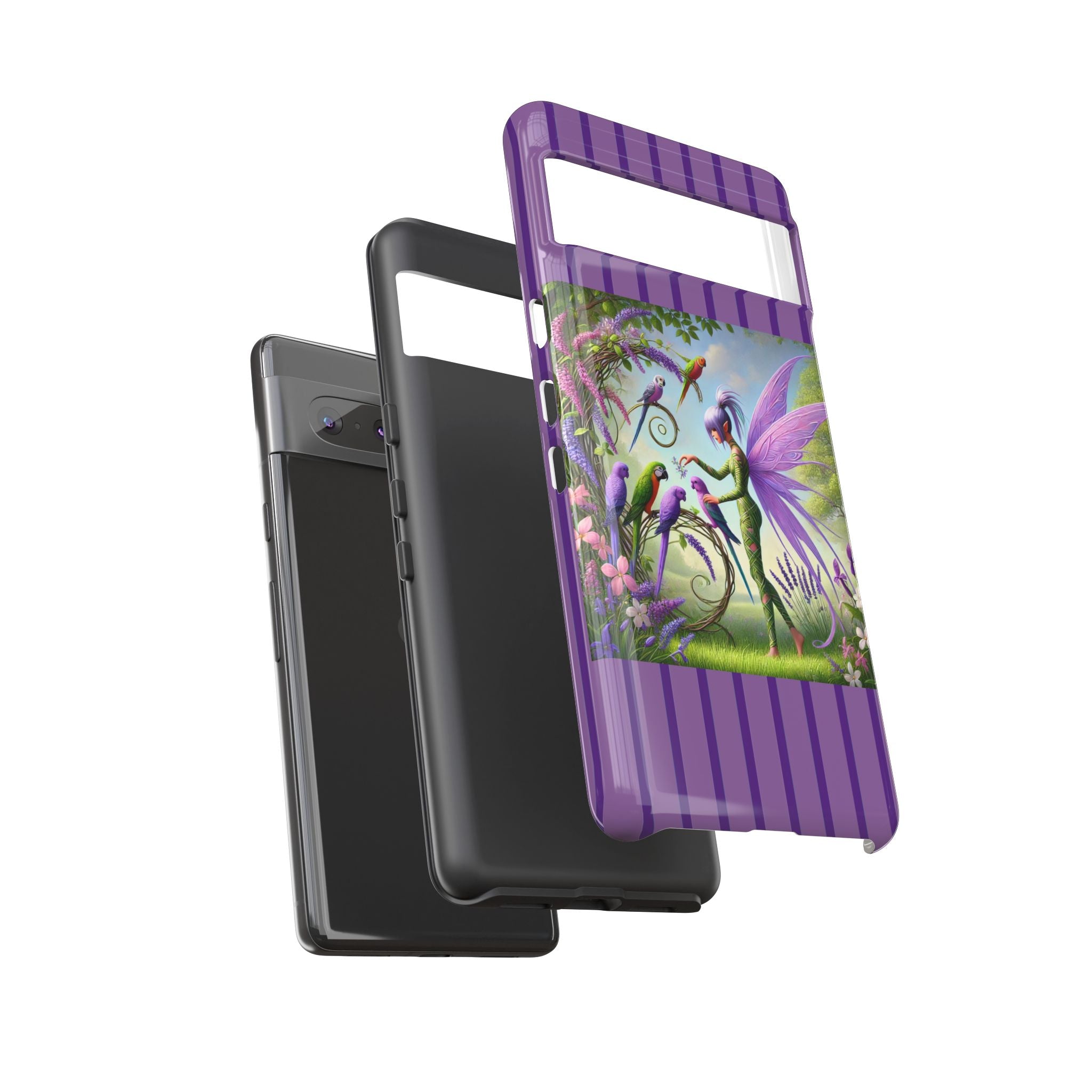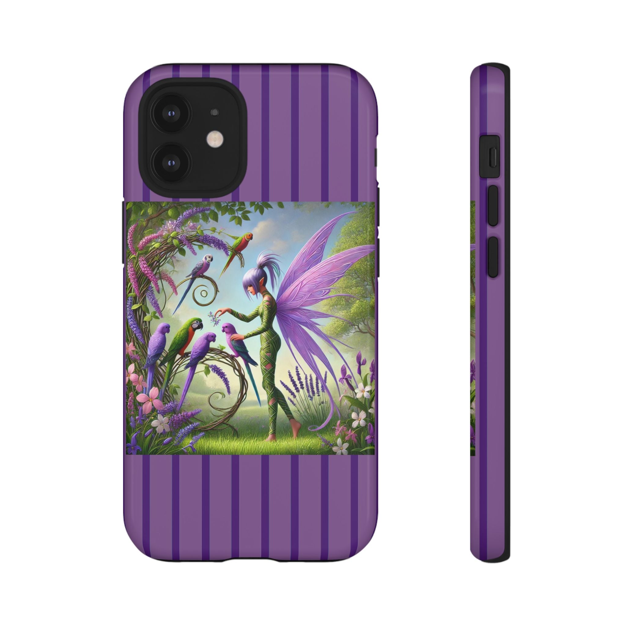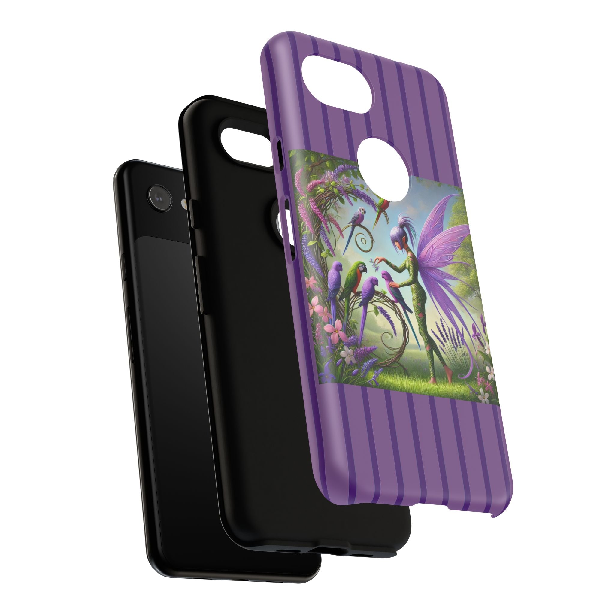 Lavender-Winged Fairy Phone Case transforms your phone into a scene of dreamy elegance and modern charm. Designed for iPhone, Samsung Galaxy, and Google Pixel devices, this case blends fine artistry with reliable protection. The design features a long, stylish fairy with shimmering lavender wings surrounded by vibrantly colored parrots under soft natural daylight. Lush greenery and blooms in shades of purple, pink, and white create an atmosphere of whimsy and freshness—capturing the magic of spring with contemporary sophistication. Choose a glossy or matte finish to bring this enchanting illustration to life while keeping your phone safe and stylish.