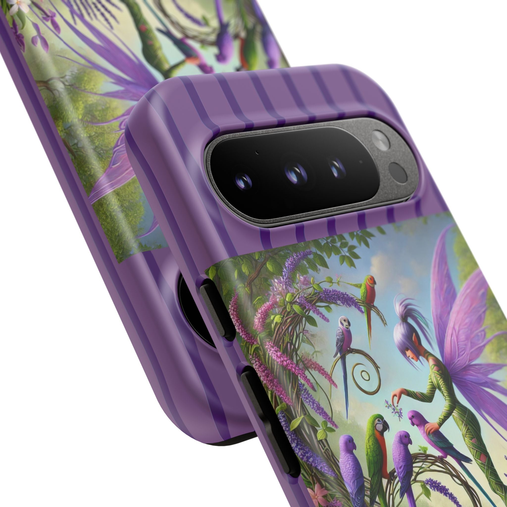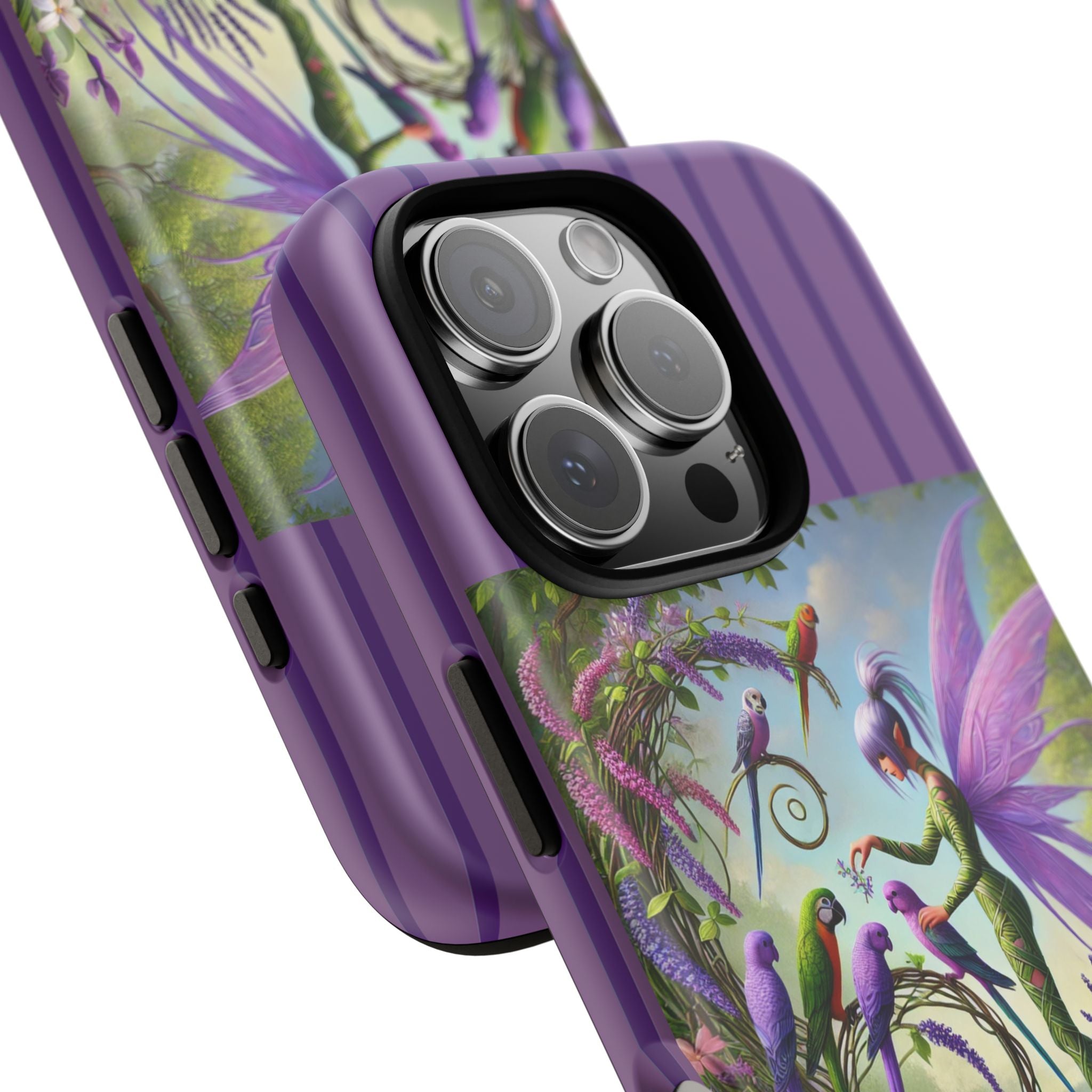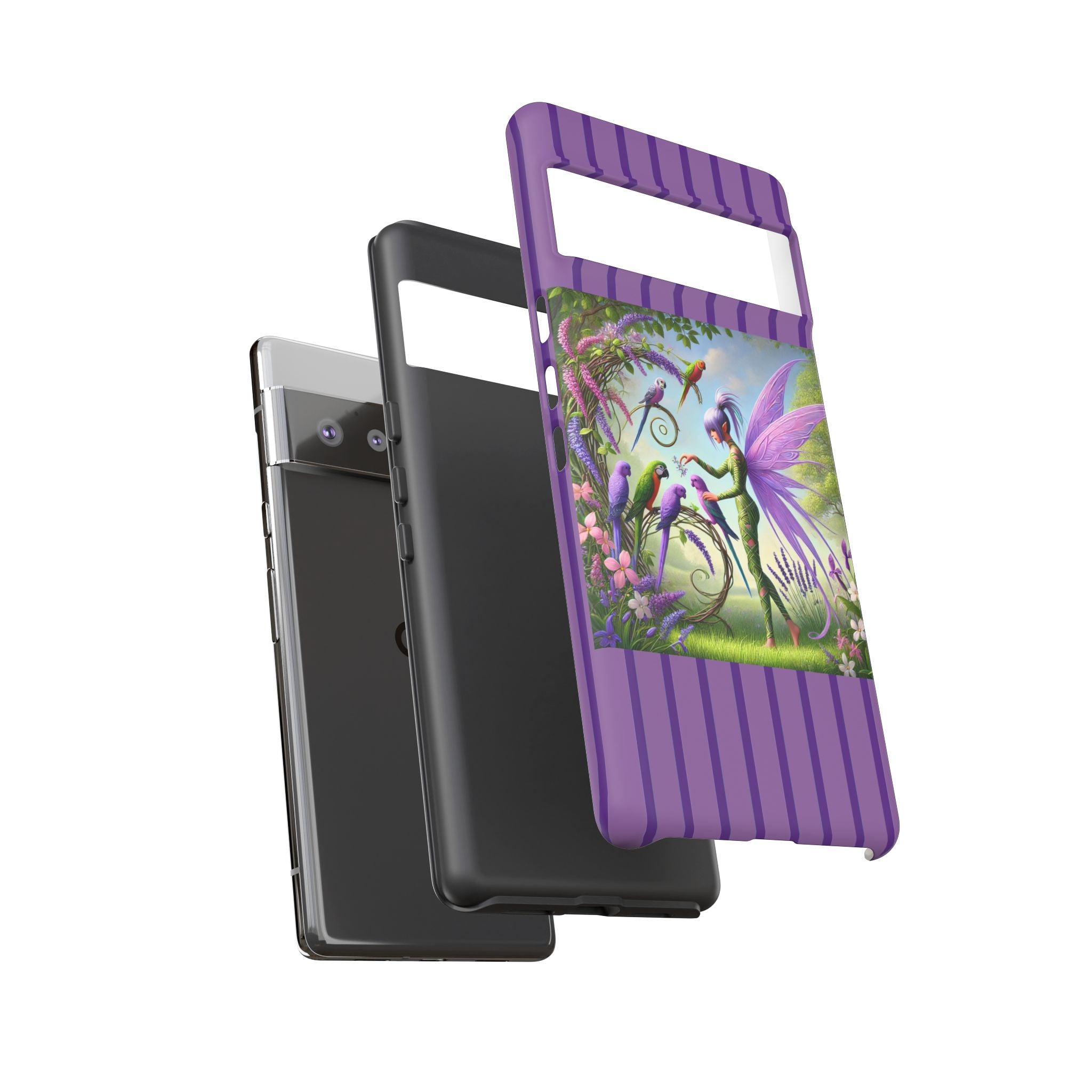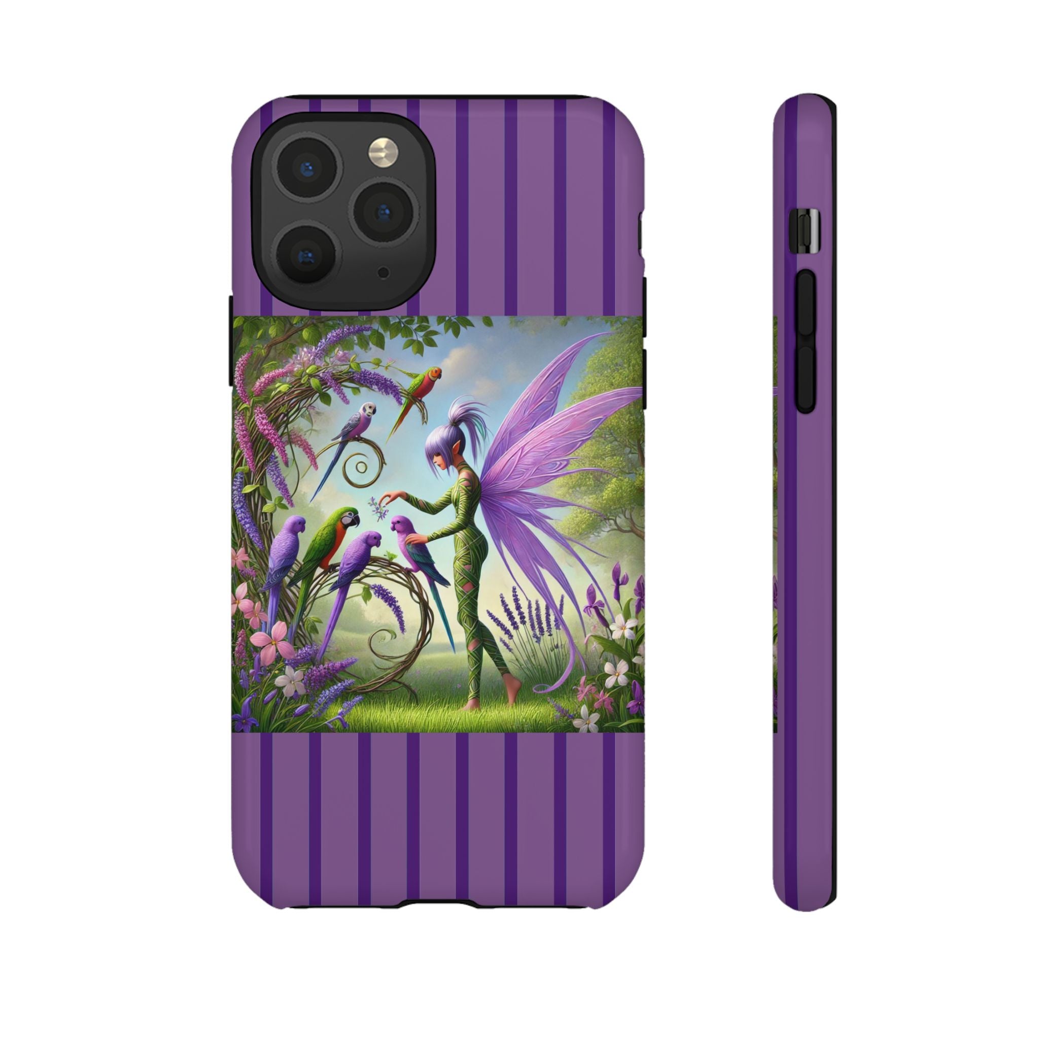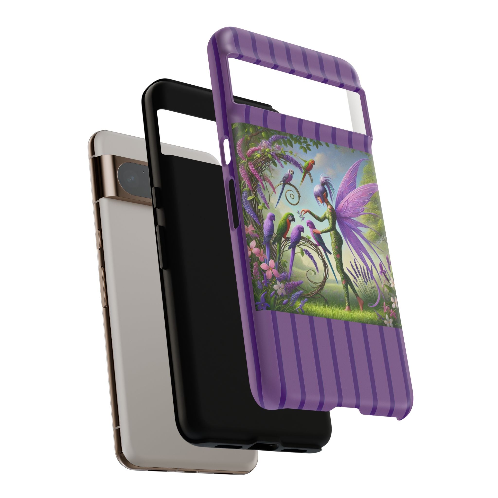 Lavender-Winged Fairy Phone Case transforms your phone into a scene of dreamy elegance and modern charm. Designed for iPhone, Samsung Galaxy, and Google Pixel devices, this case blends fine artistry with reliable protection. The design features a long, stylish fairy with shimmering lavender wings surrounded by vibrantly colored parrots under soft natural daylight. Lush greenery and blooms in shades of purple, pink, and white create an atmosphere of whimsy and freshness—capturing the magic of spring with contemporary sophistication. Choose a glossy or matte finish to bring this enchanting illustration to life while keeping your phone safe and stylish.