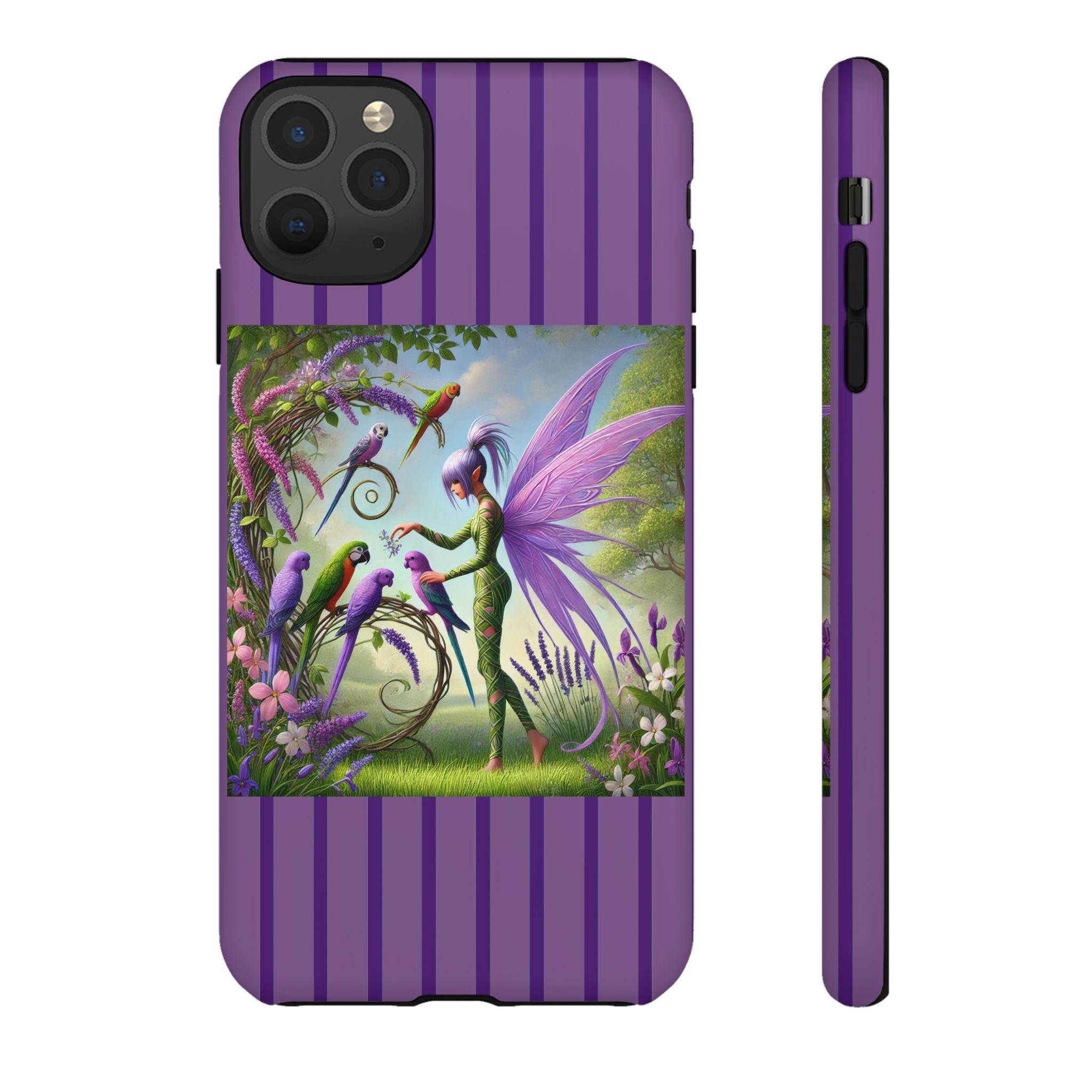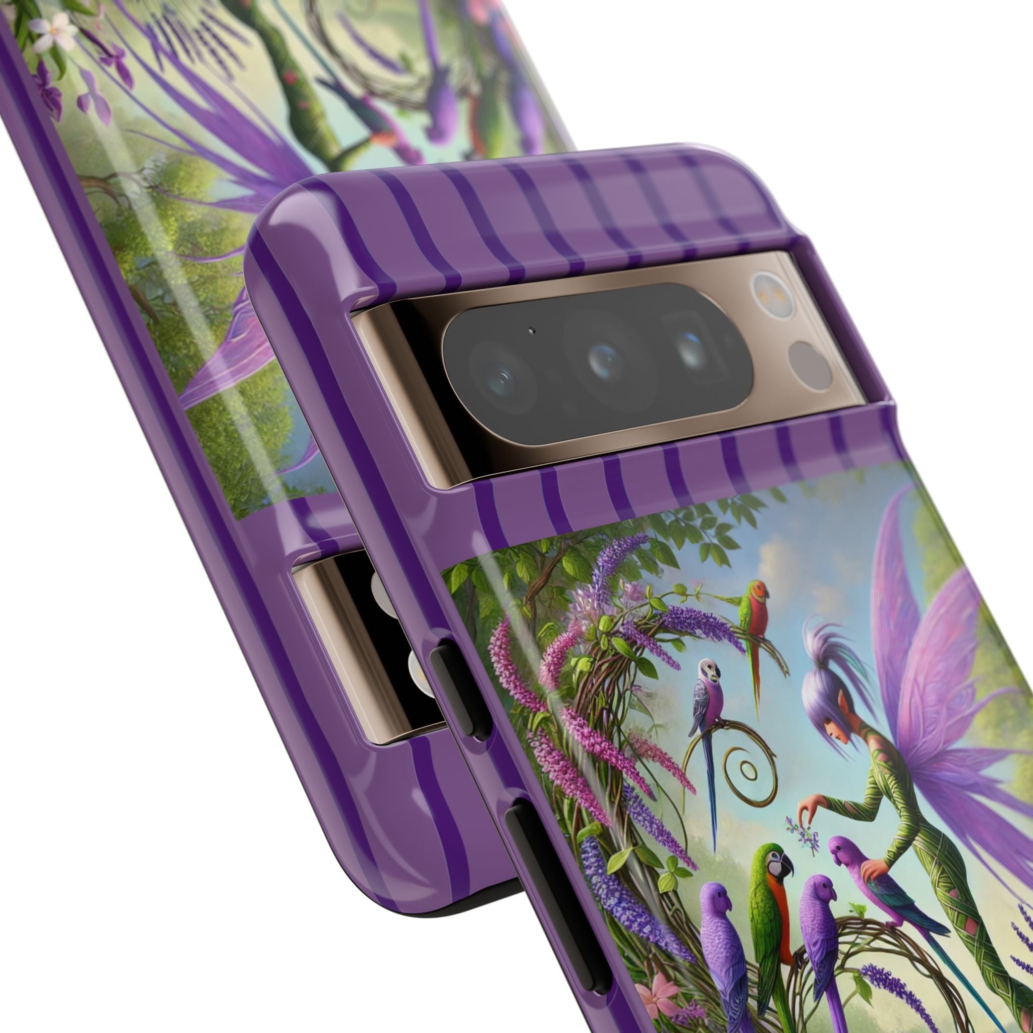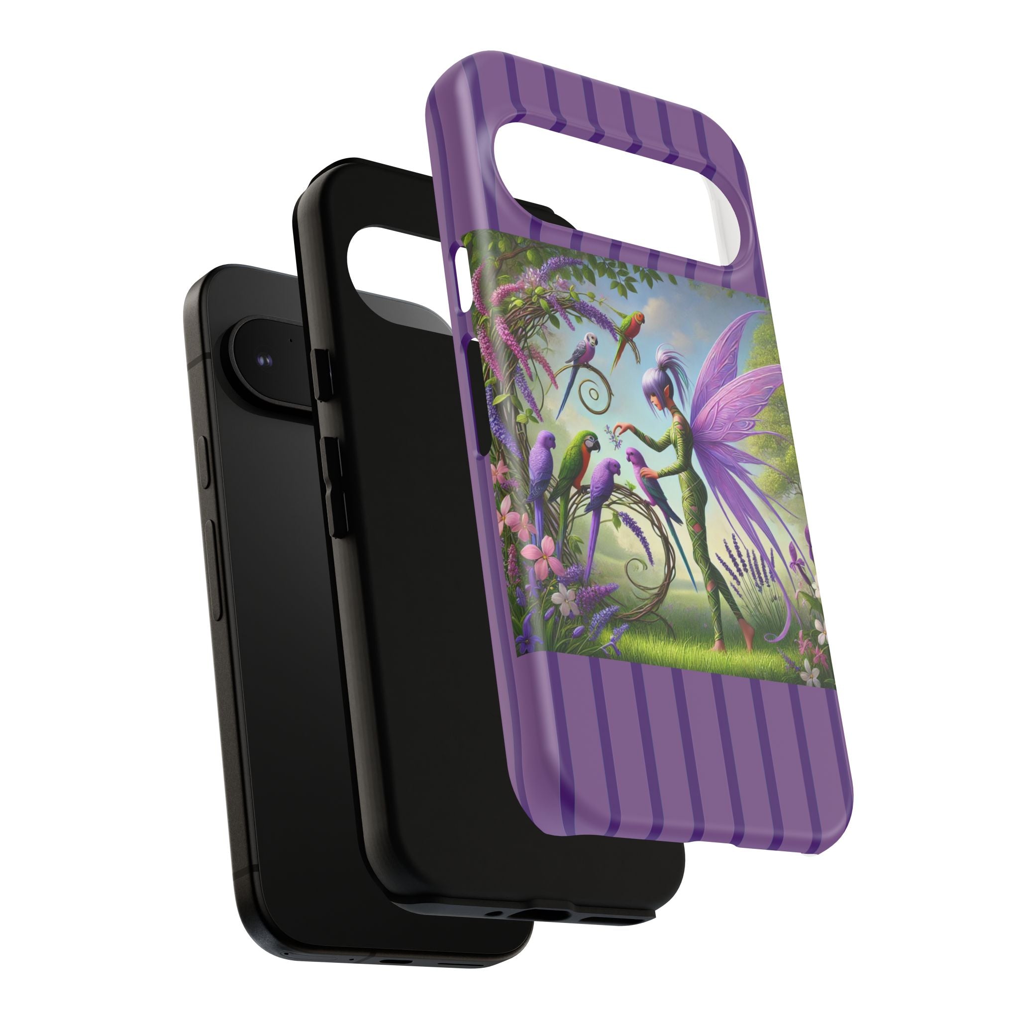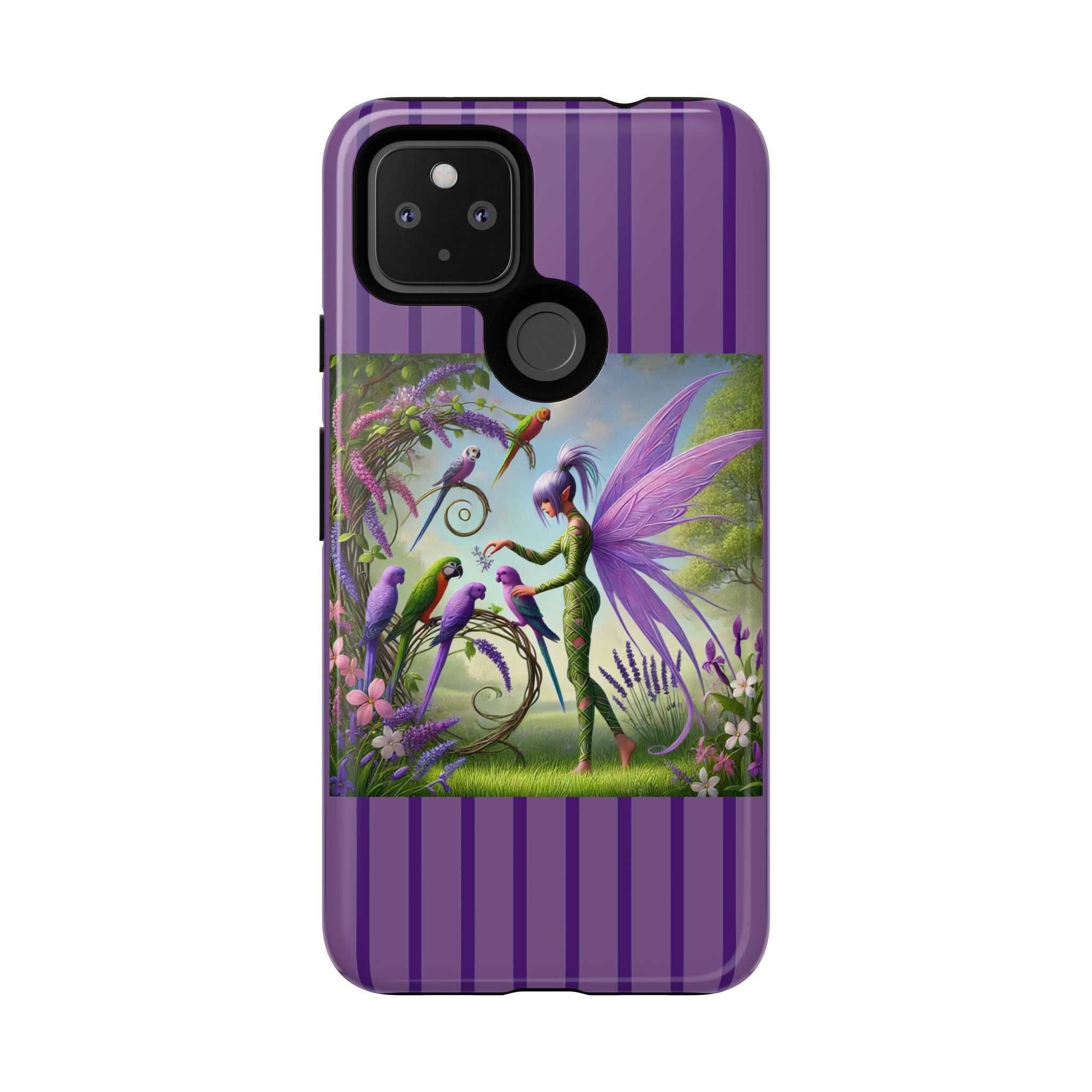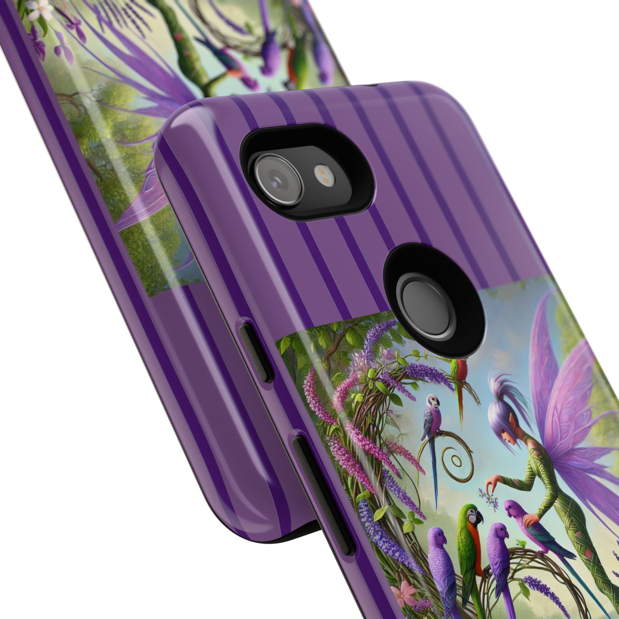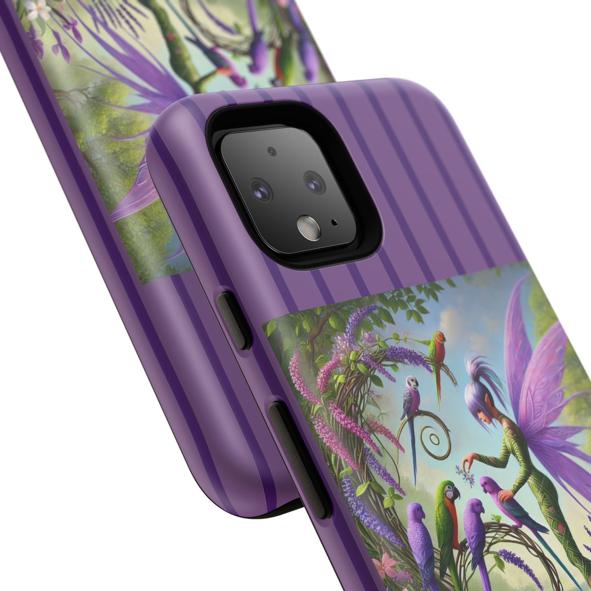 Lavender-Winged Fairy Phone Case transforms your phone into a scene of dreamy elegance and modern charm. Designed for iPhone, Samsung Galaxy, and Google Pixel devices, this case blends fine artistry with reliable protection. The design features a long, stylish fairy with shimmering lavender wings surrounded by vibrantly colored parrots under soft natural daylight. Lush greenery and blooms in shades of purple, pink, and white create an atmosphere of whimsy and freshness—capturing the magic of spring with contemporary sophistication. Choose a glossy or matte finish to bring this enchanting illustration to life while keeping your phone safe and stylish.