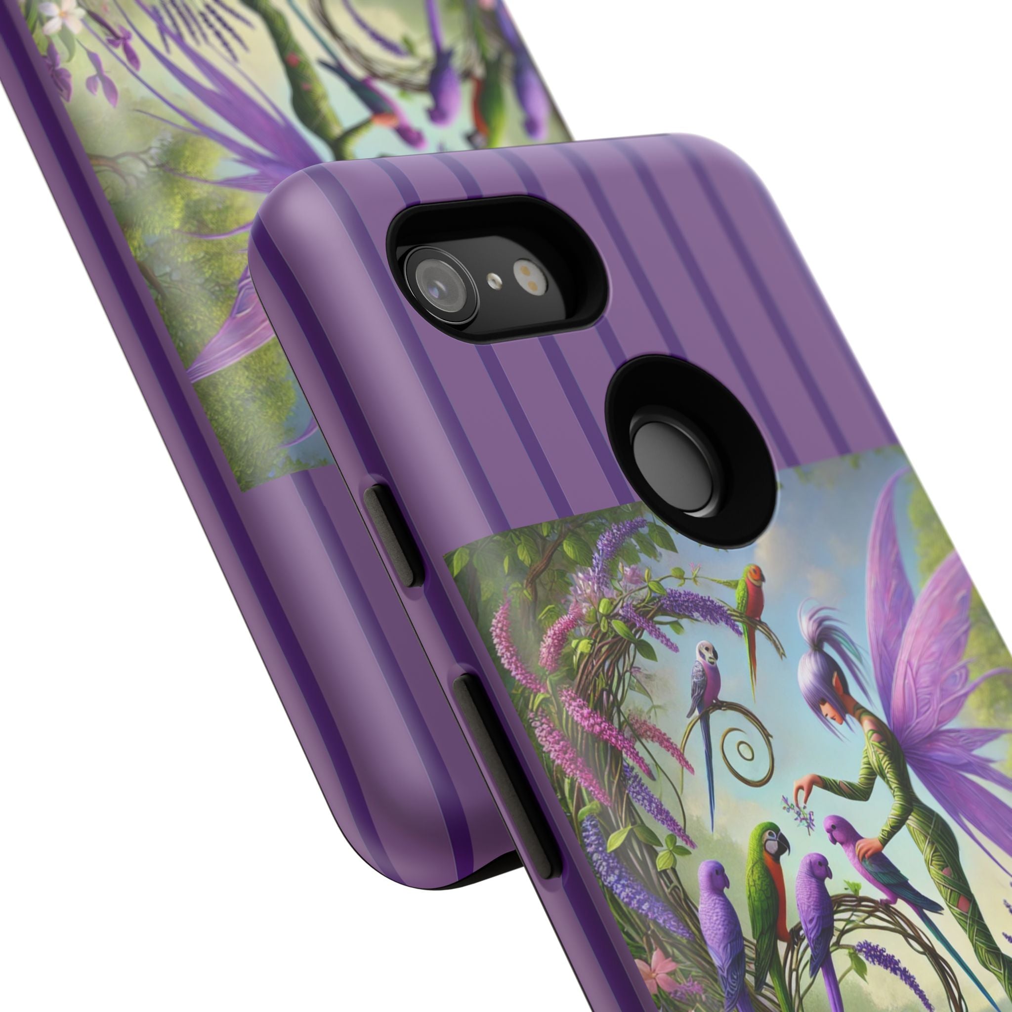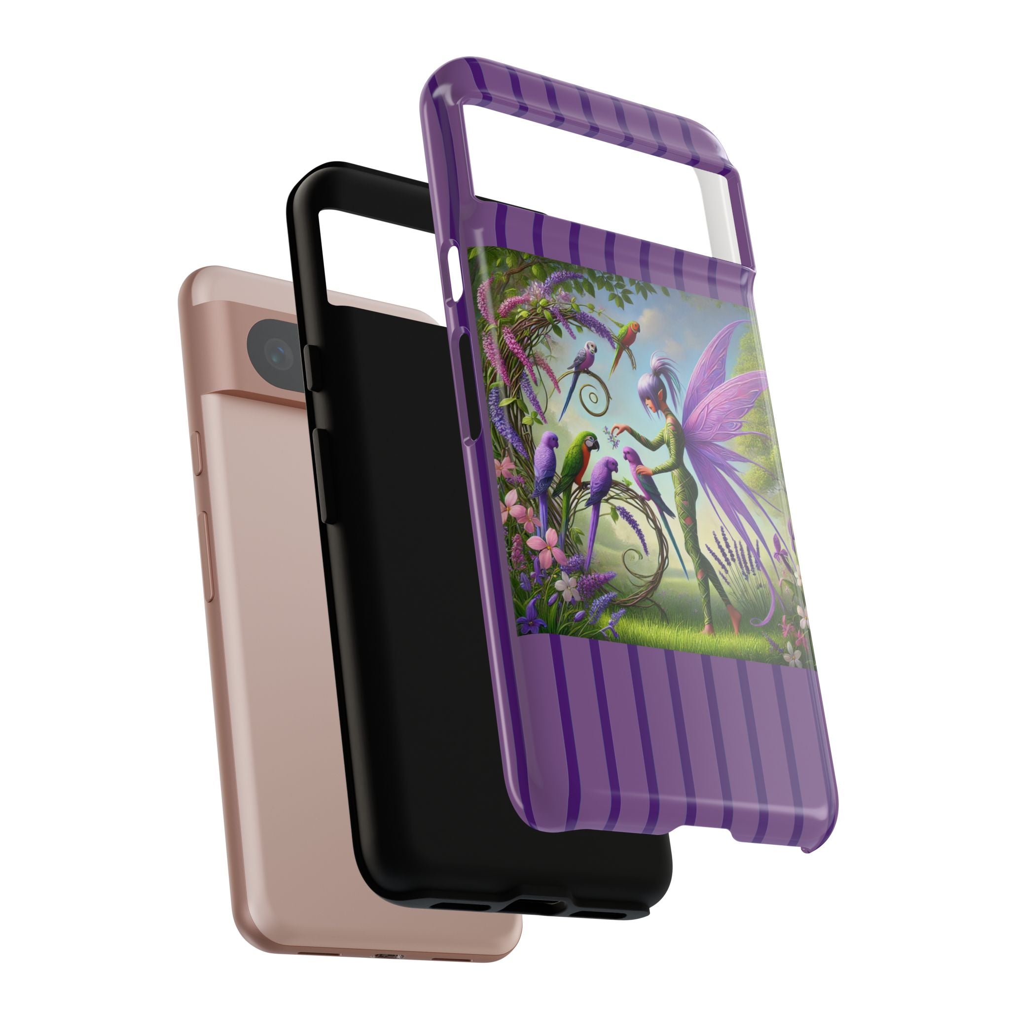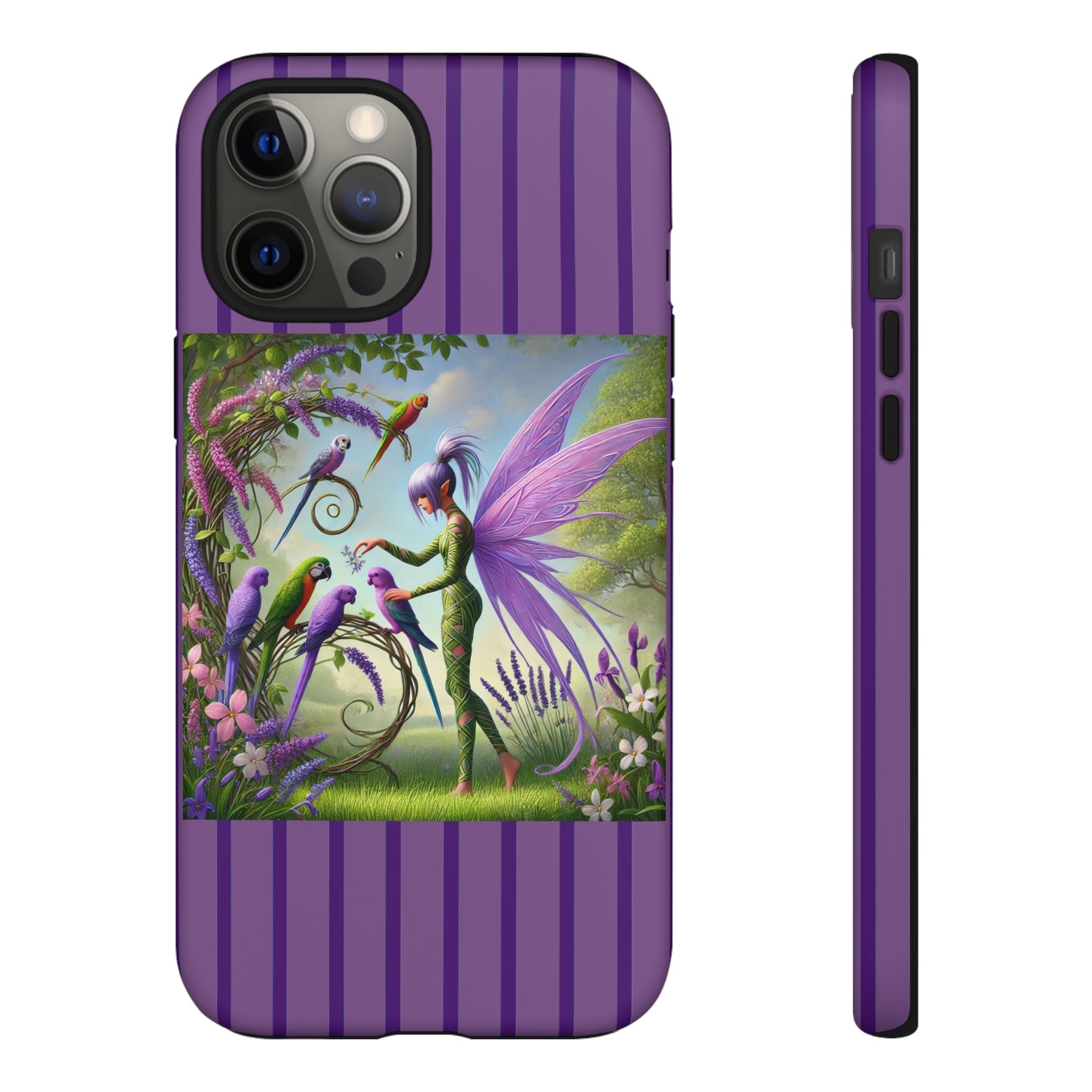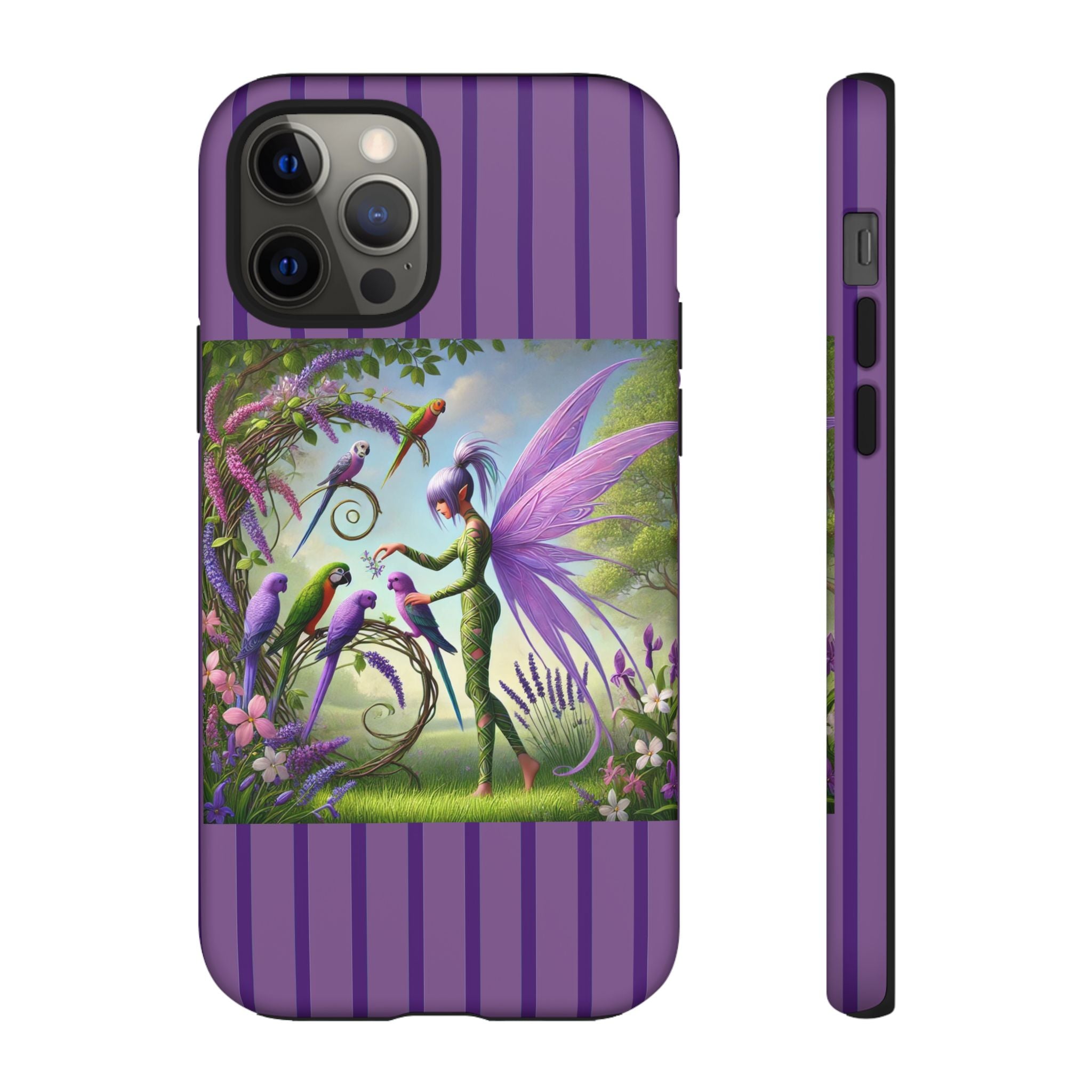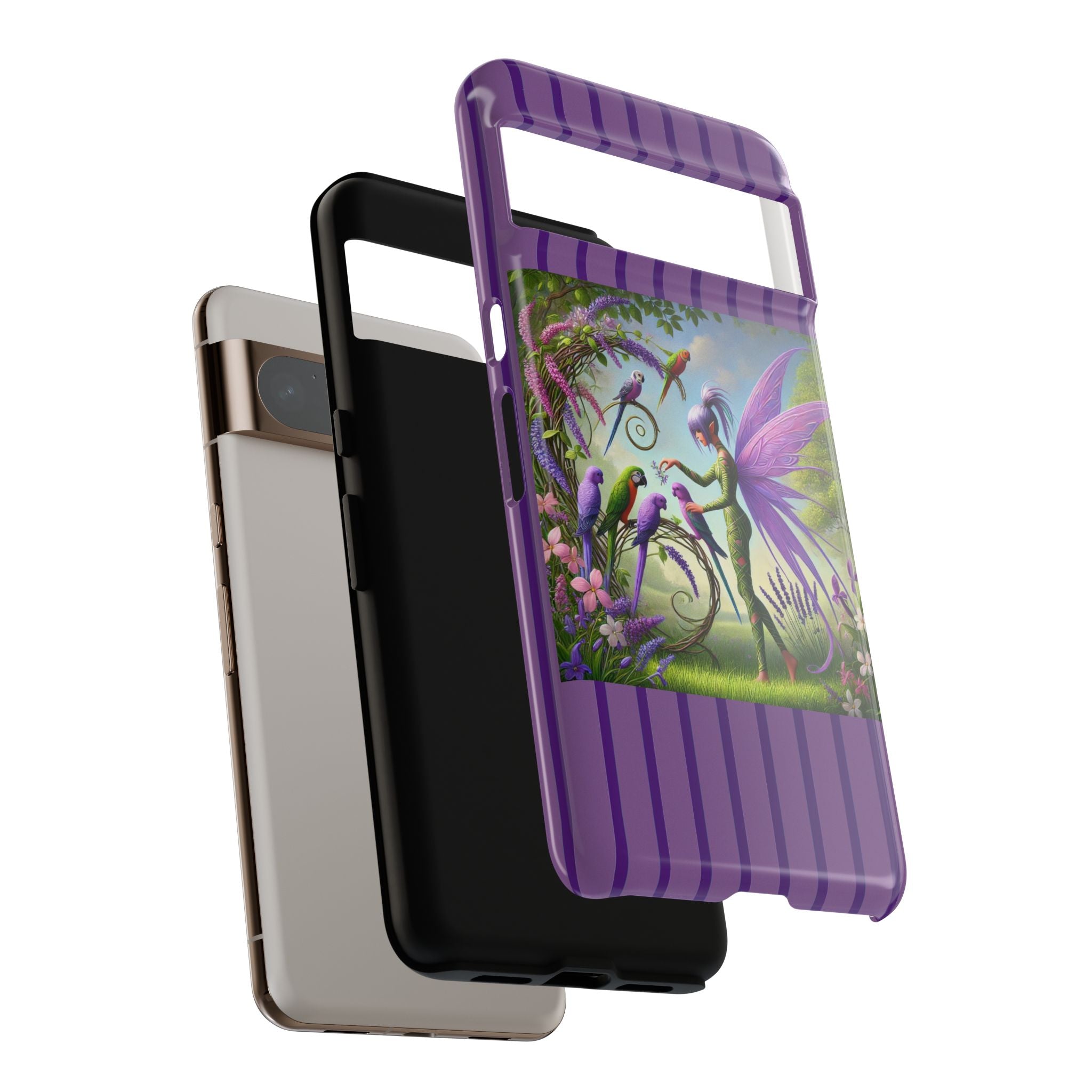 Lavender-Winged Fairy Phone Case transforms your phone into a scene of dreamy elegance and modern charm. Designed for iPhone, Samsung Galaxy, and Google Pixel devices, this case blends fine artistry with reliable protection. The design features a long, stylish fairy with shimmering lavender wings surrounded by vibrantly colored parrots under soft natural daylight. Lush greenery and blooms in shades of purple, pink, and white create an atmosphere of whimsy and freshness—capturing the magic of spring with contemporary sophistication. Choose a glossy or matte finish to bring this enchanting illustration to life while keeping your phone safe and stylish.