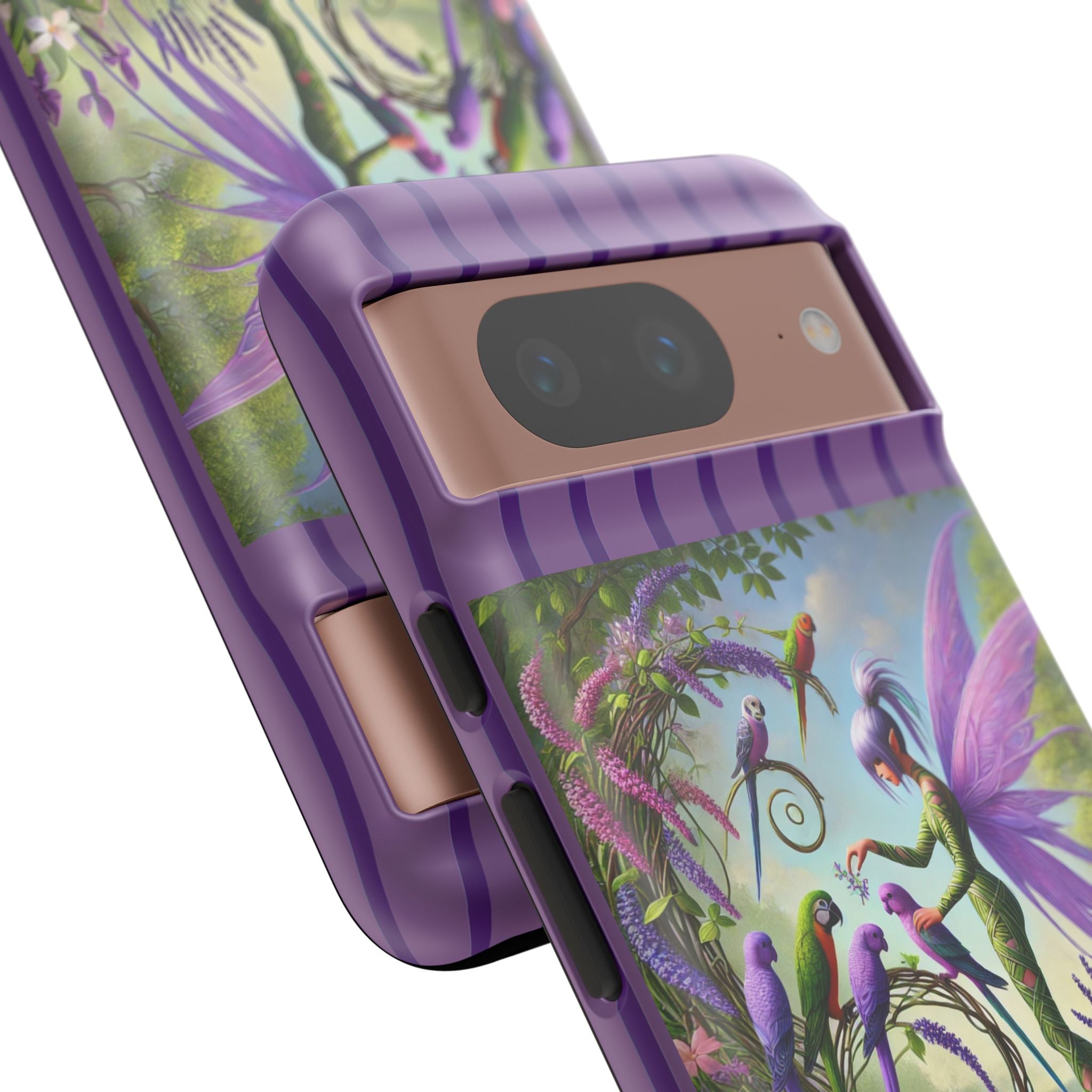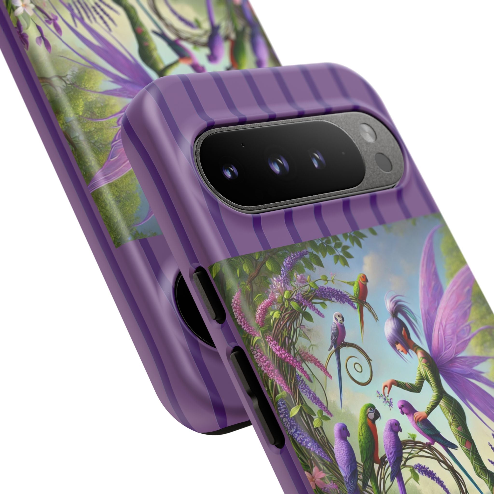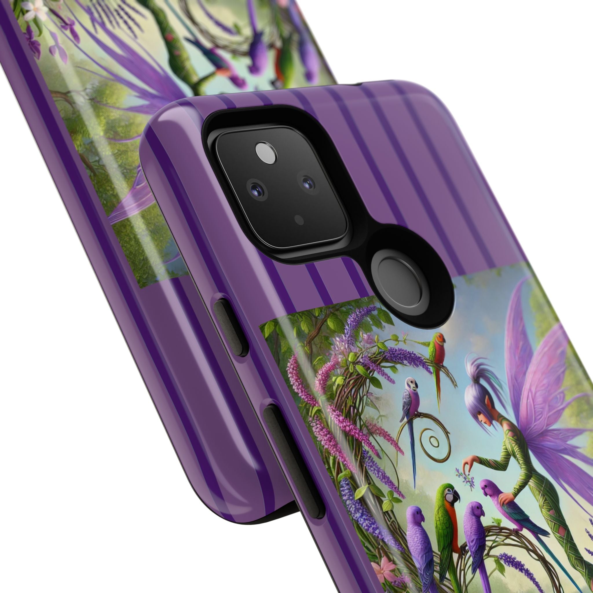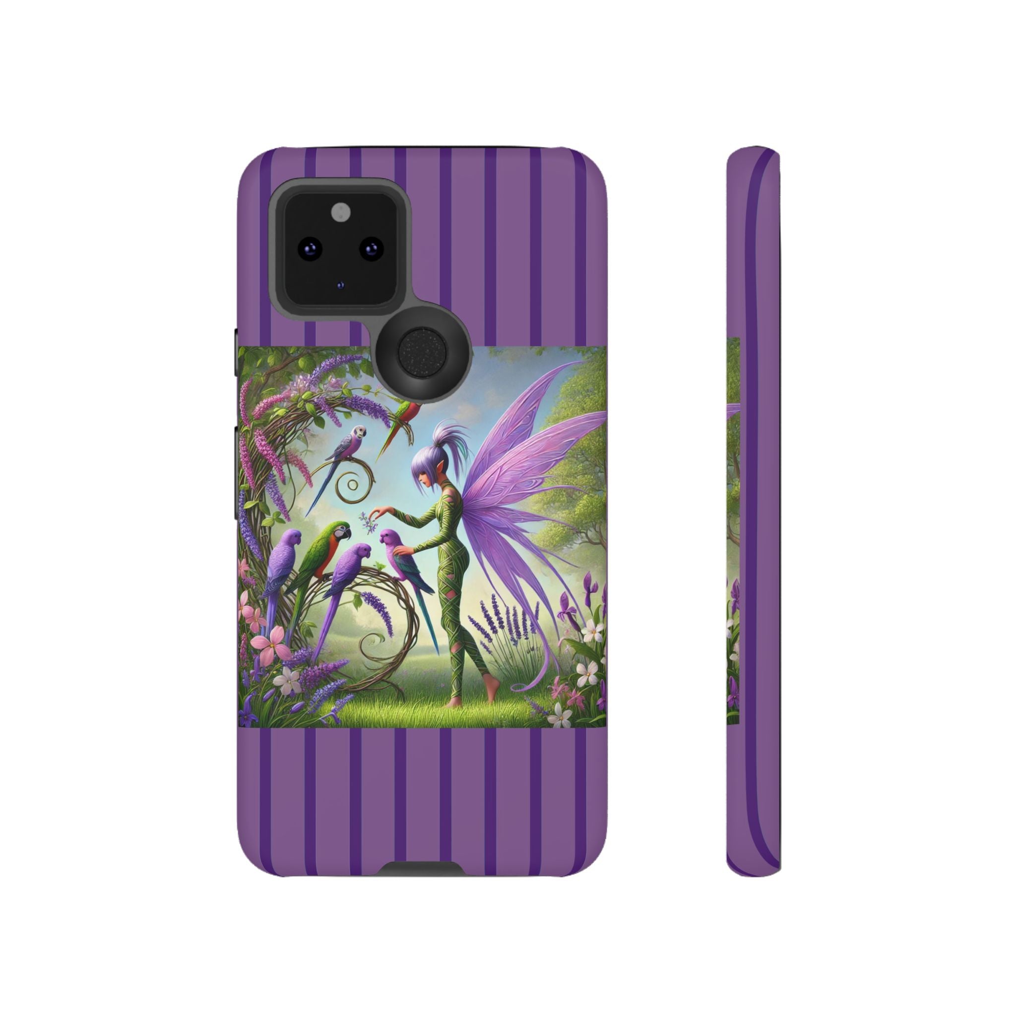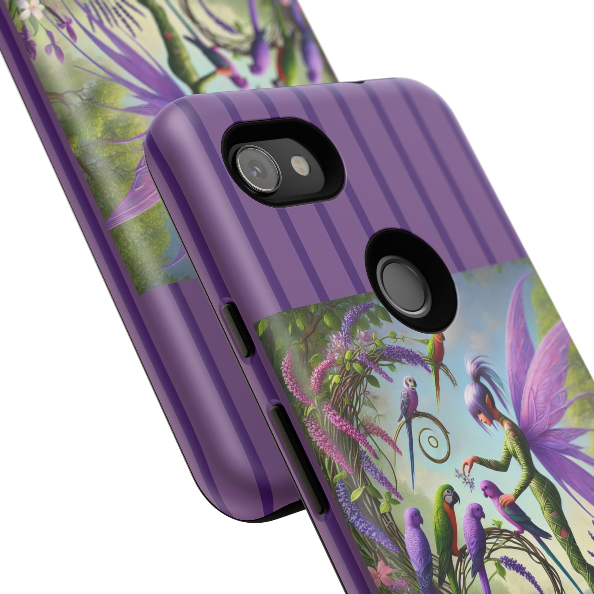 Lavender-Winged Fairy Phone Case transforms your phone into a scene of dreamy elegance and modern charm. Designed for iPhone, Samsung Galaxy, and Google Pixel devices, this case blends fine artistry with reliable protection. The design features a long, stylish fairy with shimmering lavender wings surrounded by vibrantly colored parrots under soft natural daylight. Lush greenery and blooms in shades of purple, pink, and white create an atmosphere of whimsy and freshness—capturing the magic of spring with contemporary sophistication. Choose a glossy or matte finish to bring this enchanting illustration to life while keeping your phone safe and stylish.