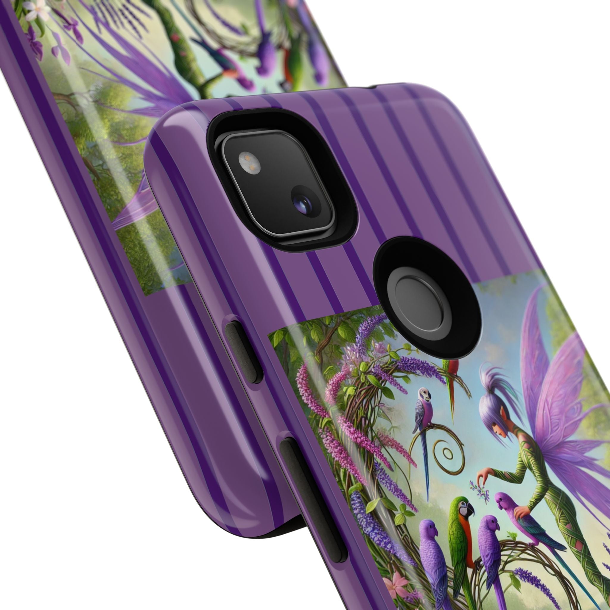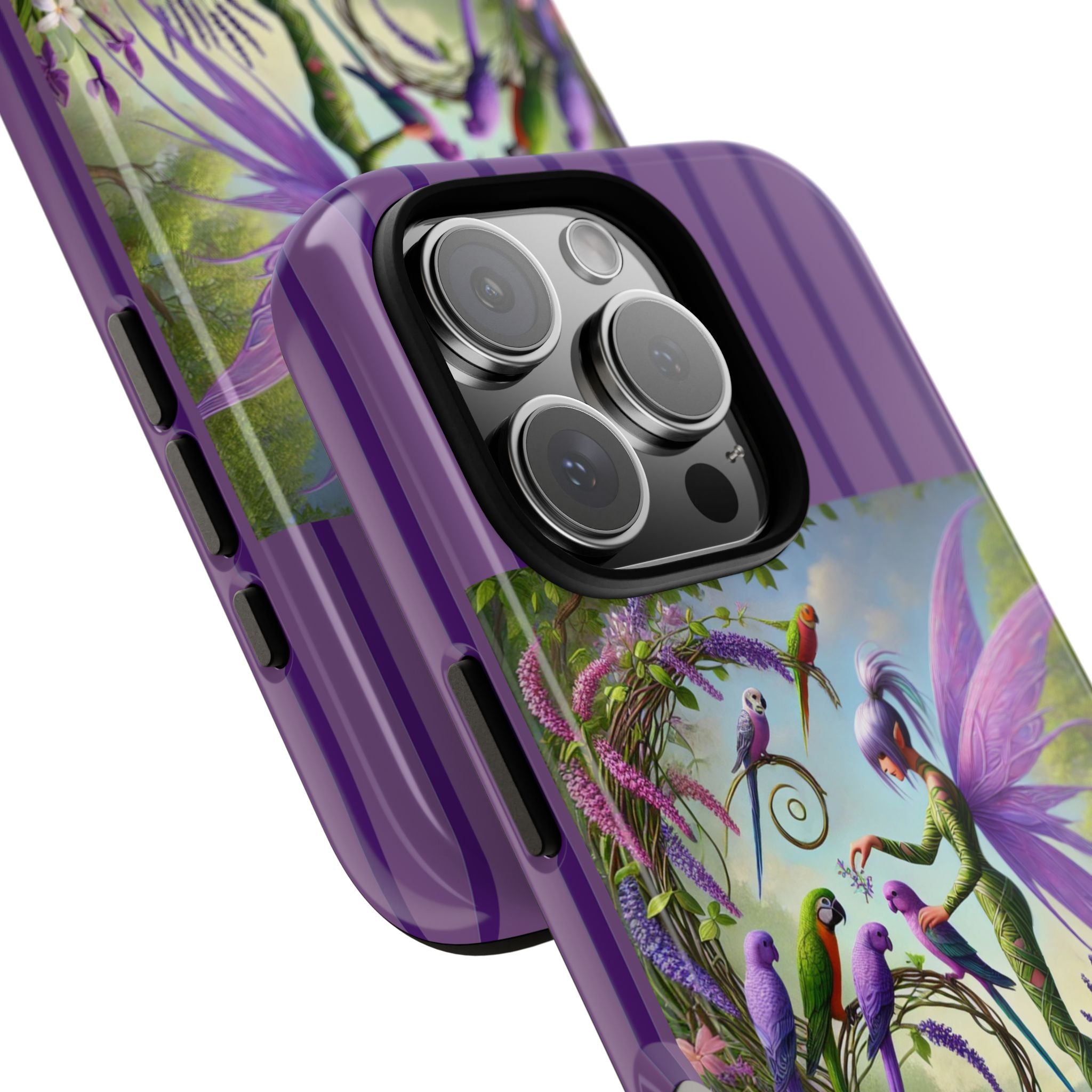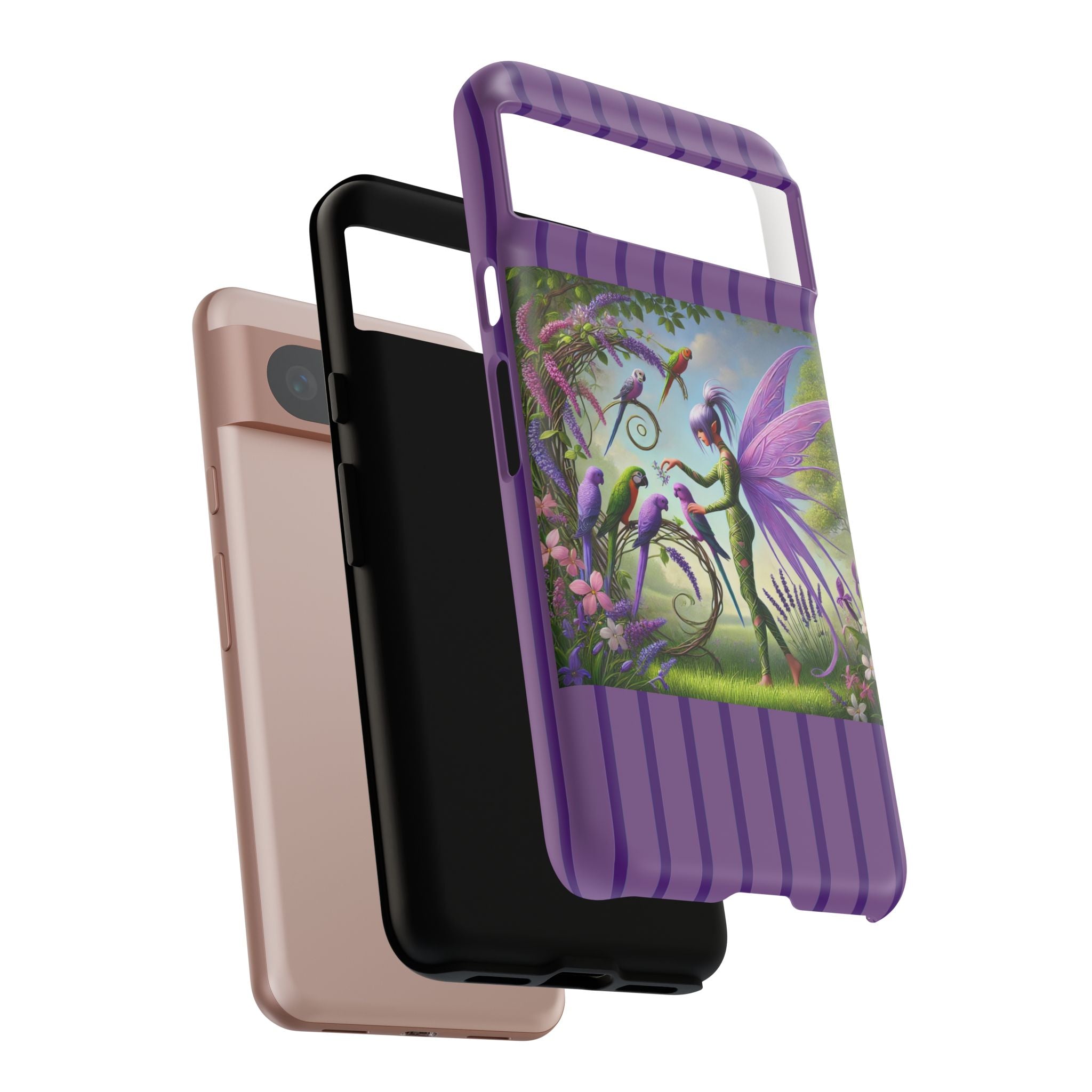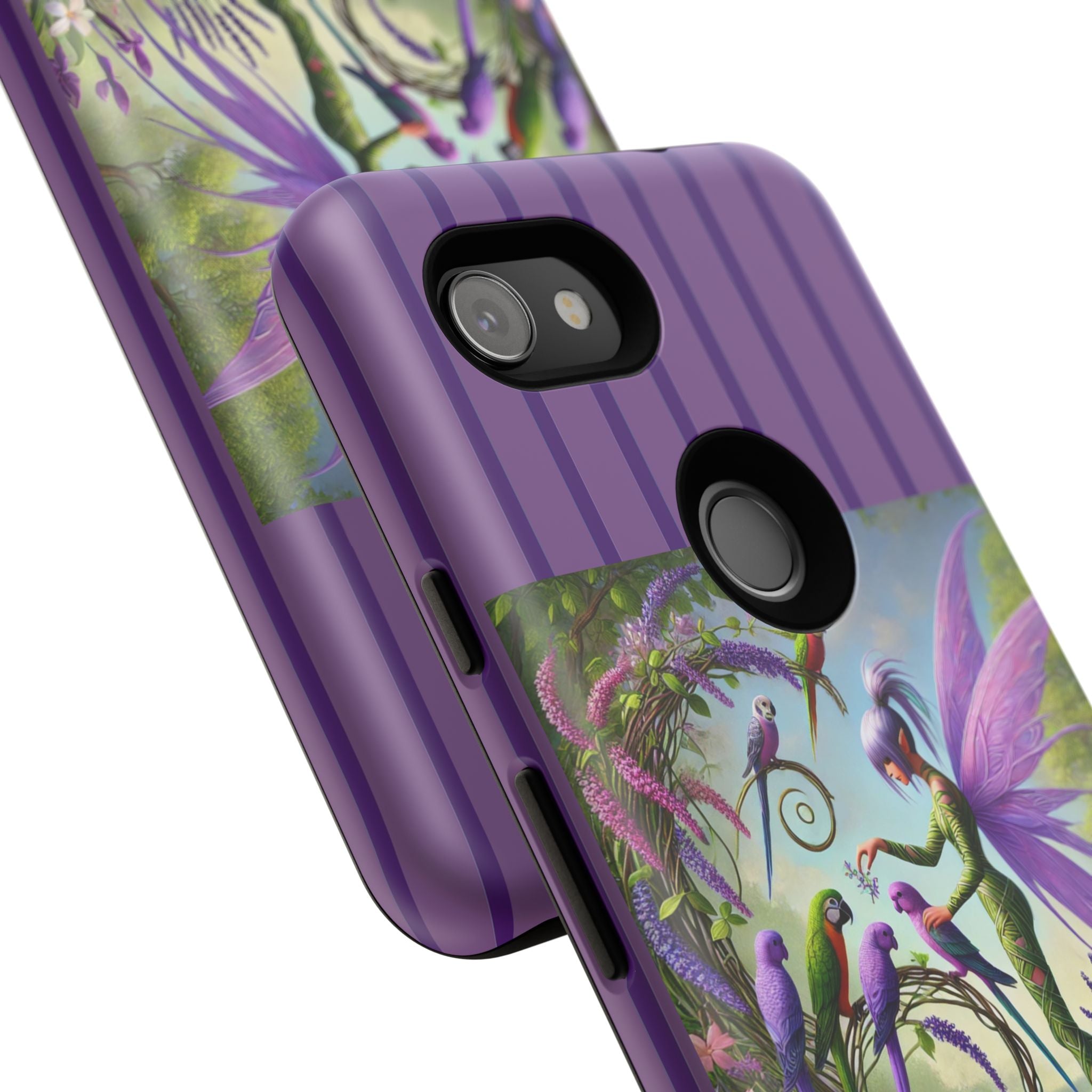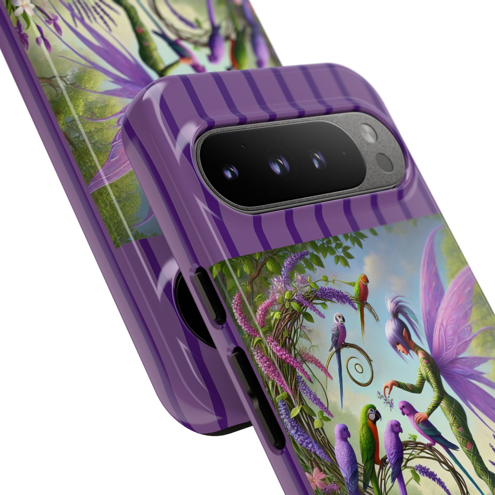 Lavender-Winged Fairy Phone Case transforms your phone into a scene of dreamy elegance and modern charm. Designed for iPhone, Samsung Galaxy, and Google Pixel devices, this case blends fine artistry with reliable protection. The design features a long, stylish fairy with shimmering lavender wings surrounded by vibrantly colored parrots under soft natural daylight. Lush greenery and blooms in shades of purple, pink, and white create an atmosphere of whimsy and freshness—capturing the magic of spring with contemporary sophistication. Choose a glossy or matte finish to bring this enchanting illustration to life while keeping your phone safe and stylish.