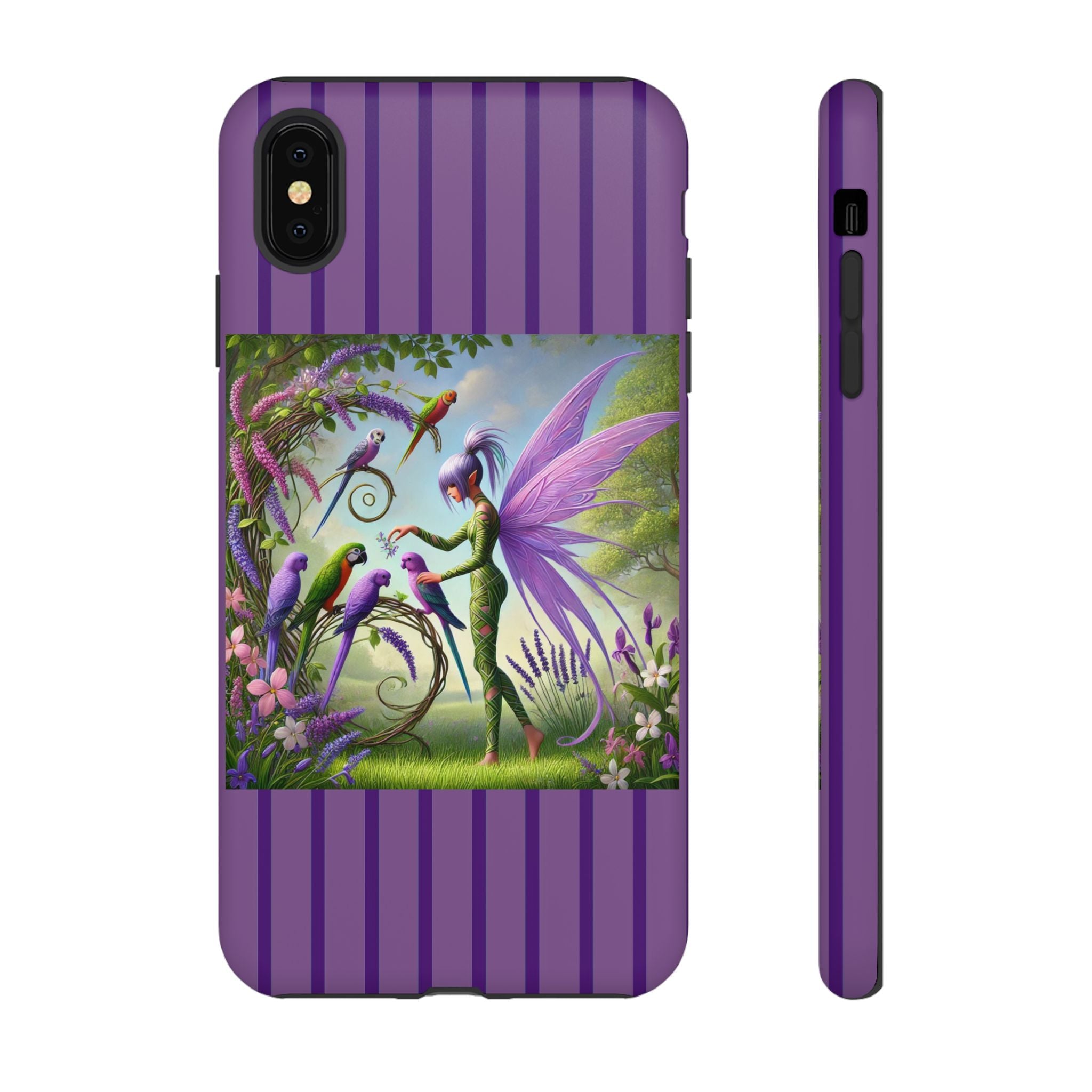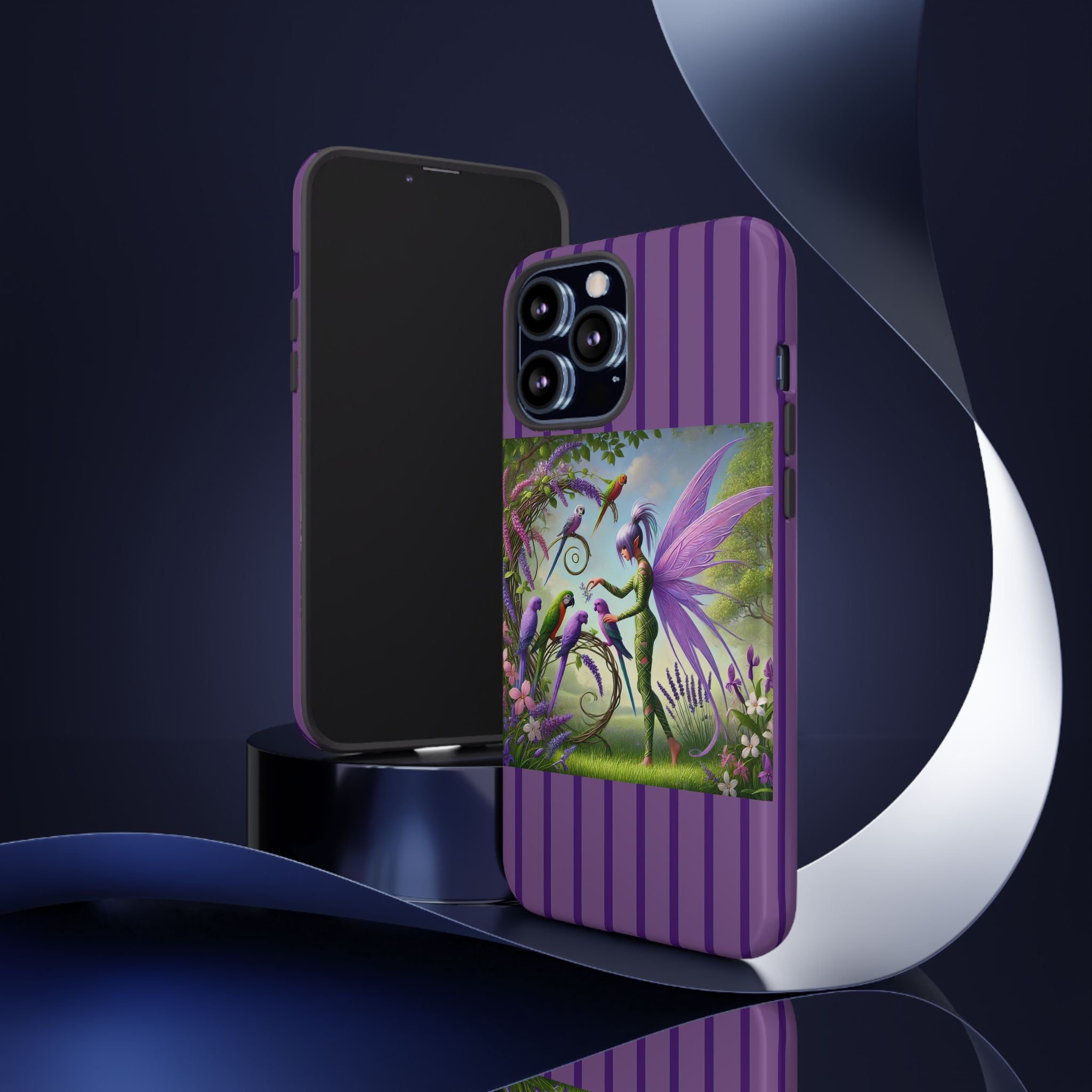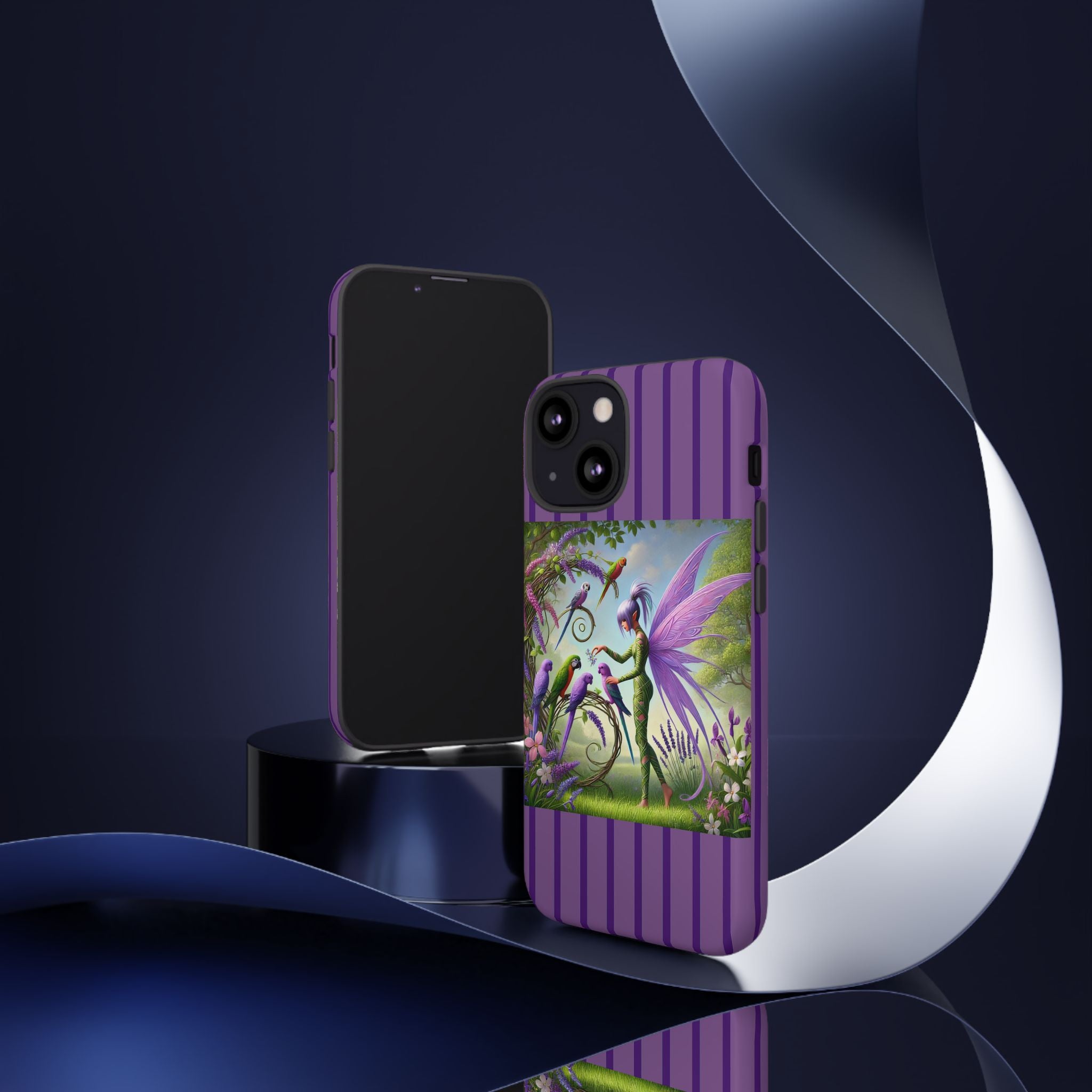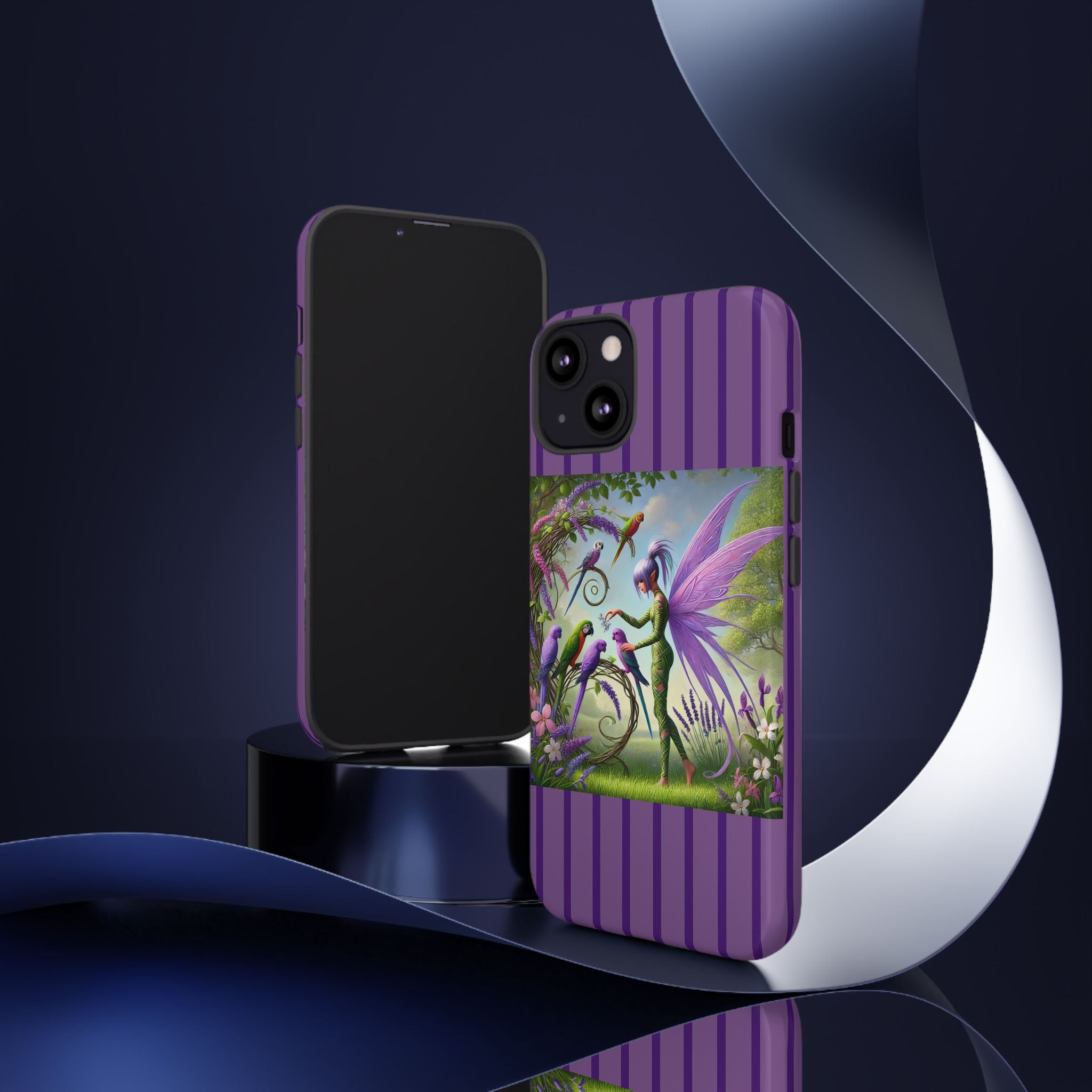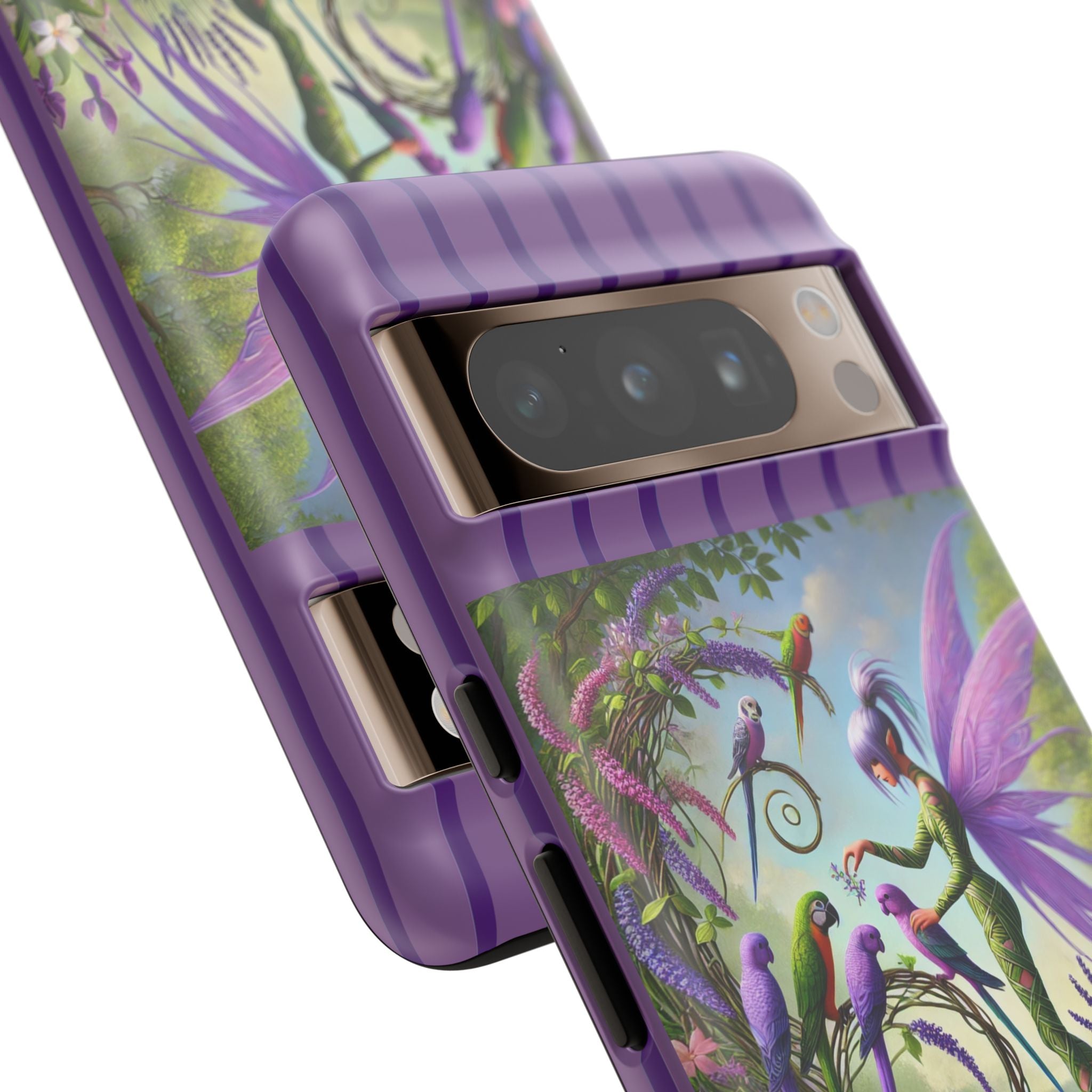 Lavender-Winged Fairy Phone Case transforms your phone into a scene of dreamy elegance and modern charm. Designed for iPhone, Samsung Galaxy, and Google Pixel devices, this case blends fine artistry with reliable protection. The design features a long, stylish fairy with shimmering lavender wings surrounded by vibrantly colored parrots under soft natural daylight. Lush greenery and blooms in shades of purple, pink, and white create an atmosphere of whimsy and freshness—capturing the magic of spring with contemporary sophistication. Choose a glossy or matte finish to bring this enchanting illustration to life while keeping your phone safe and stylish.