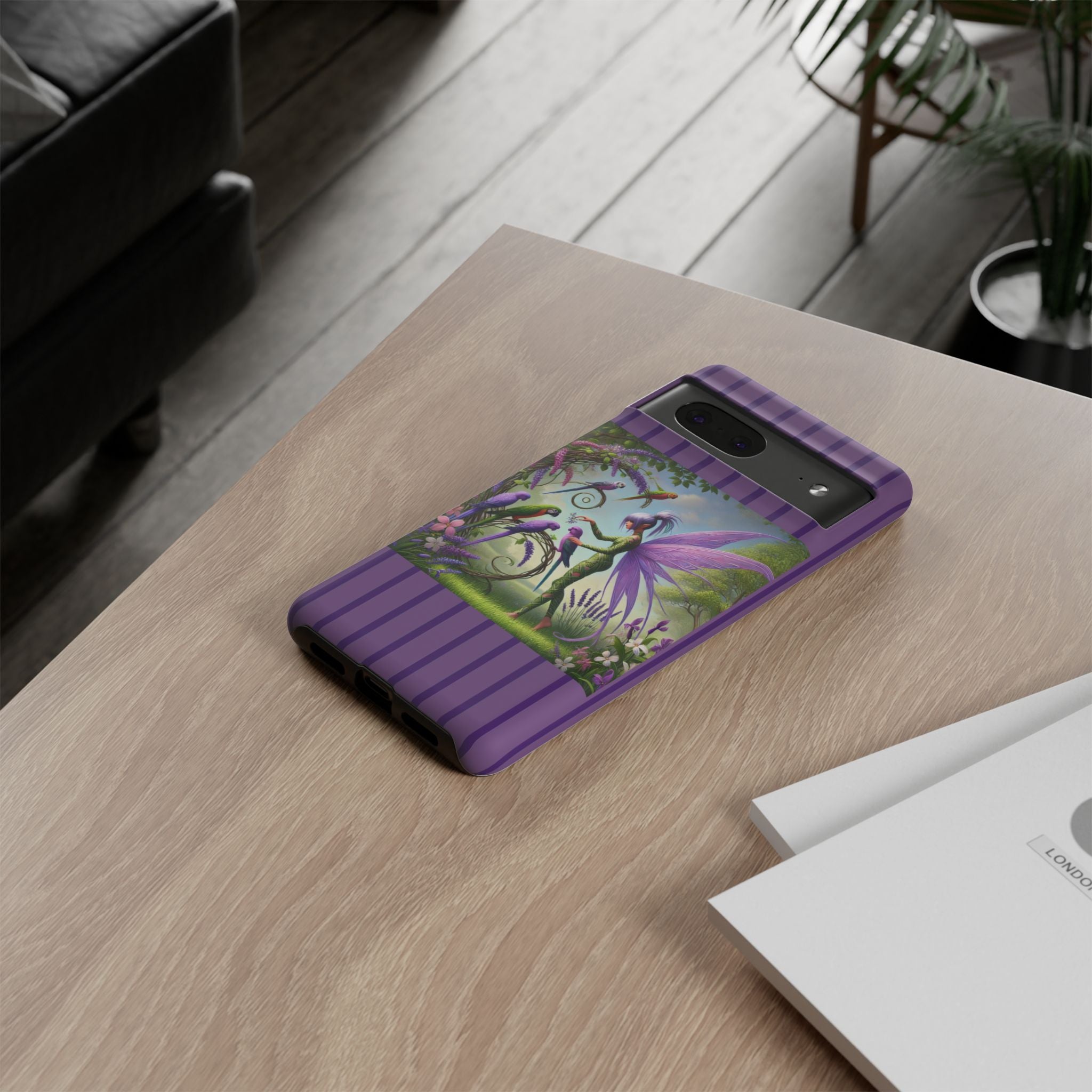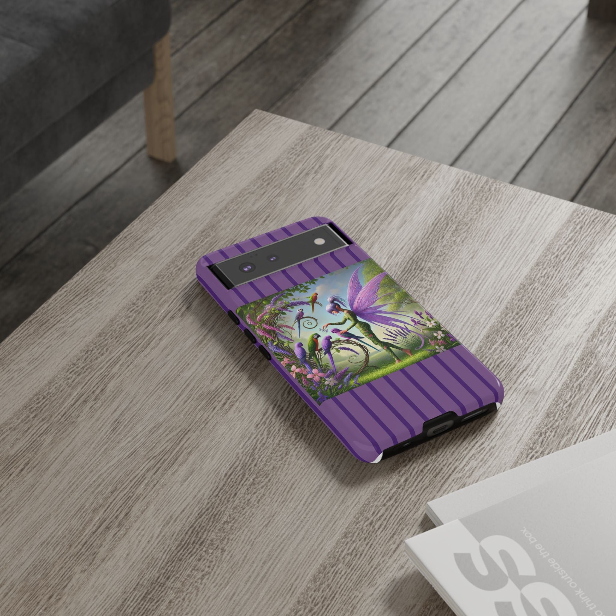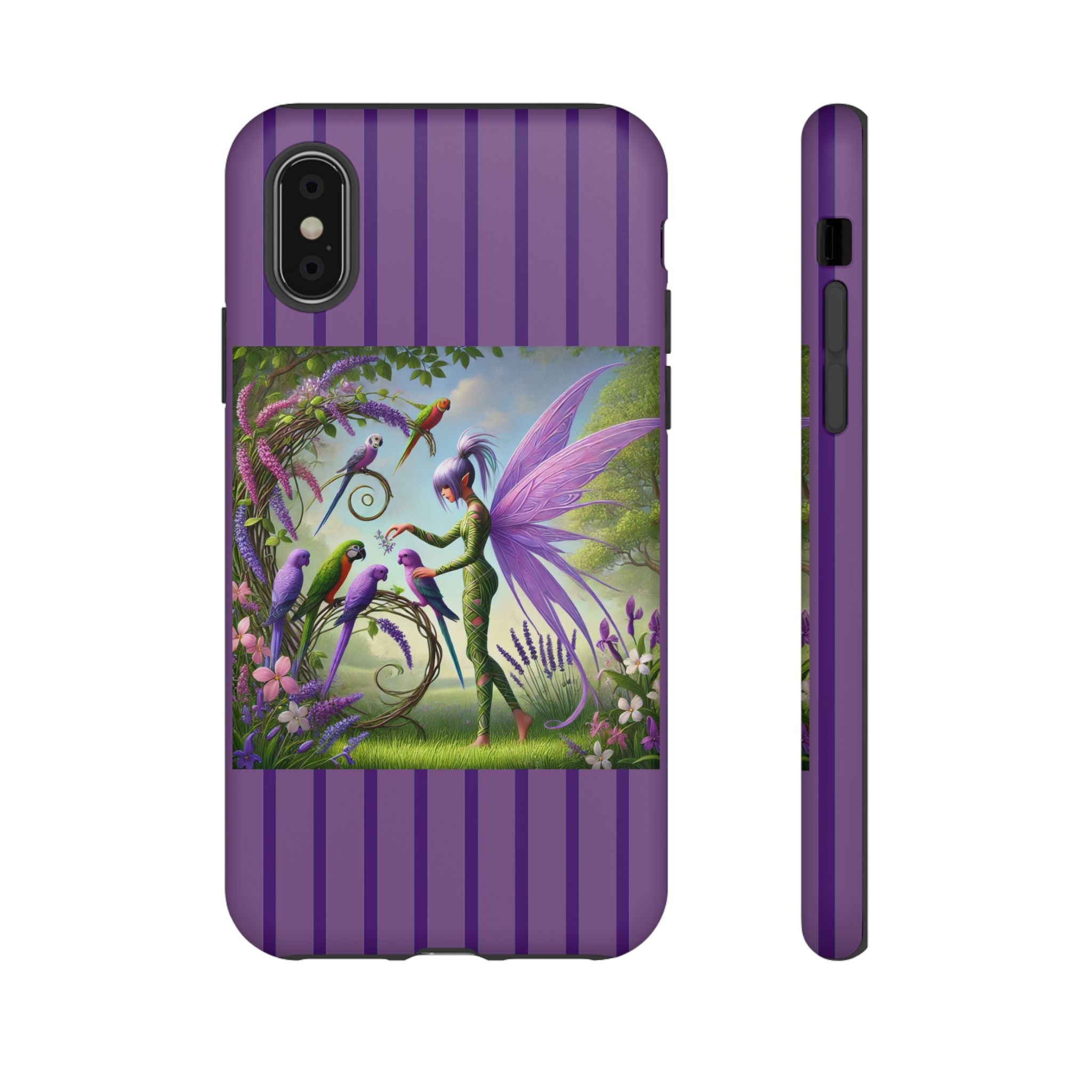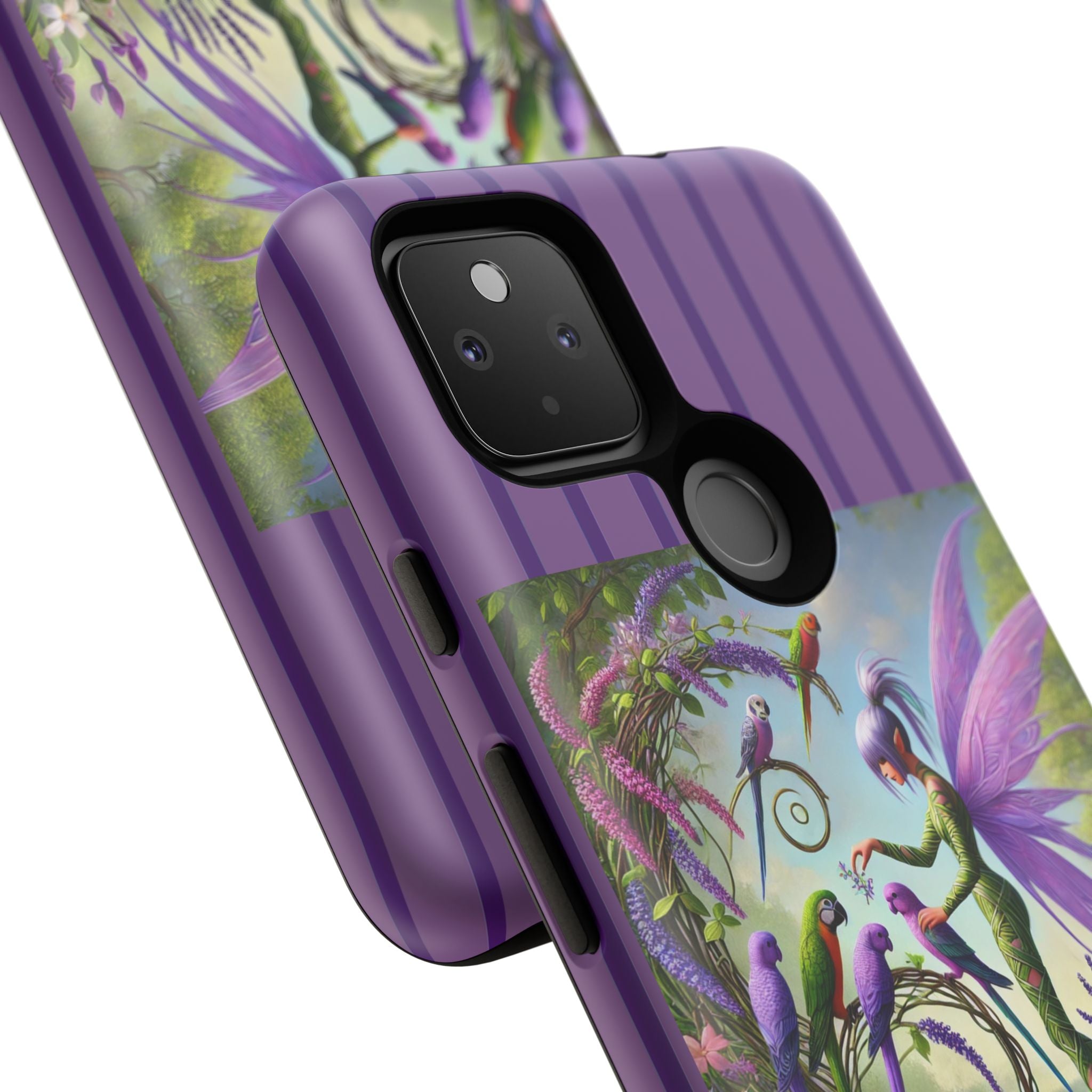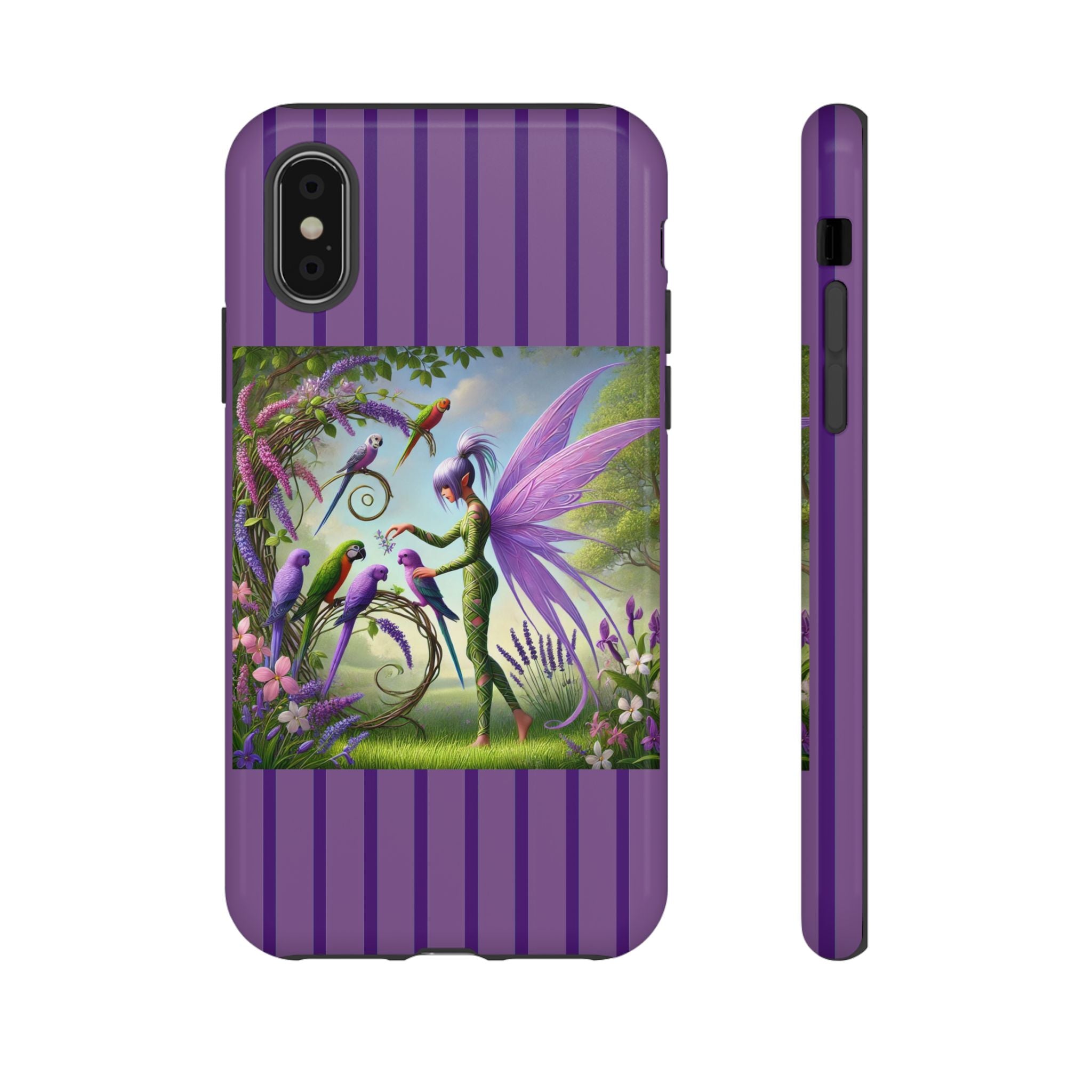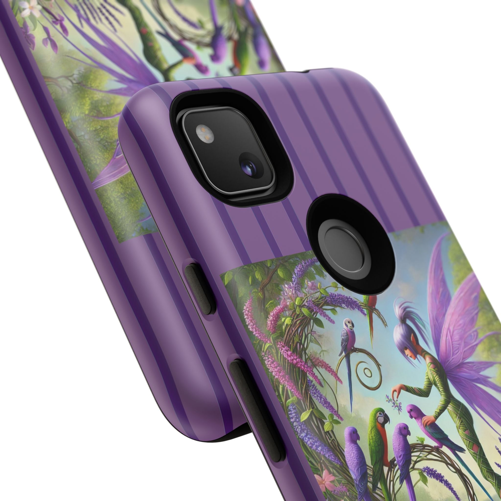 Lavender-Winged Fairy Phone Case transforms your phone into a scene of dreamy elegance and modern charm. Designed for iPhone, Samsung Galaxy, and Google Pixel devices, this case blends fine artistry with reliable protection. The design features a long, stylish fairy with shimmering lavender wings surrounded by vibrantly colored parrots under soft natural daylight. Lush greenery and blooms in shades of purple, pink, and white create an atmosphere of whimsy and freshness—capturing the magic of spring with contemporary sophistication. Choose a glossy or matte finish to bring this enchanting illustration to life while keeping your phone safe and stylish.